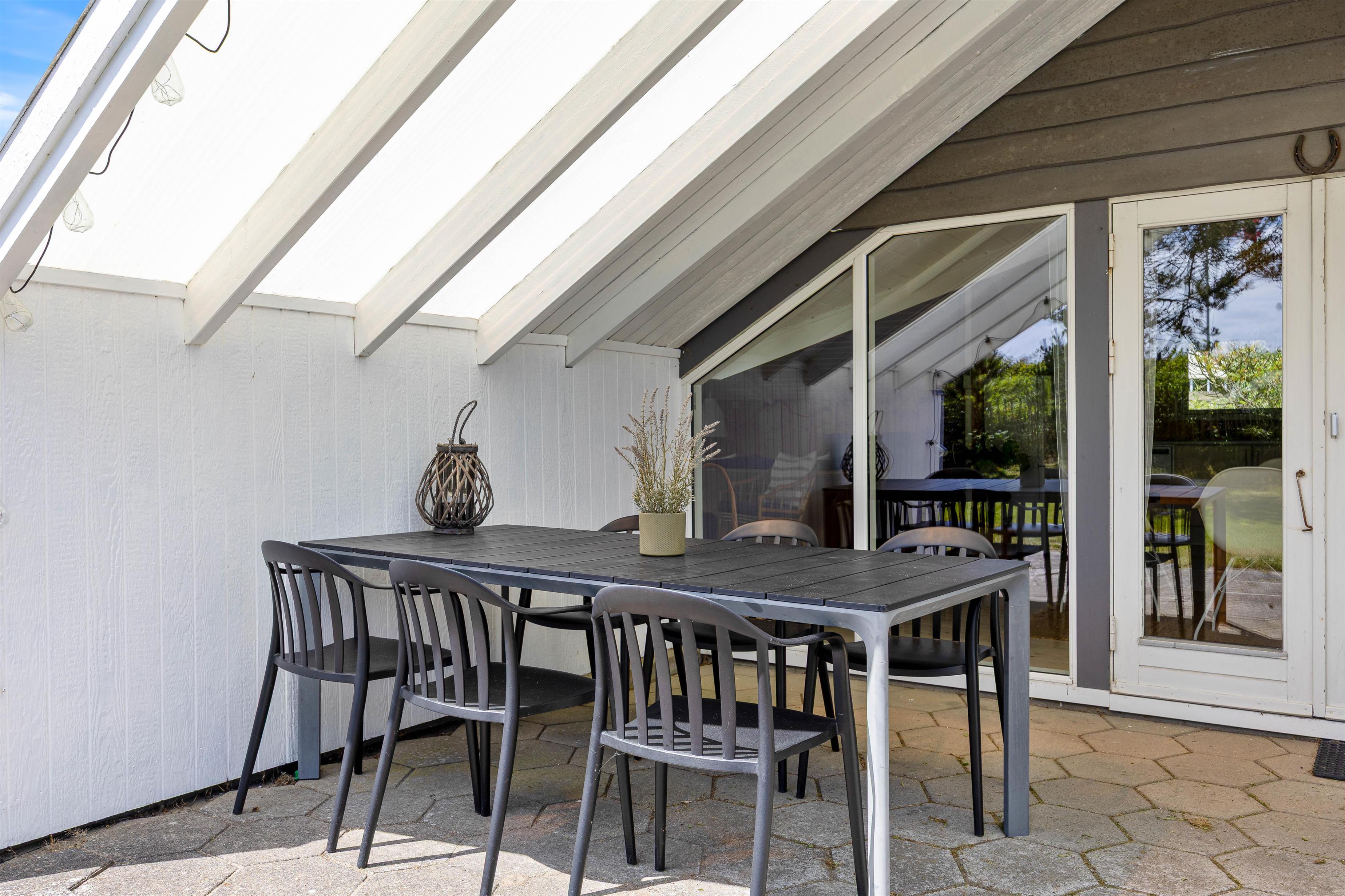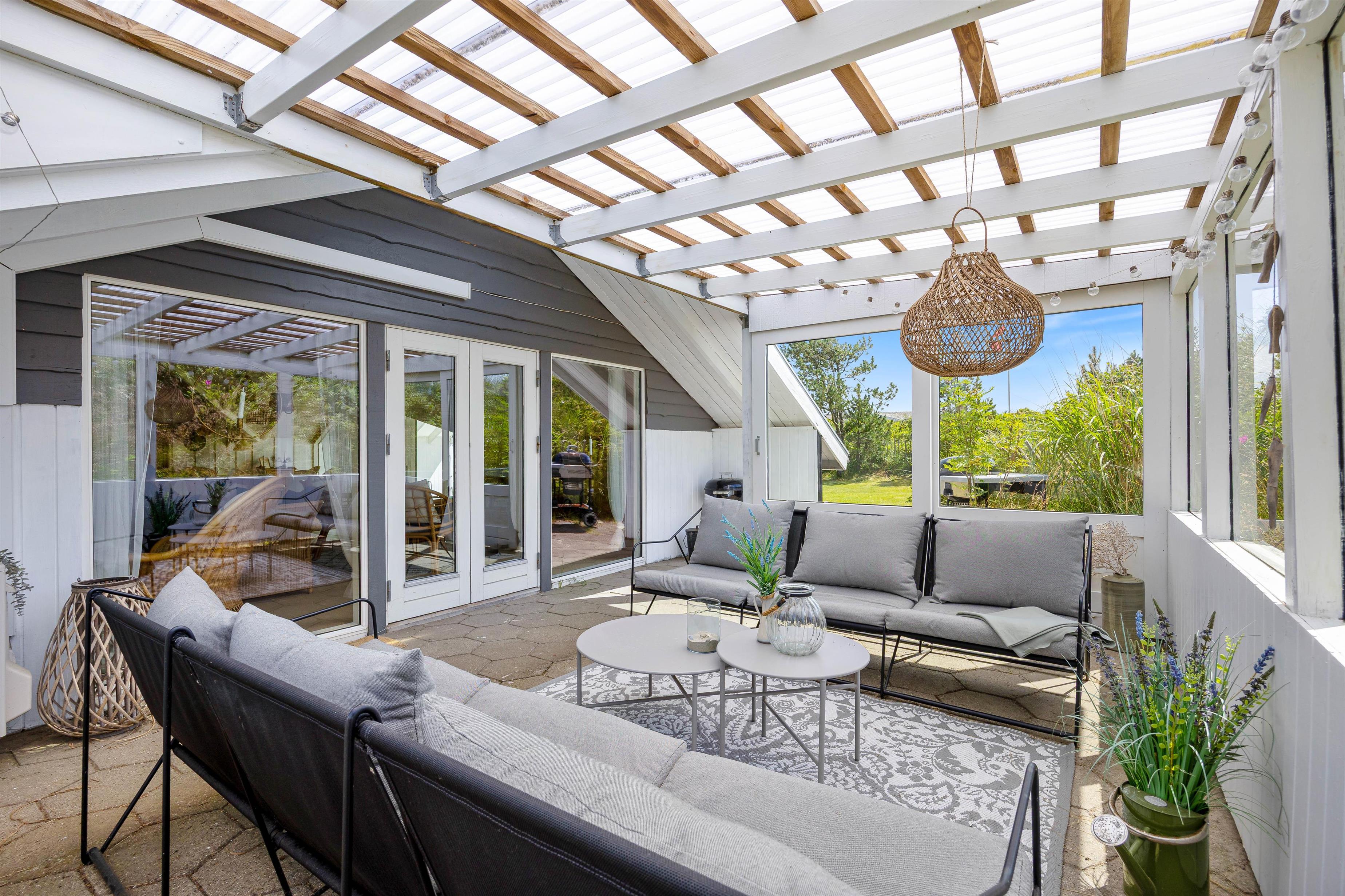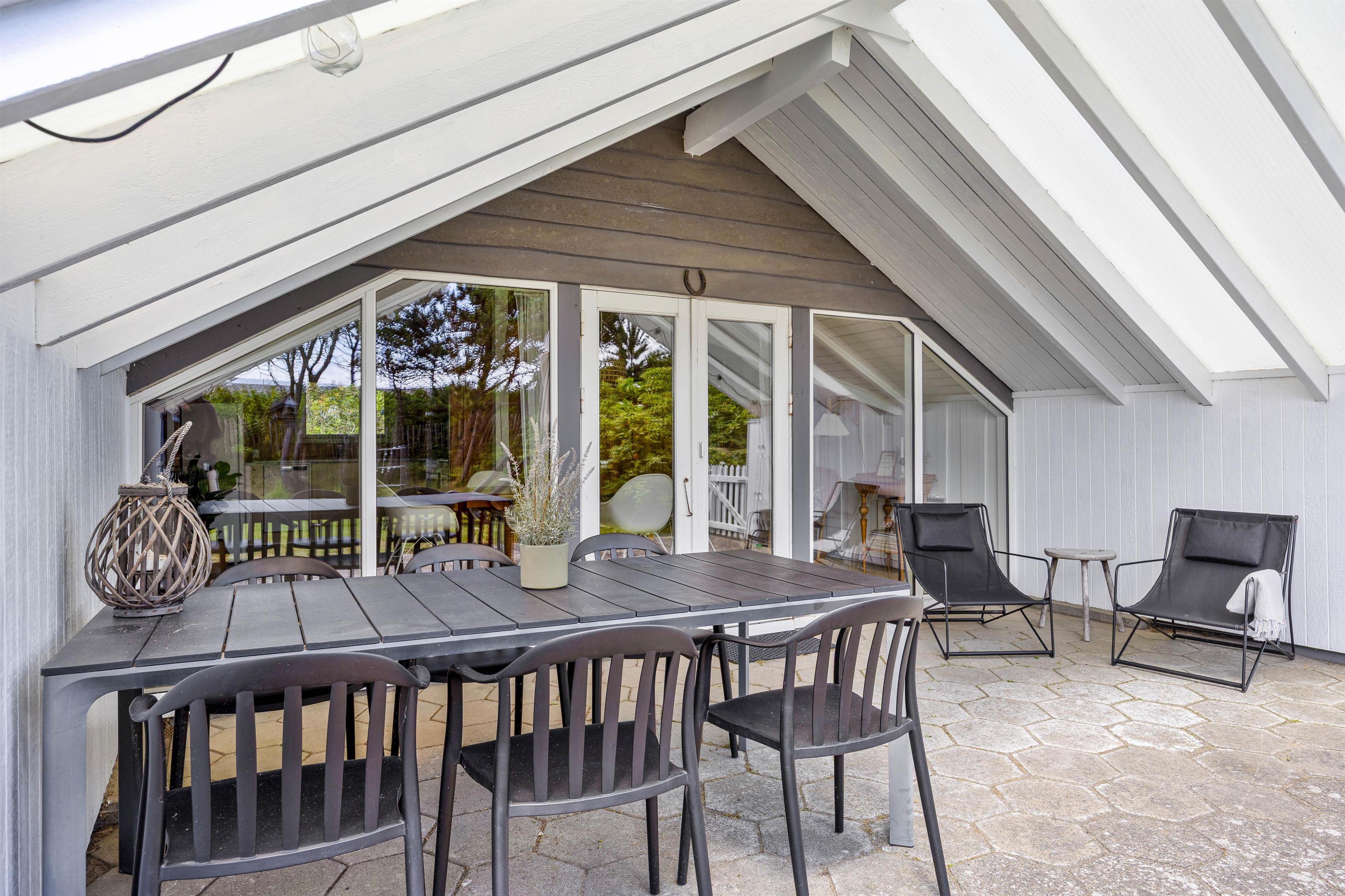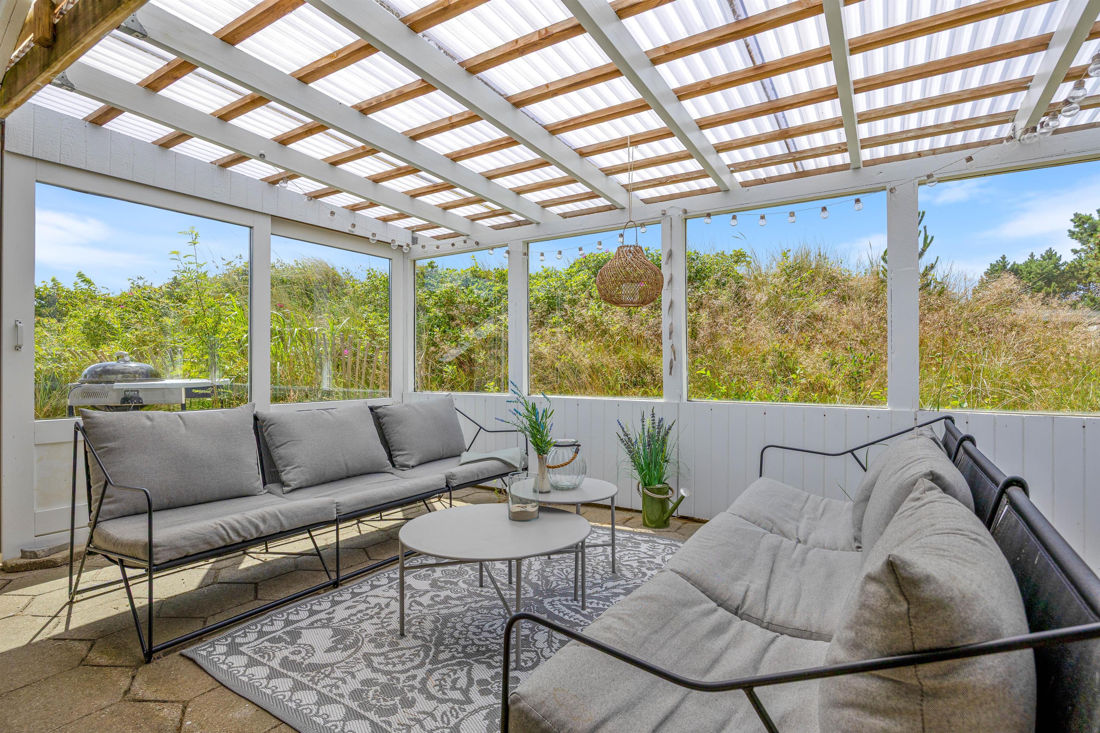 Til sommerhuset hører der også en skøn overdækket terrasse, der ligger helt ugeneret fra omgivelserne. Her kan I i ro og helt uden forstyrrelser sidde sammen og nyde et glas vin eller lignende, imens i nyder det skønne naturområde udenfor. På en af de lidt varmere dage har I yderligere mulighed for at benytte sommerhusets havemøbler, imens I nyder solens stråler ude i det fri på terrassen, der omslutter huset. I forbindelse hermed kan I tilberede middagen på grillen til feriehuset.