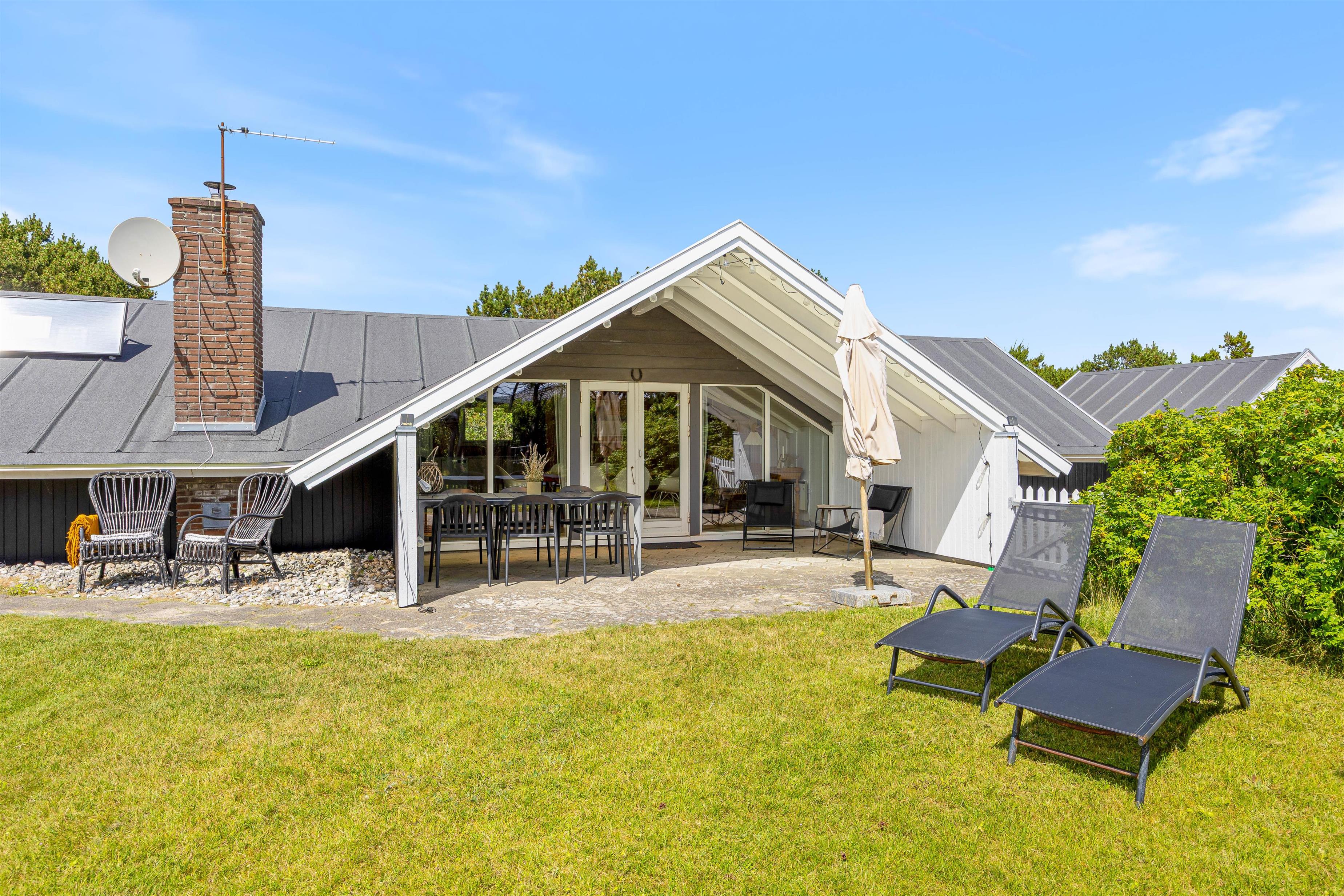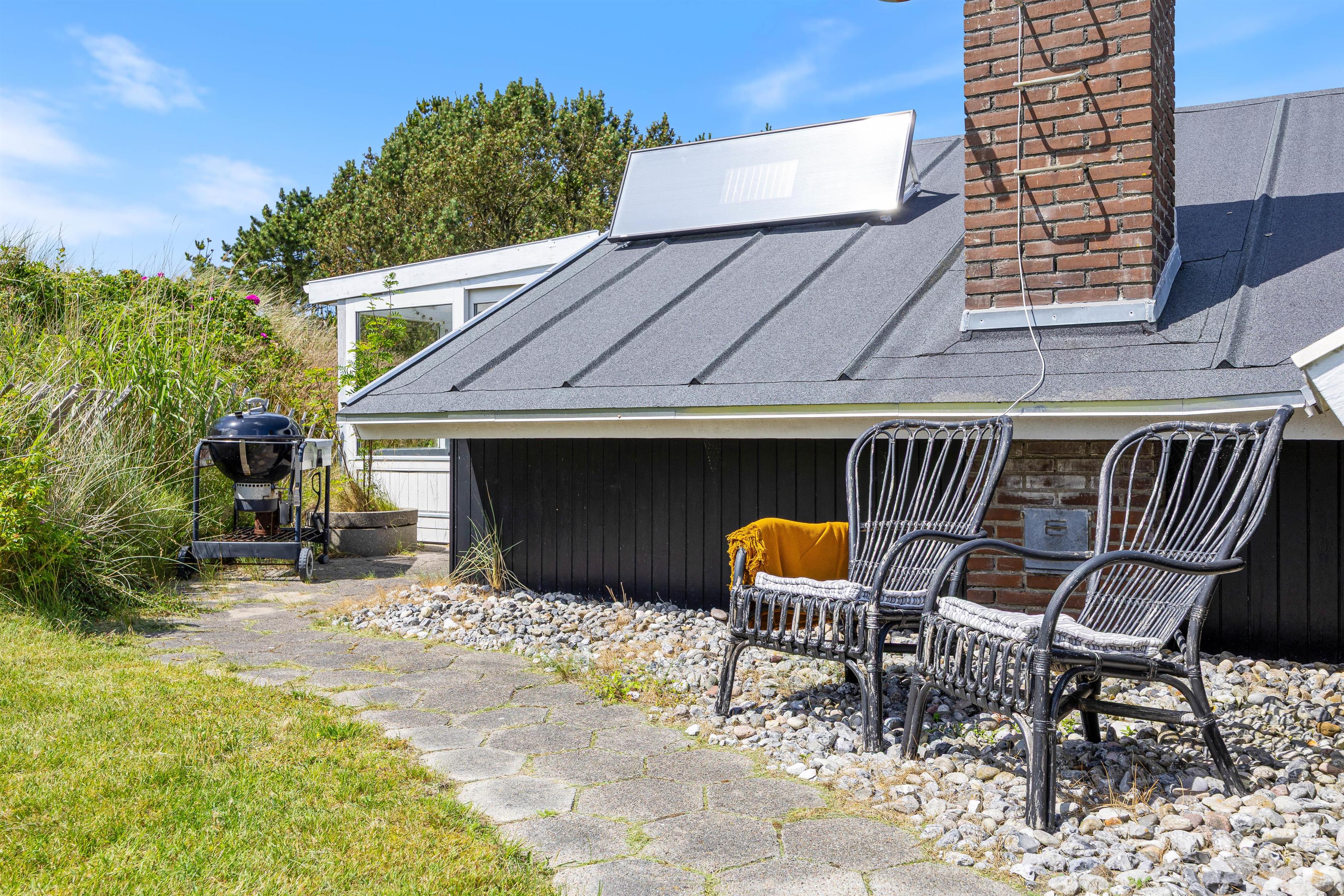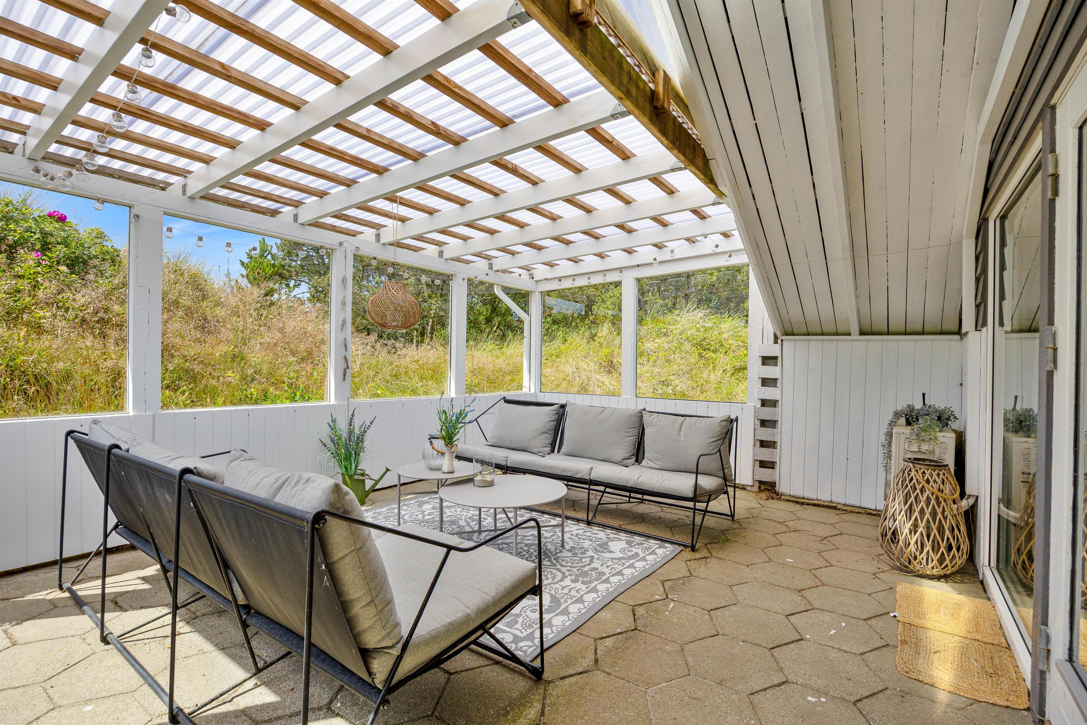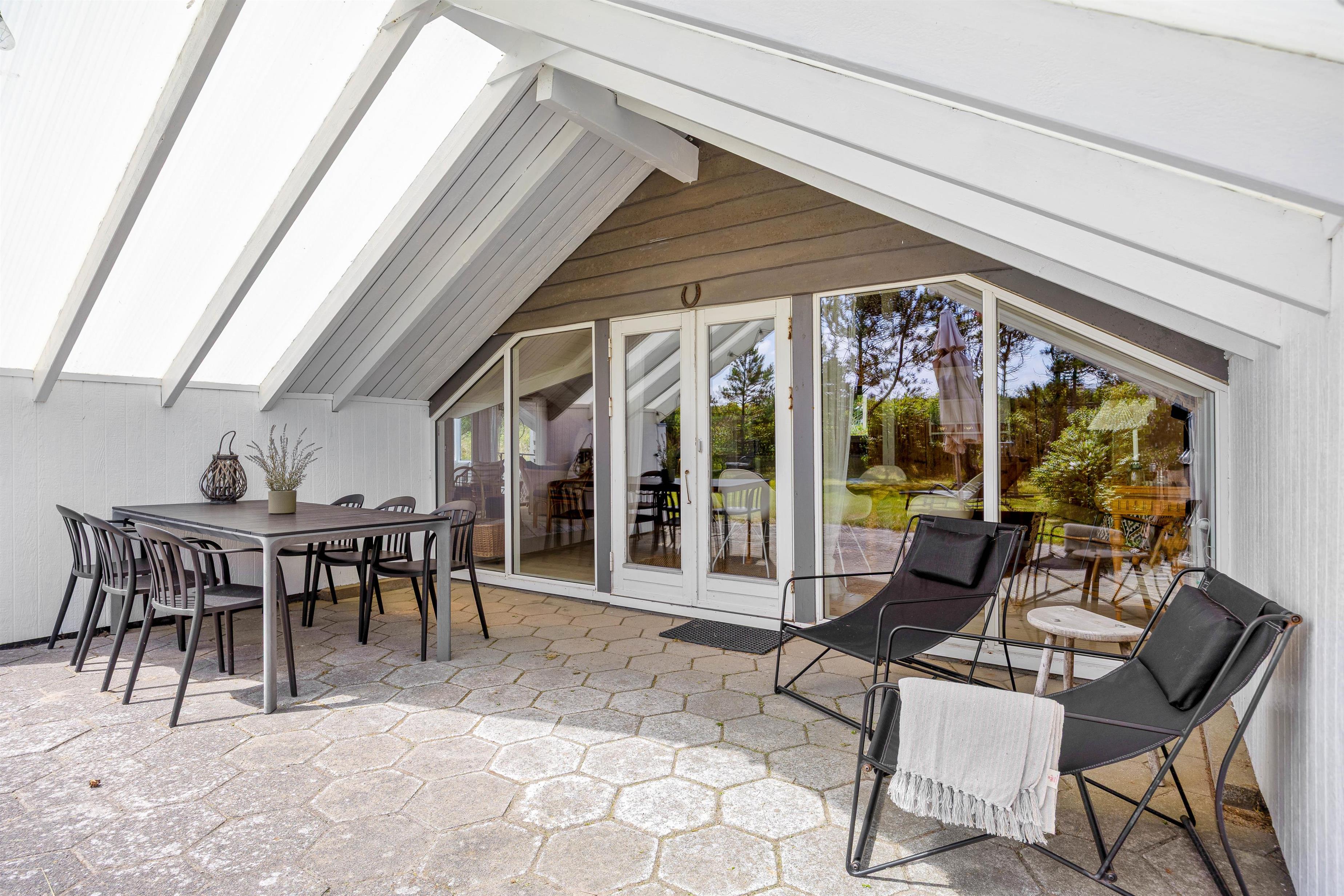 Til sommerhuset hører der også en skøn overdækket terrasse, der ligger helt ugeneret fra omgivelserne. Her kan I i ro og helt uden forstyrrelser sidde sammen og nyde et glas vin eller lignende, imens i nyder det skønne naturområde udenfor. På en af de lidt varmere dage har I yderligere mulighed for at benytte sommerhusets havemøbler, imens I nyder solens stråler ude i det fri på terrassen, der omslutter huset. I forbindelse hermed kan I tilberede middagen på grillen til feriehuset.