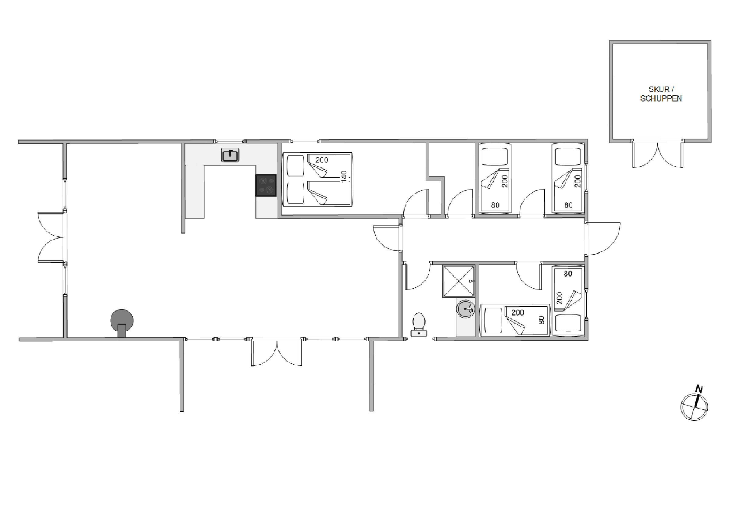 Feriehuset råder over seks sovepladser fordelt på tre soverum - et værelse med dobbeltseng og to værelser med to enkeltsenge. Desuden har feriehuset et lyst og lækkert badeværelse. Feriehusets åbne køkken ligger i forbindelse med stuen. Her kan i sammen tilberede aftensmaden samtidig med, at I også kan nyde selskabet fra resten af familien.