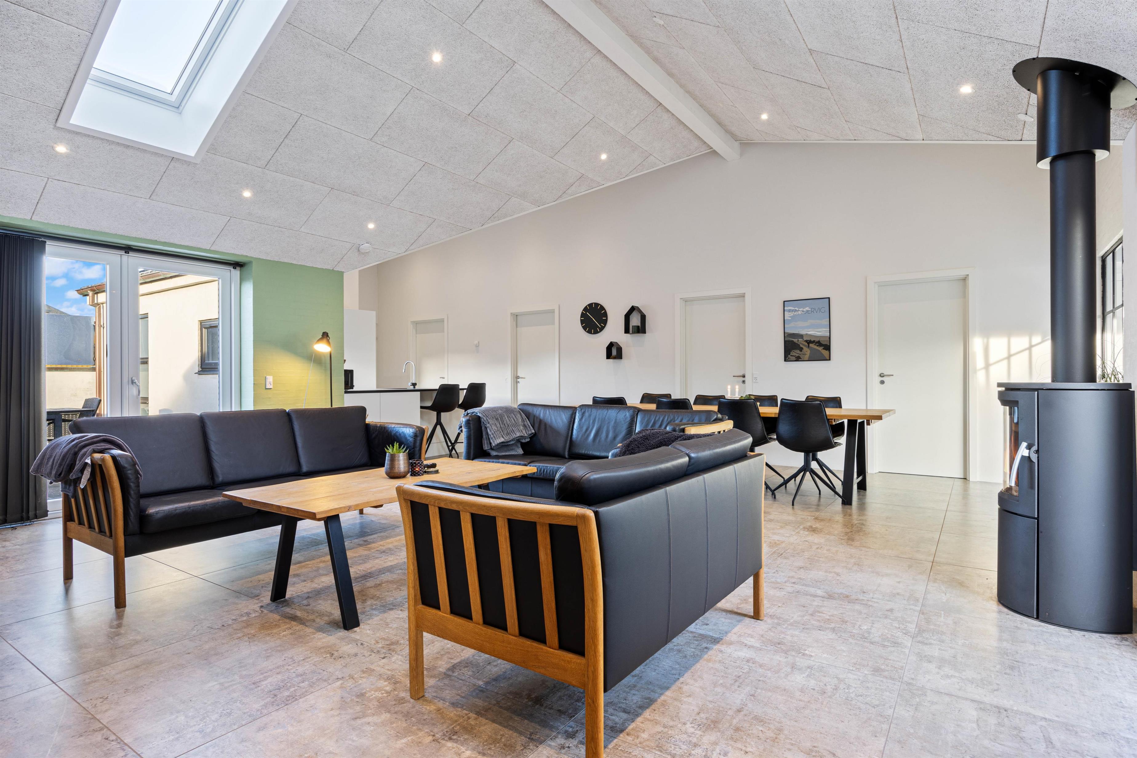 Den i 2020 tilbyggede længe til huset rummer det store og lyse opholdsrum. Det åbne samtalekøkken er veludstyret og står klar til, at feriekokken kan slå sig løs. Opvasken klares naturligvis af opvaskemaskinen. I åben forbindelse til køkkenet finder I spise- og stueområdet med lækker brændeovn. De store ovenlysvinduer sørger for masser af naturligt dagslys og gennem terrassedørene kommer I ud på husets brolagte og afskærmede terrasse med egen grill.