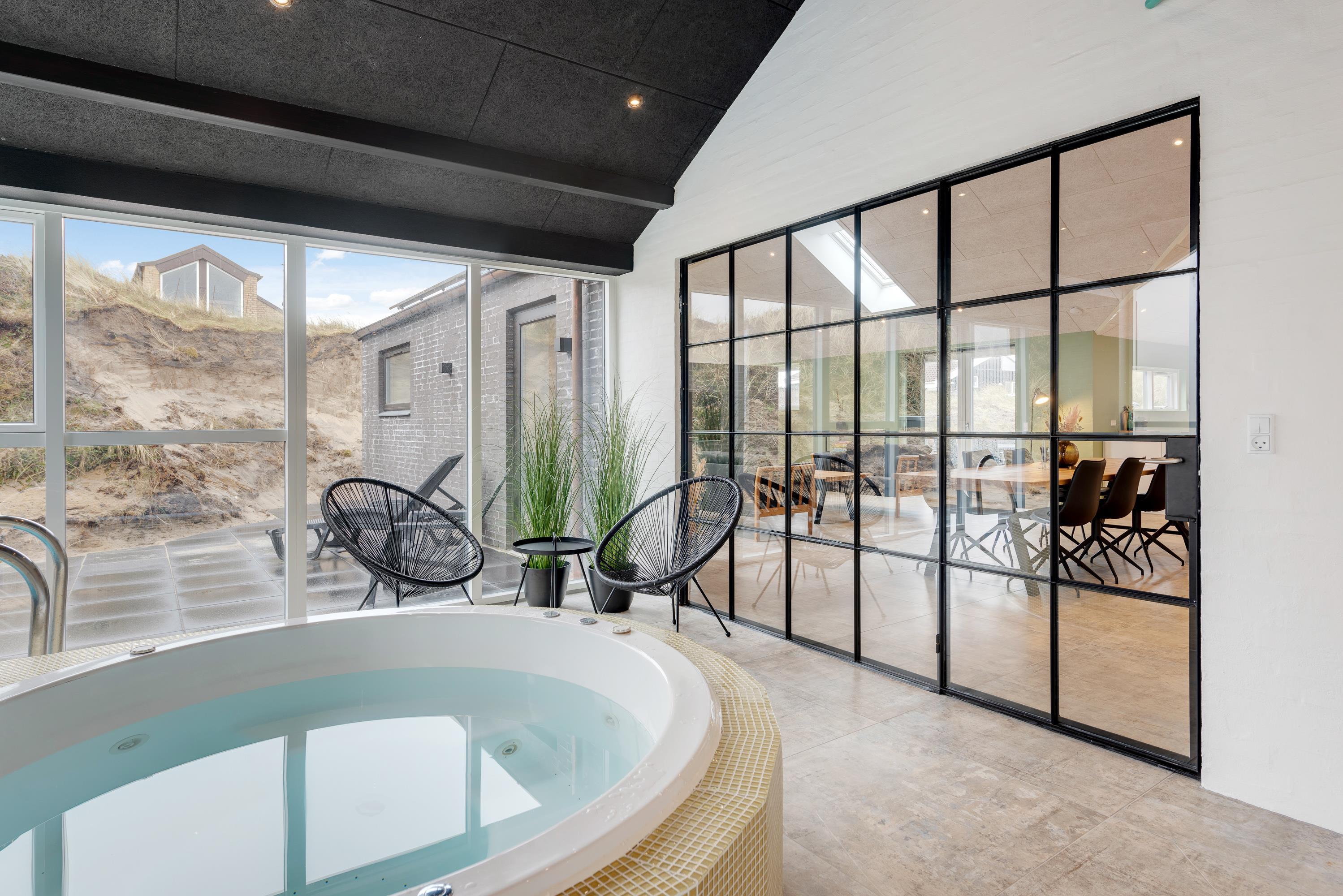 Det yderst smagfulde og kvalitetsudstyrede sommerhus er placeret for enden af en stikvej, midt i klitlandskabet ved Søndervig. Med plads til 8 personer er huset perfekt til to familier eller flere venner. De 4 soveværelser såvel som de 2 badeværelser skaber ideelle rammer for jer. Badeværelset i poolrummet er delt op i et gæstetoilet og en separat bruserum med lækre massagedyser.