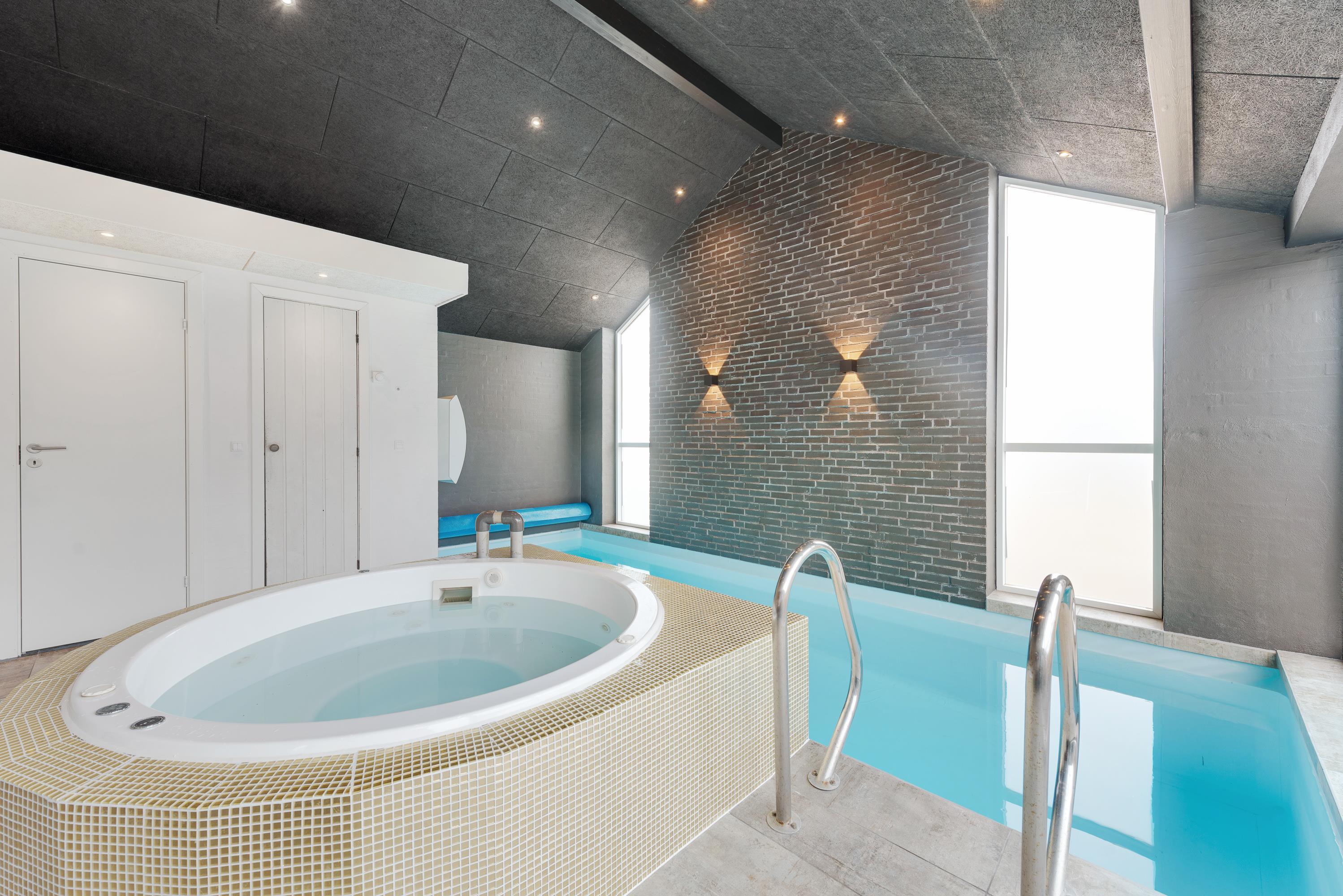Poolrum med sauna og spa med guldmosaik