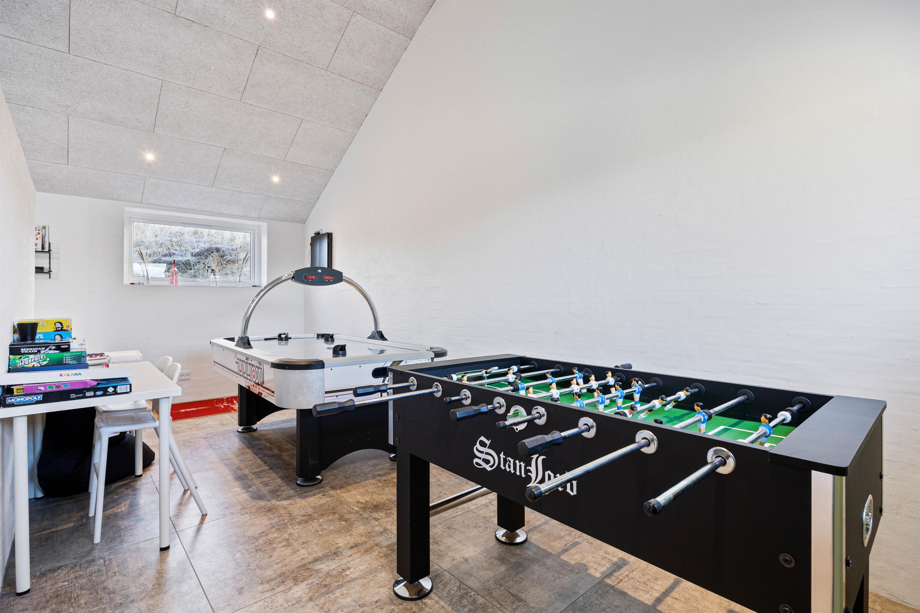 Skillevæggen i stuen sætter den i åben forbindelse til aktivitetsafdelingen af huset. Her er der plads til, at børn og barnlige sjæle kan lege og spille mod hinanden i dart, bordfodbold og airhockey.