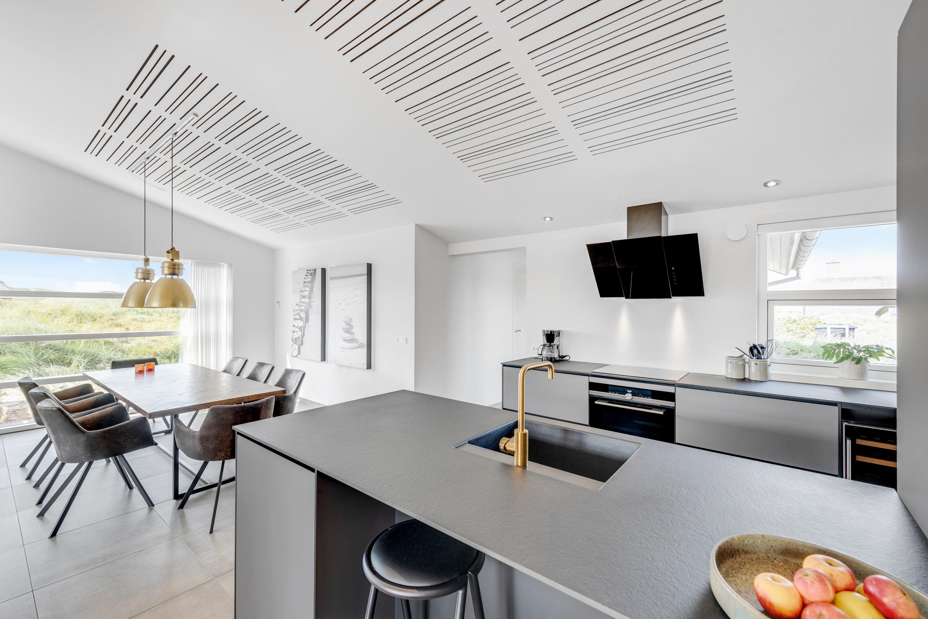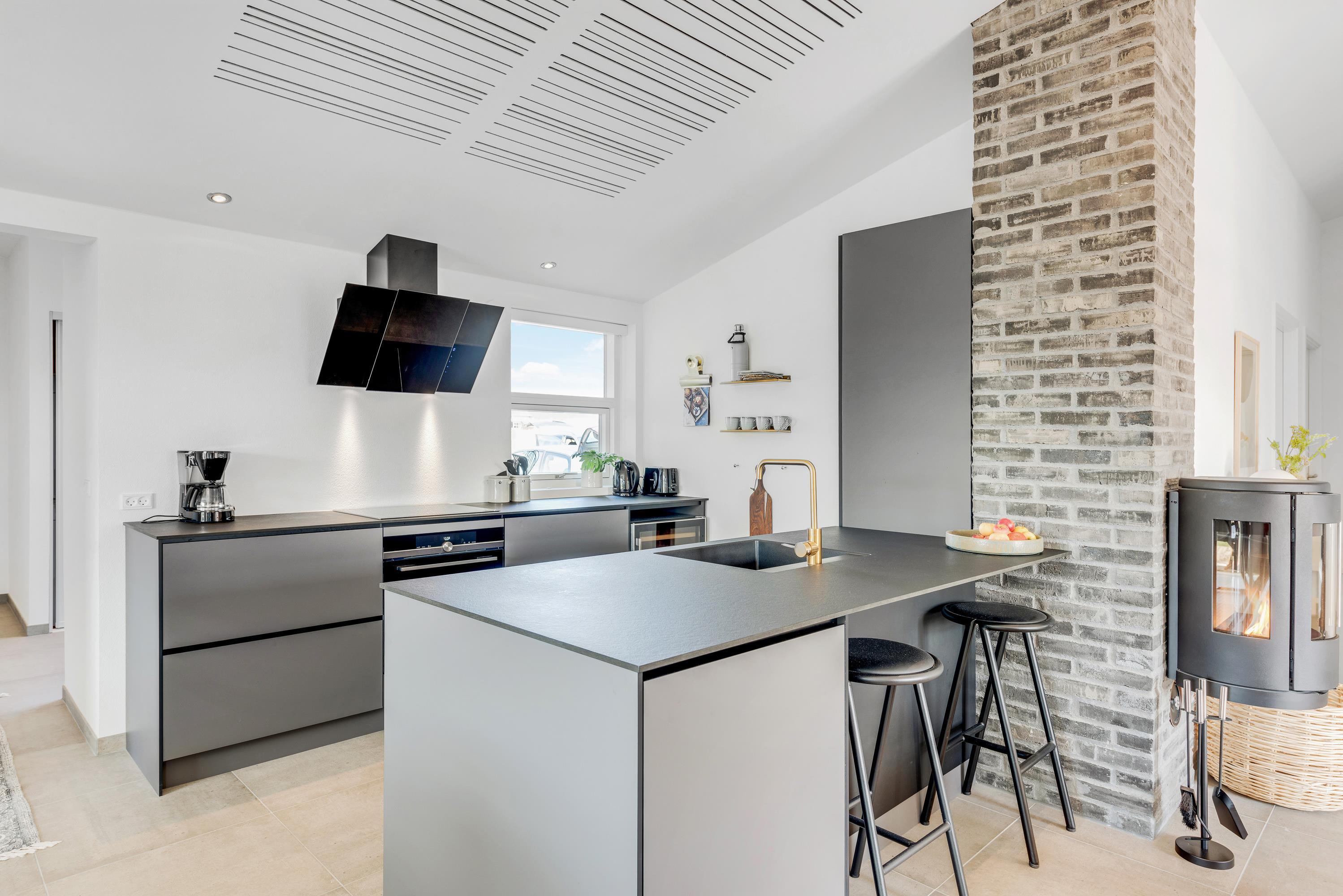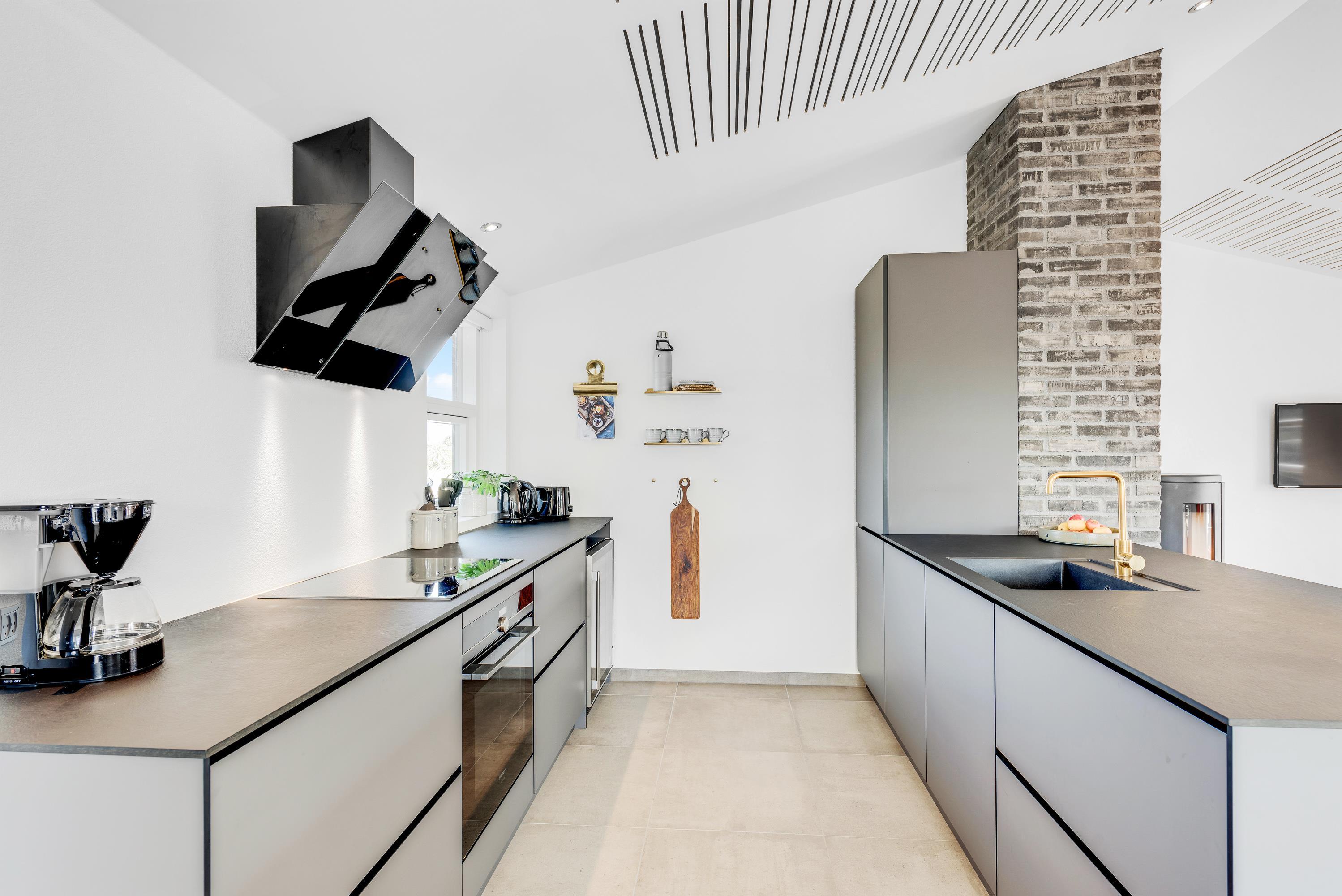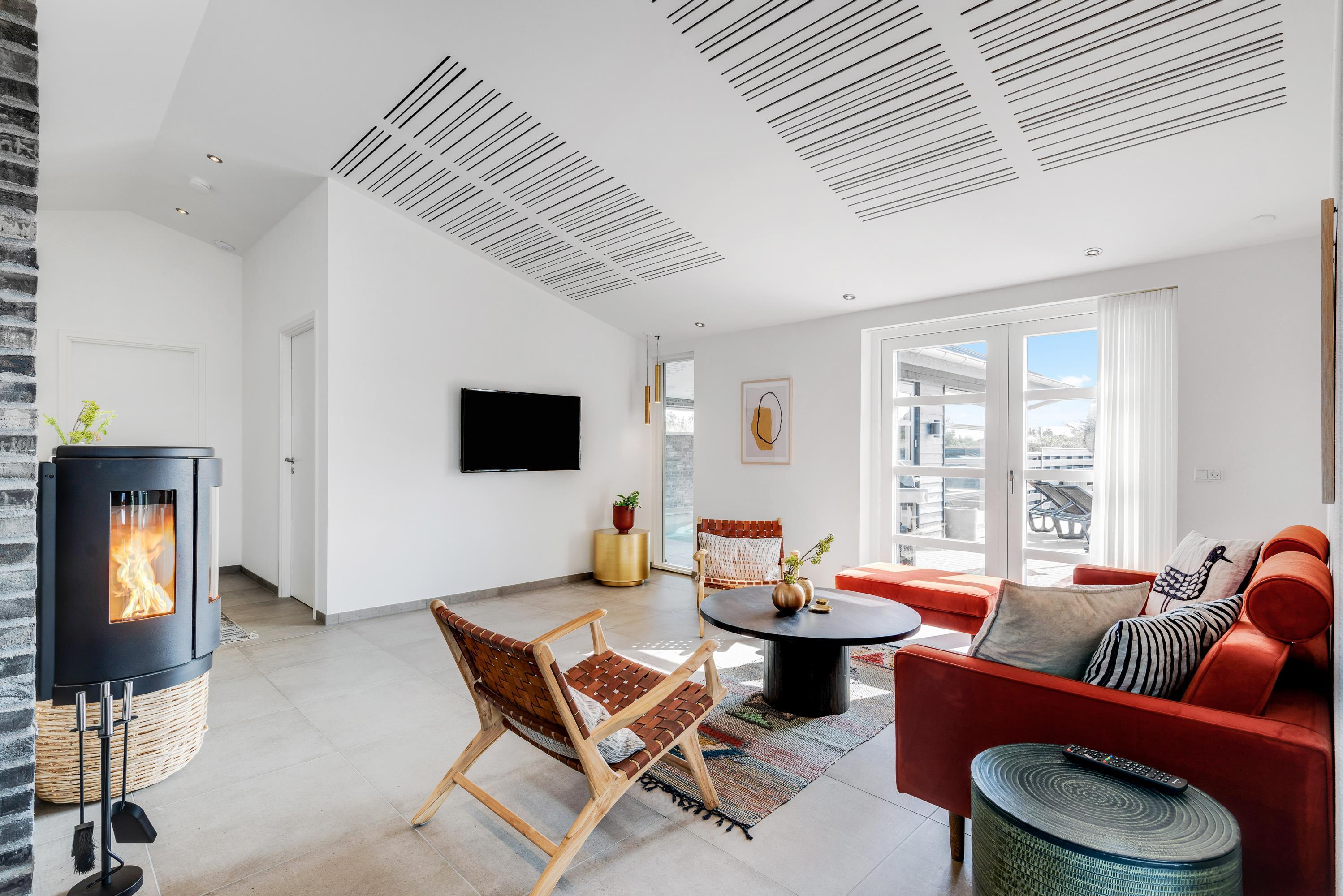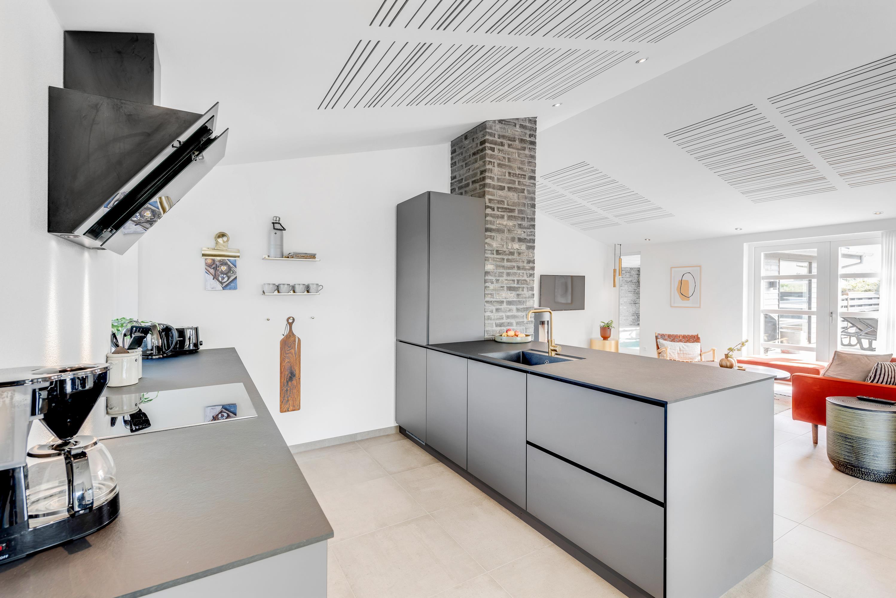 Det flotte sorte sommerhus har et stort opholdsrum, hvori stuen og køkkenet indgår – Dette fungerer altså som feriehusets hjerterum, hvor der er plads til hele jeres familie. Nyd nogle hyggelige og afslappende dage med hinanden – Hvor det eneste I behøver at bekymre jer om, er hvad aftensmadsmenuen skal stå på. I kan også slappe af foran tv'et i stuen og hvis man ønsker at se en anden film end de andre, er der tv i alle soverrum.
