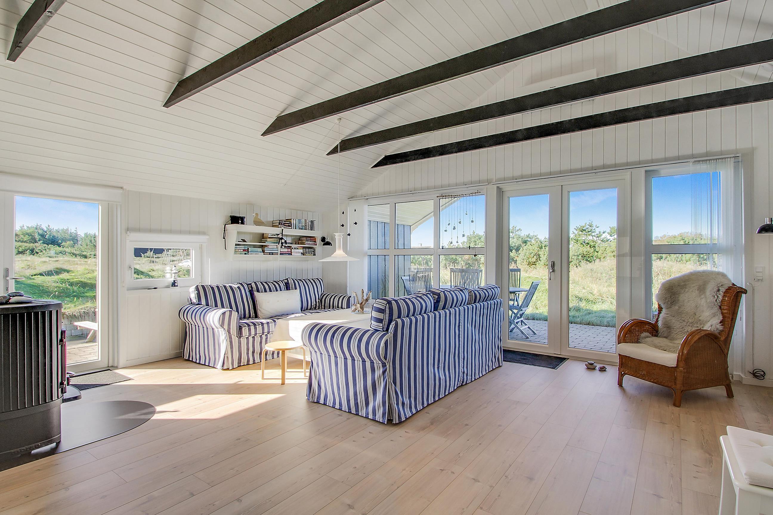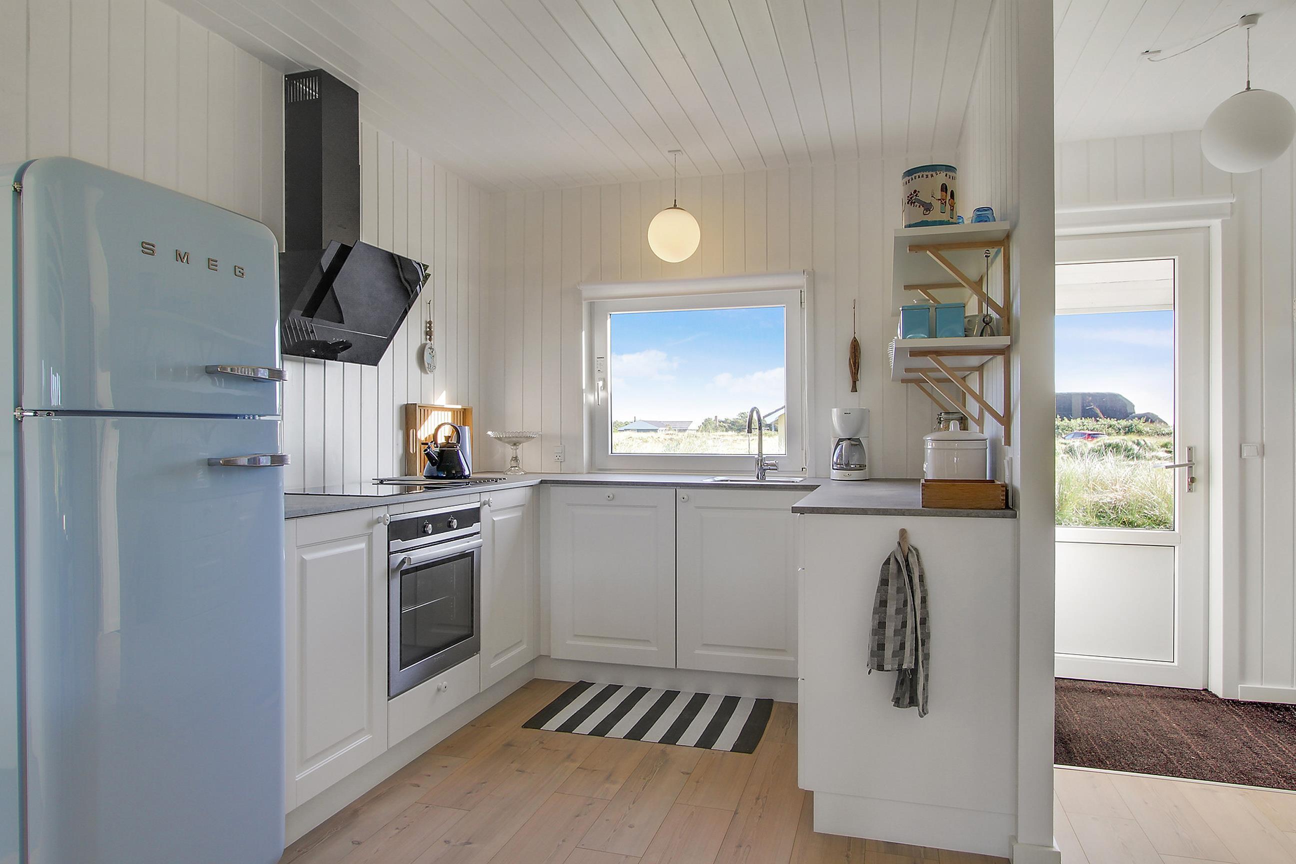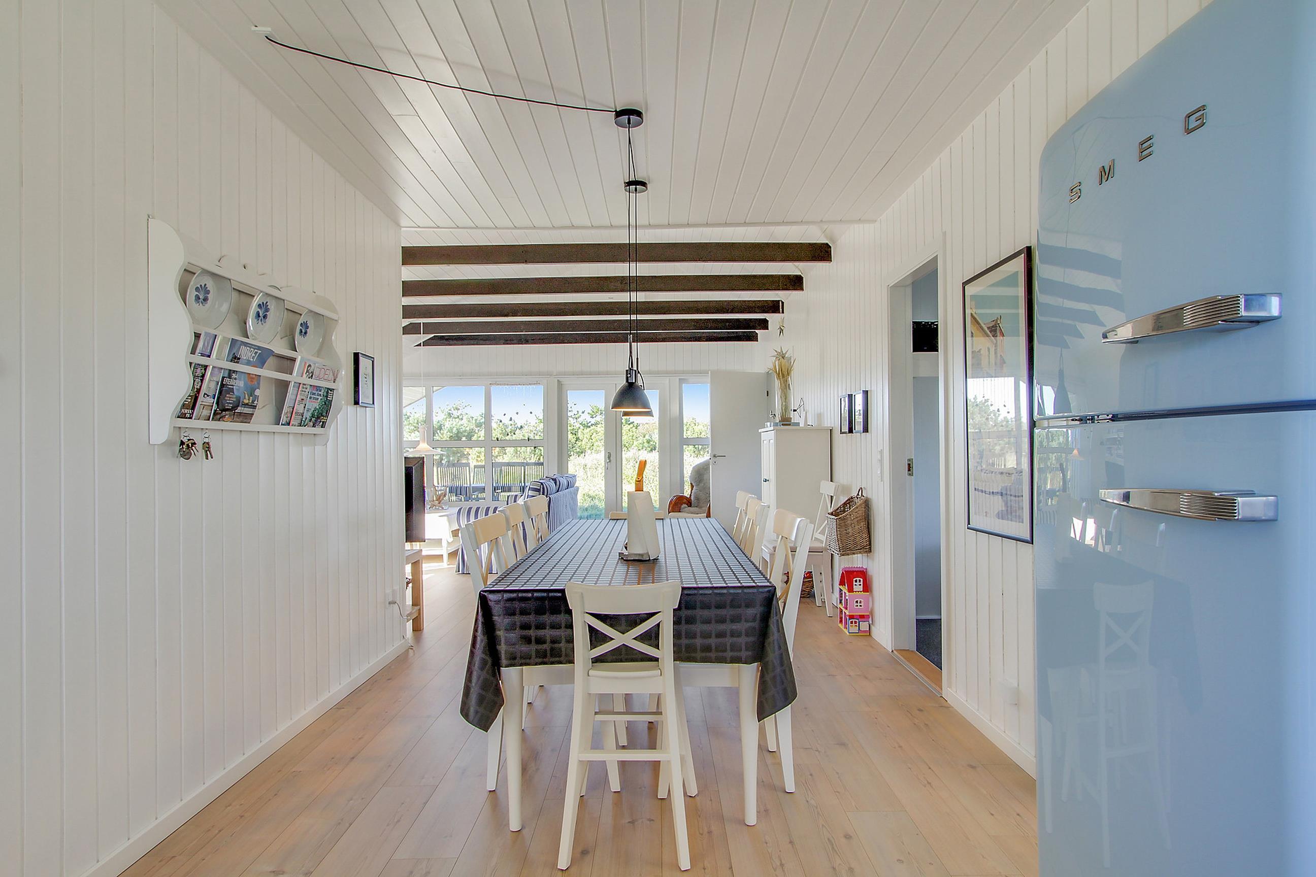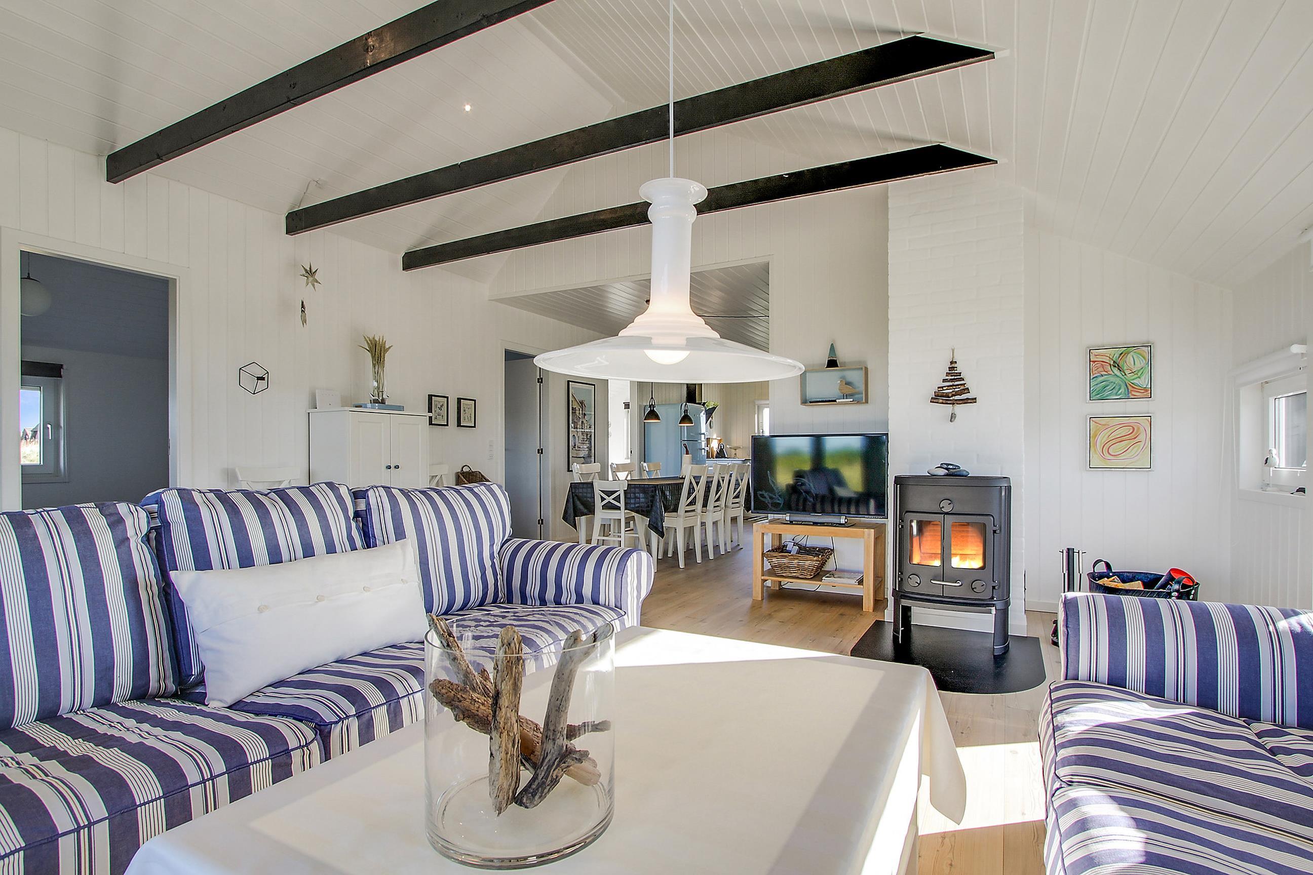 De lyse trævægge og det høje loft til kip kombineret med de særdeles smagfulde møbler er med til at give huset et romantisk pust, så I straks føler jer hjemme og kan mærke feriestemningen. Samtidig er indretningen præget af fine detaljer, såsom blåstribede sofaer, et lyseblåt SMEG-køleskab og små detaljer med drivtømmer, der giver huset en næsten maritim stemning. Meget passende for et hus, der ligger så nær vandet.