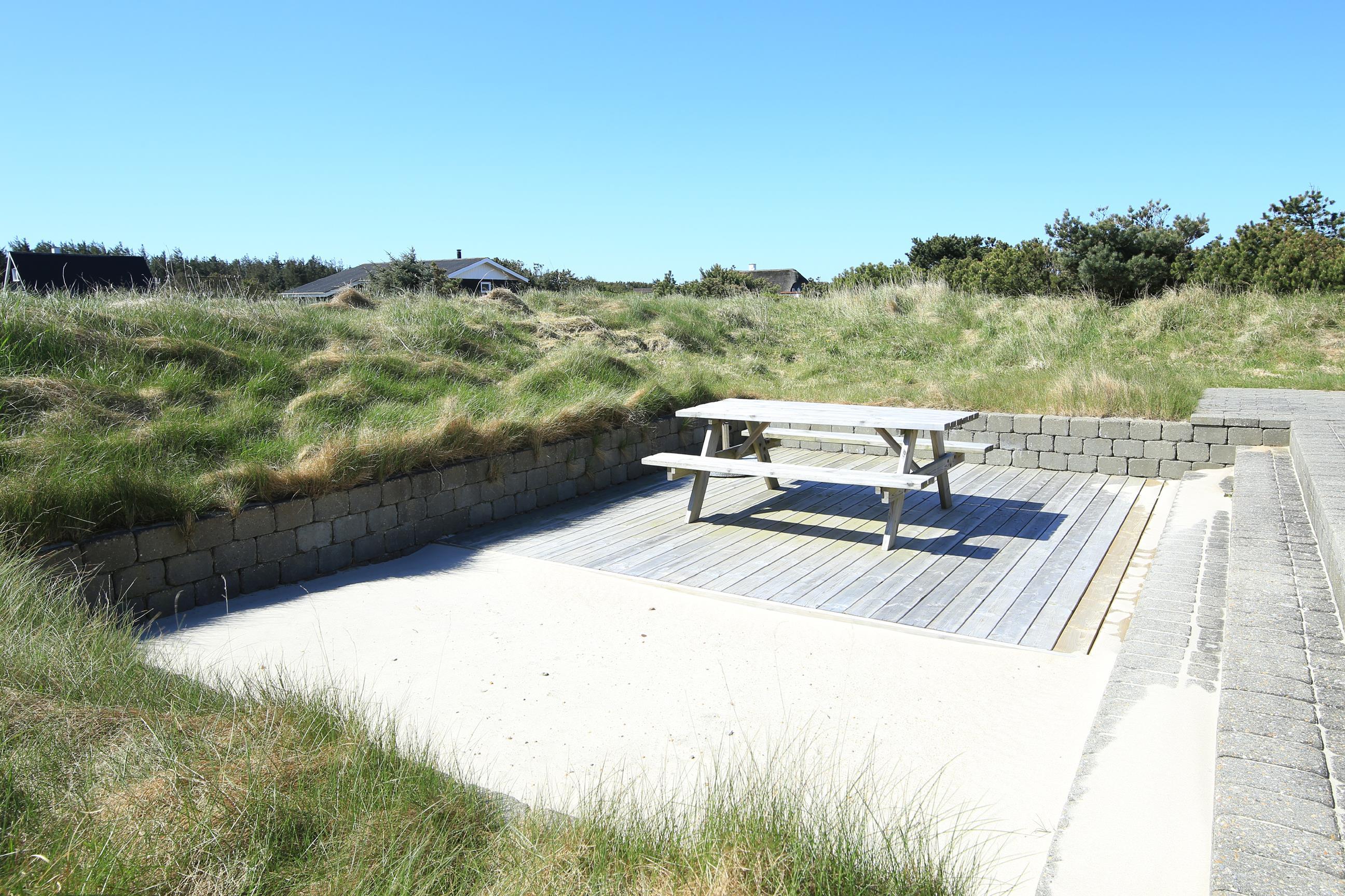 Den nedsænkede solterrasse på husets sydvest side vil formentlig blive et stort hit hos børnefamilierne, da den ligger i forbindelse med en stor sandkasse. I kan derfor holde et vågent øje med børnene, mens I sidder omkring bordet og nyder en kold forfriskning eller arbejder på sommerkuløren.