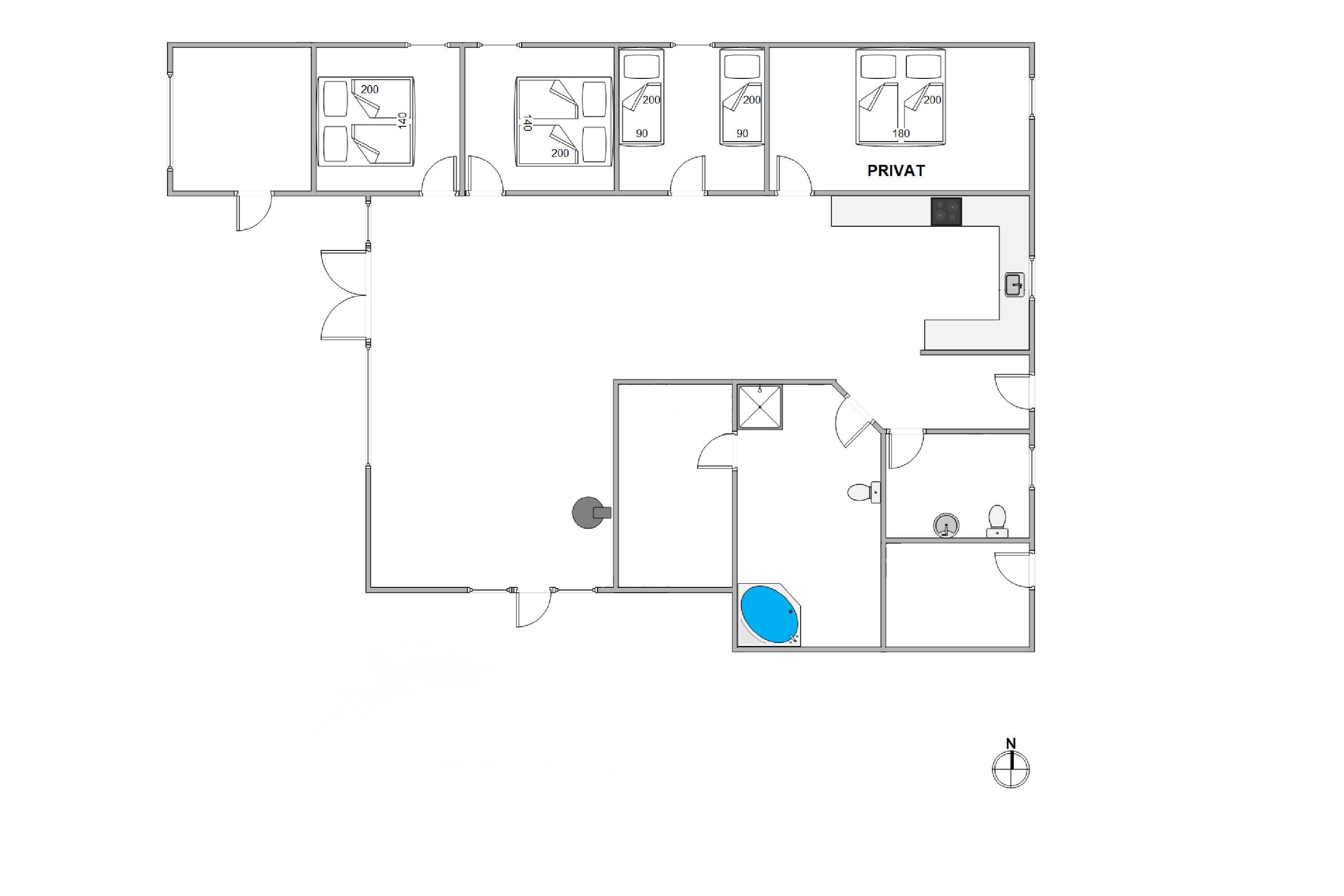 Sommerhuset har en god rumfordeling med stor opholdsstue og 3 gode værelser. 2 af disse værelser er indrettet med dobbeltsenge, mens det sidste værelse har 2 enkeltsenge. Men husets hjerte er uden tvivl det store opholdsrum med loft til kip og store vinduespartier, der inviterer lyset indenfor. Her er det plads til både aktivitet og afslapning – de to vigtigste ingredienser, når man holder ferie.