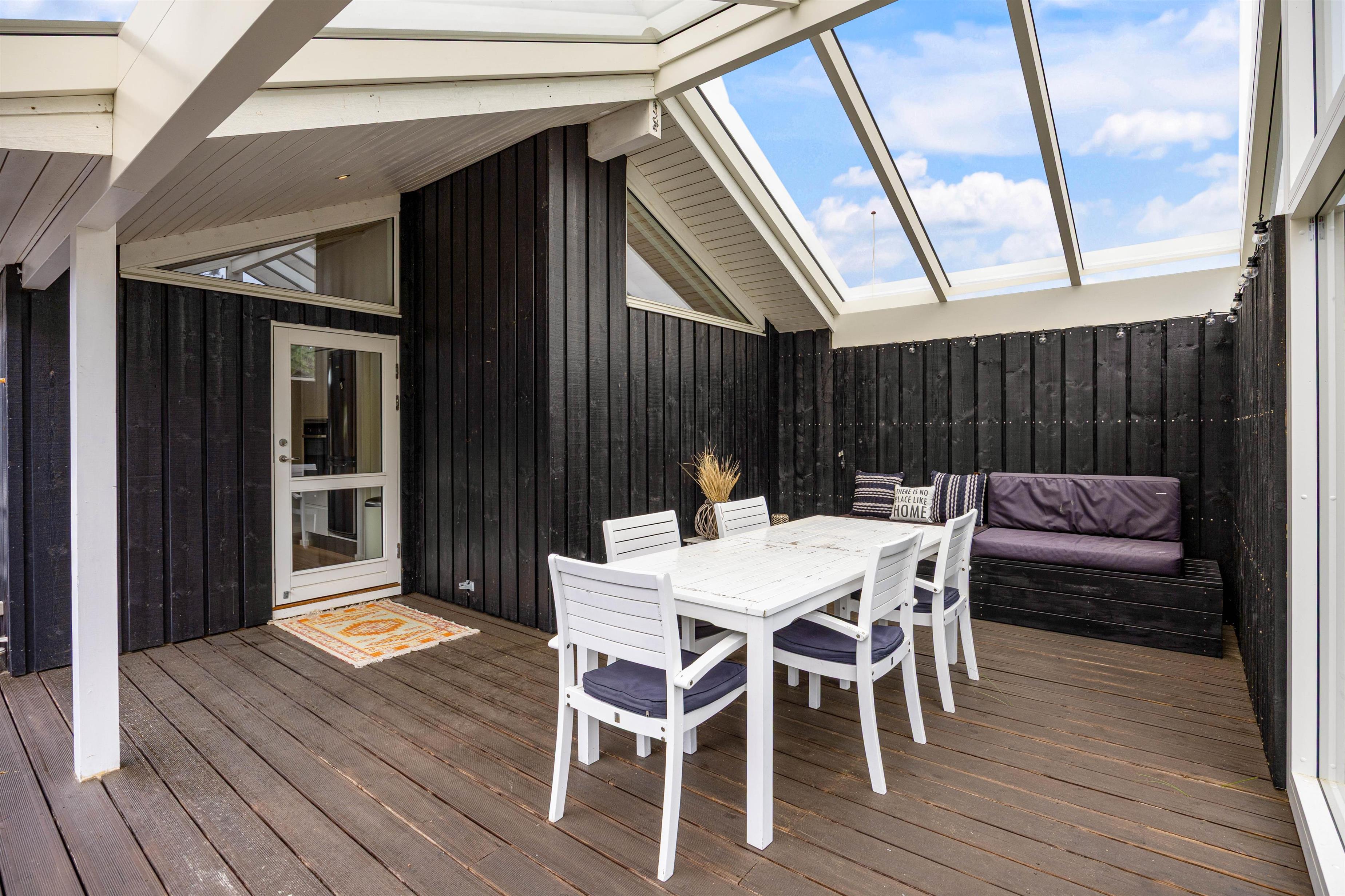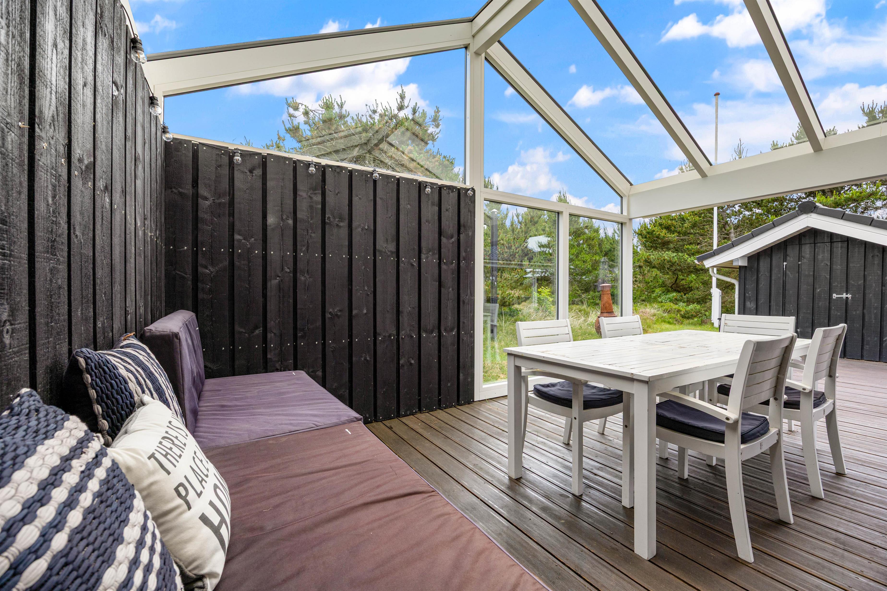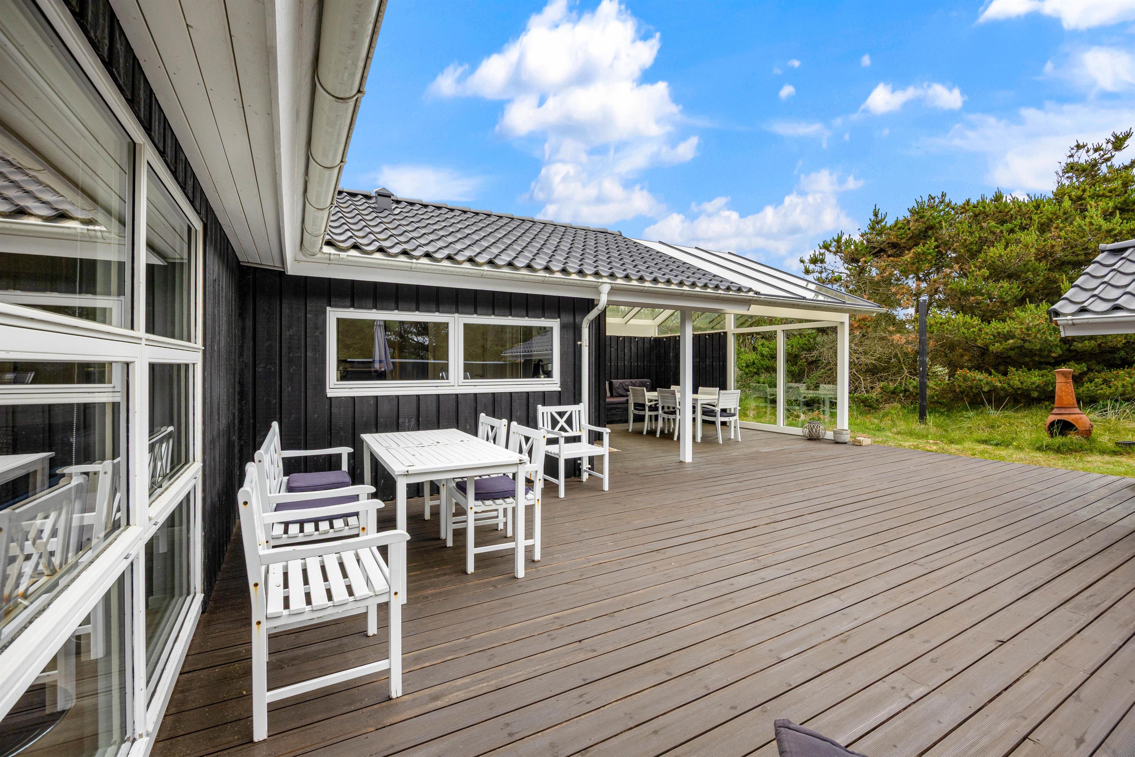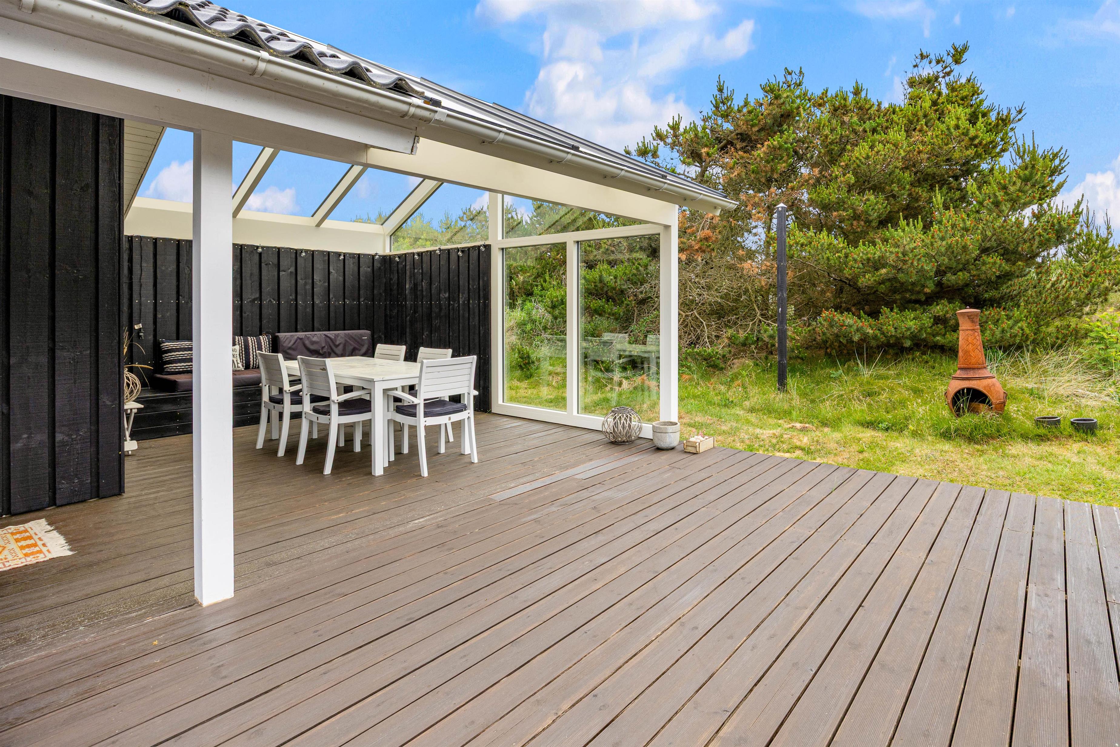 Sommerhuset kommer med en kæmpe terrasse, hvor dele af den er overdækket, hvor I kan nyde jeres måltider tilberedt på grillen, omgivet af naturens atmosfære på den 1201m2 store grund. De medfølgende havemøbler gør det let og bekvemt at slappe af udendørs, mens I beundrer den omkringliggende naturgrund. På terrassen mod sydøst kan man opholde sig helt ugeneret.