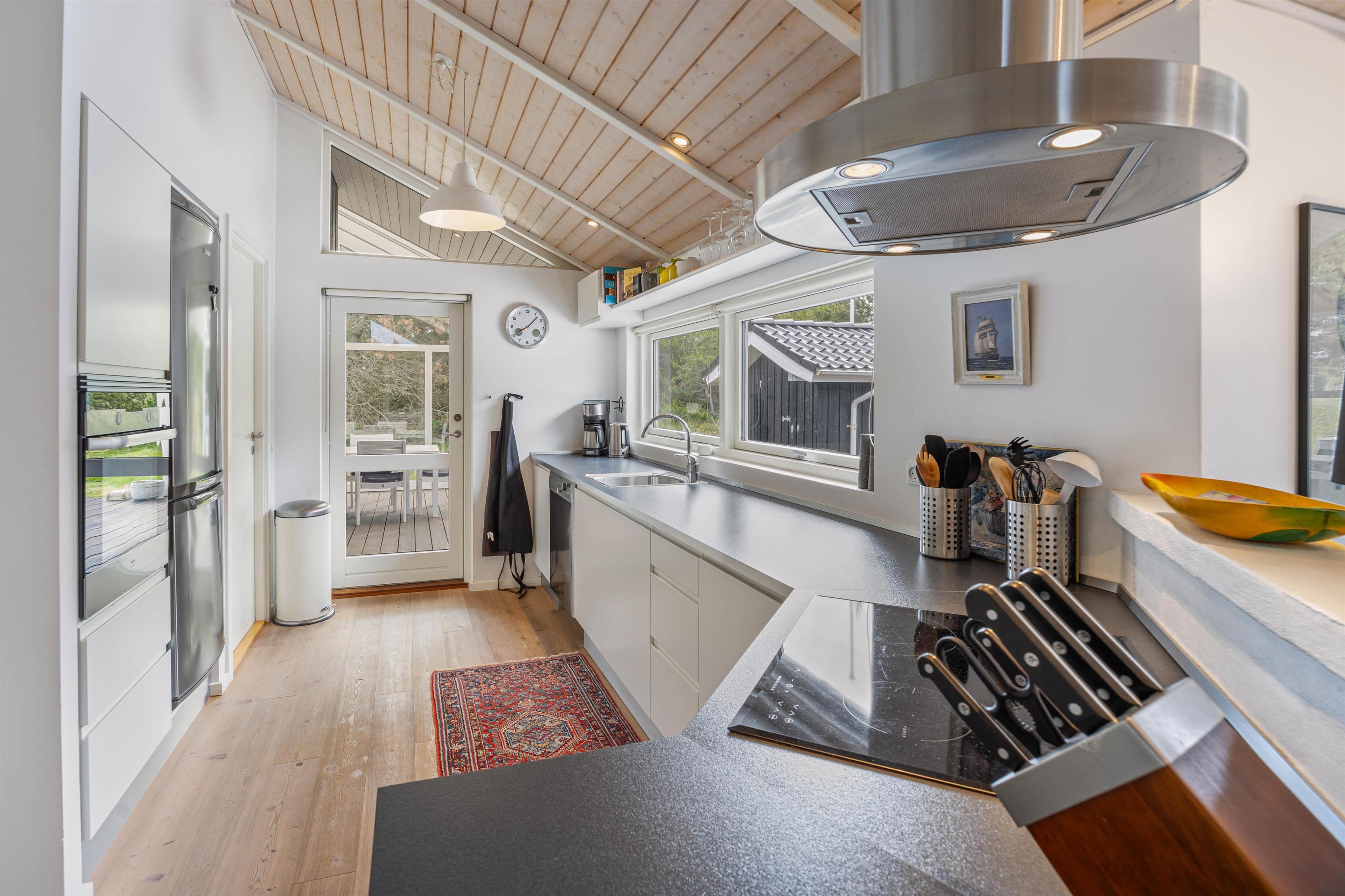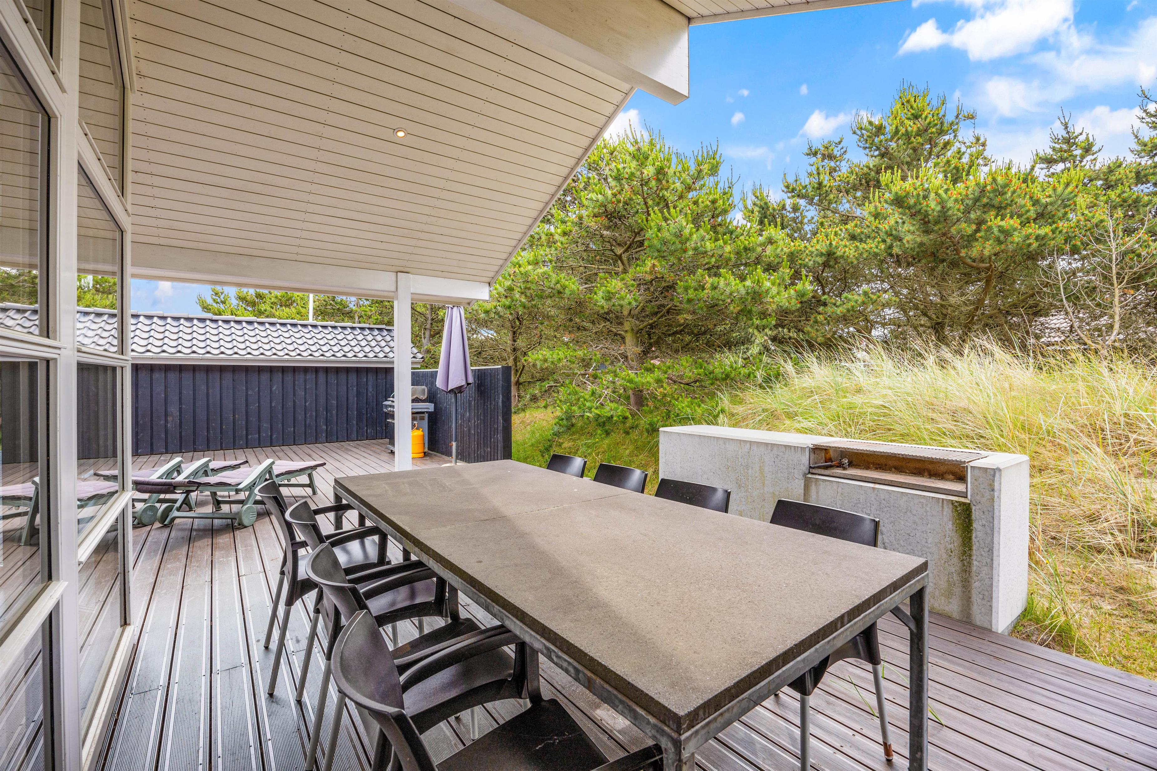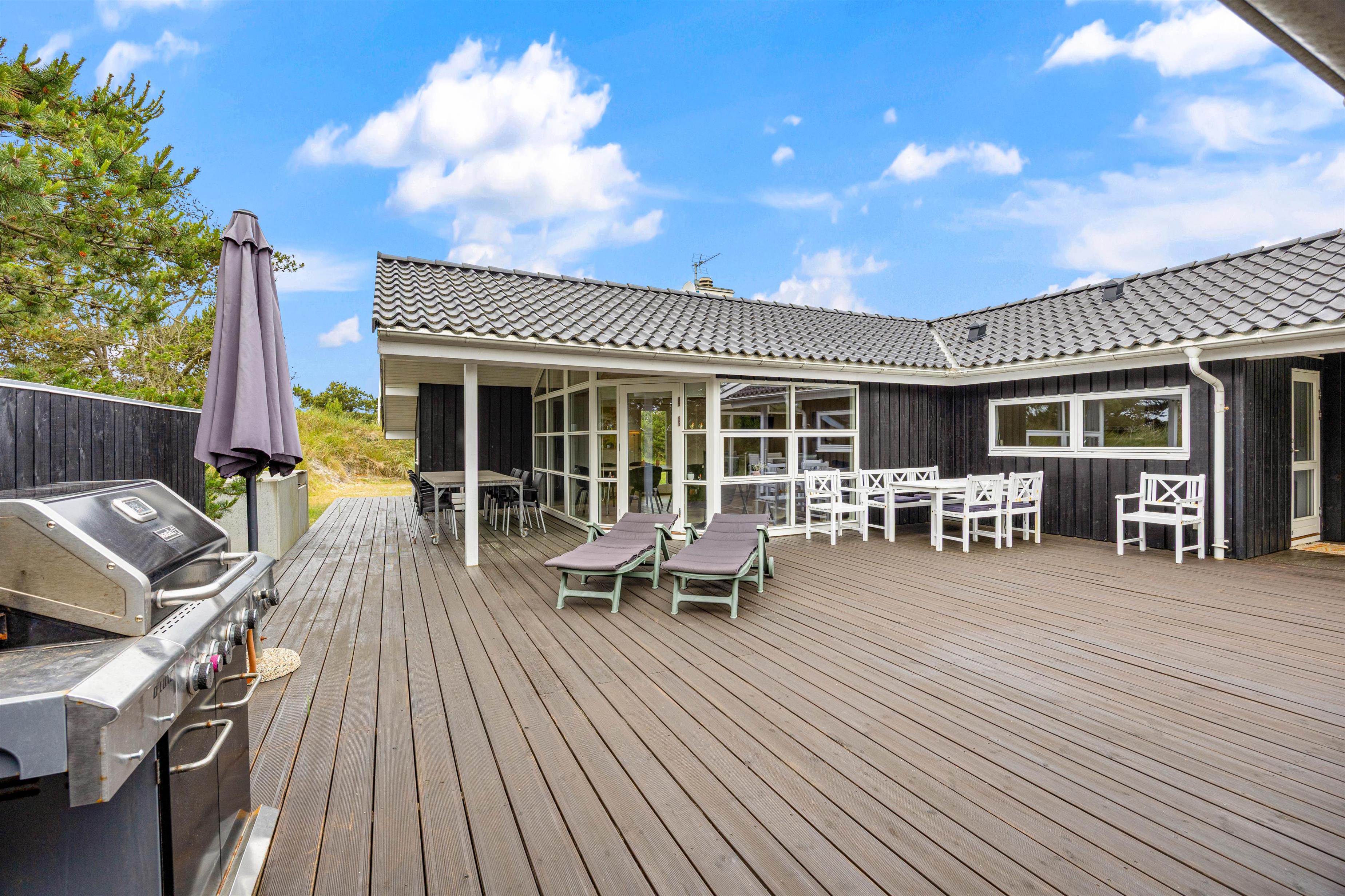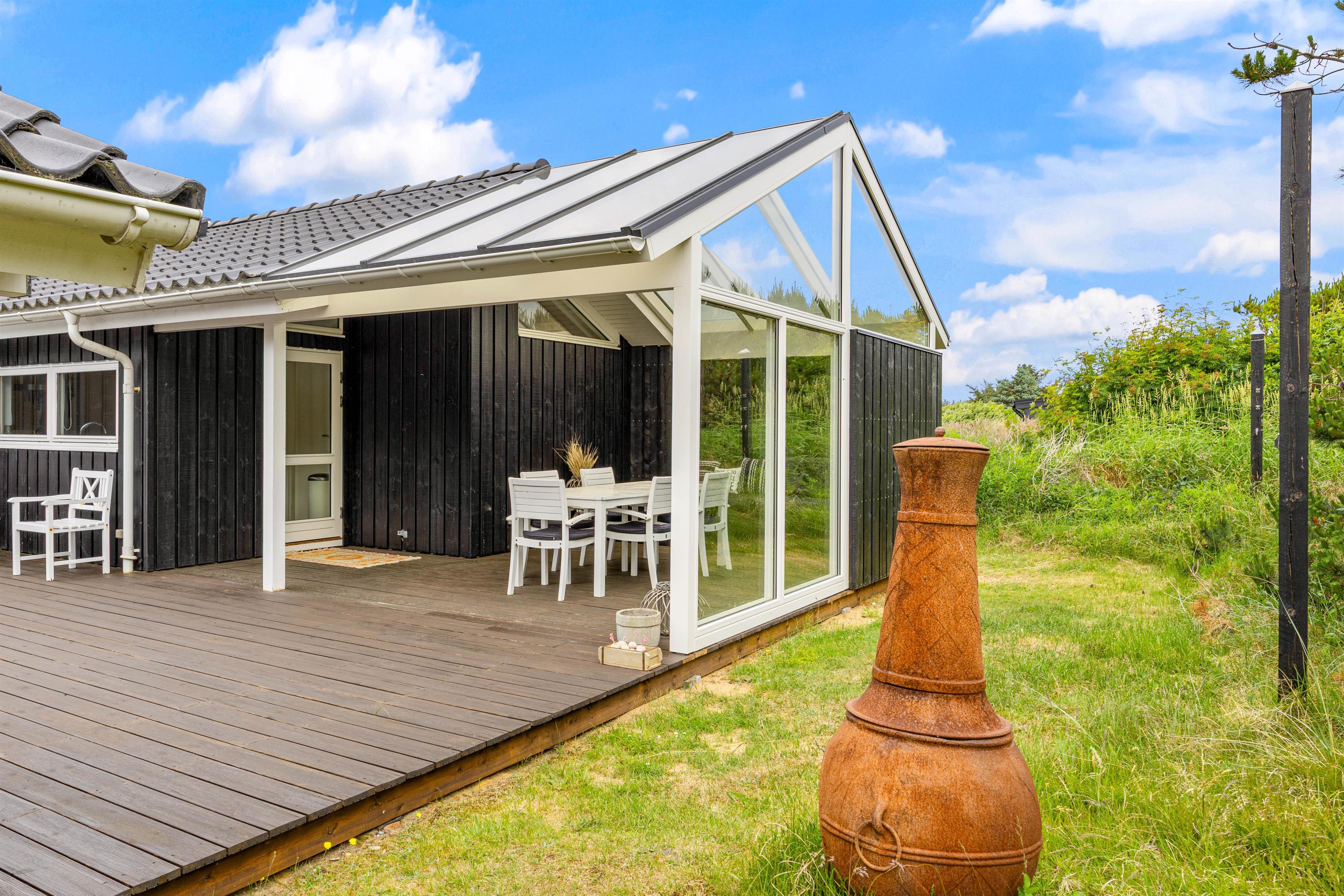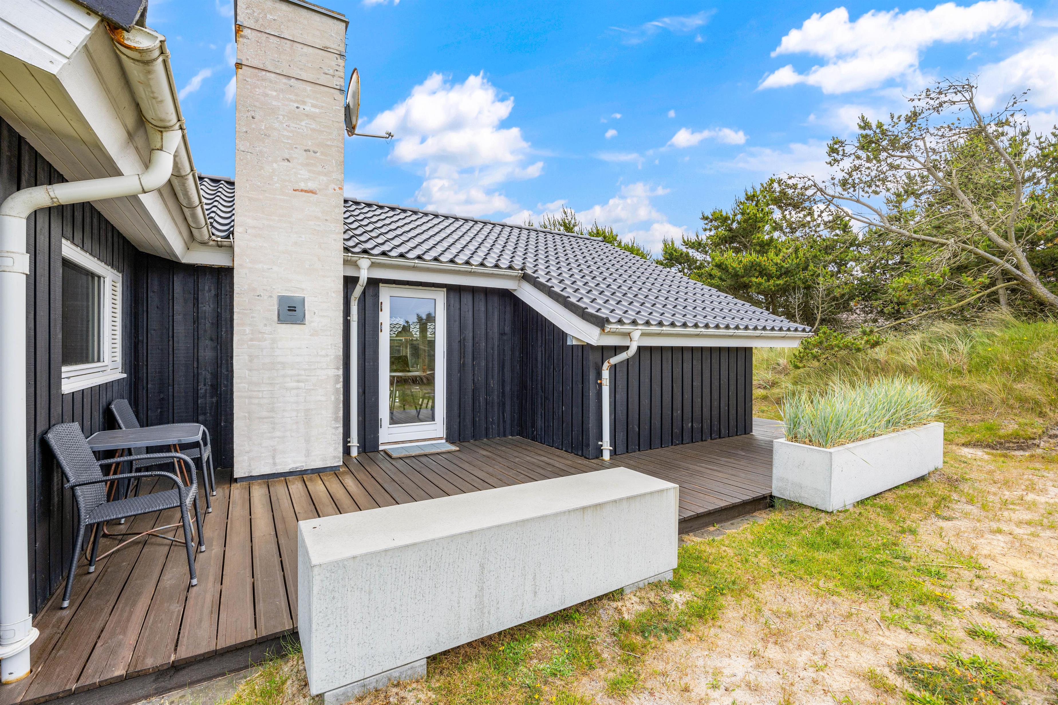 Sommerhuset kommer med en kæmpe terrasse, hvor dele af den er overdækket, hvor I kan nyde jeres måltider tilberedt på grillen, omgivet af naturens atmosfære på den 1201m2 store grund. De medfølgende havemøbler gør det let og bekvemt at slappe af udendørs, mens I beundrer den omkringliggende naturgrund. På terrassen mod sydøst kan man opholde sig helt ugeneret.