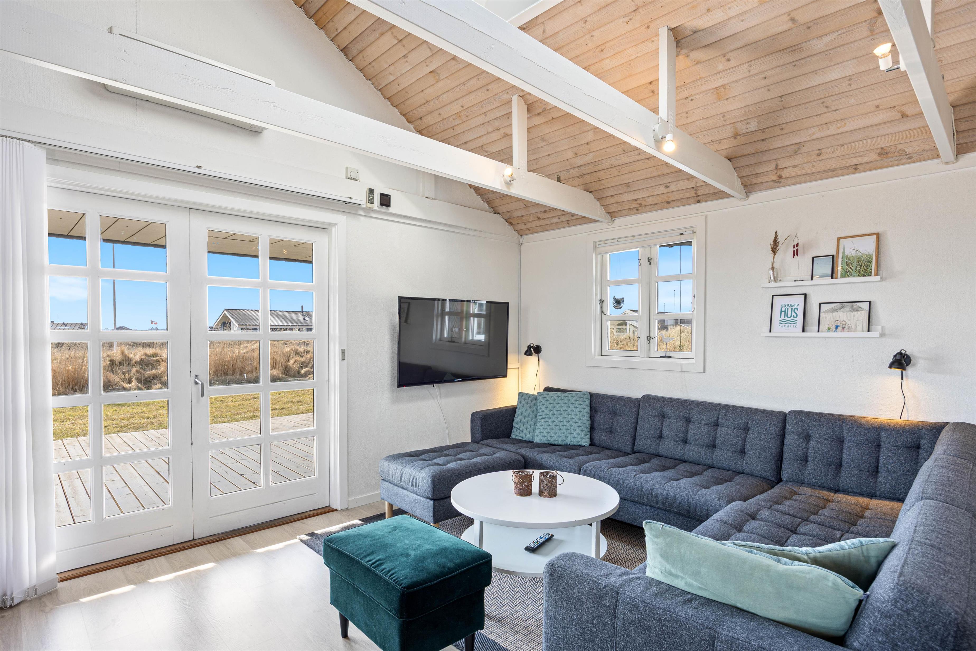 Huset er lyst og venligt velindrettet, og her er både tænkt på både det praktiske og på hyggen. I det åbne opholdsrum er det godt udstyrede køkken med opvaskemaskine integreret, og i midten af rummet står den klassiske brændeovn, der sørger for god varme og feriestemning, mens I slapper af på den store hjørnesofa med en friskbrygget kop kaffe.