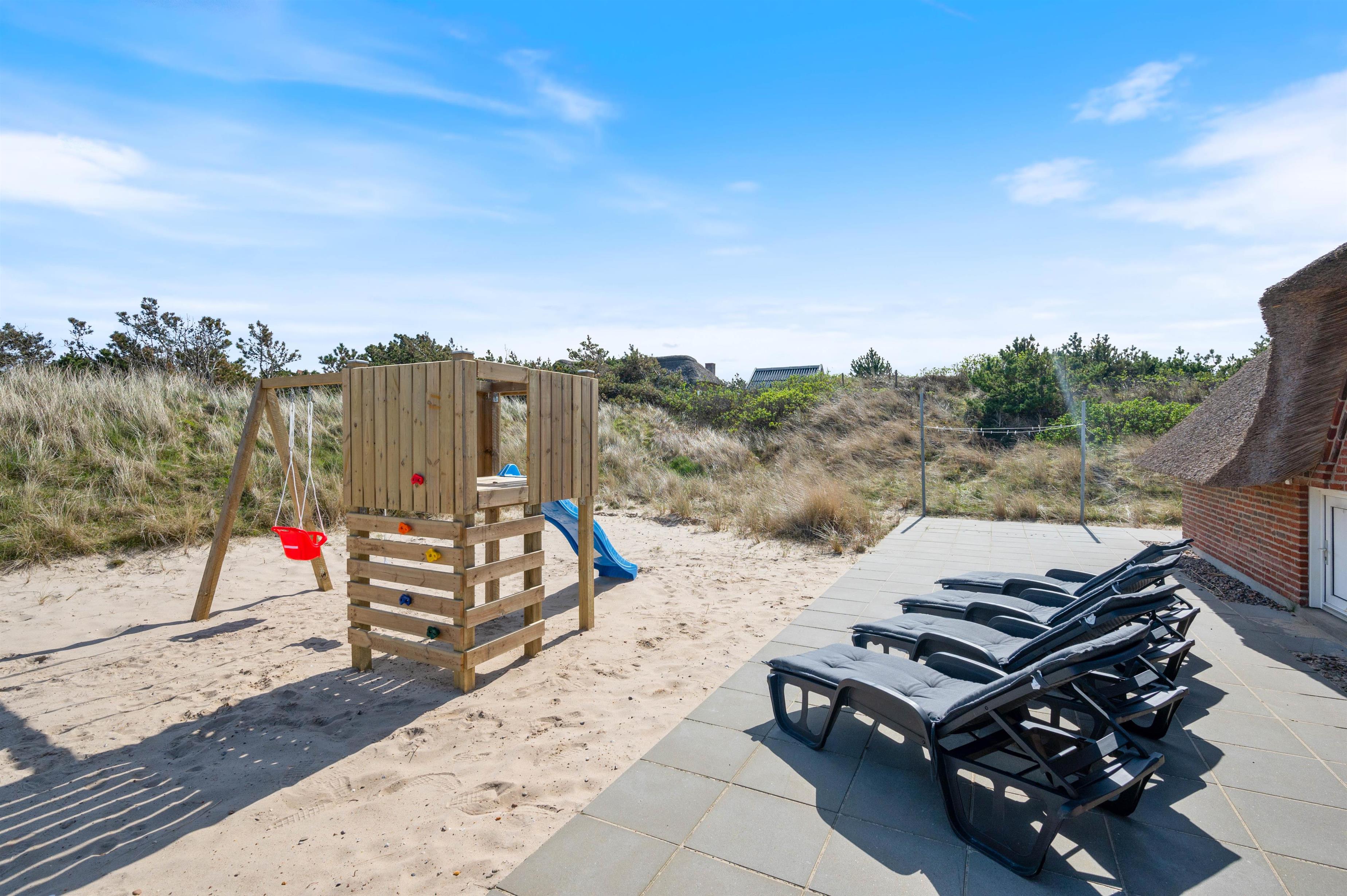 Sommerhuset byder også på et dejligt udeområde, hvor I kan tilbringe de varme og solrige feriedage. Her har I en skøn terrasse, der er afskærmet, hvor I kan slappe af og finde jer til rette i havemøbler og liggestole, mens børnene leger i haven. Her er der en legeborg med gyngestativ, rutsjebane og en kæmpe sandkasse. På terrassen kan I også samle hele ferieflokken om aftenen til en lækker middag på sommerhusets grill.