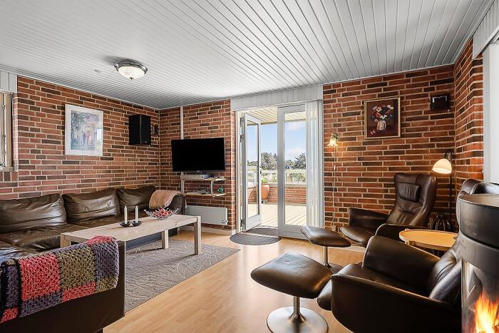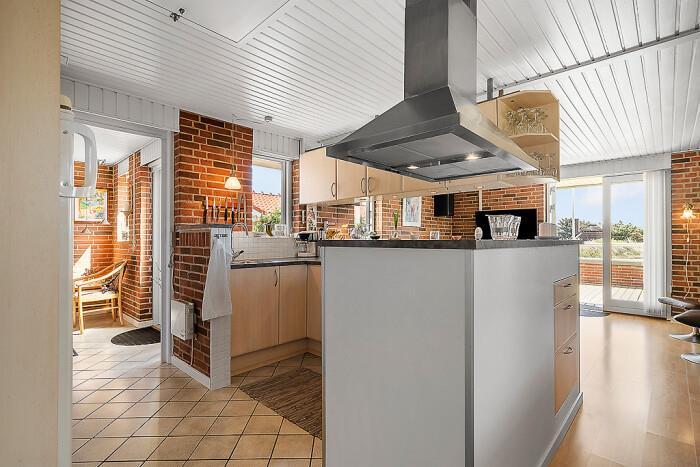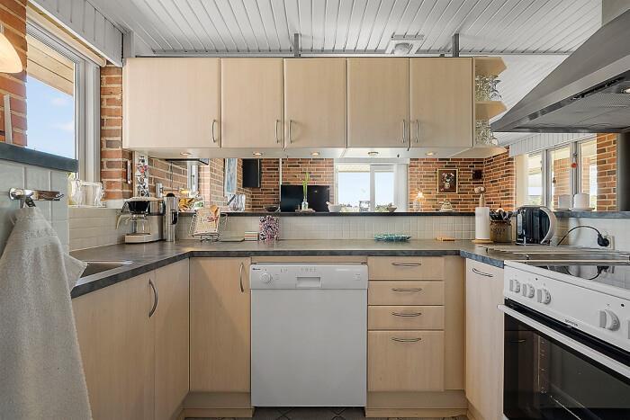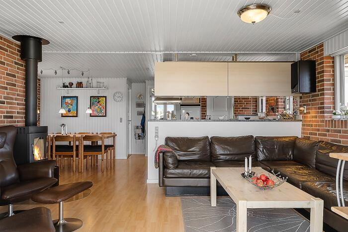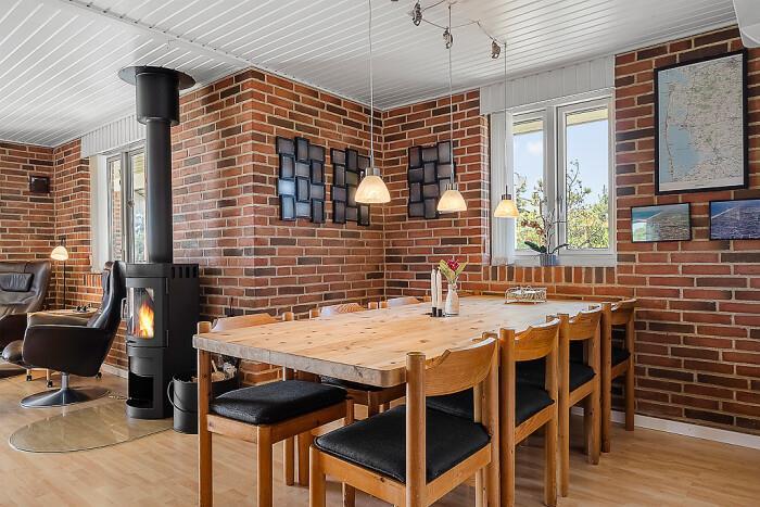 Det åbne køkken-alrum gør det nemt at deltage i socialt samvær – feriekokken kan trylle i det veludstyrede køkken, mens resten af familien samles omkring spisebordet eller i stuen. Her kan I også tænde op i husets brændeovn for ekstra hygge og varme.