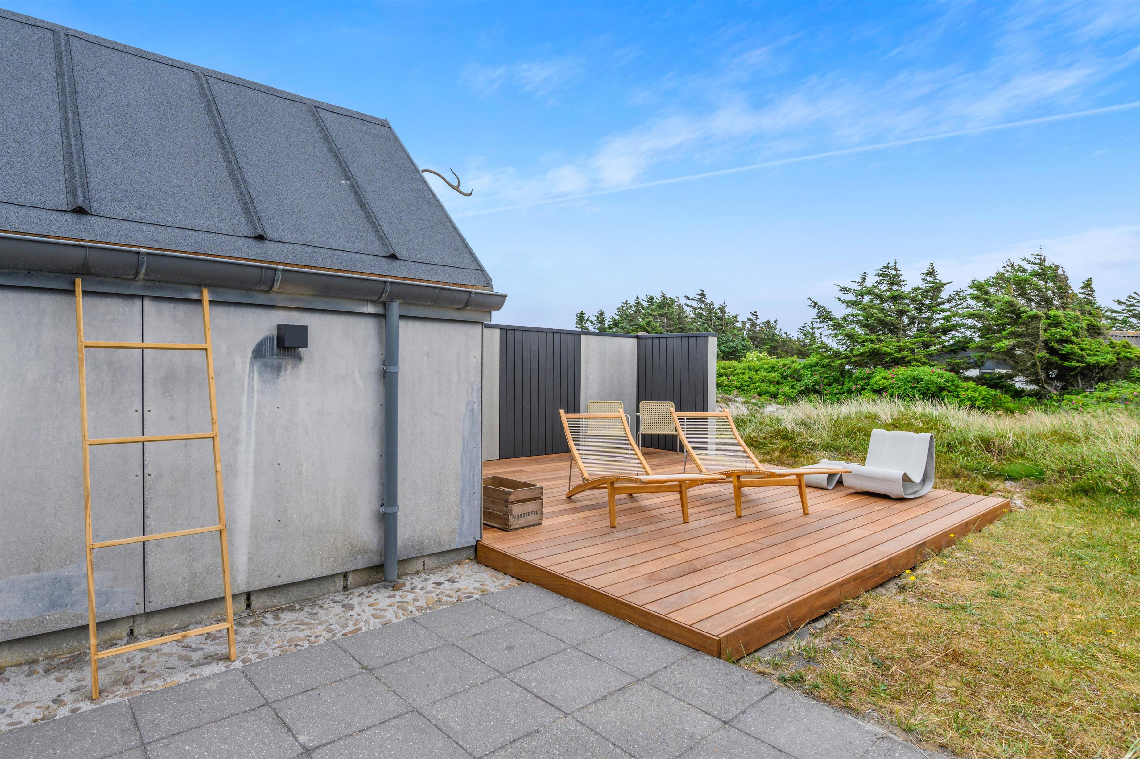 Sommerhuset på Nordsøvej 390 byder på en skøn terrasse. Fra stuen er der direkte udgang til terrassen, som både er overdækket og afskærmet – ideel til hyggelige stunder i læ for vinden. Her kan I nyde lange, lyse sommeraftener i komfortable havemøbler med familien samlet omkring jer.