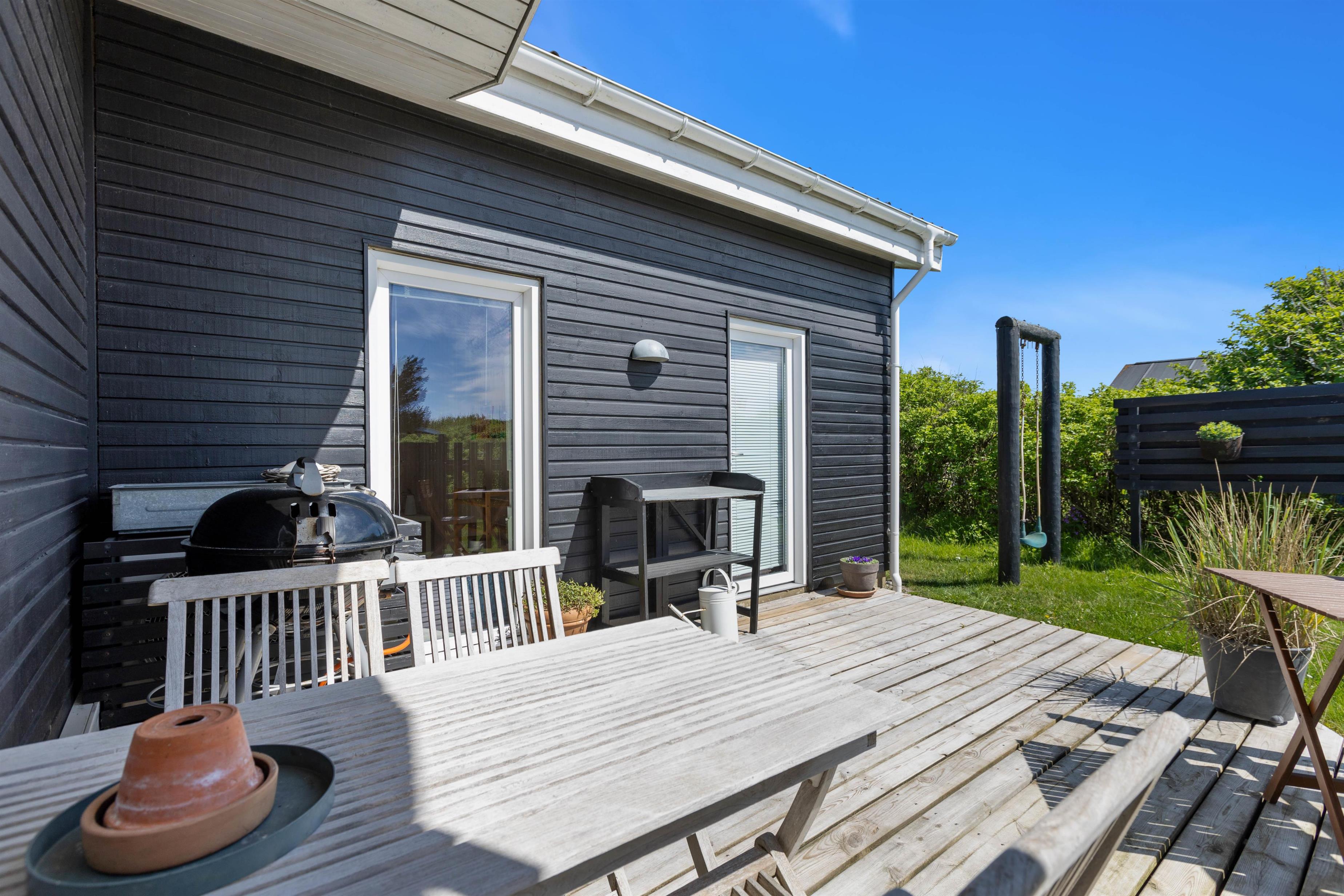 Feriehuset har en åben og afskærmet terrasse, hvor I kan nyde solen eller have hyggelige grillaftener under åben himmel. Det er også her i finder de behagelige havemøbler og solsengen, hvor i kan nyde de varme sommerdage.