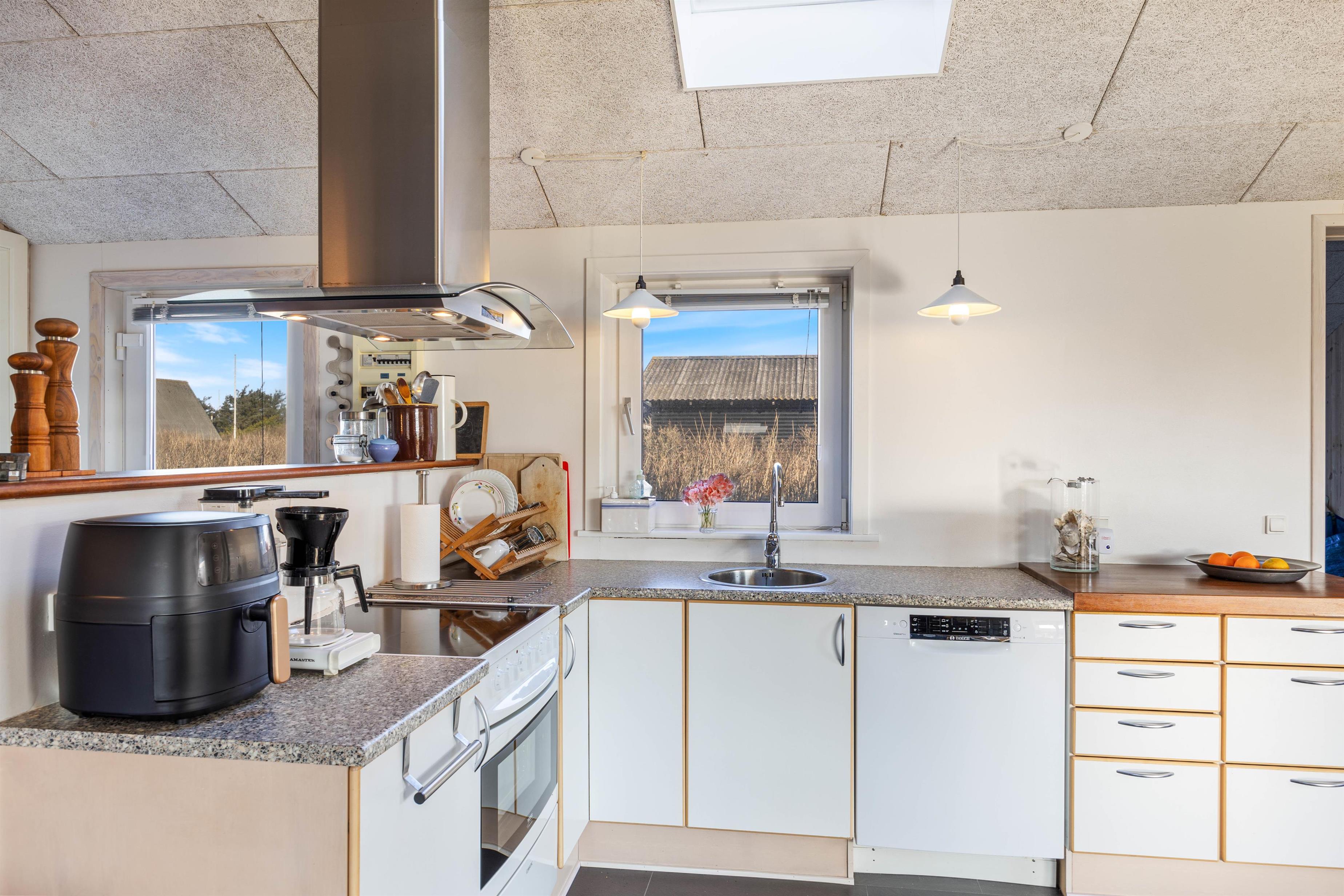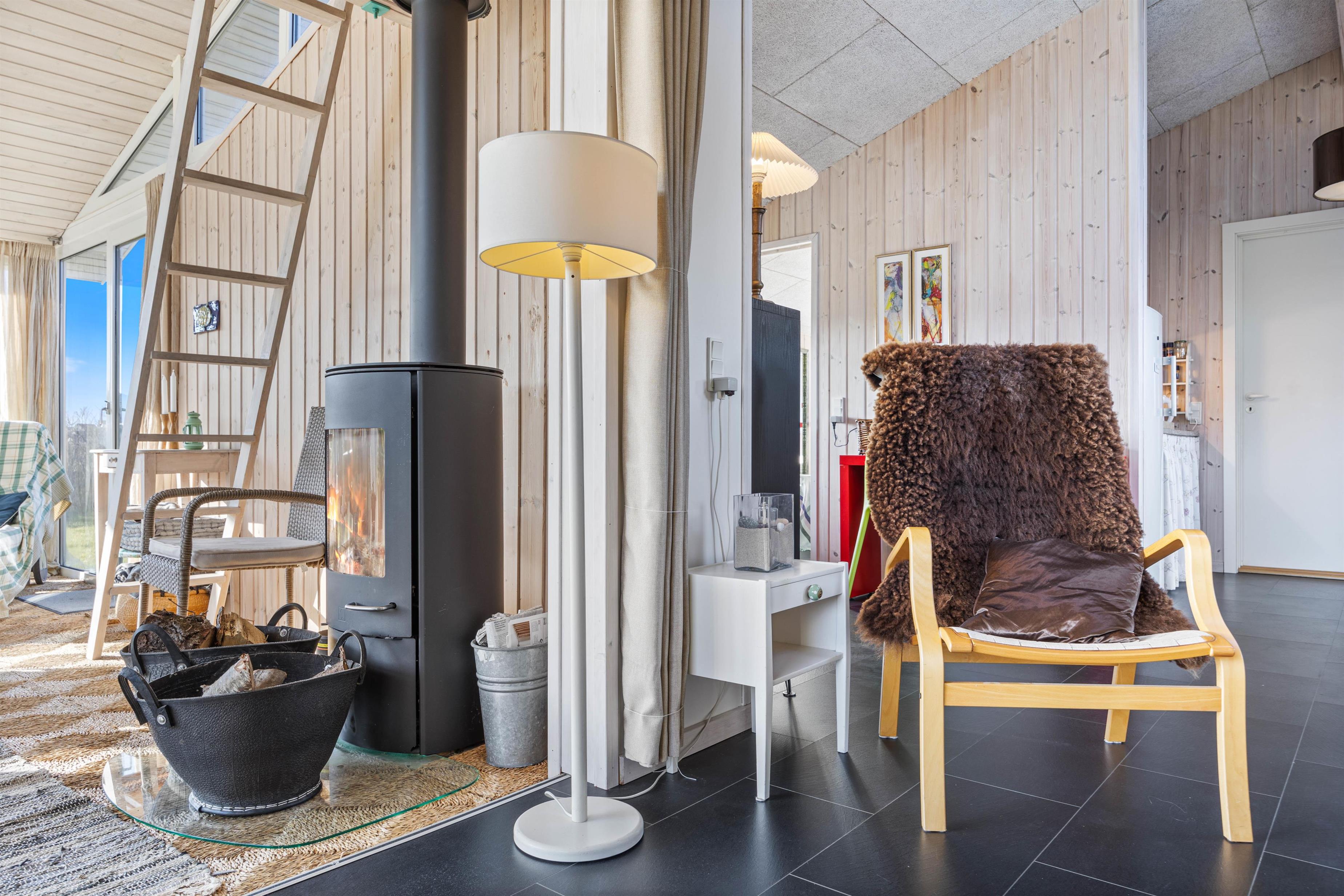 Feriehusets indretning imponerer med sin hygge. Det veludstyrede køkken giver jer mulighed for at lave jeres yndlings ferieretter med venner eller familien ved det store spisebord. Opvaskemaskinen gør oprydningen efter et måltid til en leg. Opholdsstuen med brændeovn skaber en hyggelig atmosfære på de kølige aftener, og bidrager til den helt rigtig feriestemning. Har I ikke gang i brændeovnen, har I mulighed for at benytte jer af den energibesparende luft-til-luft varmepumpe, som bidrager til et behageligt indeklima hele året rundt.