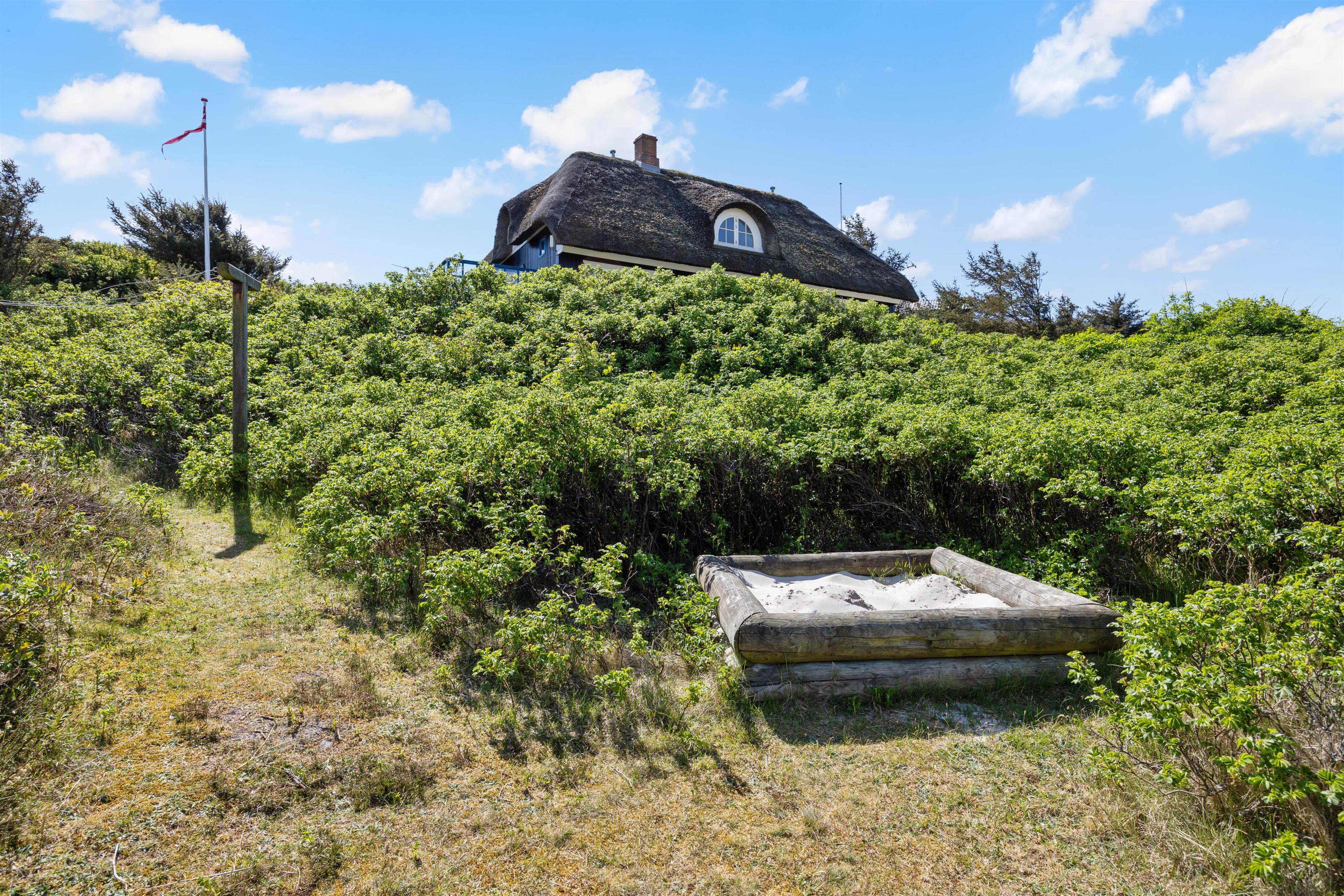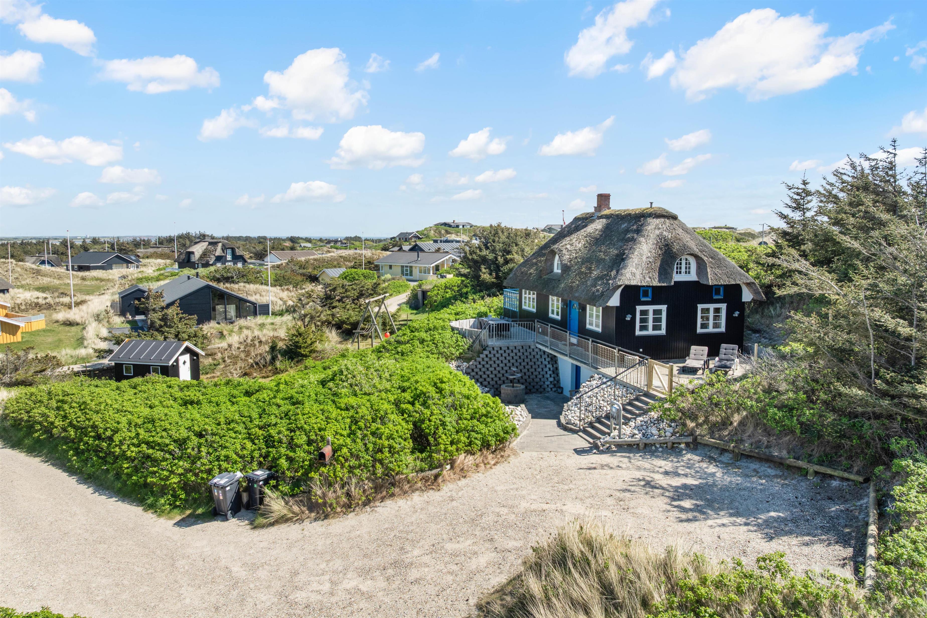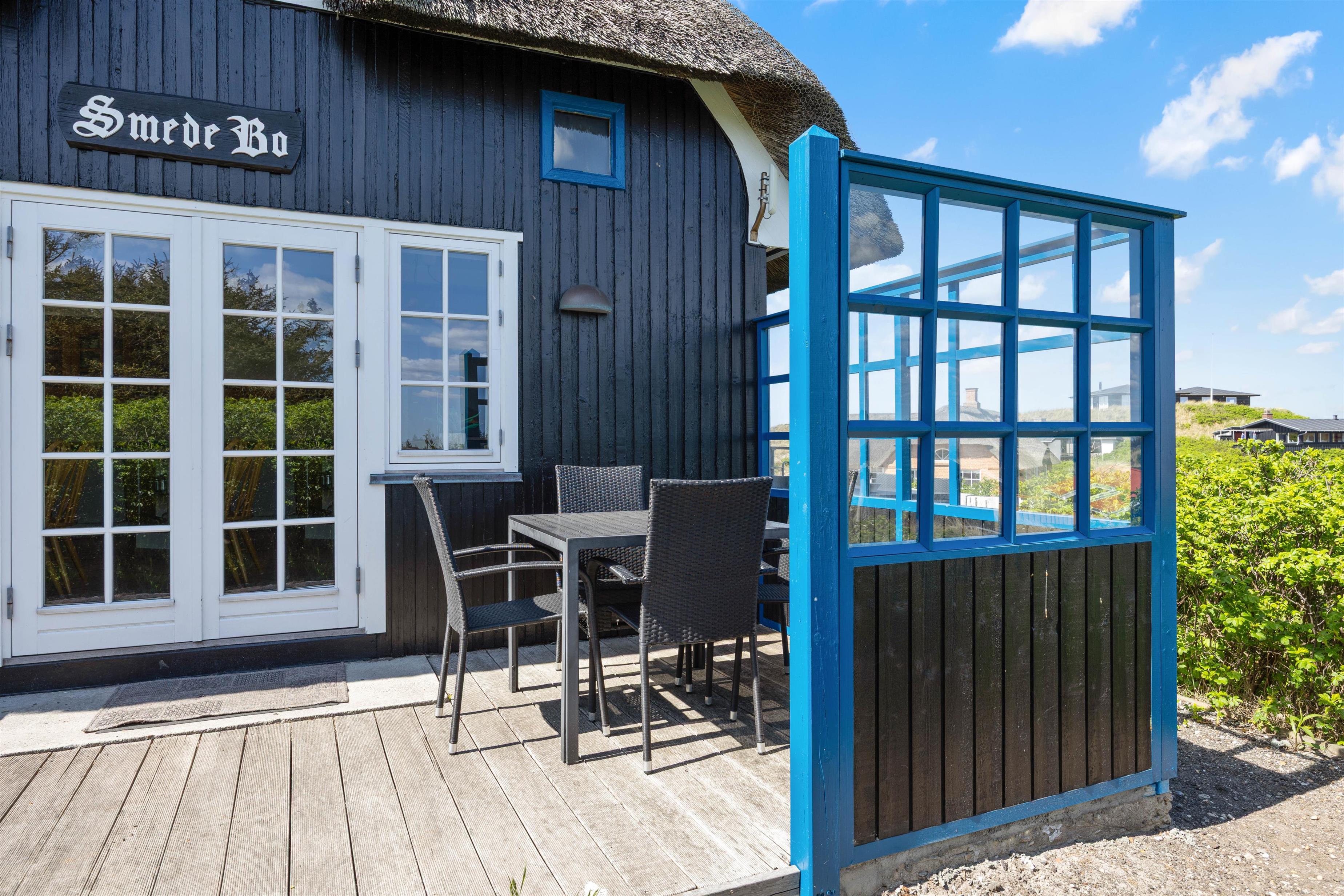 Det flotte stråtægte hus ligger trygt bag ved klitterne, så selvom det blæser er der altid mulighed for at finde læ. Der er virkelig tænkt på, at der skal være mulighed for at sidde udenfor og nyde den smukke natur. Der er havemøbler rundt på alle terrasserne og der er også en gasgrill til rådighed.