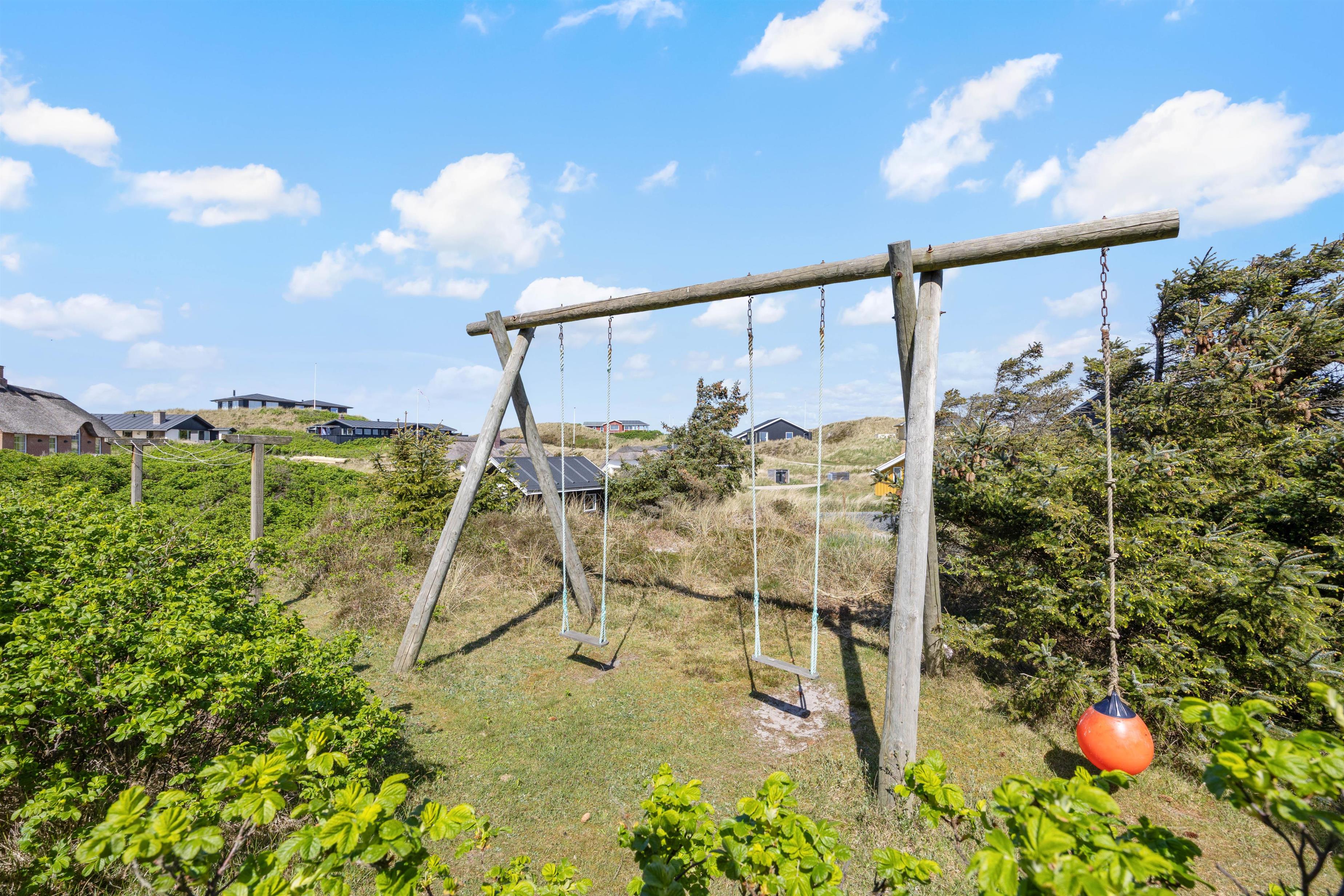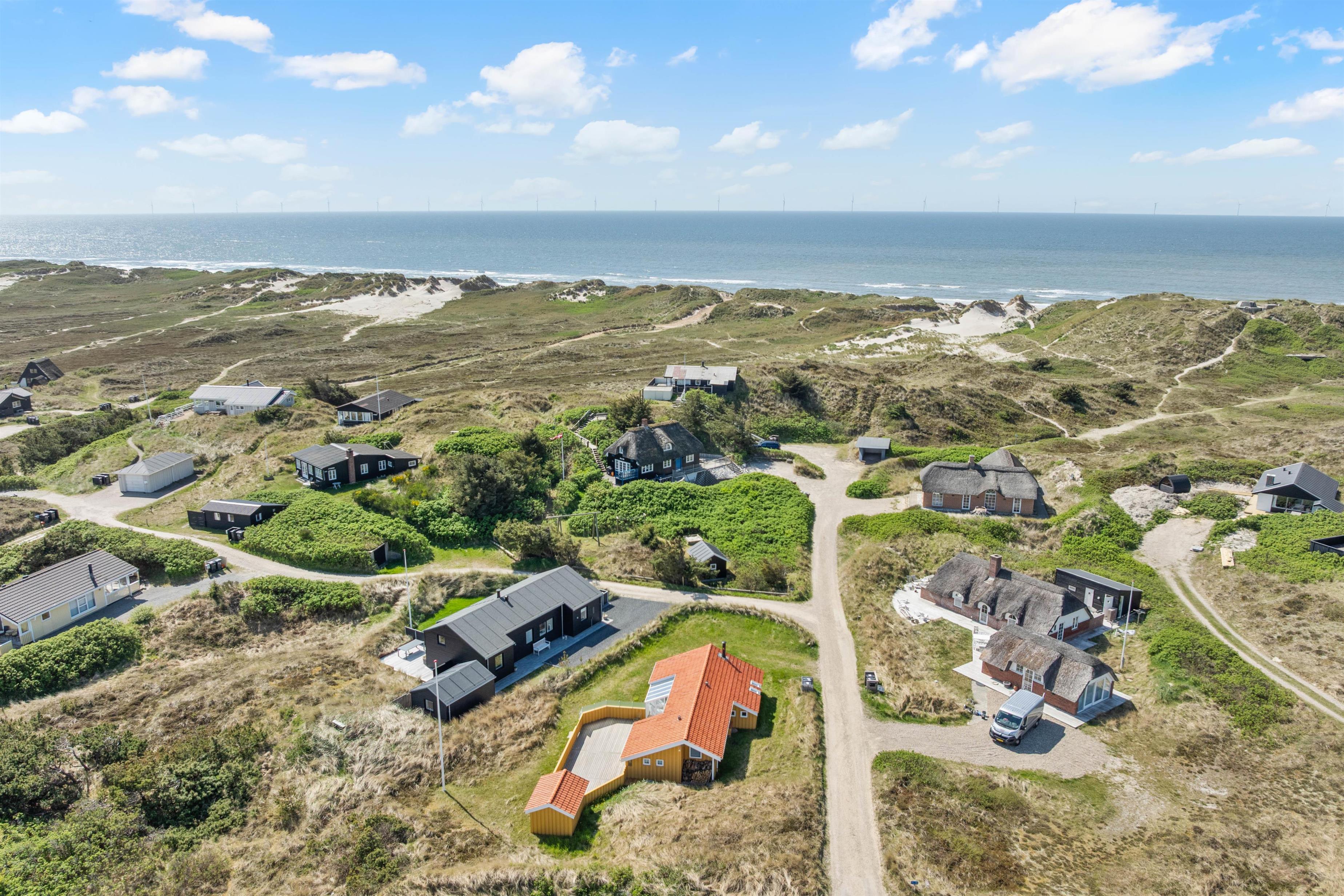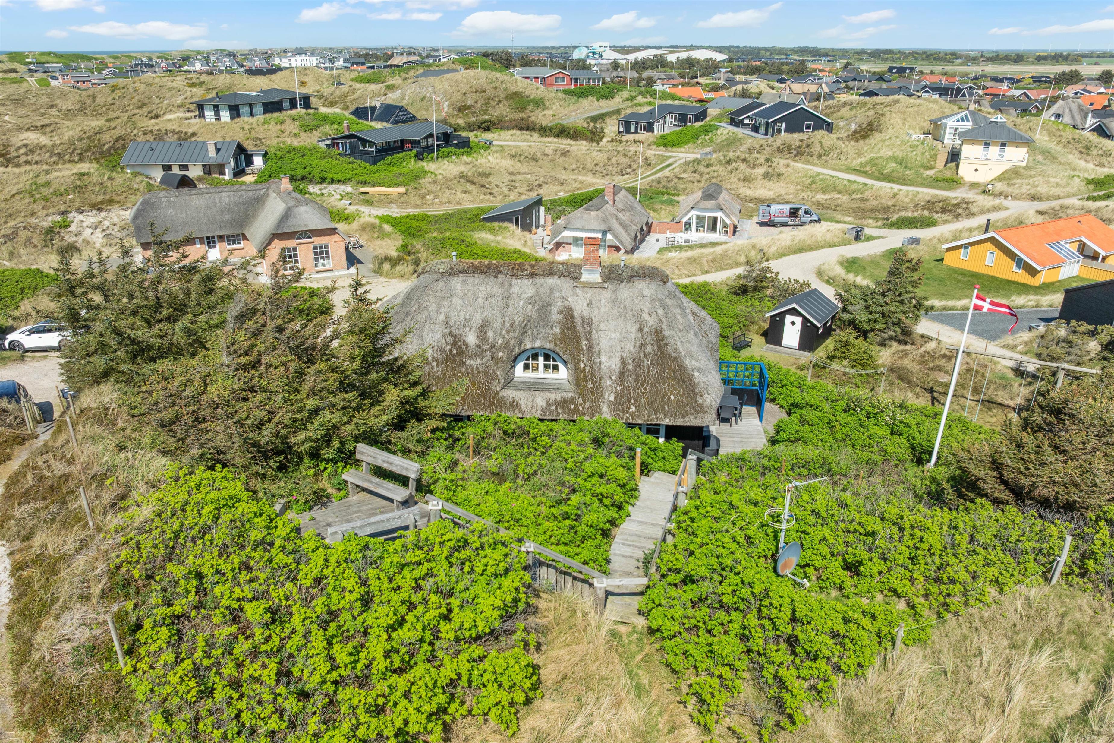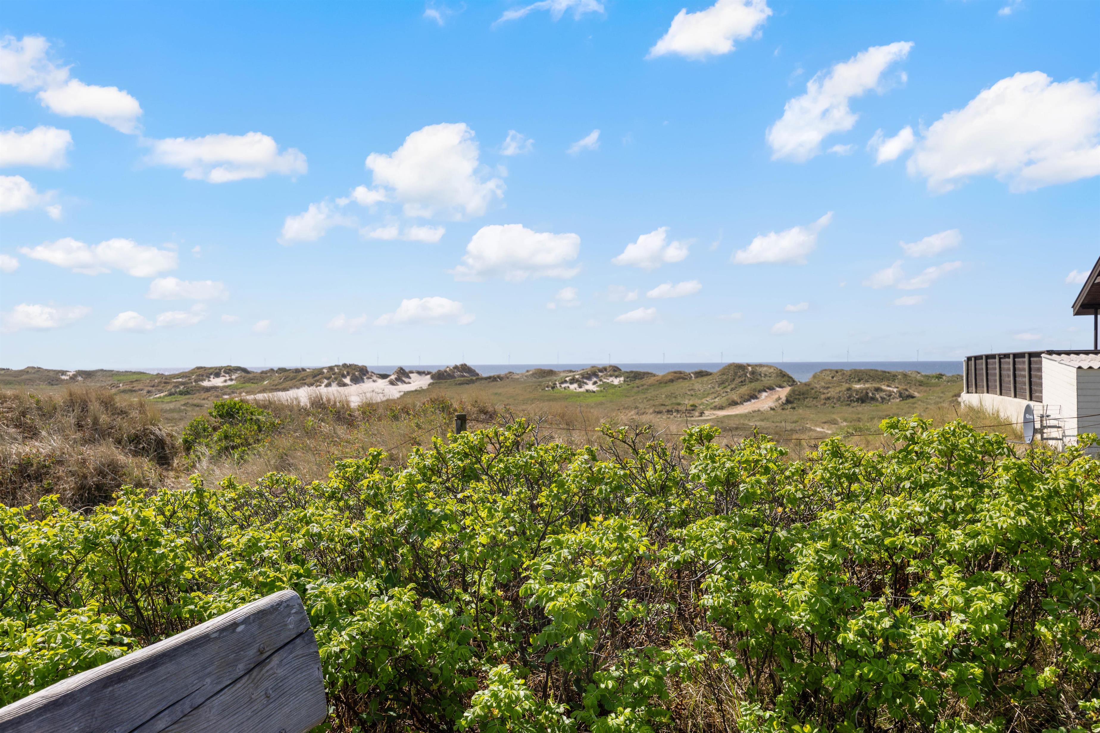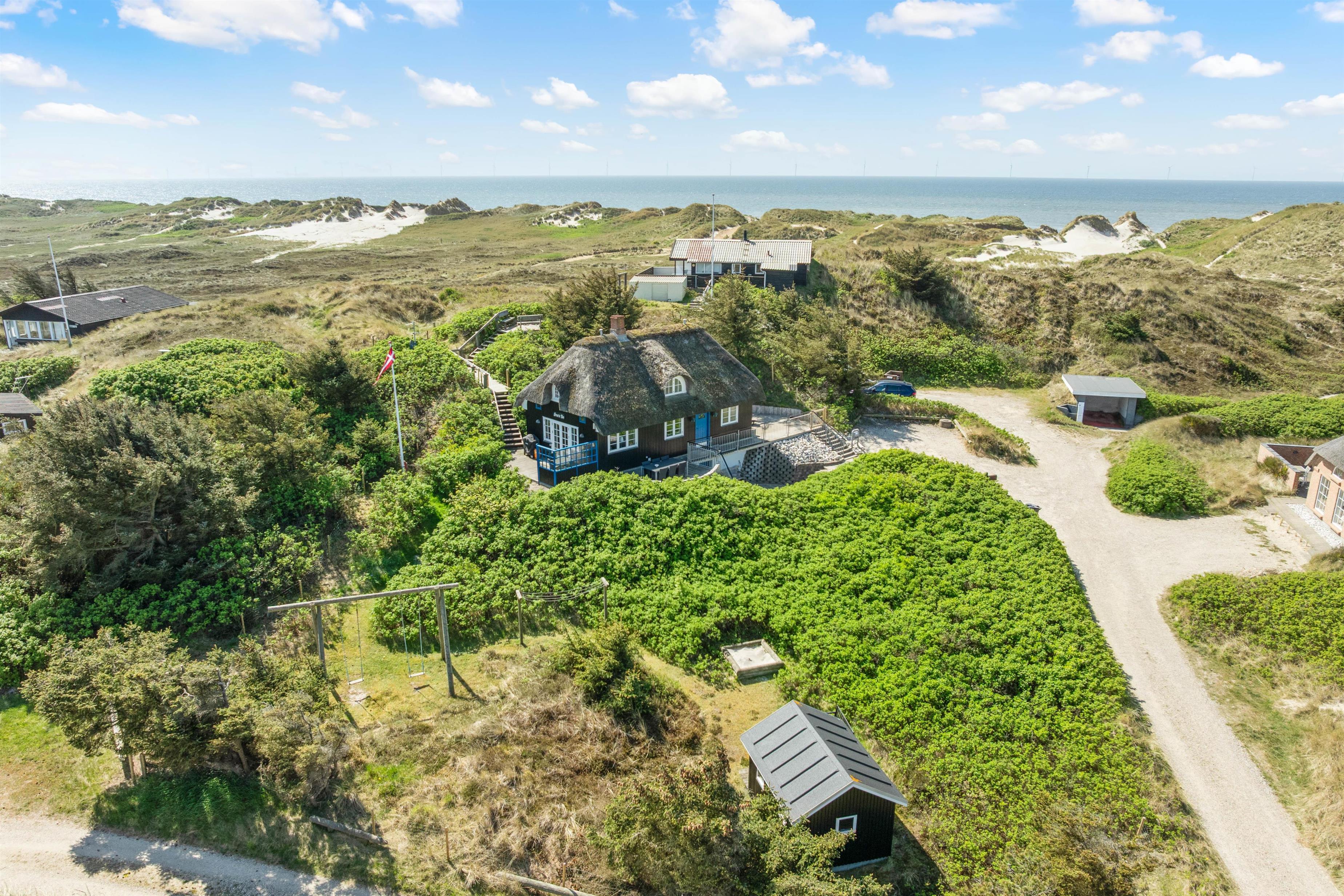 Dette dejlige sommerhus har den mest vidunderlige beliggenhed på en stor kuperet klitgrund. Fra ferieboligens ene højtbeliggende terrasse har I en ubeskrivelig smuk udsigt over havet på den ene side og fjorden og hele sommerhusområdet på den anden side. Heroppe er et helt privat udsigtspunkt. Tag en god flaske vin med op og se solen forsvinde ned i det store hav en smuk sommeraften.