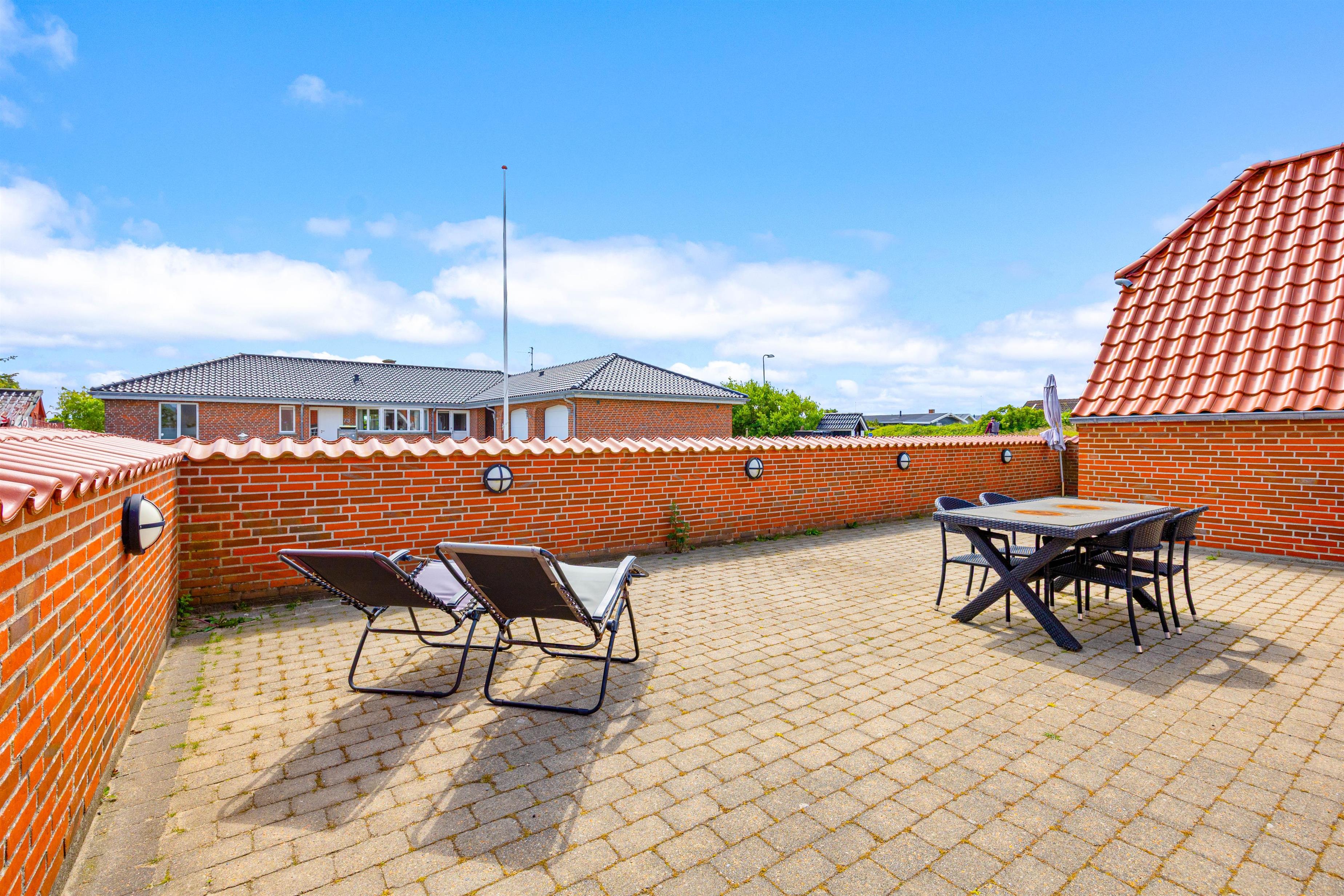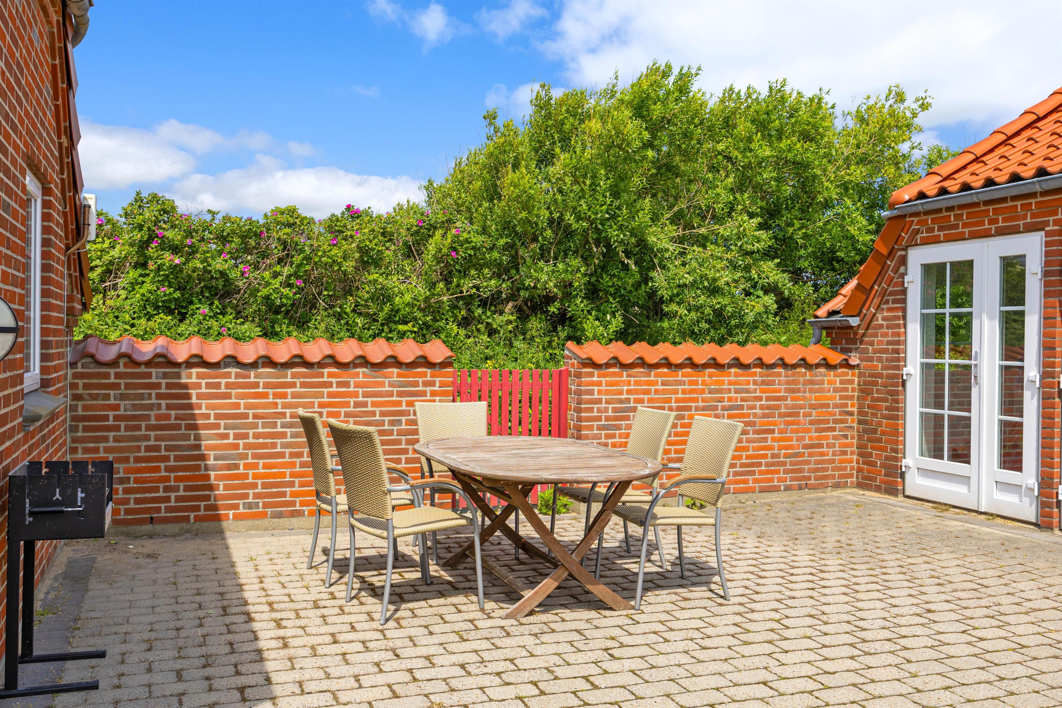 I får et skønt uderum rundt om huset med to store terrasser; både en åben og en lukket med overdækket del. Der er altså rig mulighed for at nyde solen, når den kigger frem, og om på de lune sommeraftener kan I tænde op i grillen og få ekstra meget ud af vejret og dagen. På græsplænen kan børnene og hunden få fri leg.