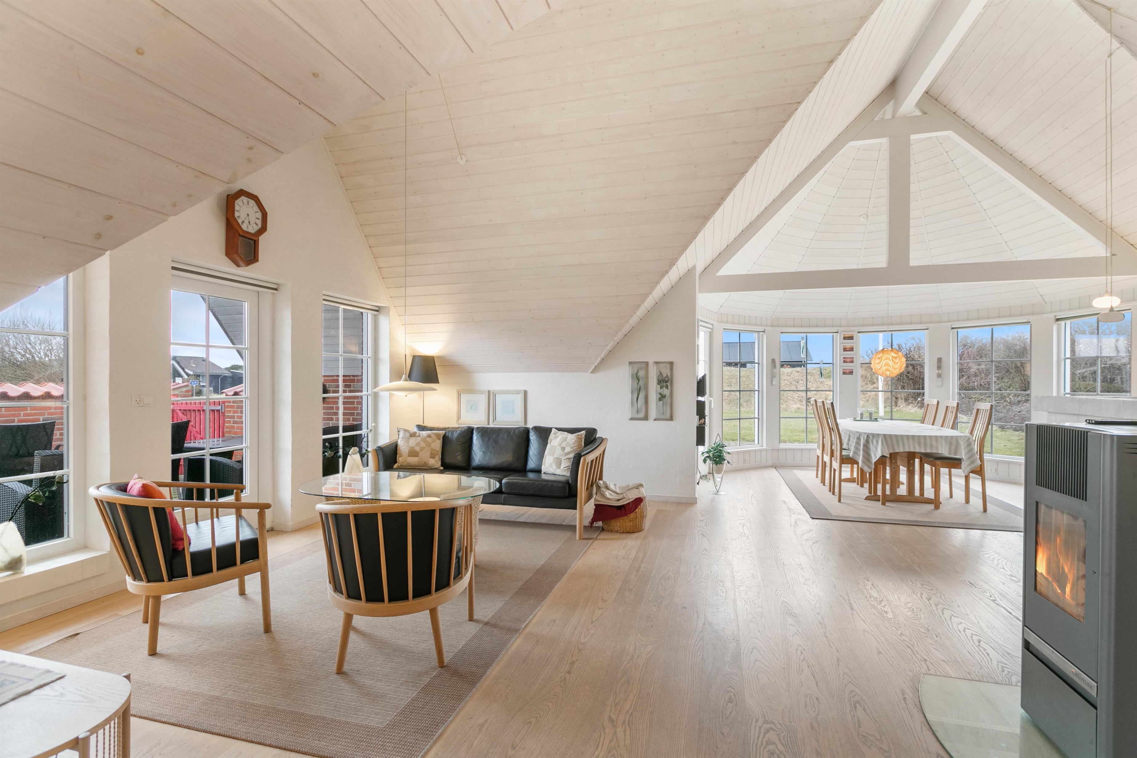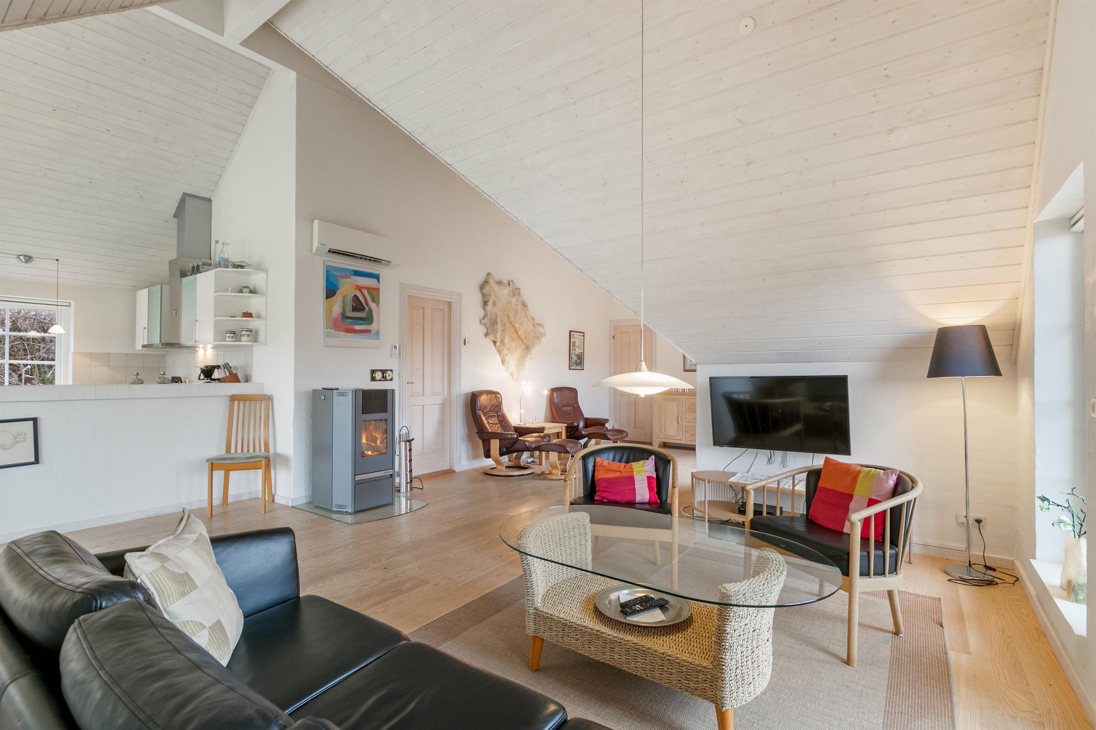 Sovepladserne er fordelt på tre gode soverum, hvor der også er tænkt på skabspladsen, så I kan opbevare jeres tøj og sager. Det åbne køkkenalrum og stue hvor loftet går hele vejen til kip, sætter rammerne for hyggelige feriestunder i godt selskab, og pilleovnen bliver et hit på de kolde feriedage. Og med en en luft-til-luft varmepumpe er I med garanti sikret et godt indeklima hele året rundt. Ligeledes er der adgang til gratis internet, så I altid kan være opkoblet, hvis I ønsker det.
