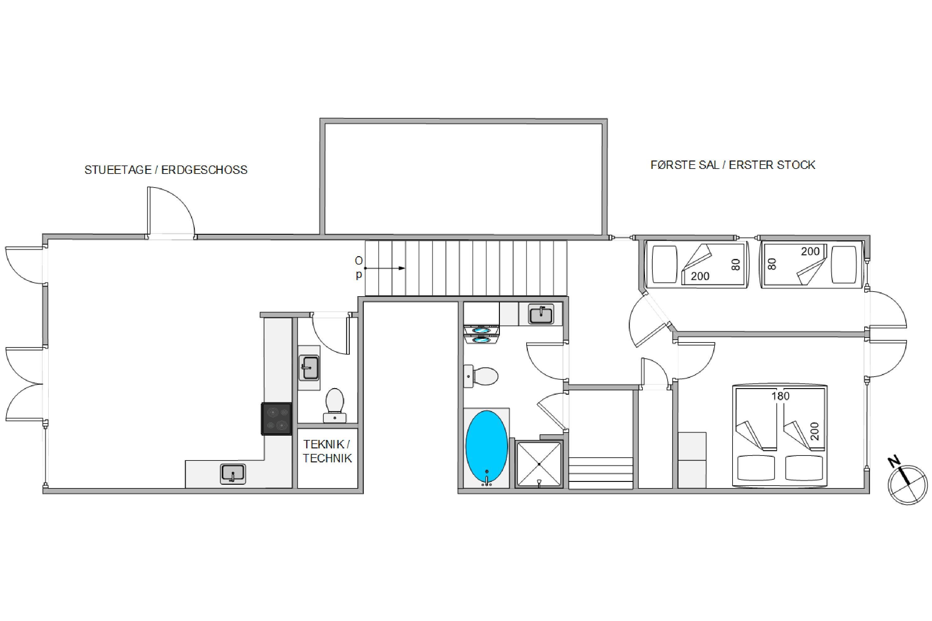 I stuen kan I rigtig slappe af og nyde en god sang på radioen i TV’et. Stuen ligger lige ved køkkenet, så der er rig mulighed for en masse nærvær, når måltiderne skal tilberedes. Opvaskemaskinen klarer opvasken for jer, så I i stedet kan nye de dejlige feriestunder. Både opholdsstuen, badeværelset ovenpå samt gæstetoilettet er udstyret med gulvvarme, som kører via en energibesparende luft-vand-varmepumpe. Især de kolde måneder behøver I derfor ikke bekymre jer om kolde fødder.