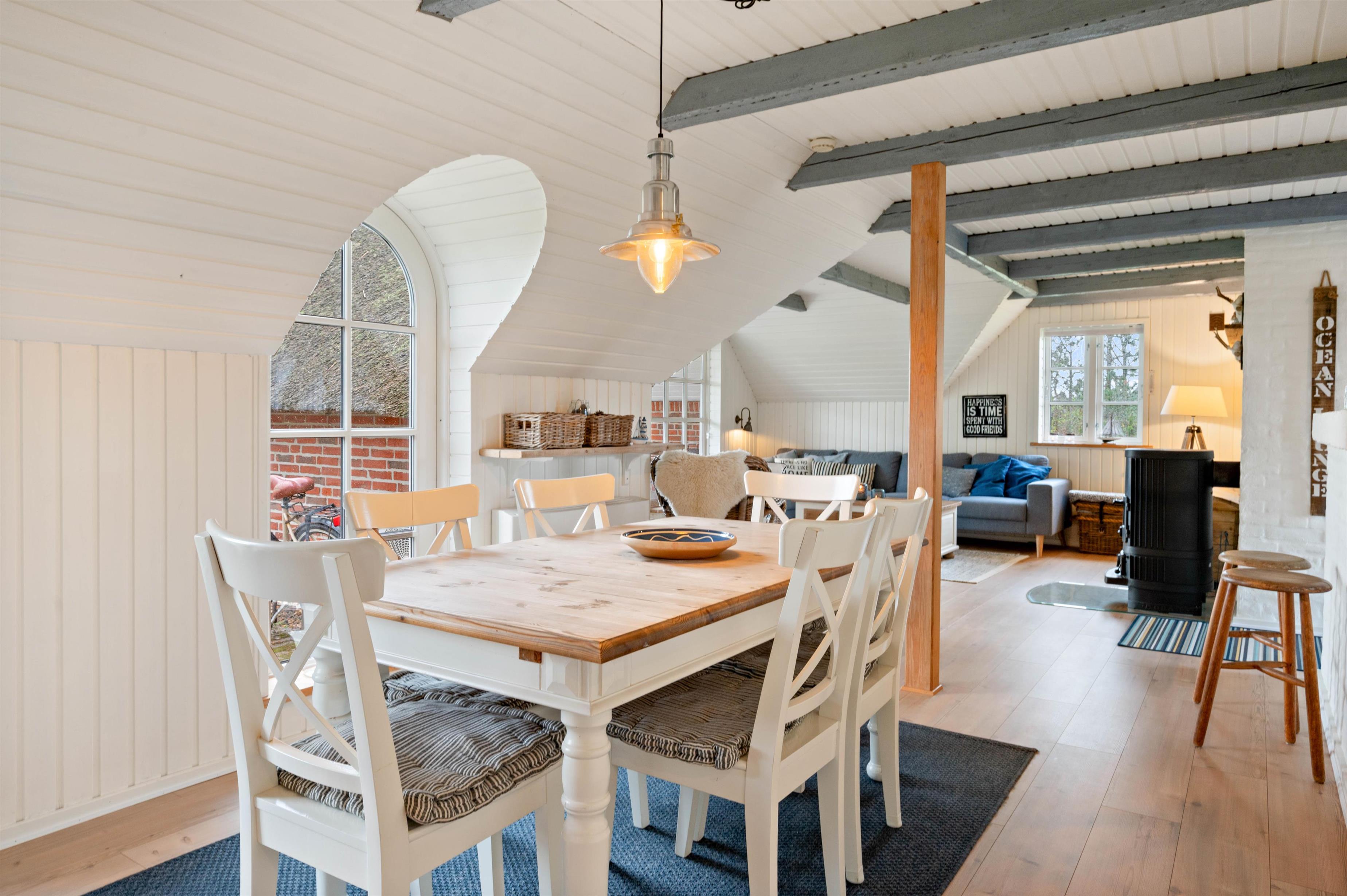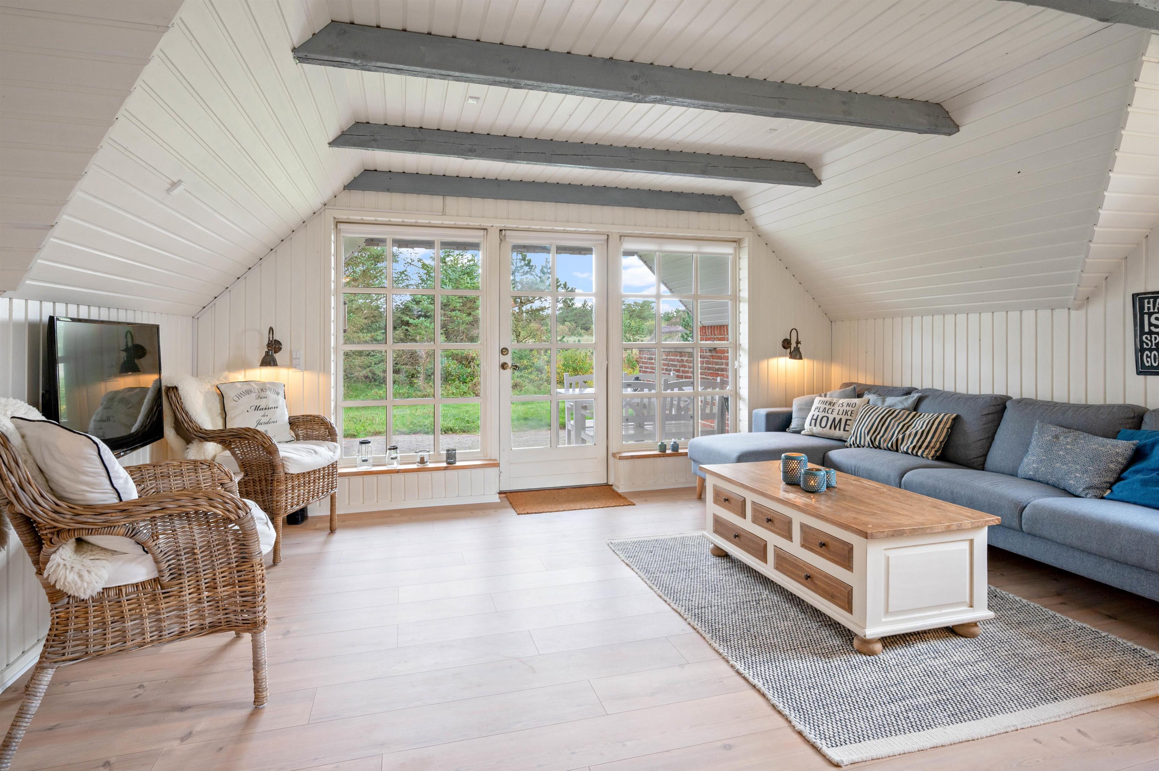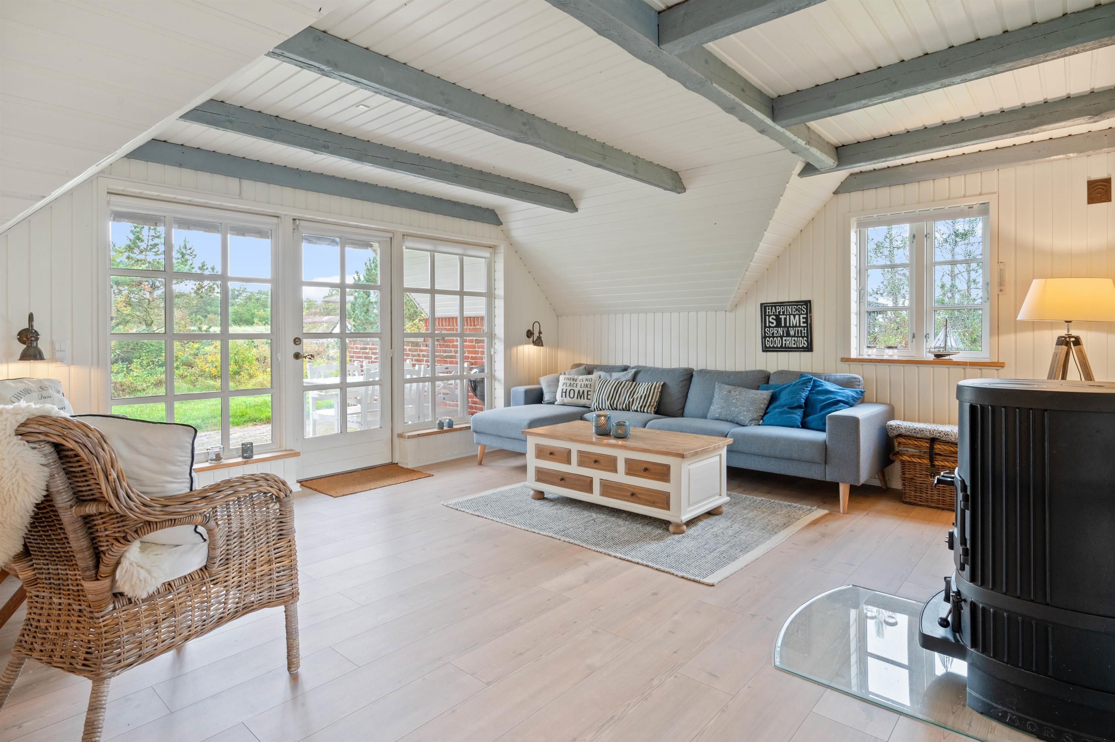 Den hyggelige opholdstue vil uden tvivl blive jeres naturlige samlingspunkt under jeres ferieophold, og fra pladsen i sofaen har I direkte kig til det flotte og veludstyrede køkken. Men det er nok i højere grad det store vinduesparti, der vil fange jeres opmærksomhed. Herigennem kan I nemlig lade blikket vandre ud på den smukke naurgrund, der omgiver huset. Stuen er desuden indrettet med gode møbler, og på fladskærmen kan I streame en film på Netflix over det lynhurtige fiberinternet eller via Chromecast.