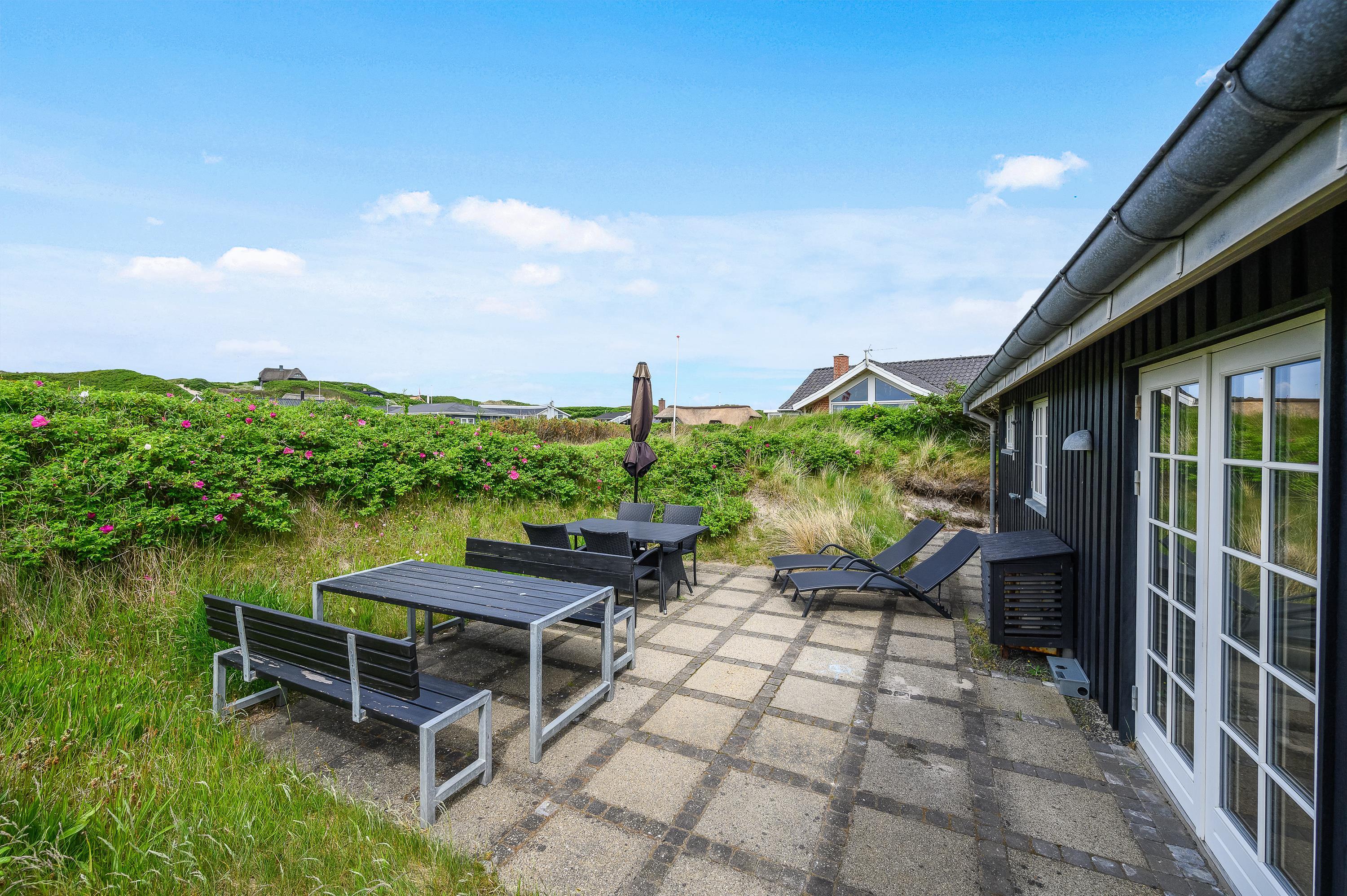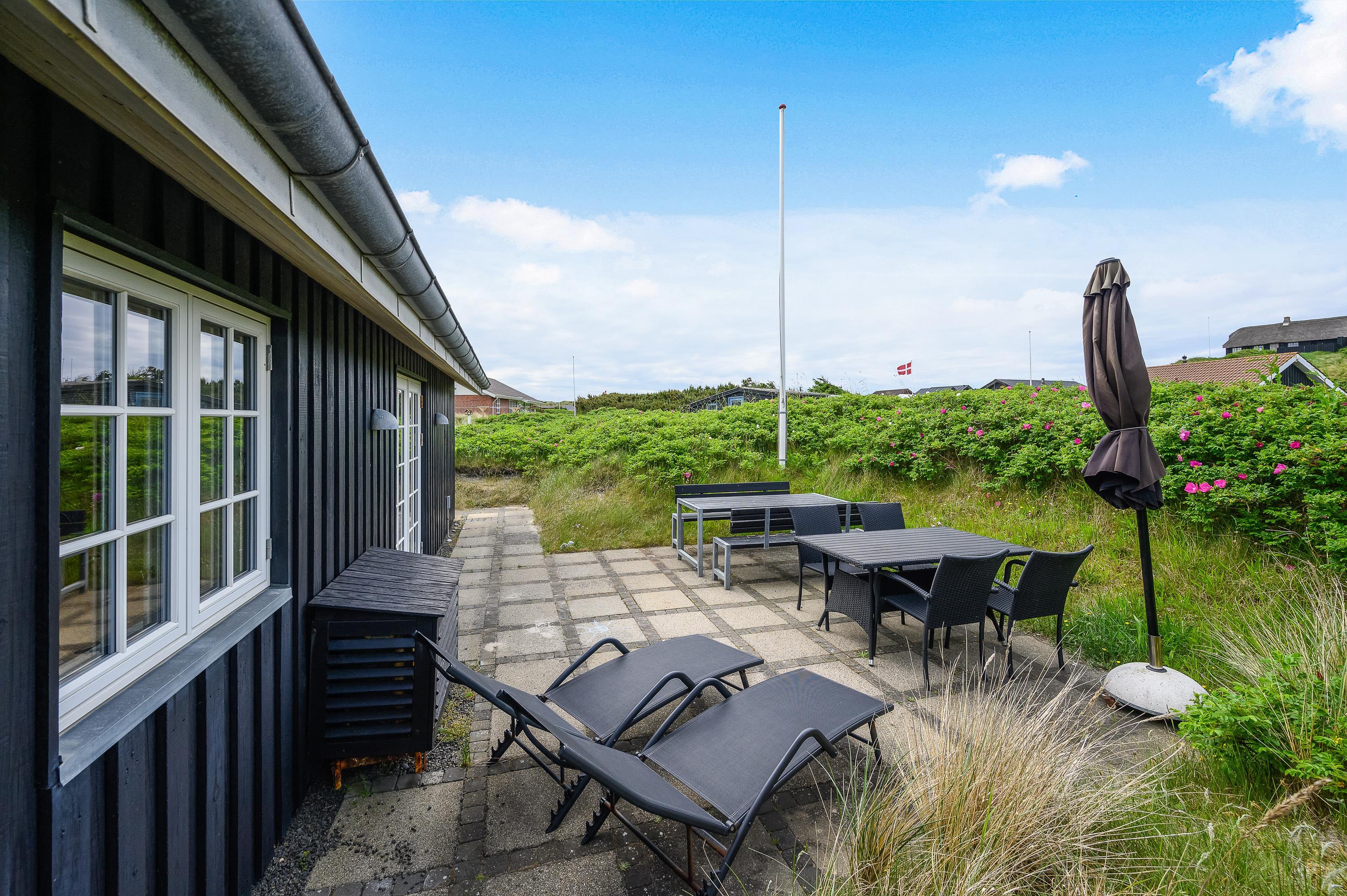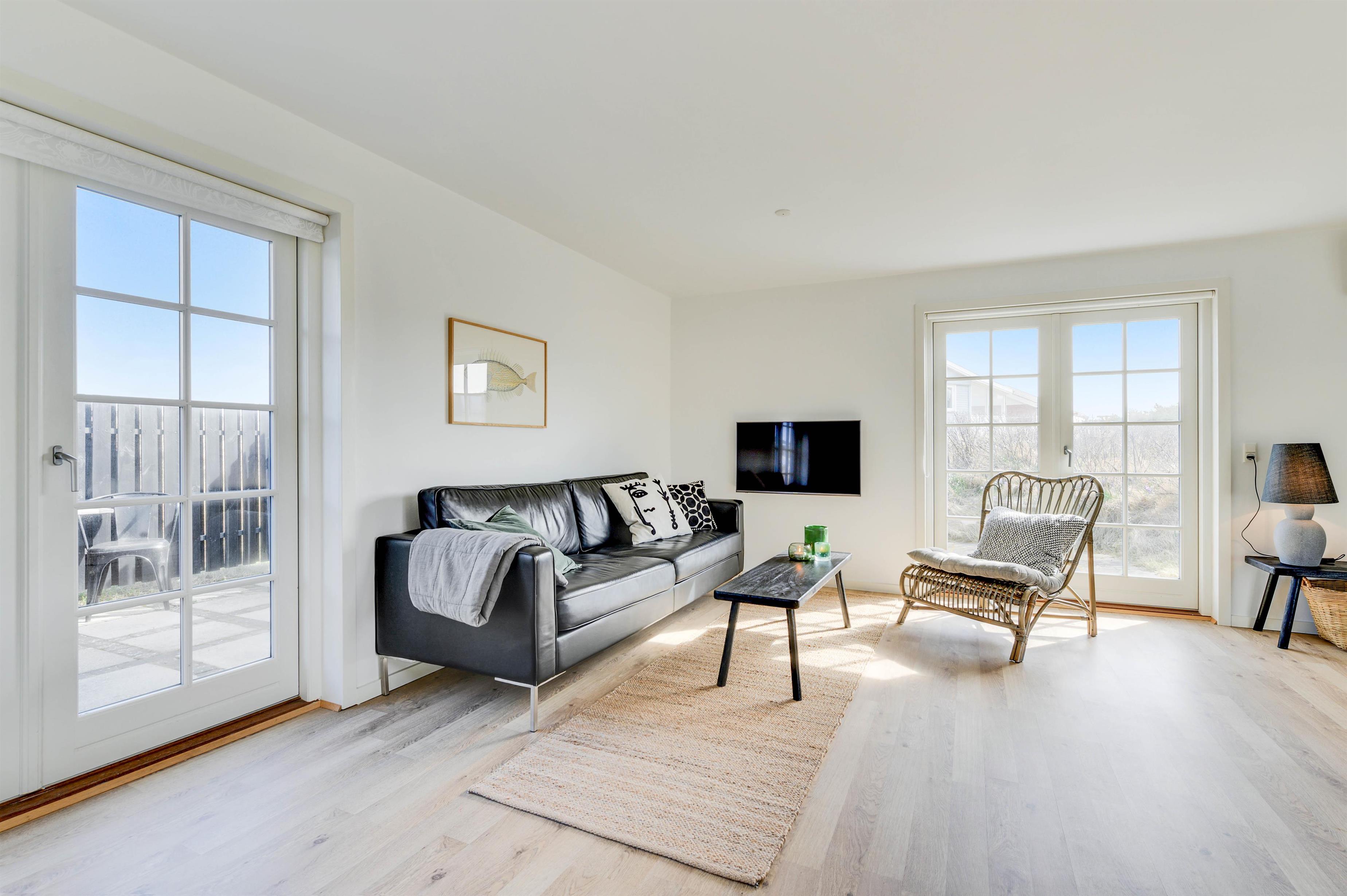 På varme sommerdage fungerer feriehusets to terrasser som en forlængelse af stuen. Herude er du hele tiden i kontakt med livet indenfor gennem terrassedørene. Det sortmalede træhus og de lyse belægningssten falder godt i med den omkringliggende natur og skaber en dejlig rolig atmosfære på terrassen. Her finder I naturligvis havemøbler, liggestole og grill, så I kan nyde udelivet og den friske, salte luft.