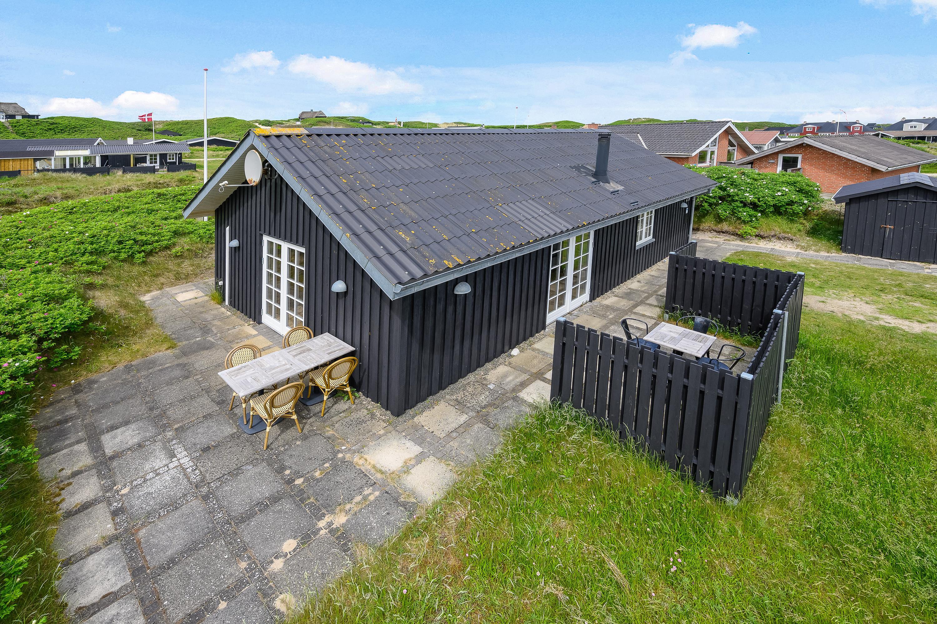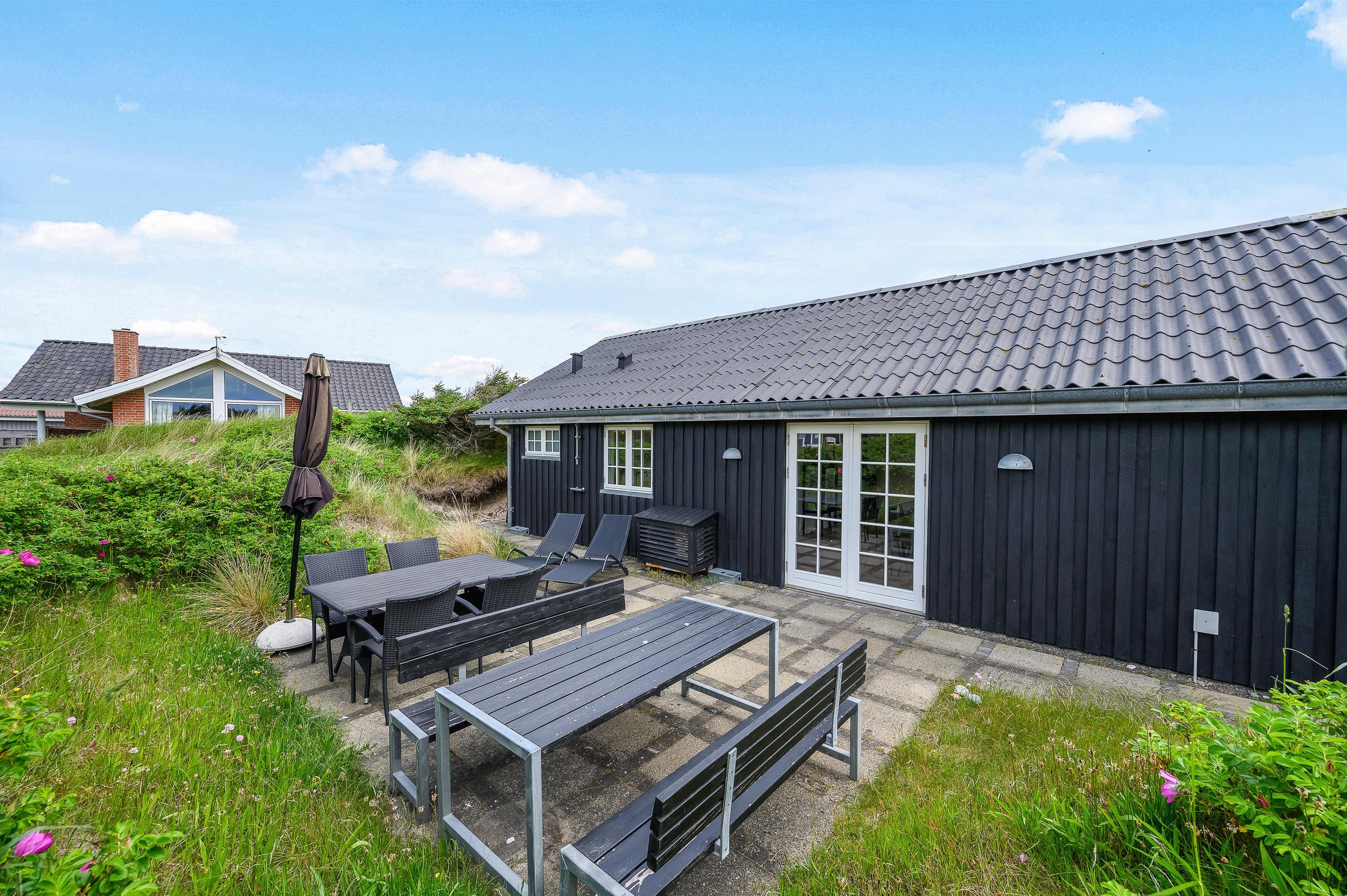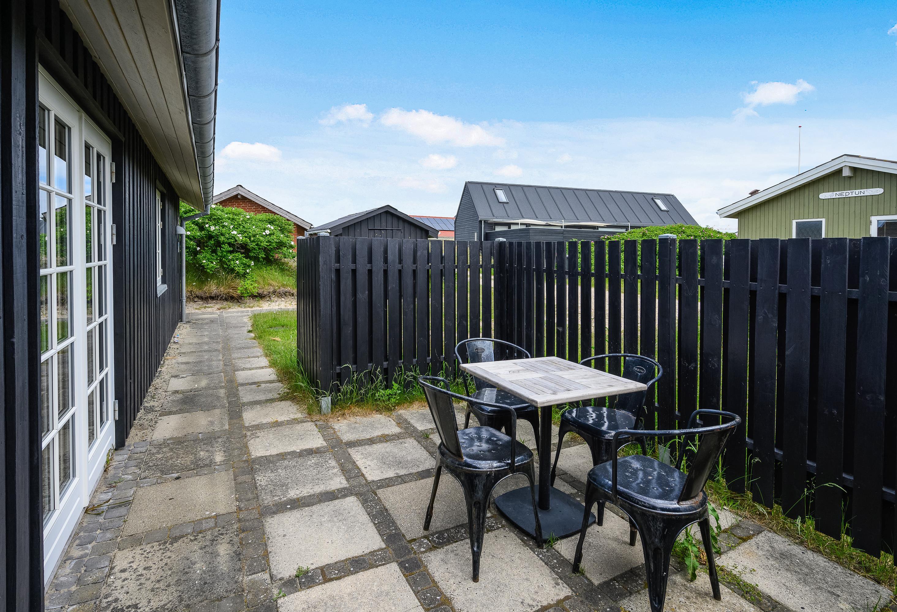 På varme sommerdage fungerer feriehusets to terrasser som en forlængelse af stuen. Herude er du hele tiden i kontakt med livet indenfor gennem terrassedørene. Det sortmalede træhus og de lyse belægningssten falder godt i med den omkringliggende natur og skaber en dejlig rolig atmosfære på terrassen. Her finder I naturligvis havemøbler, liggestole og grill, så I kan nyde udelivet og den friske, salte luft.