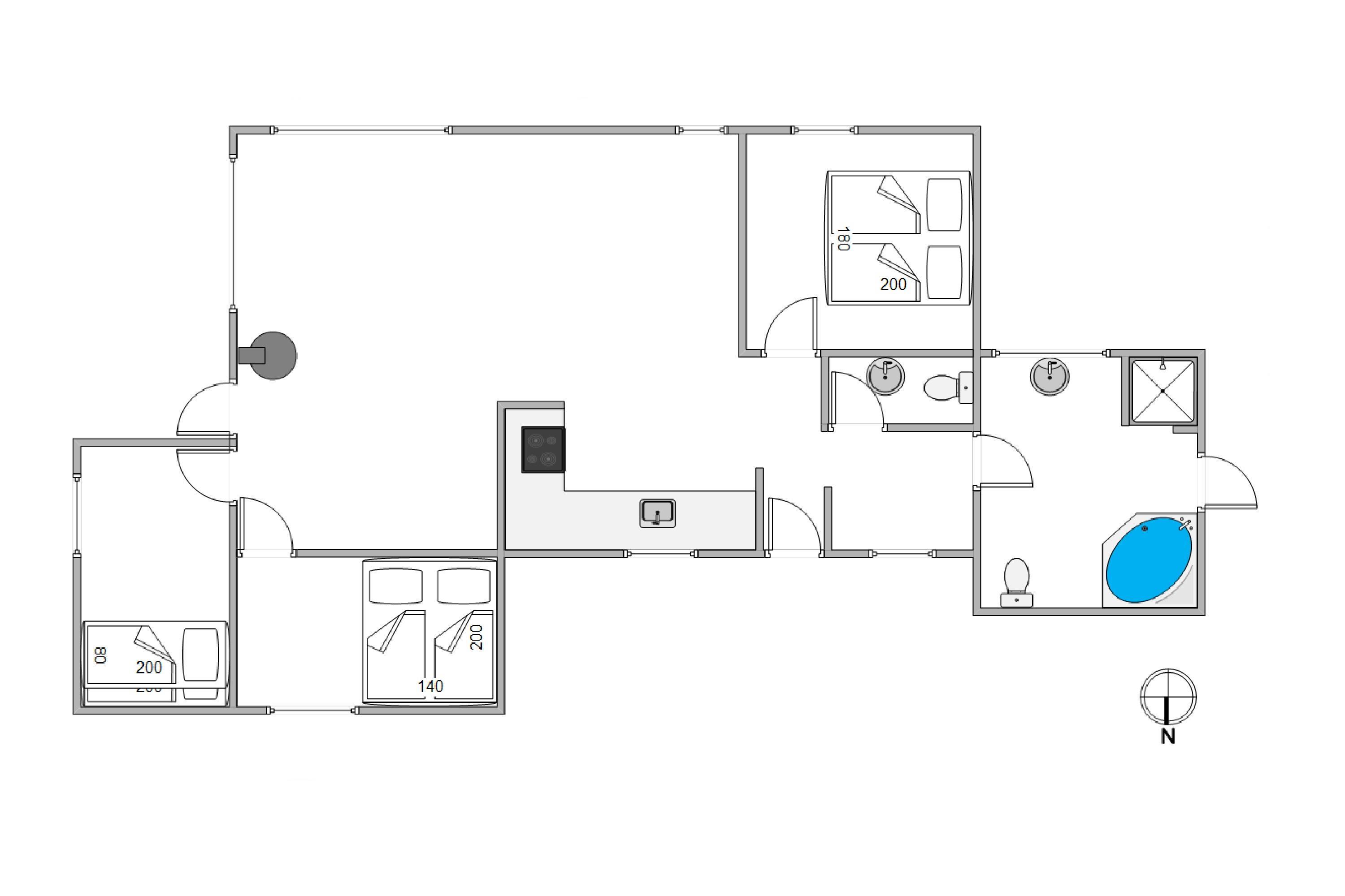 Sommerhuset har 1 badeværelse med gulvvarme og 1 gæstetoilet – så er der ingen risiko for kø til toilettet. På badeværelset er der en stor bruseniche samt feriehusets store højdepunkt; spaen. Læn jer tilbage i det varme vand og lad boblerne forkæle jer med ekstra meget afslapning.
