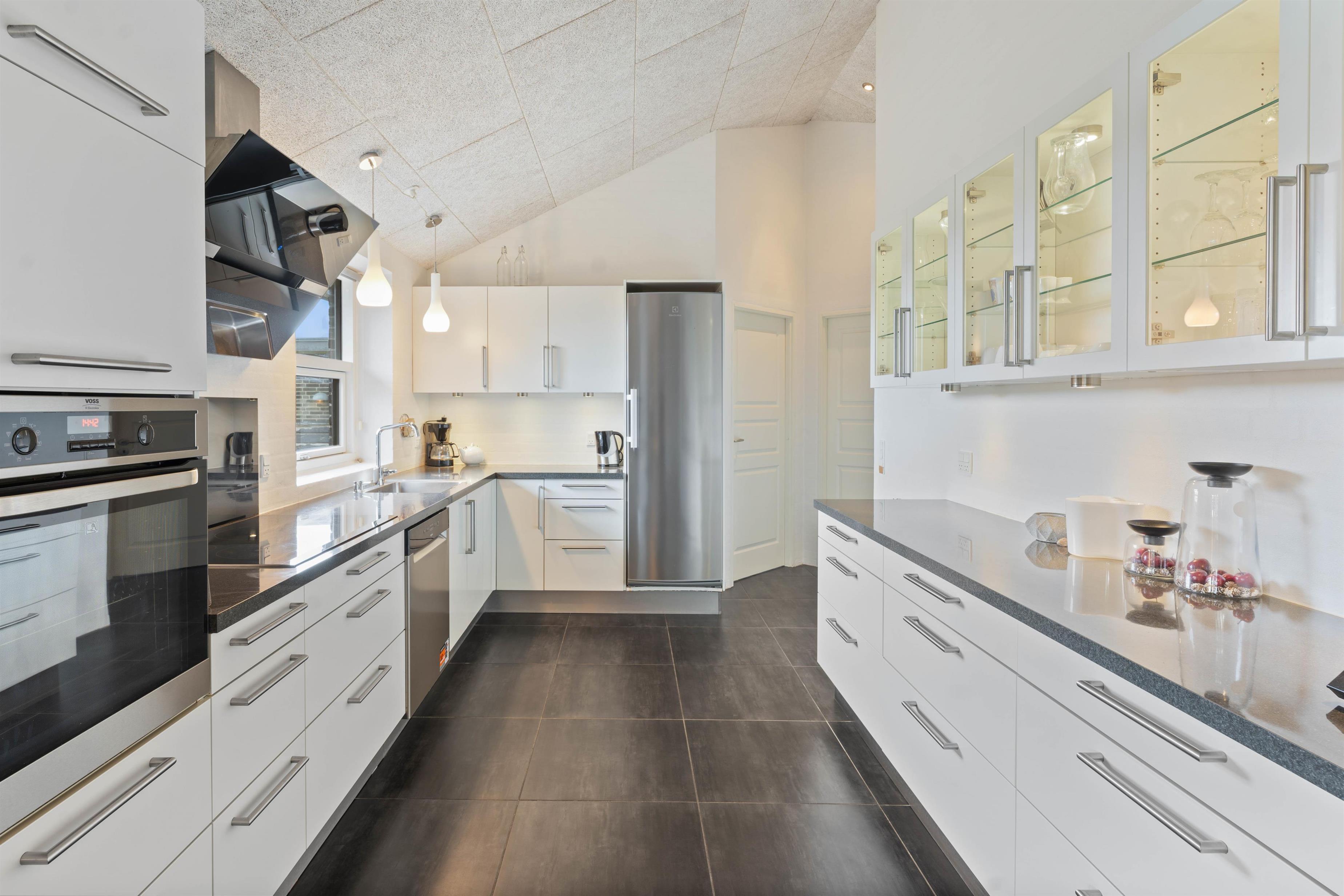 Indretningen i det 154 m2 store sommerhus er stilrent og rummeligt. Her er der højt til loftet og masser af plads til alle. De mange store vinduespartier i huset lukker lyset og de flotte omgivelser indenfor – selv på regnvejrsdage. Det store køkken, som ligger i åben forbindelse med stuen, er husets samlingspunkt. Her har du alt, hvad du forventer af et moderne køkken. Her begynder dagen med morgenkaffe og avislæsning og her kan I samles i løbet af dagen og snakke, mens maden tilberedes. I forlængelse af køkkenet er spisestuen med plads til 8 personer. De praktiske klinker i køkken og stue er desuden med gulvvarme.