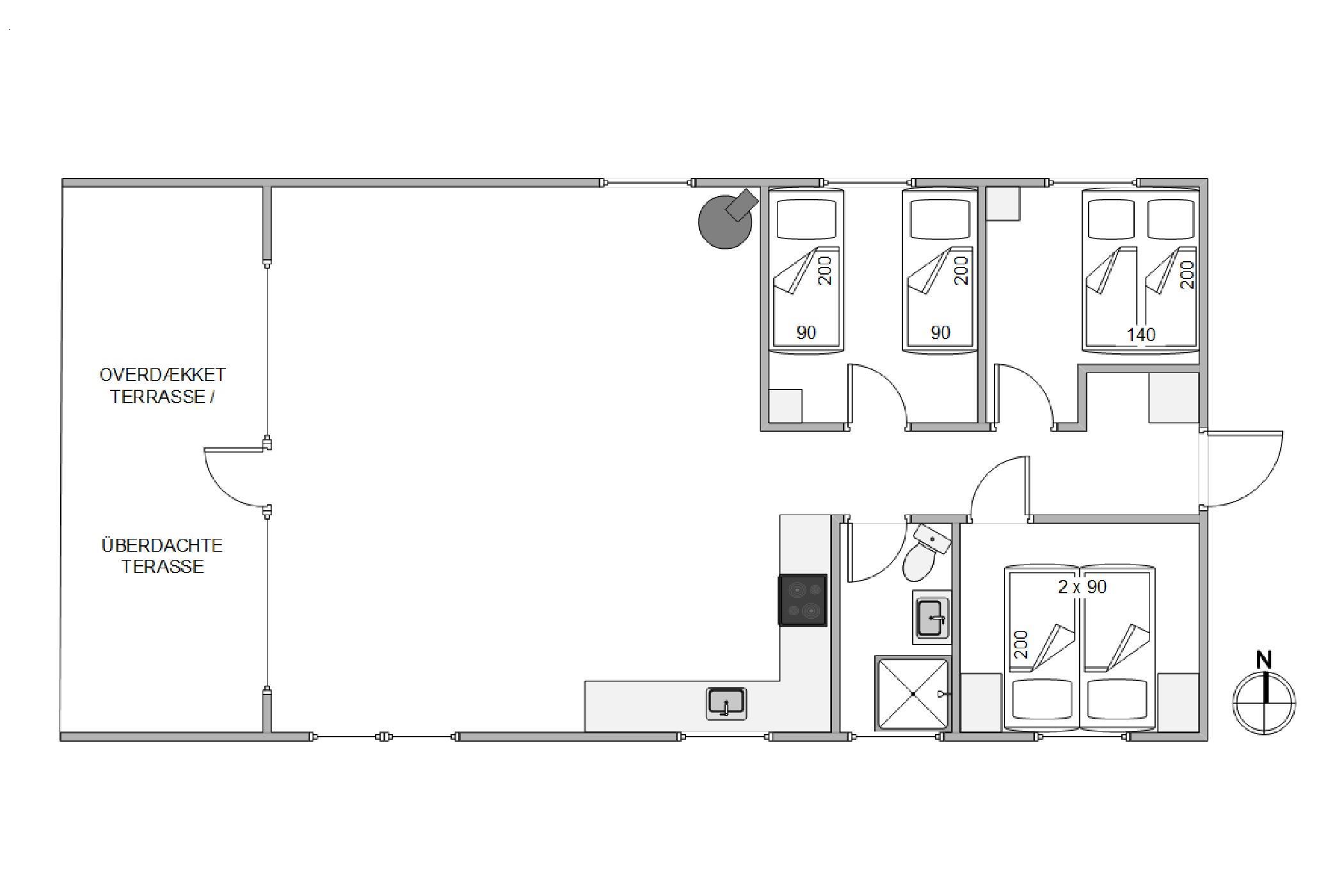 Fra sommerhusets alrum kan I træde ud på den store terrasse. I den vestlige ende af sommerhuset er terrassen afskærmet og overdækket, så her kan I nyde nogle gode stunder i skyggen. I kan også følge terrassen til sommerhusets østlige ende, hvor terrassen er åben. Her kan I nyde dagens første kop kaffe, mens solen står op.