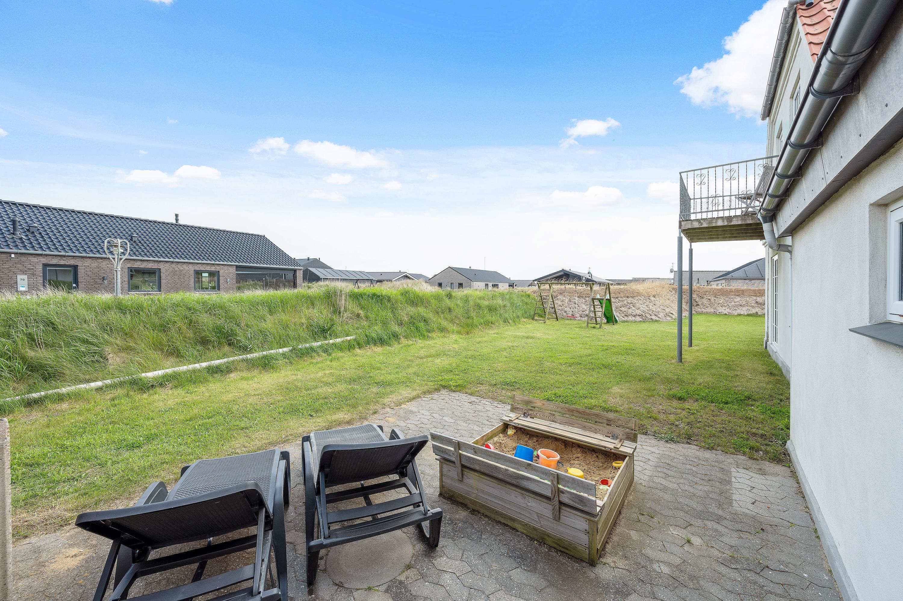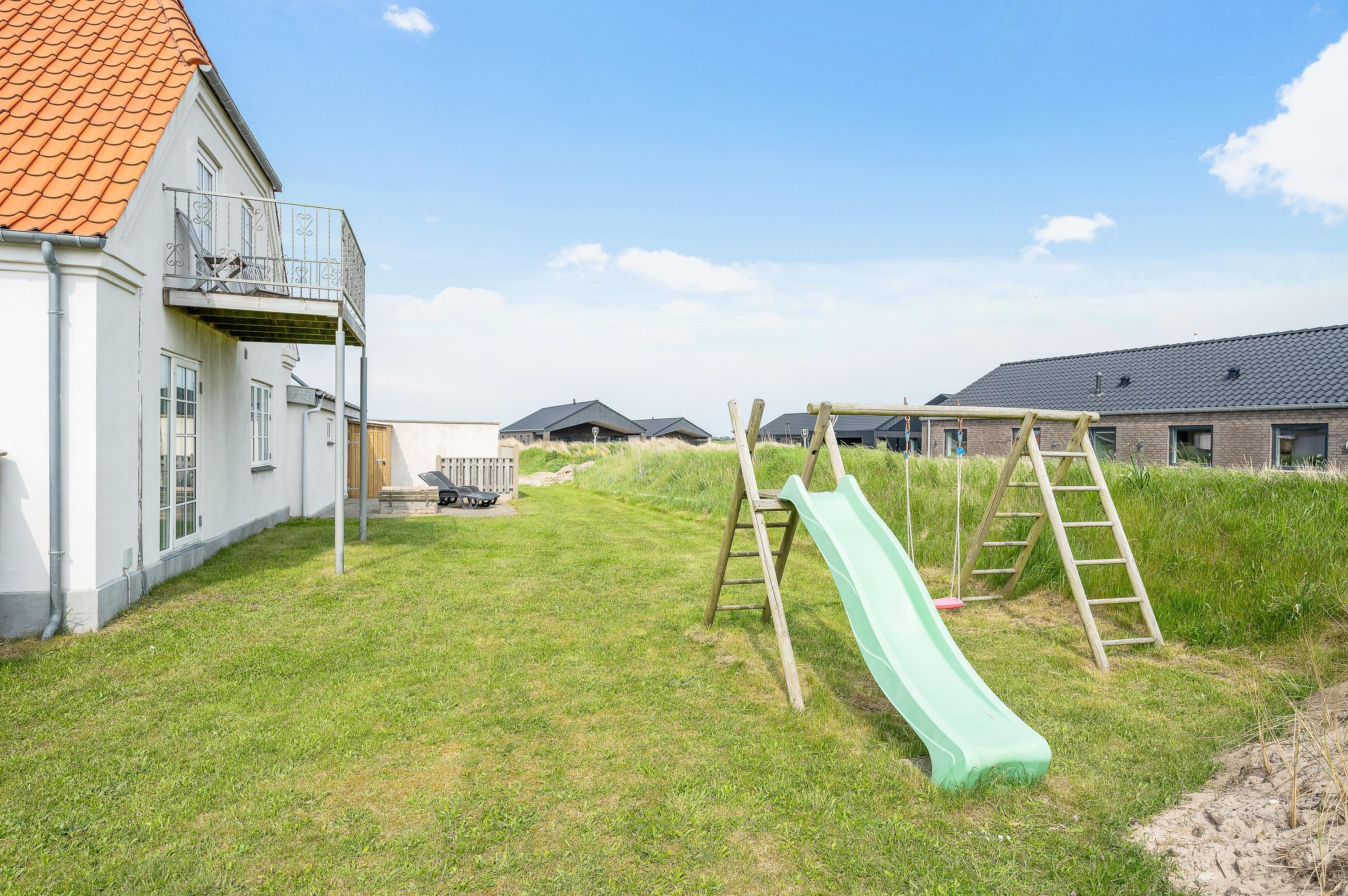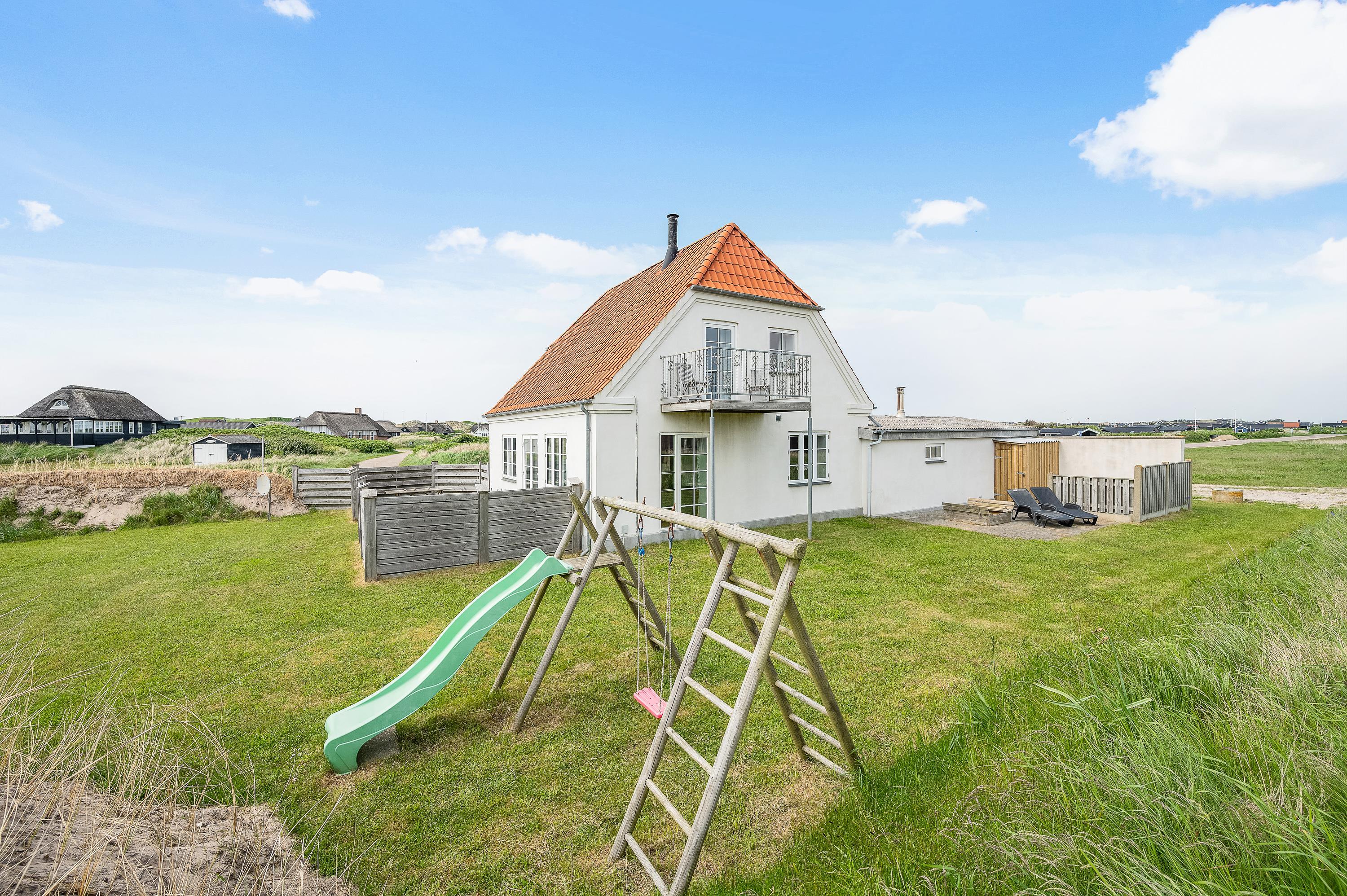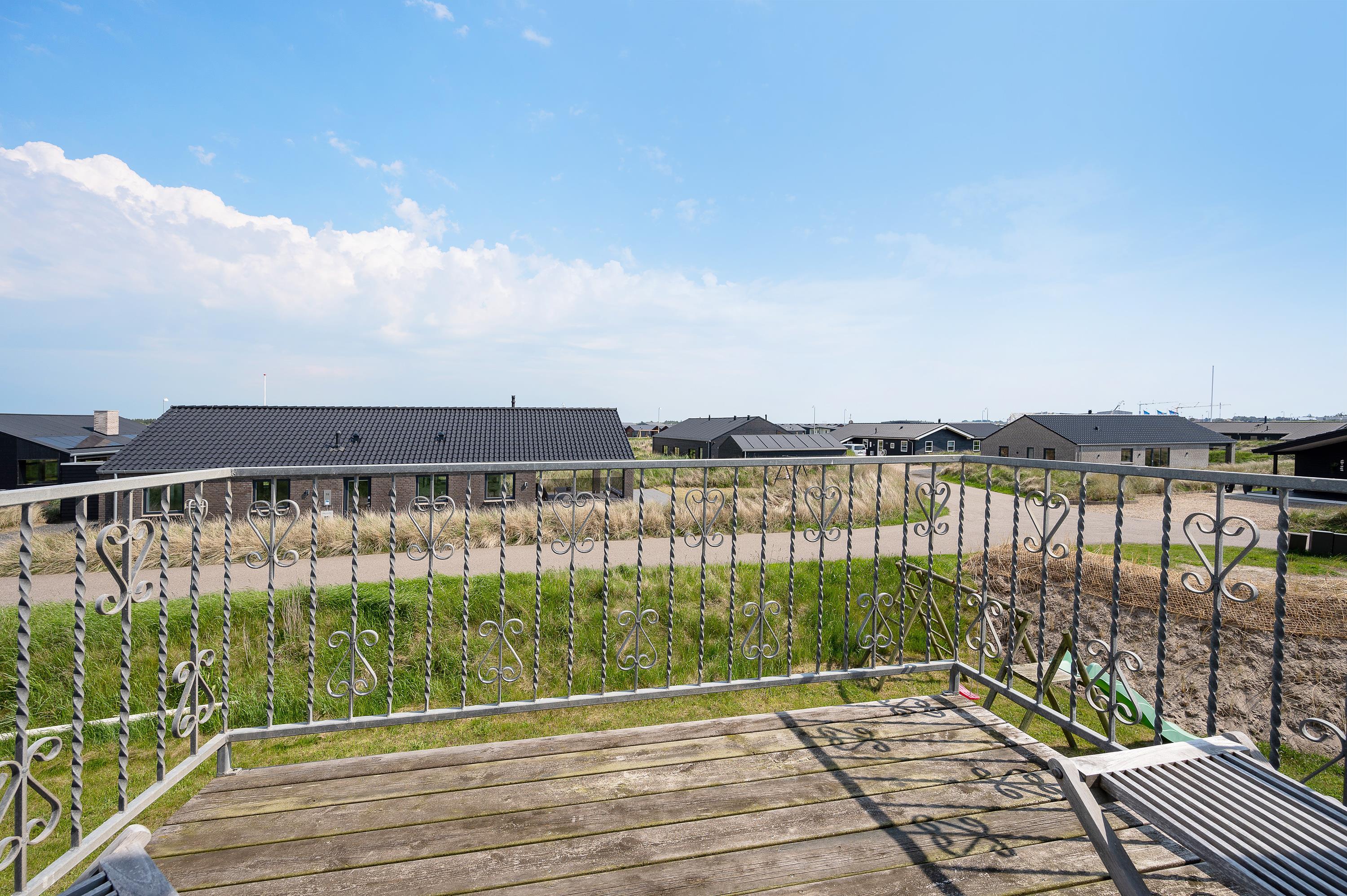 Der er også en altan, som I kan træde ud på fra ét af soveværelserne på sommerhusets førstesal. Her kan I nyde en stille stund alene med en god bog, mens I har udsigt til børnene, der leger på gyngen og rutsjebanen. Fra altanen har I også udsigt til golfbanen i Søndervig,