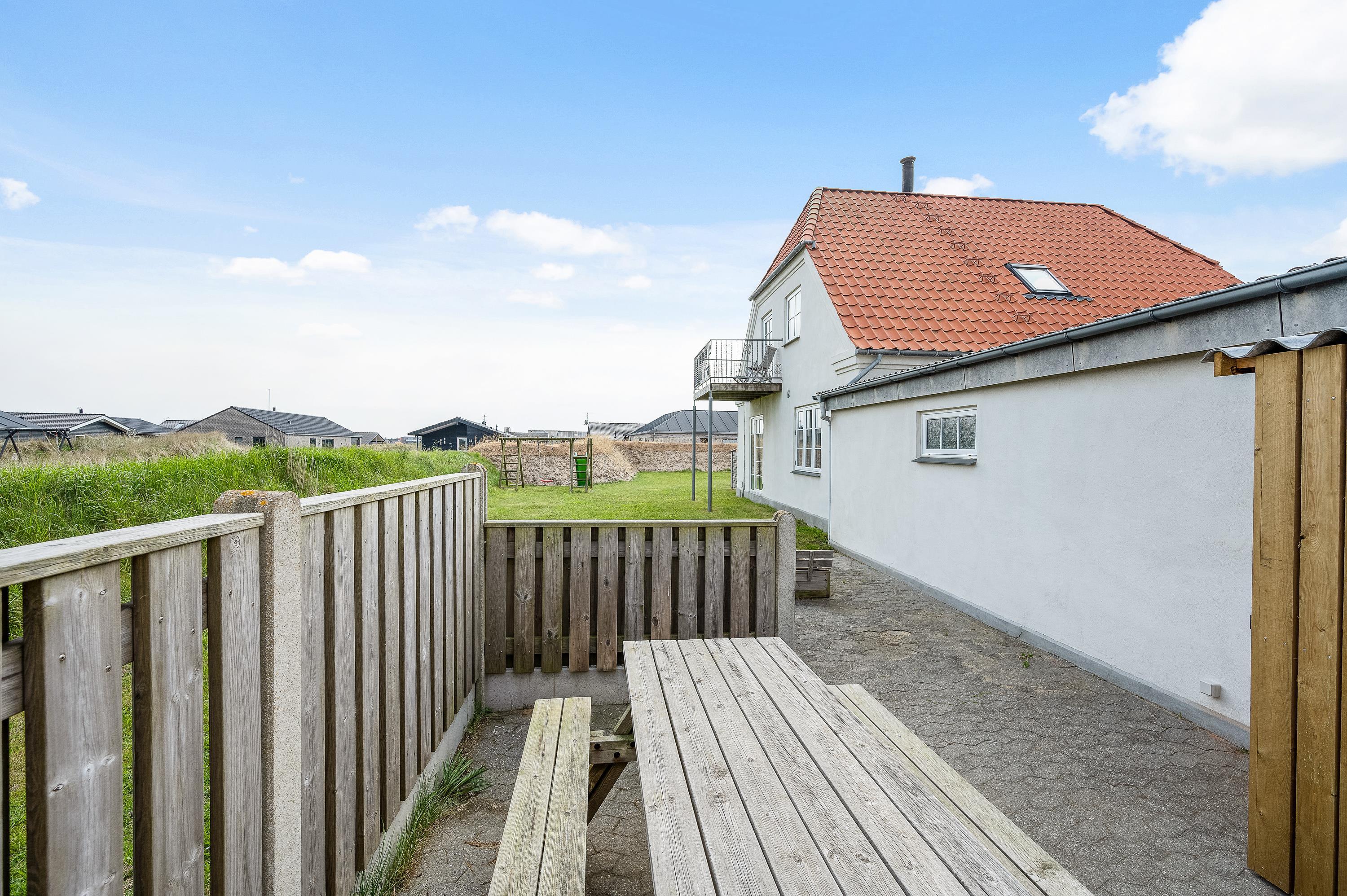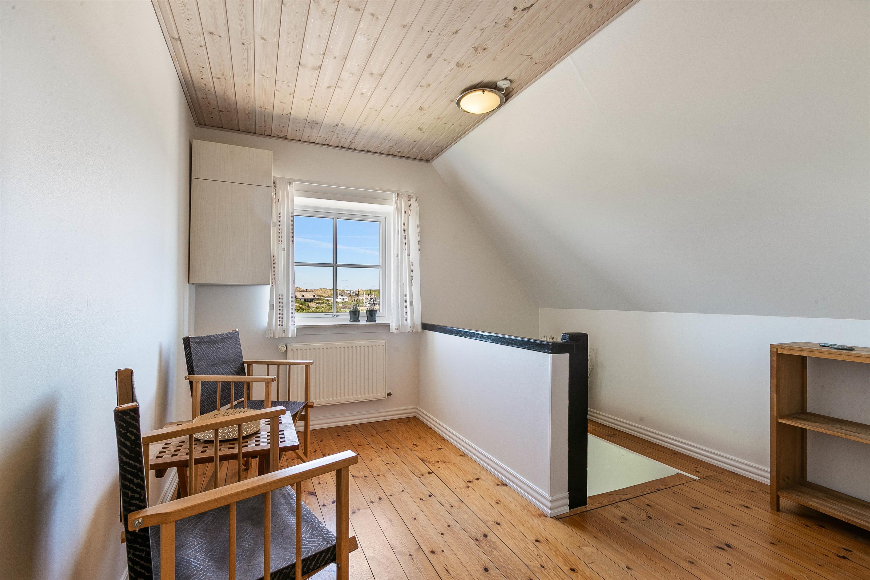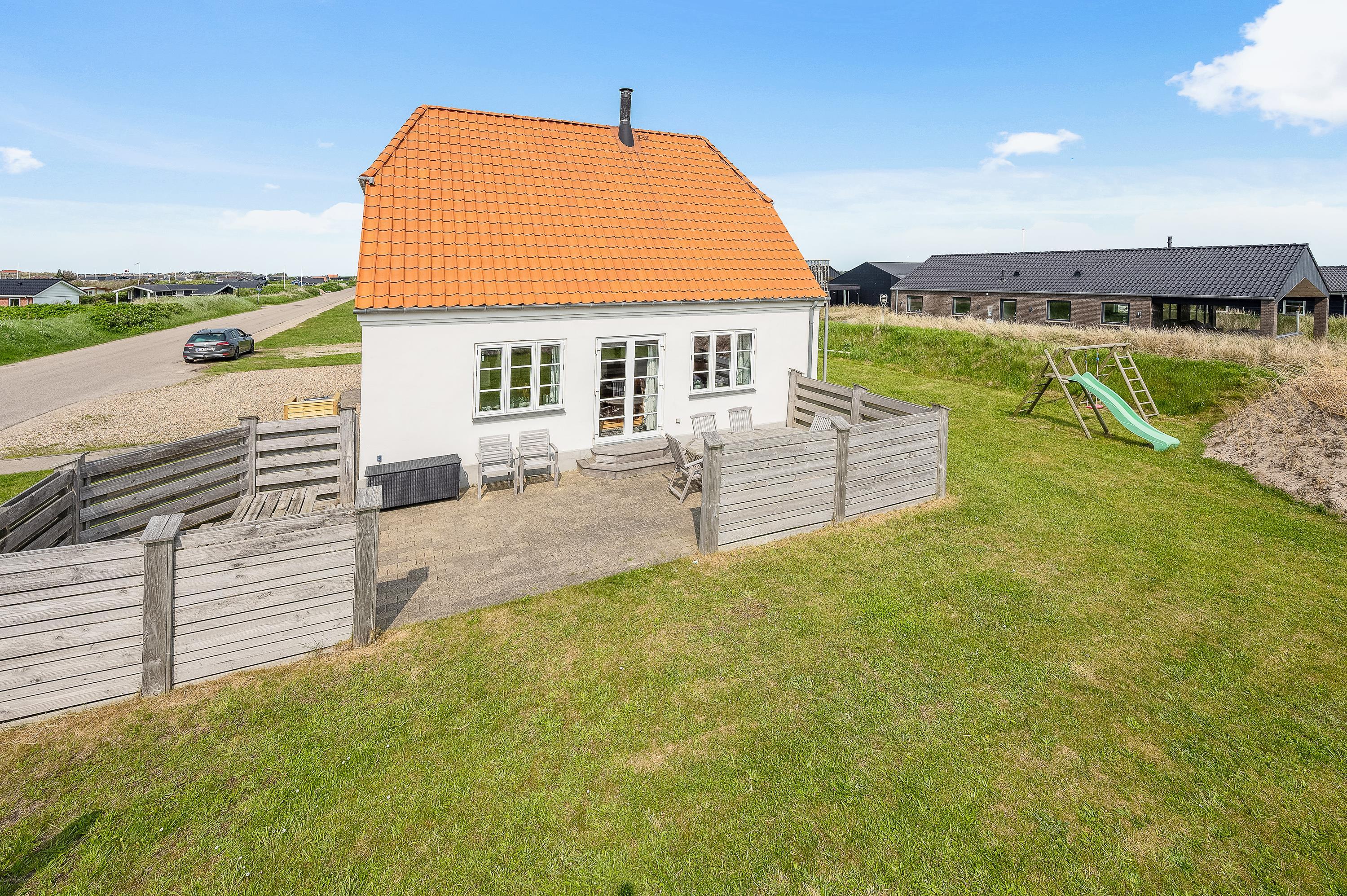 Der er også en altan, som I kan træde ud på fra ét af soveværelserne på sommerhusets førstesal. Her kan I nyde en stille stund alene med en god bog, mens I har udsigt til børnene, der leger på gyngen og rutsjebanen. Fra altanen har I også udsigt til golfbanen i Søndervig,