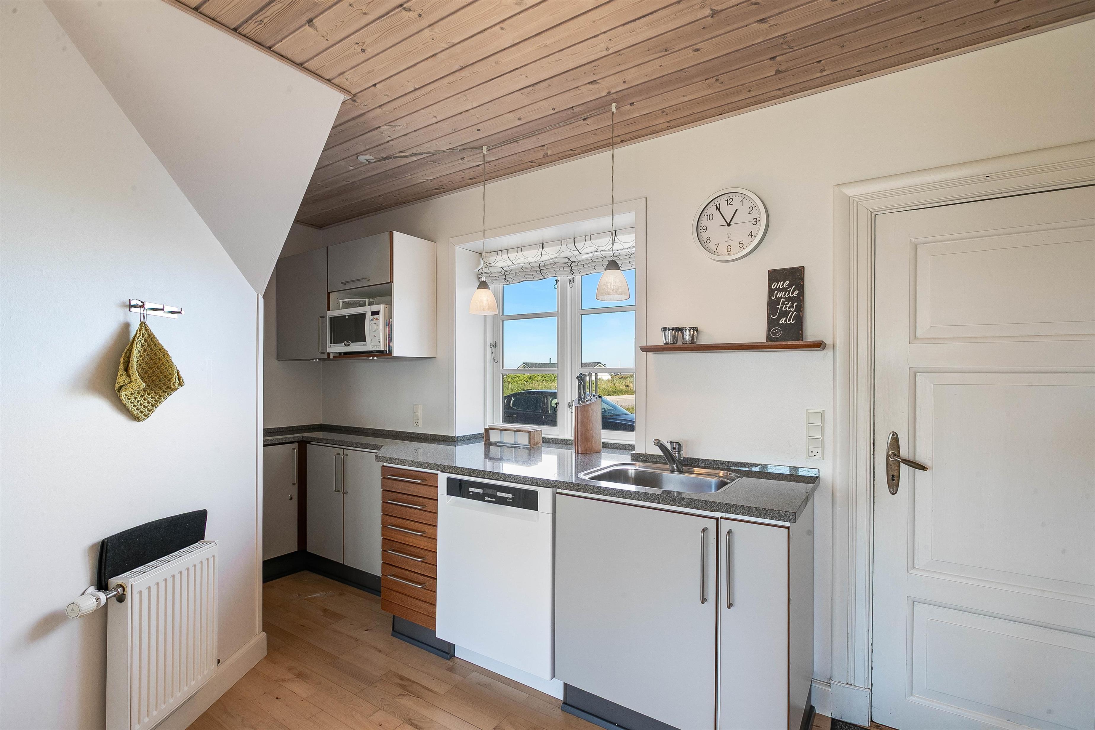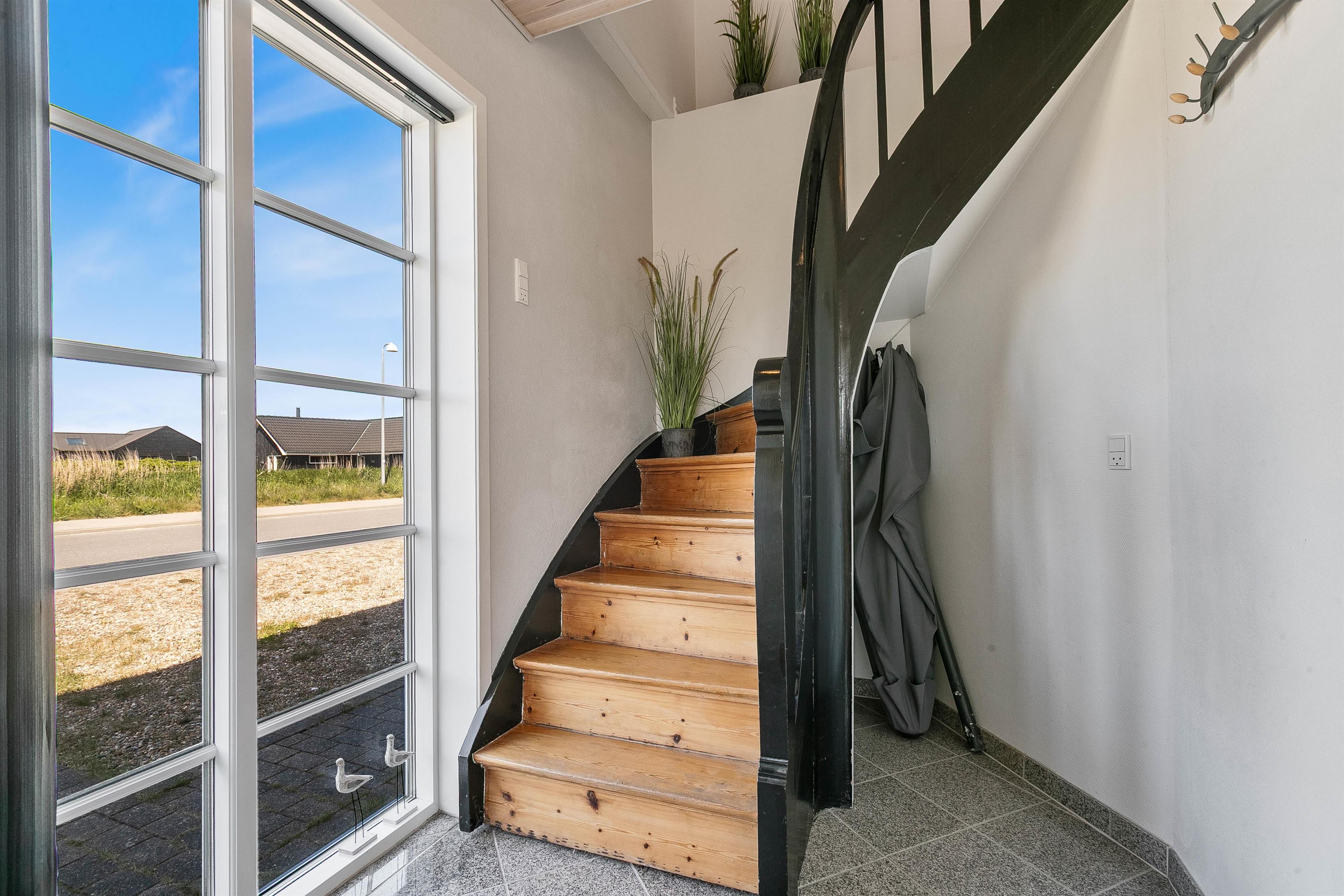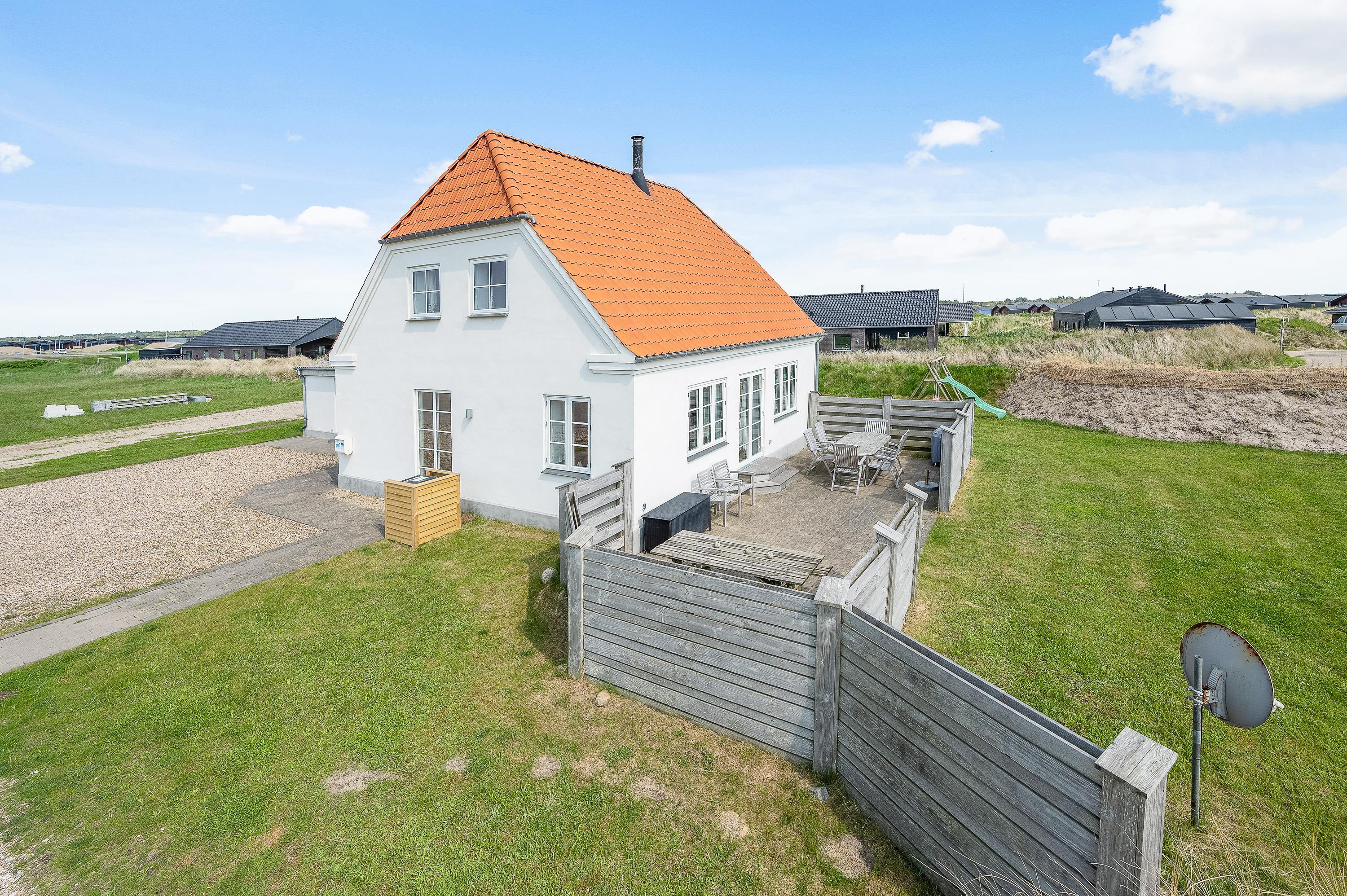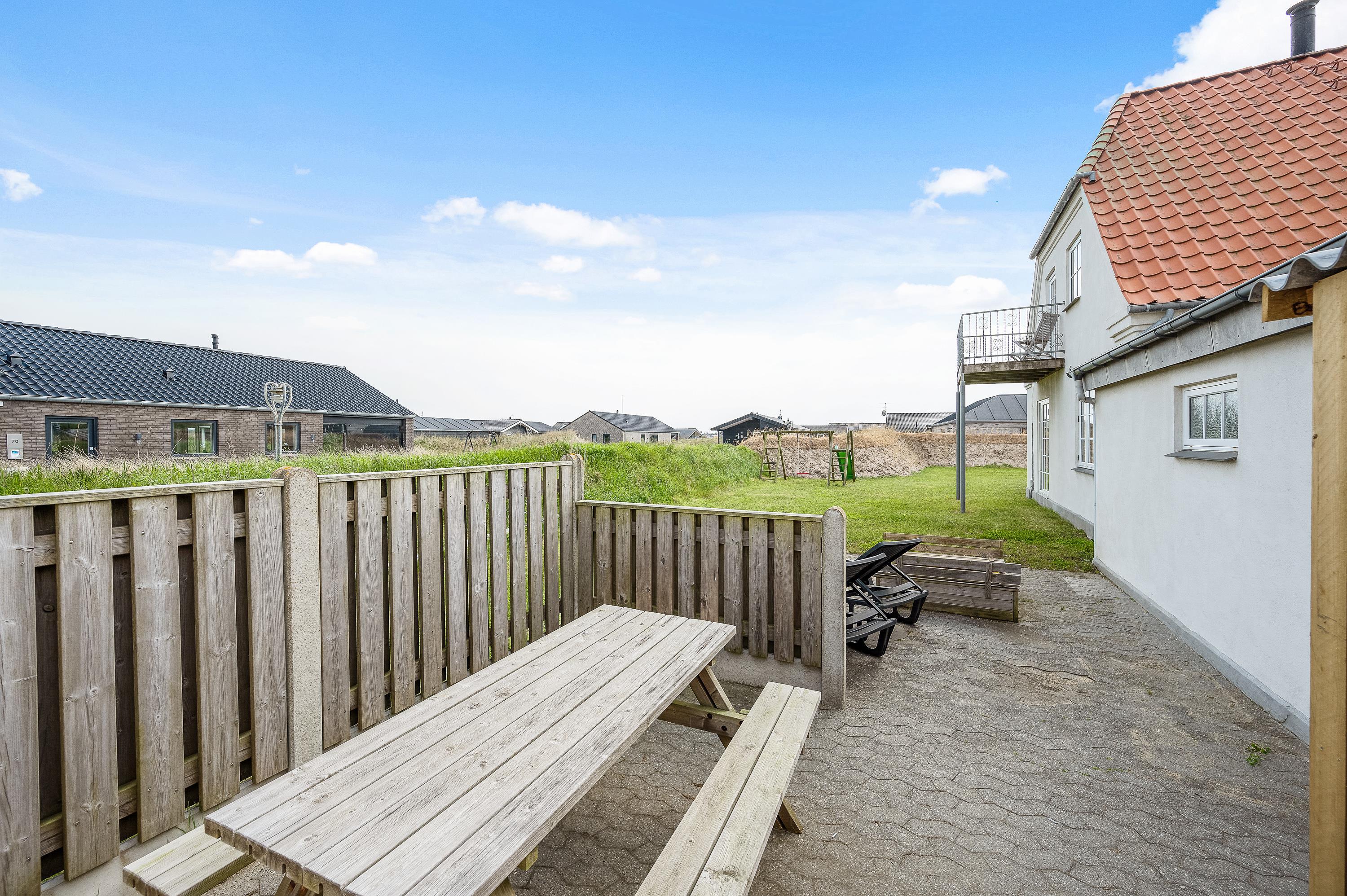Der er også en altan, som I kan træde ud på fra ét af soveværelserne på sommerhusets førstesal. Her kan I nyde en stille stund alene med en god bog, mens I har udsigt til børnene, der leger på gyngen og rutsjebanen. Fra altanen har I også udsigt til golfbanen i Søndervig,