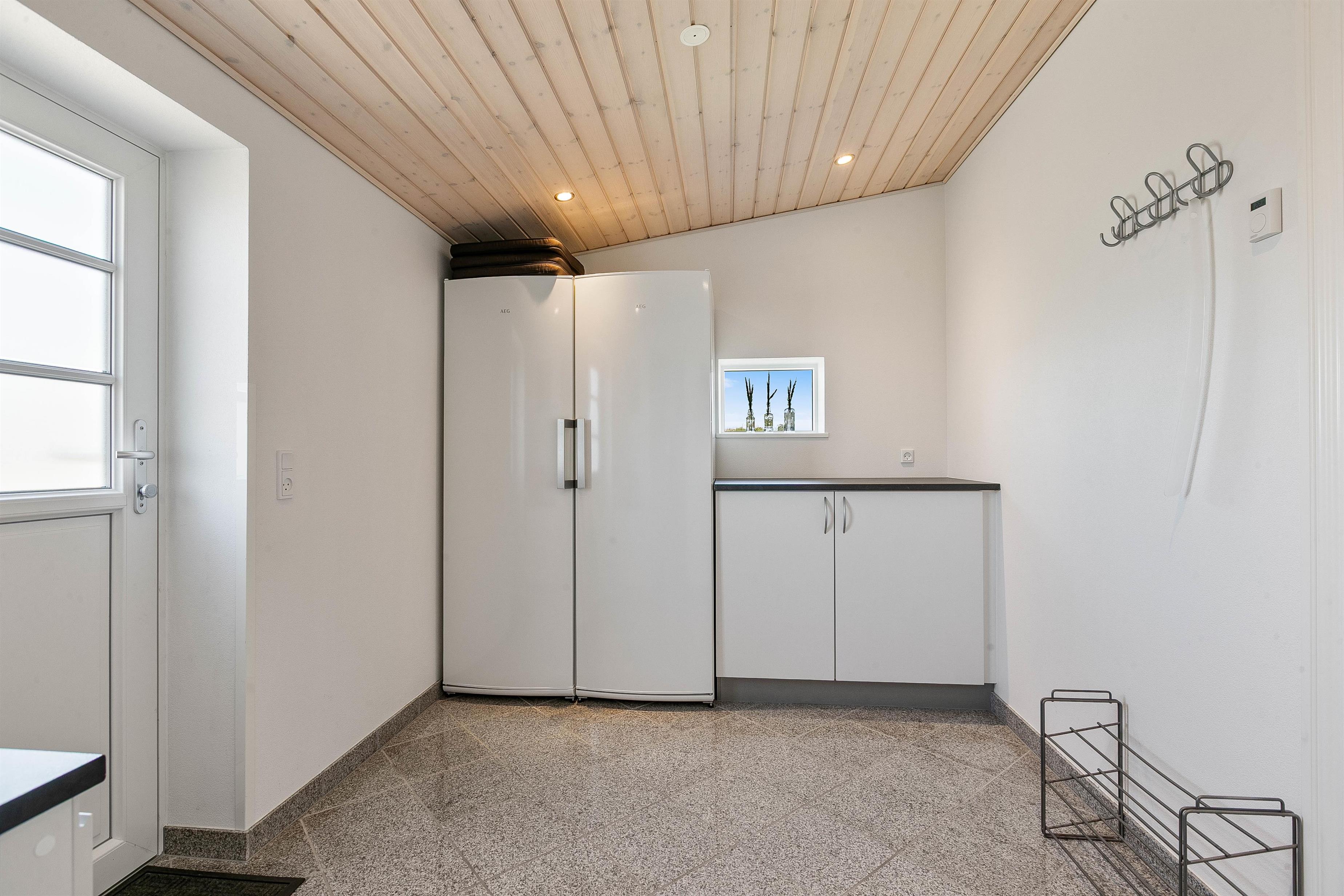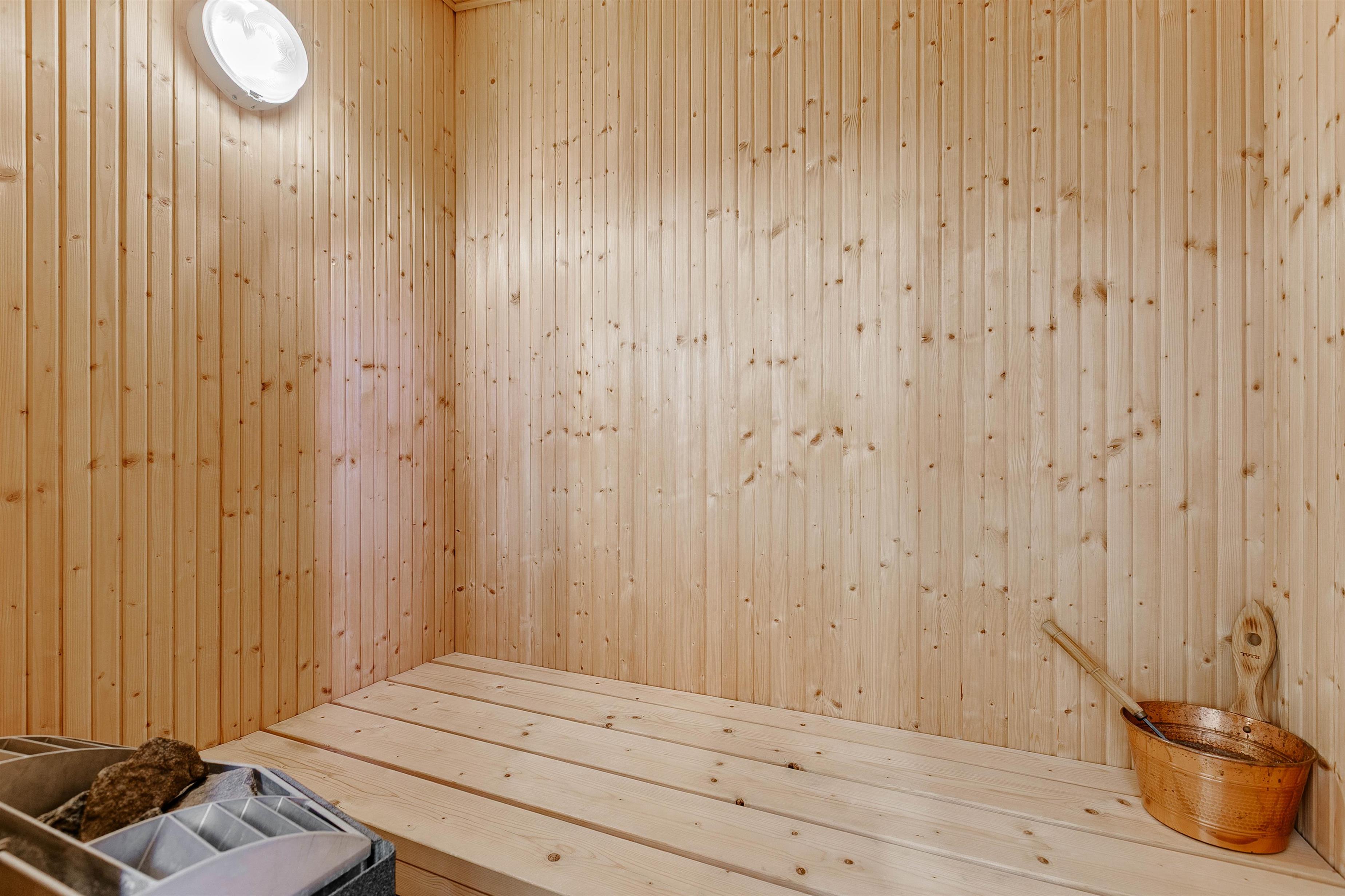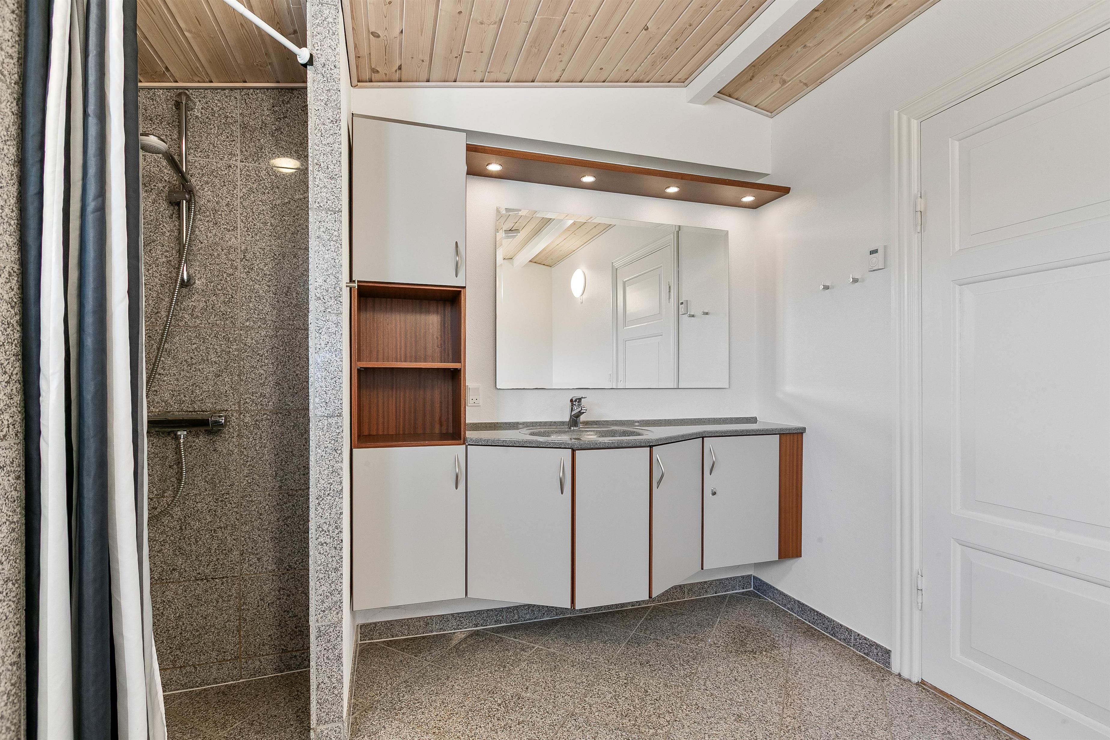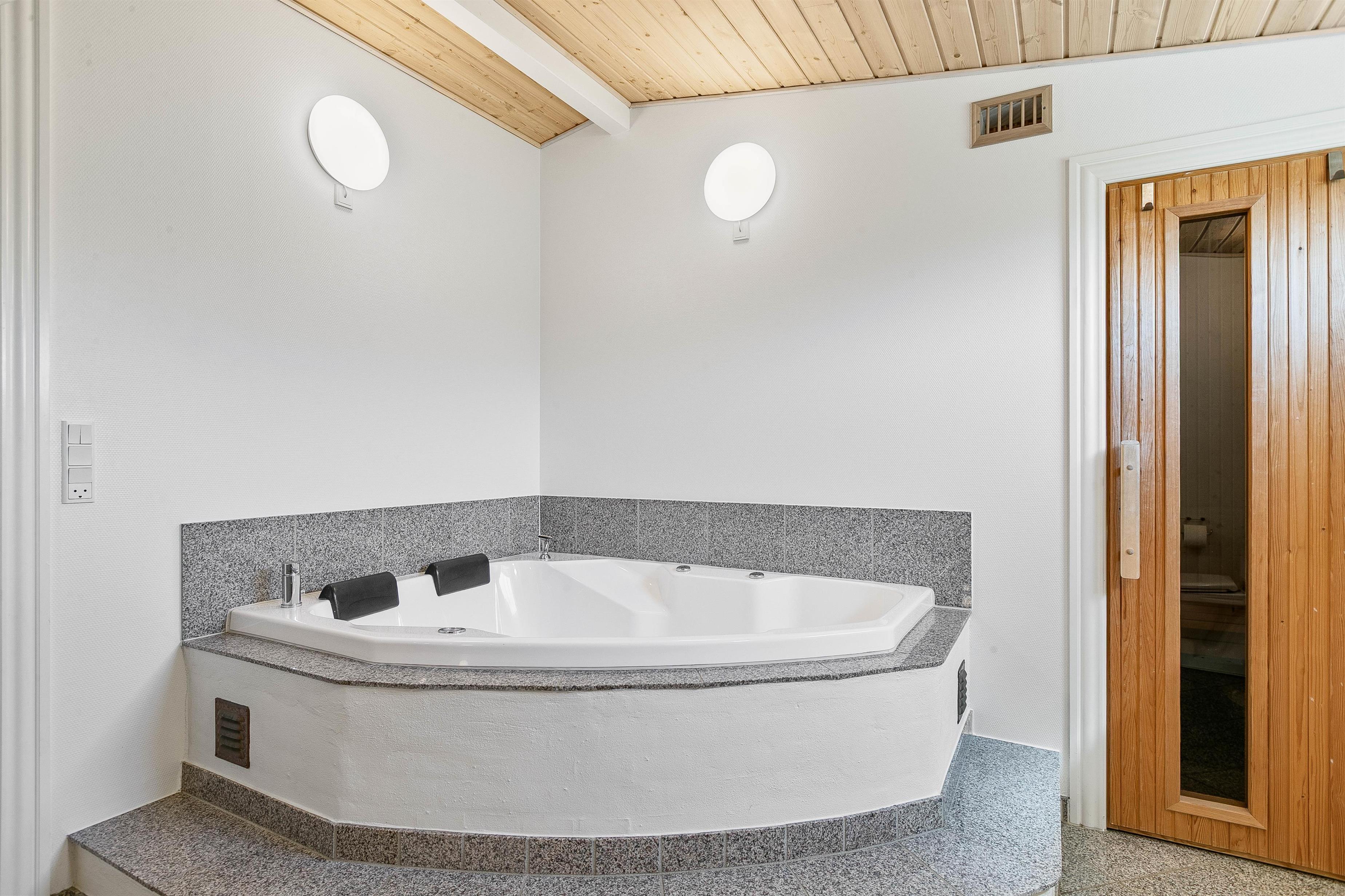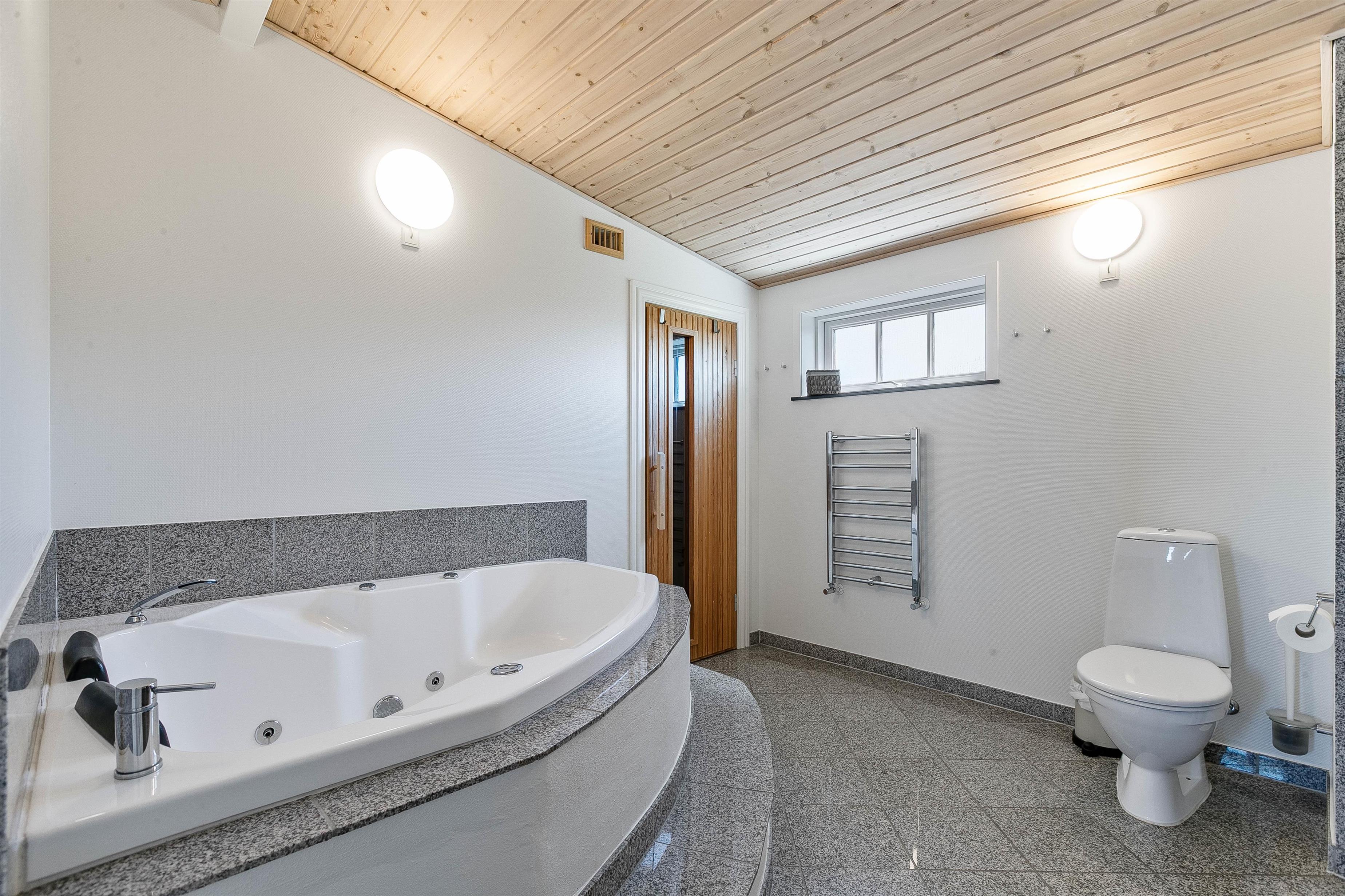 I stueplan finder I også sommerhusets badeværelse, der har gulvvarme, så I kan holde fødderne varme om morgenen. På badeværelset ligger sommerhusets ultimative højdepunkter også; nemlig spaen og saunaen. Forkæl jer selv med en tur i det boblende vand eller i den varme sauna, og lad jeres batterier blive ladt helt op igen.