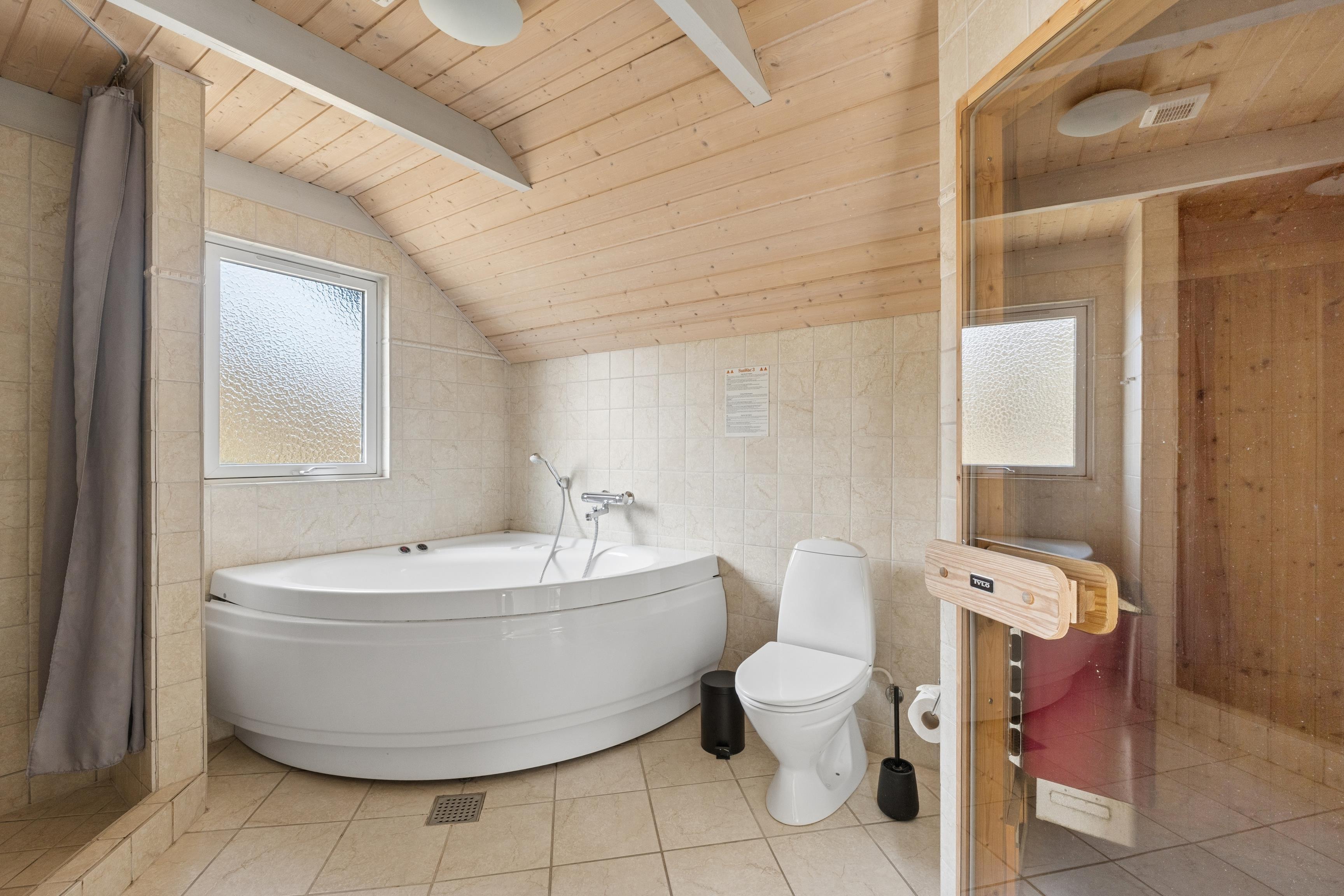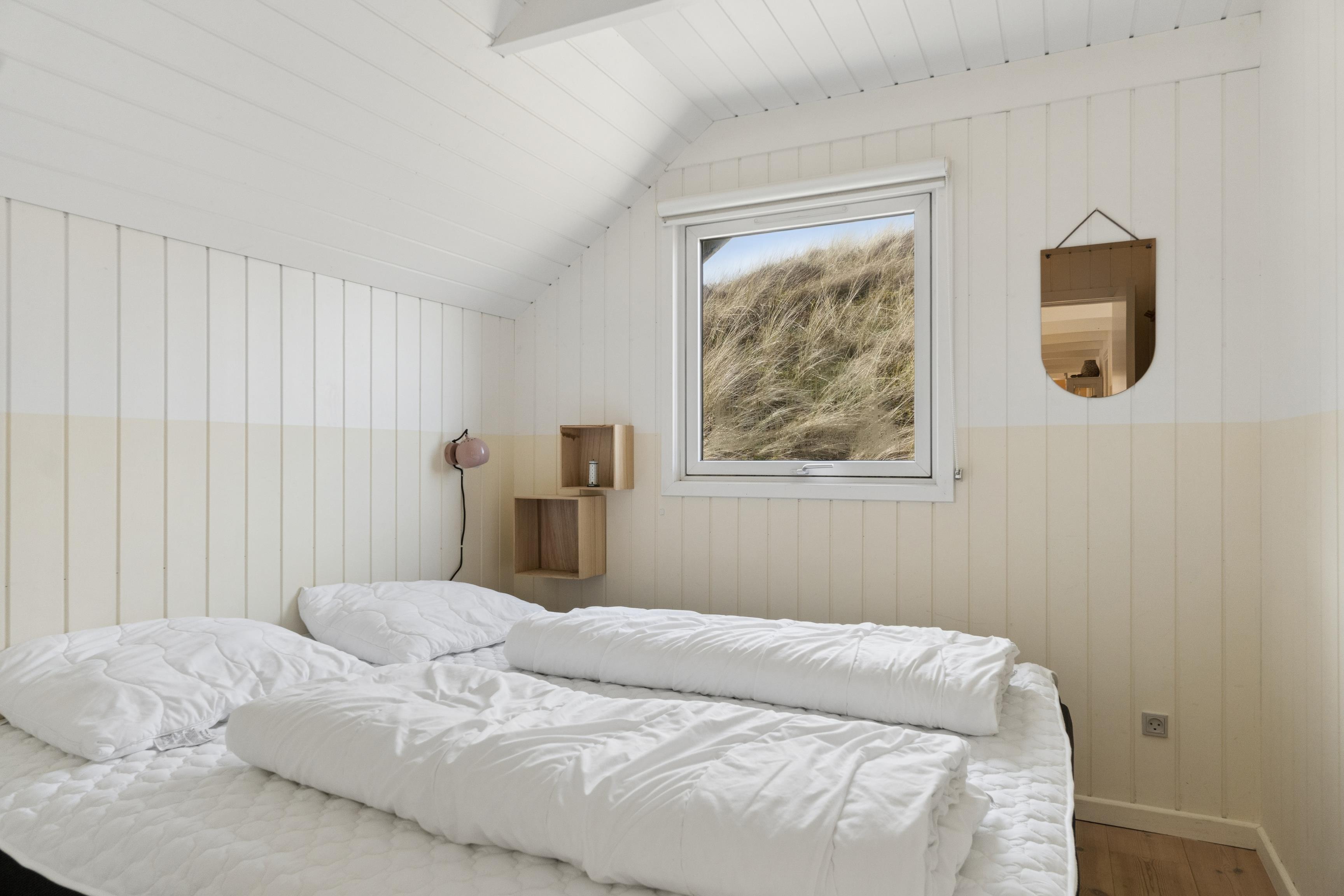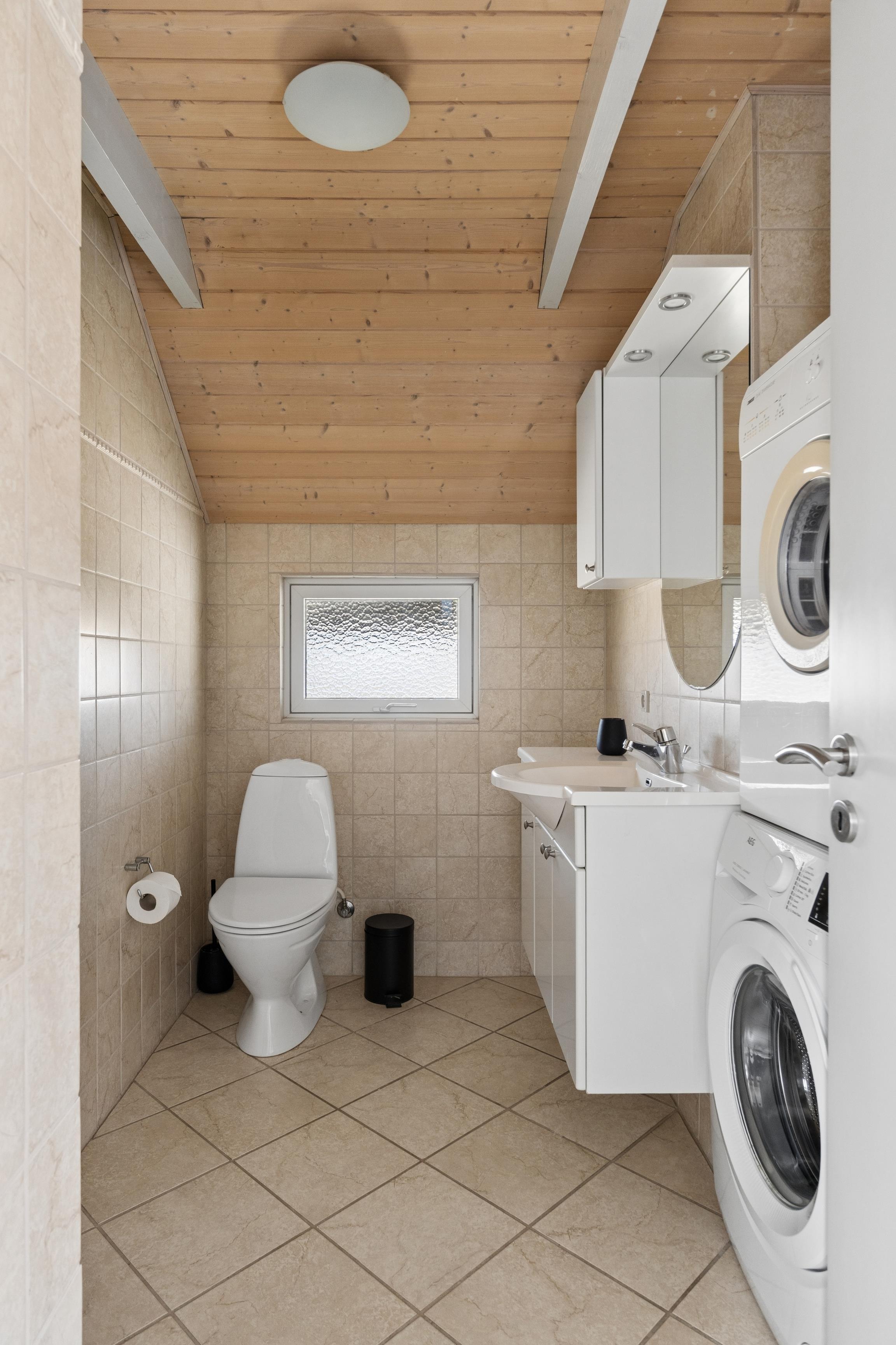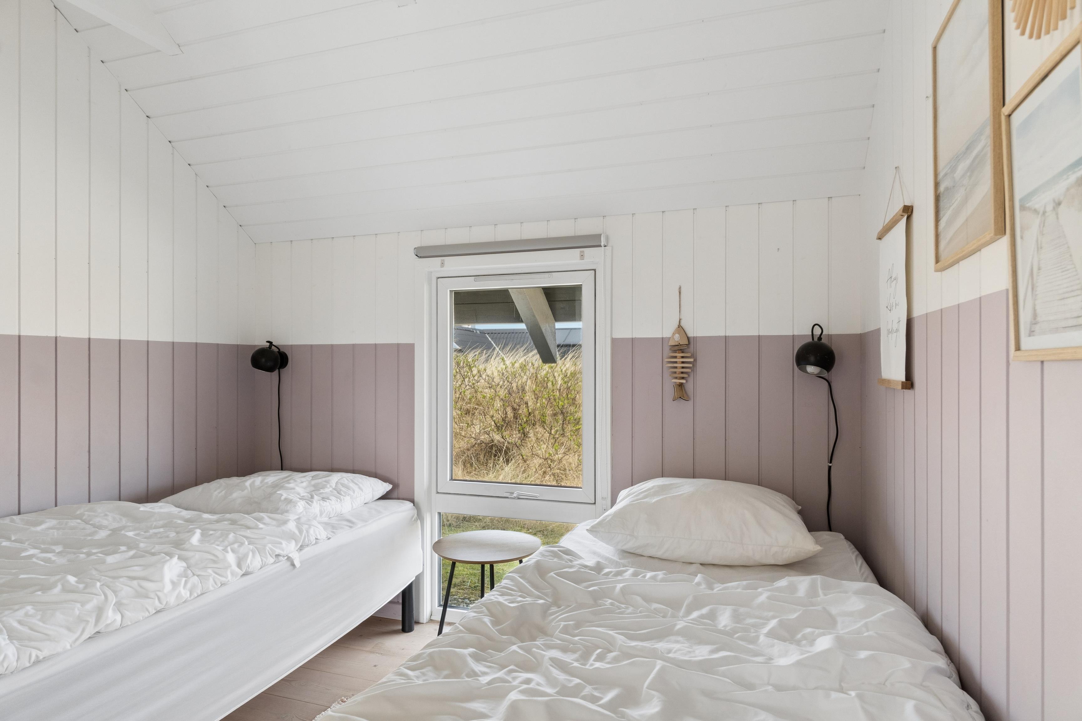 Sommerhuset har plads til 8 personer fordelt på fire soveværelser – to med dobbeltsenge og to med enkeltsenge. Der er to badeværelser, begge med gulvvarme og bruseniche. På det store badeværelse finder I også en sauna, og i det mindre badeværelse er der vaskemaskine og tørretumbler.