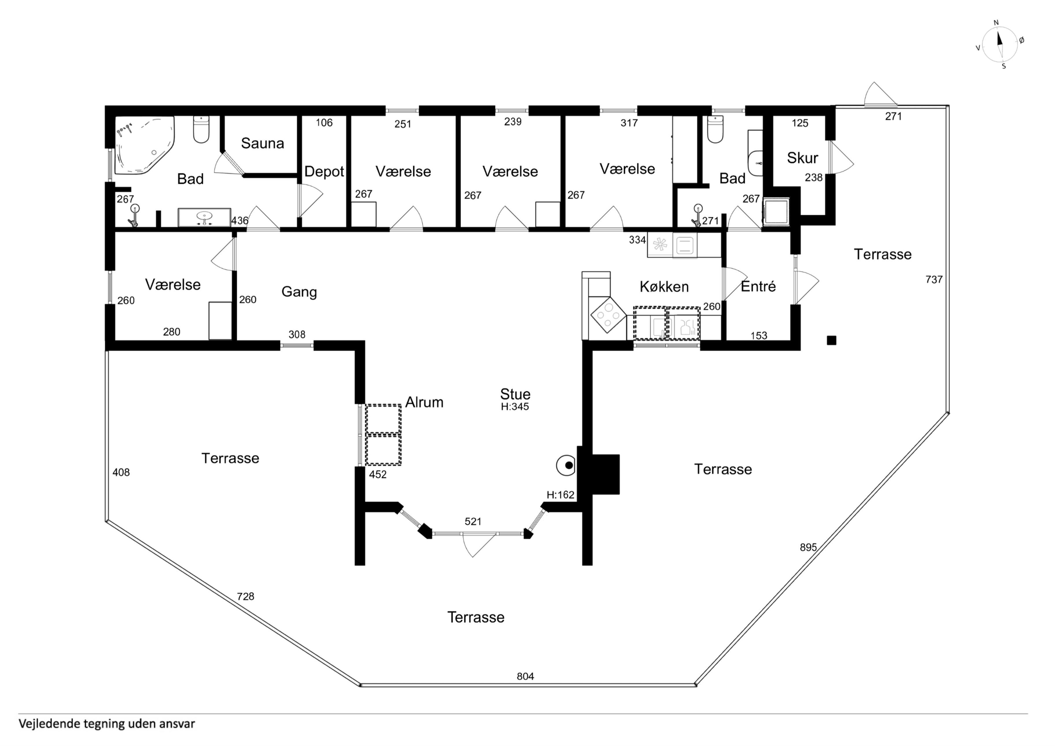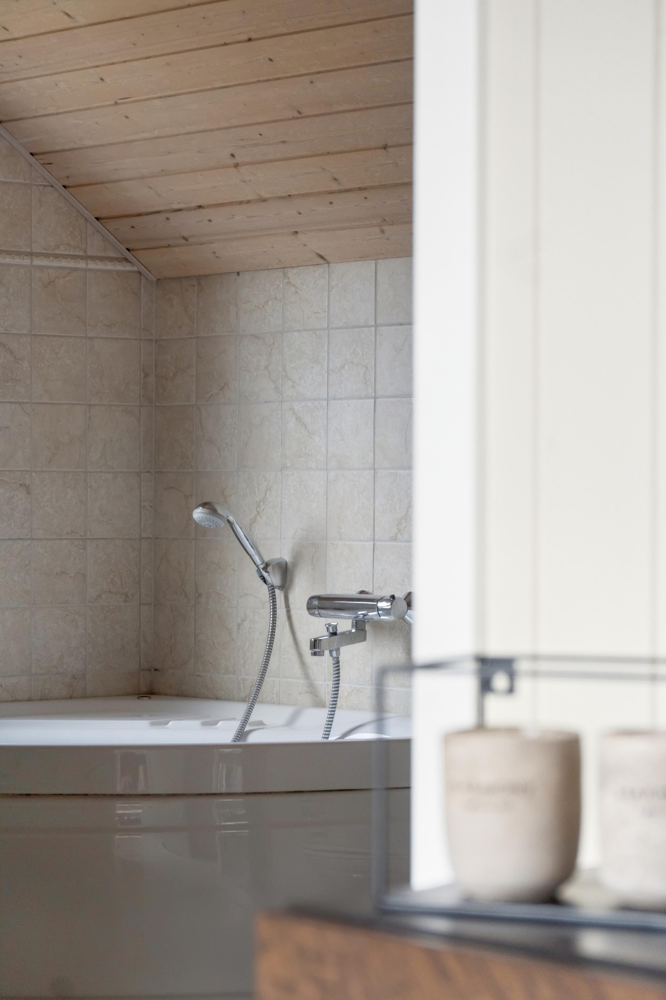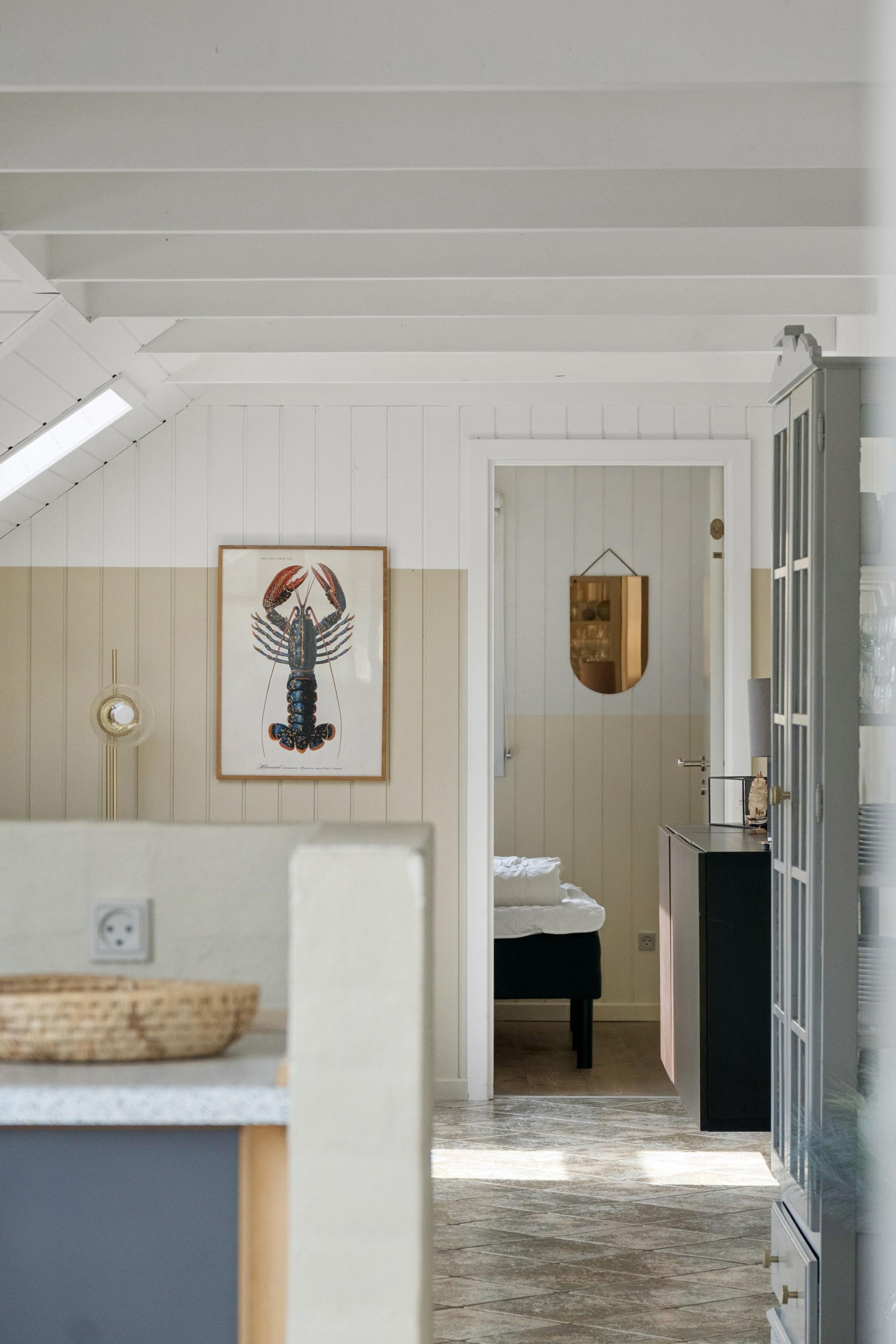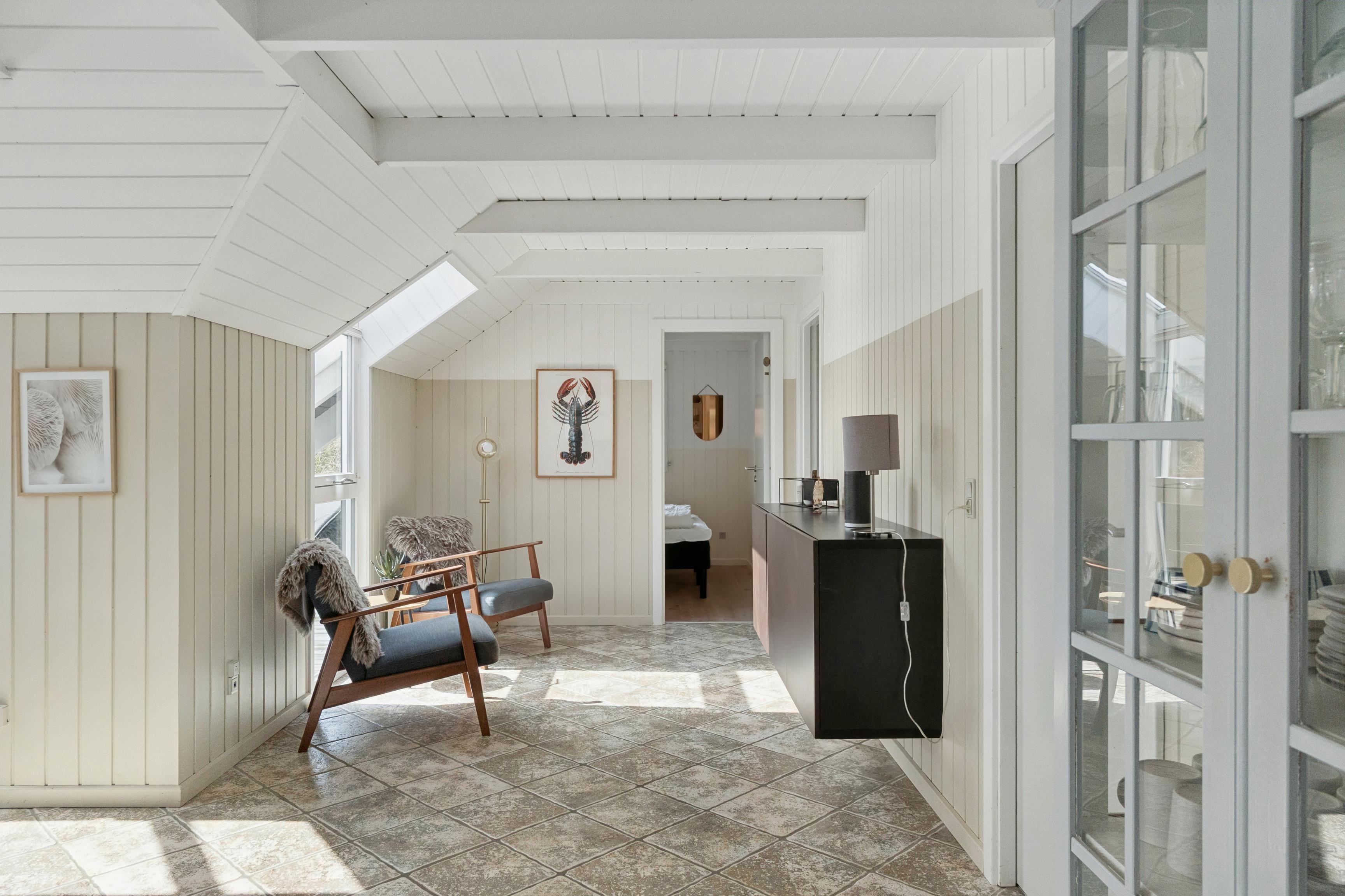 Sommerhuset har plads til 8 personer fordelt på fire soveværelser – to med dobbeltsenge og to med enkeltsenge. Der er to badeværelser, begge med gulvvarme og bruseniche. På det store badeværelse finder I også en sauna, og i det mindre badeværelse er der vaskemaskine og tørretumbler.