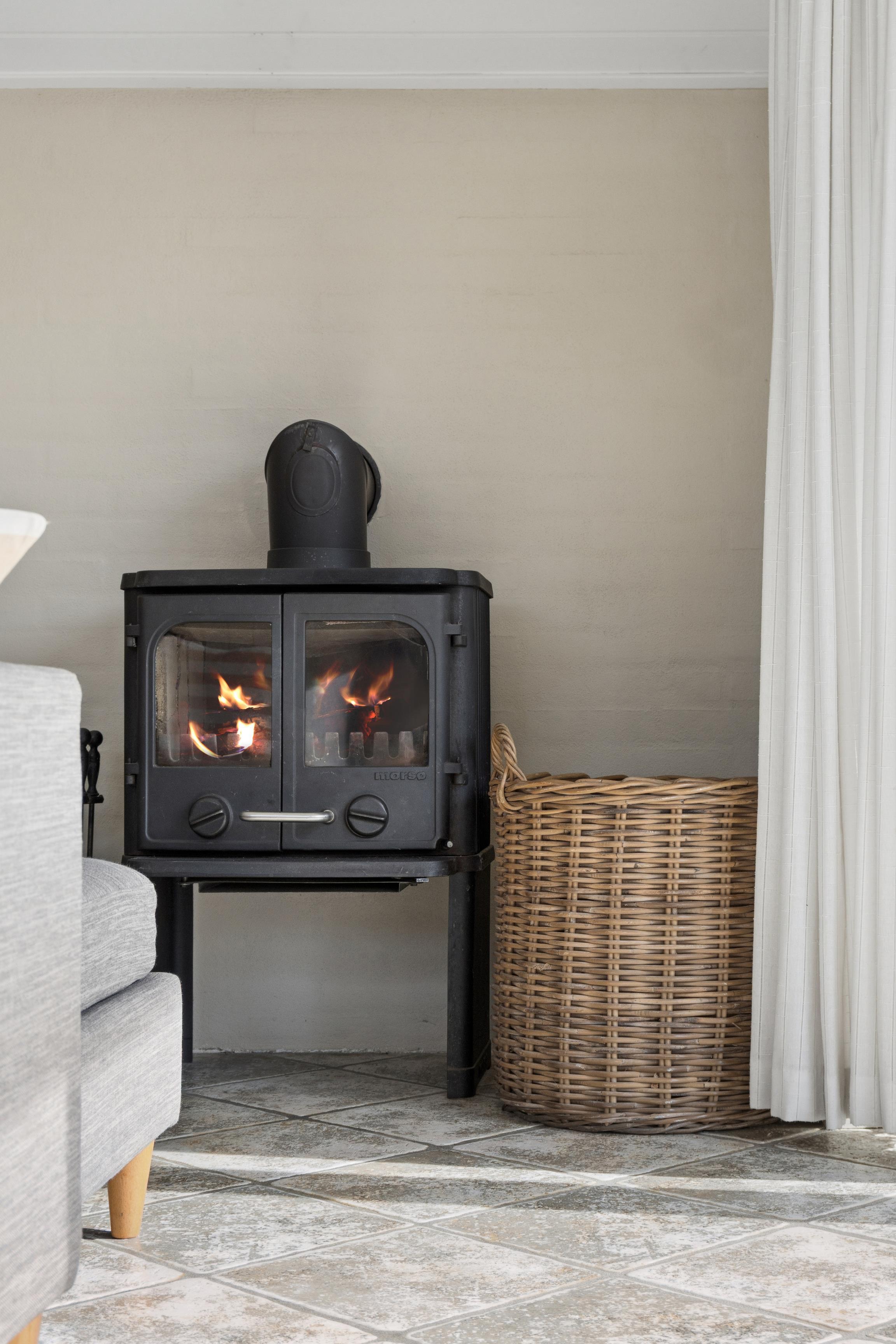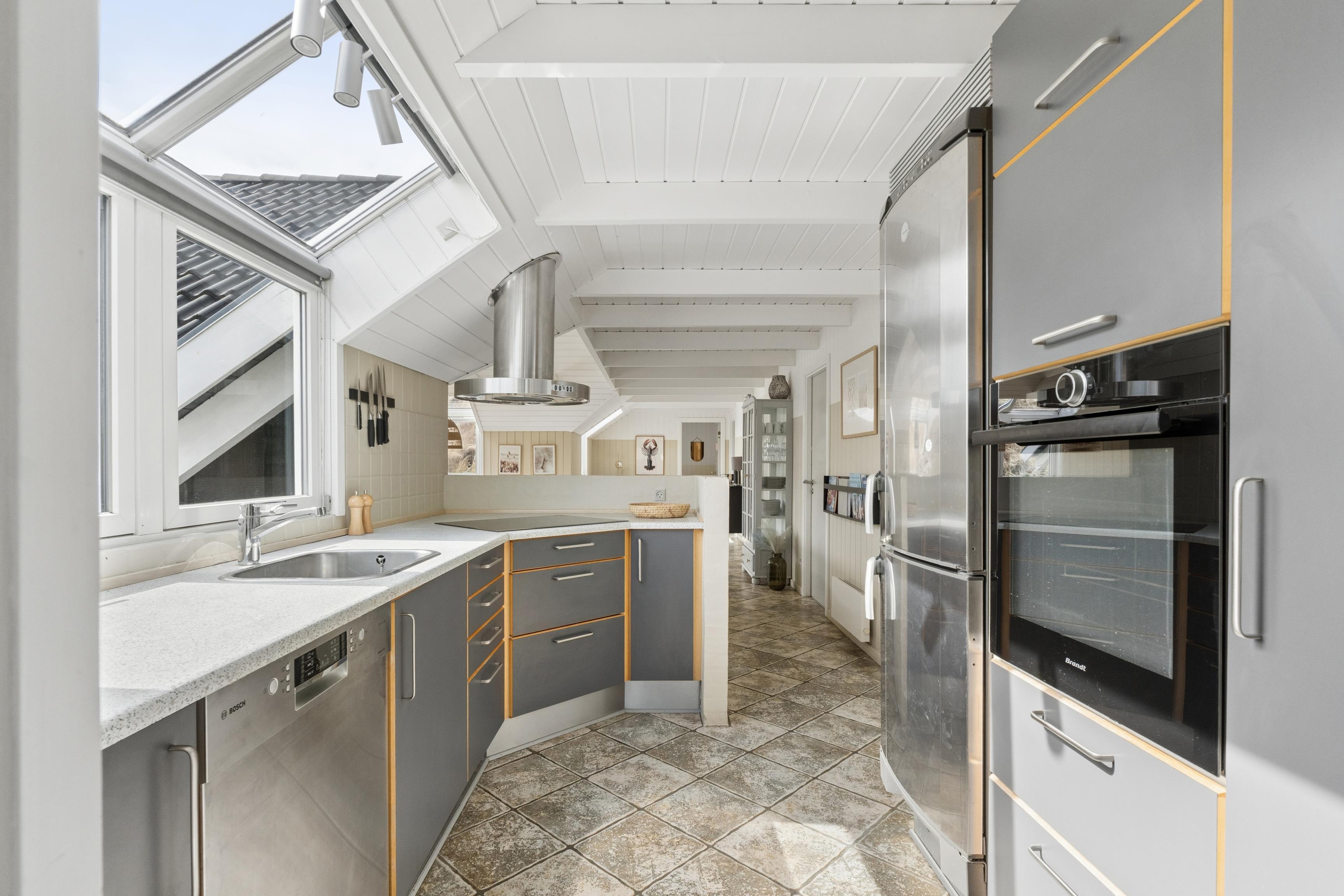 Husets hjerte er det store, lyse opholdsrum med loft til kip, synlige bjælker og klinkegulv med gulvvarme. Her er der god plads til samvær, hygge og afslapning. Stuen er smagfuldt møbleret og udstyret med fladskærms-TV, brændeovn, parabol med tyske kanaler og gratis fibernet. Køkkenet ligger i åben forbindelse med stuen og er veludstyret med bl.a. opvaskemaskine, mikroovn og en stor fryser på 165 liter.
