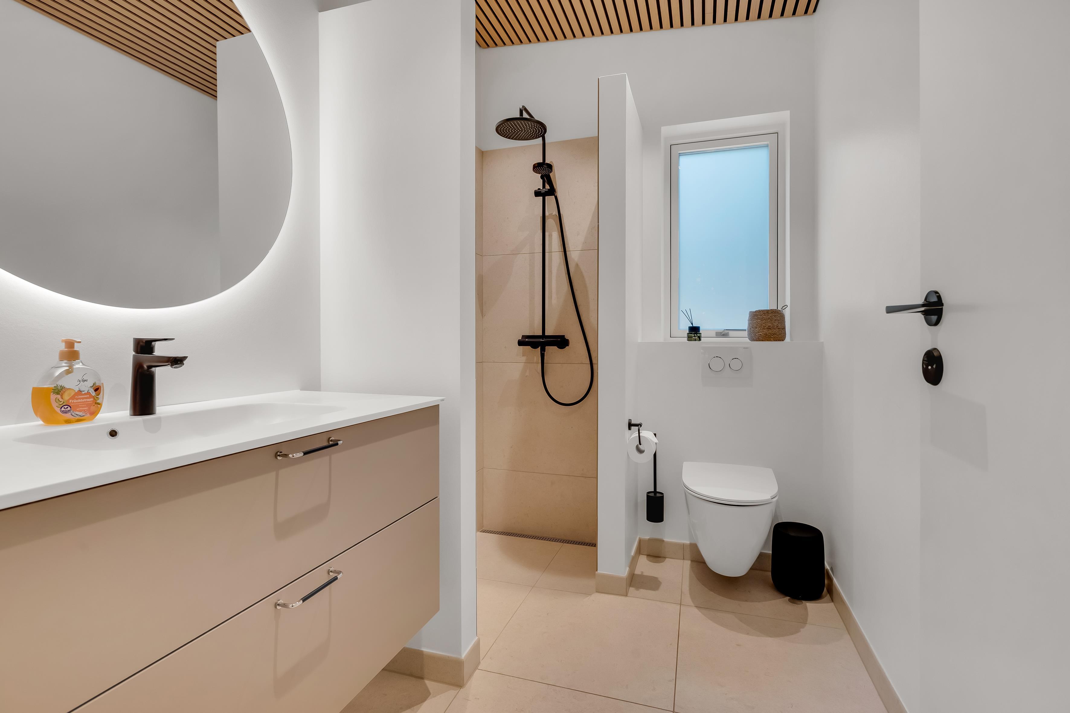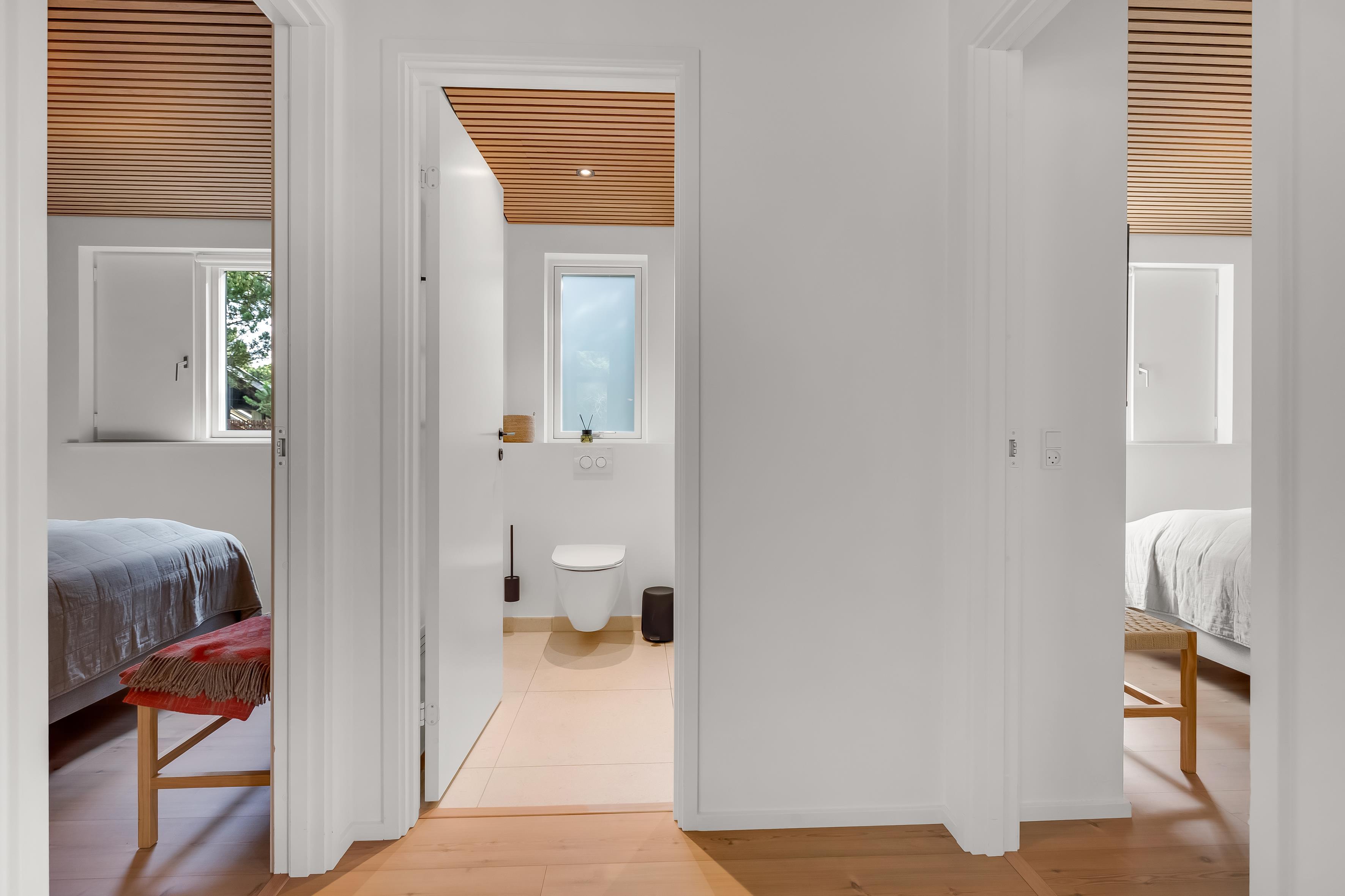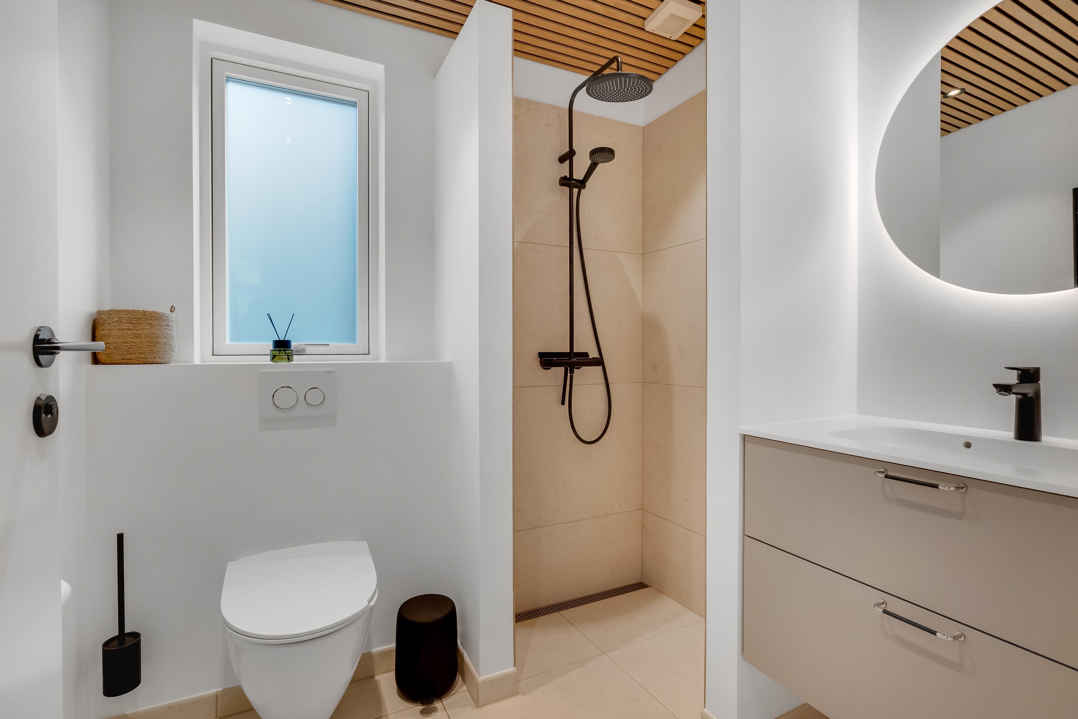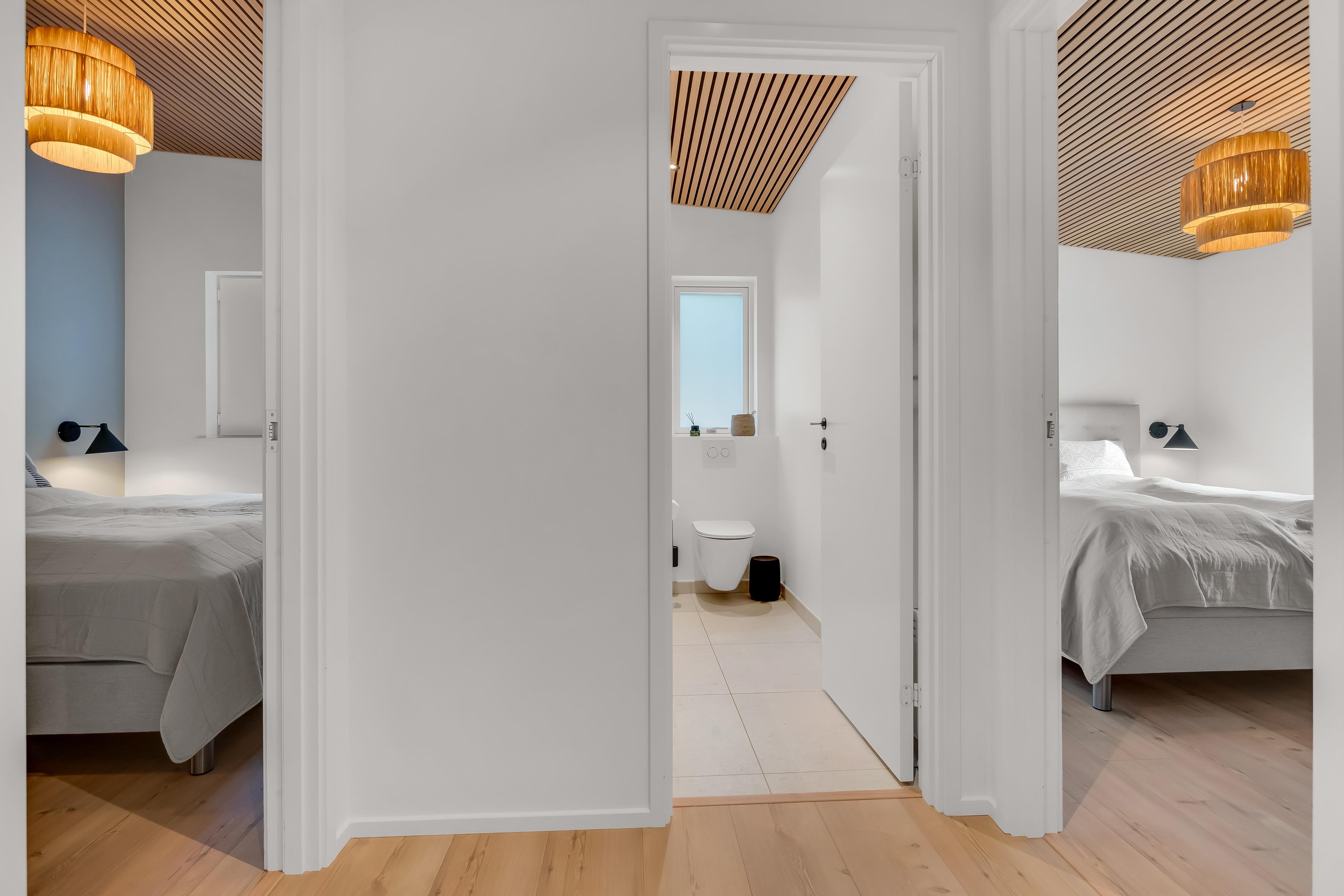 Huset rummer hele 180 m² og byder på fem rummelige soveværelser, hvoraf ét har en praktisk overkøje. Med tre moderne badeværelser – alle med gulvvarme – er det let at få en god start på dagen, selv når huset er fuldt belagt.