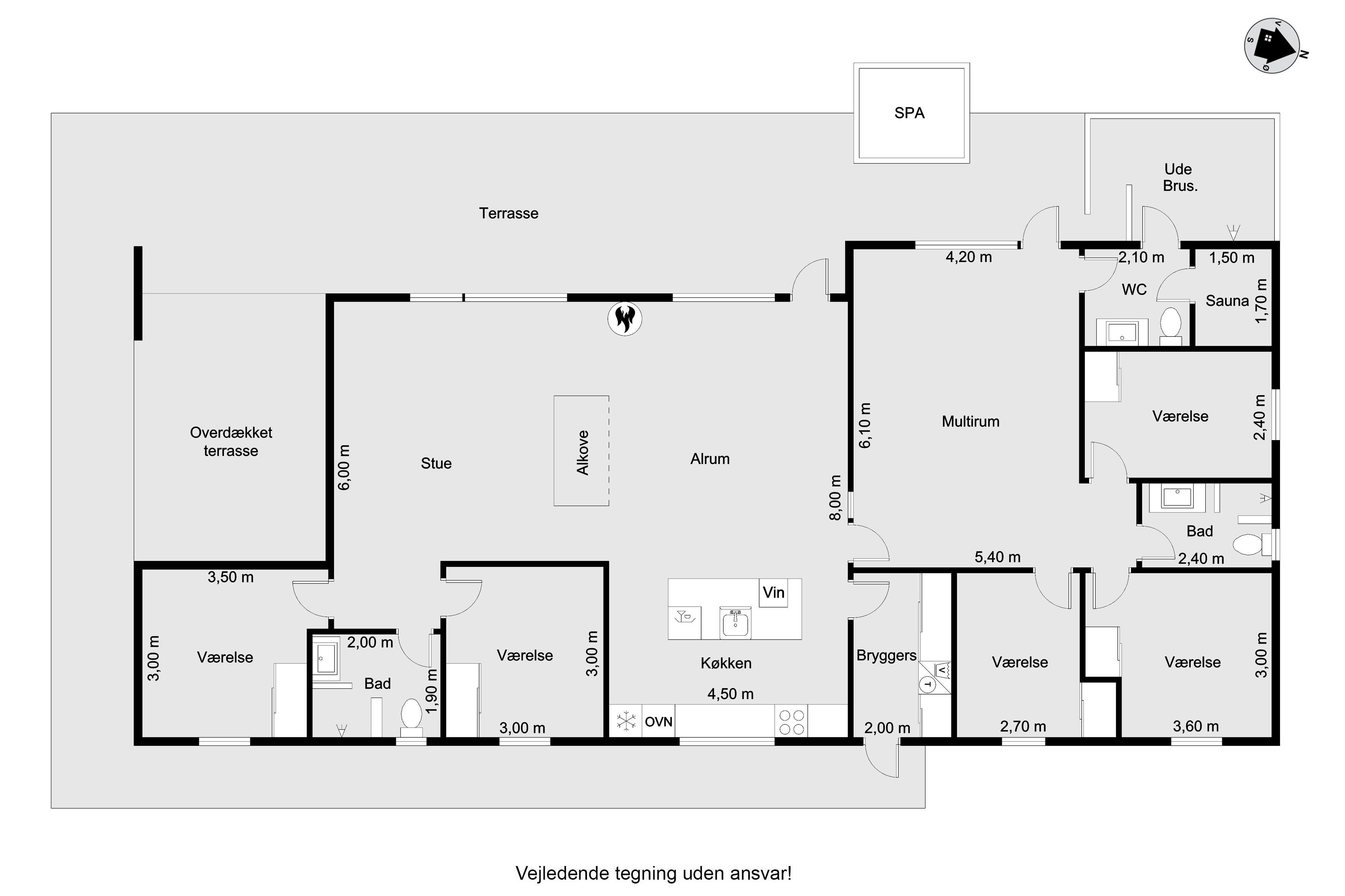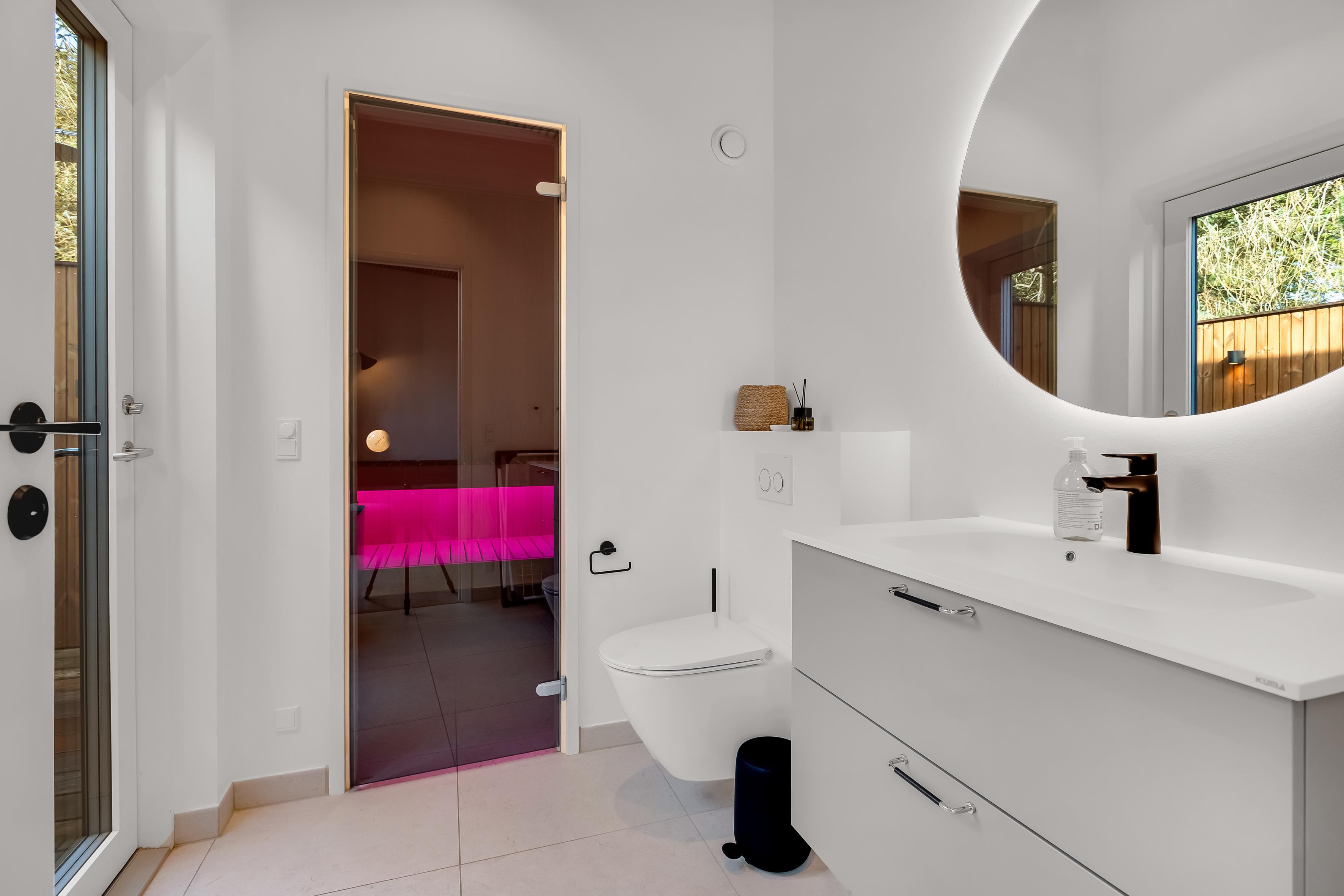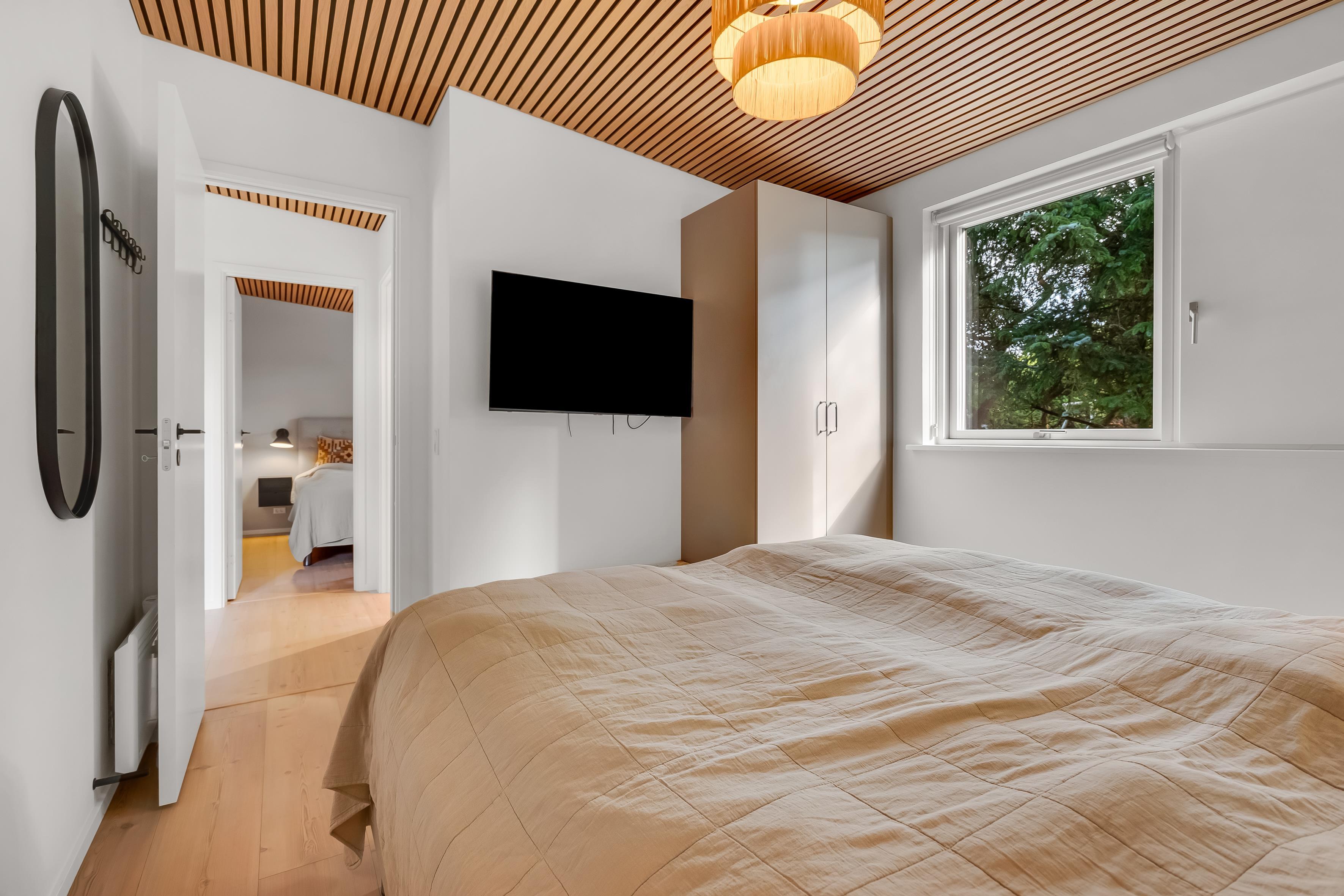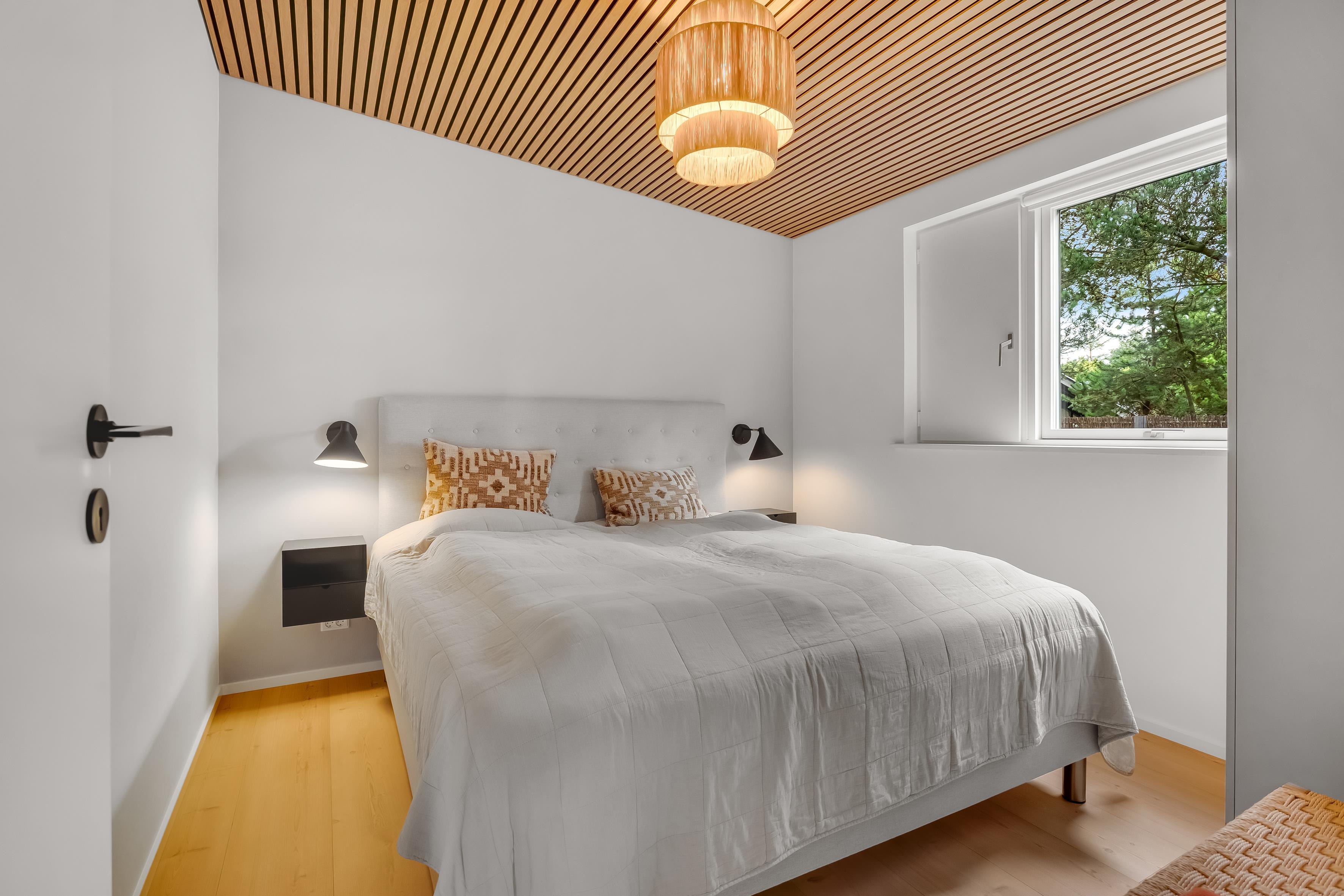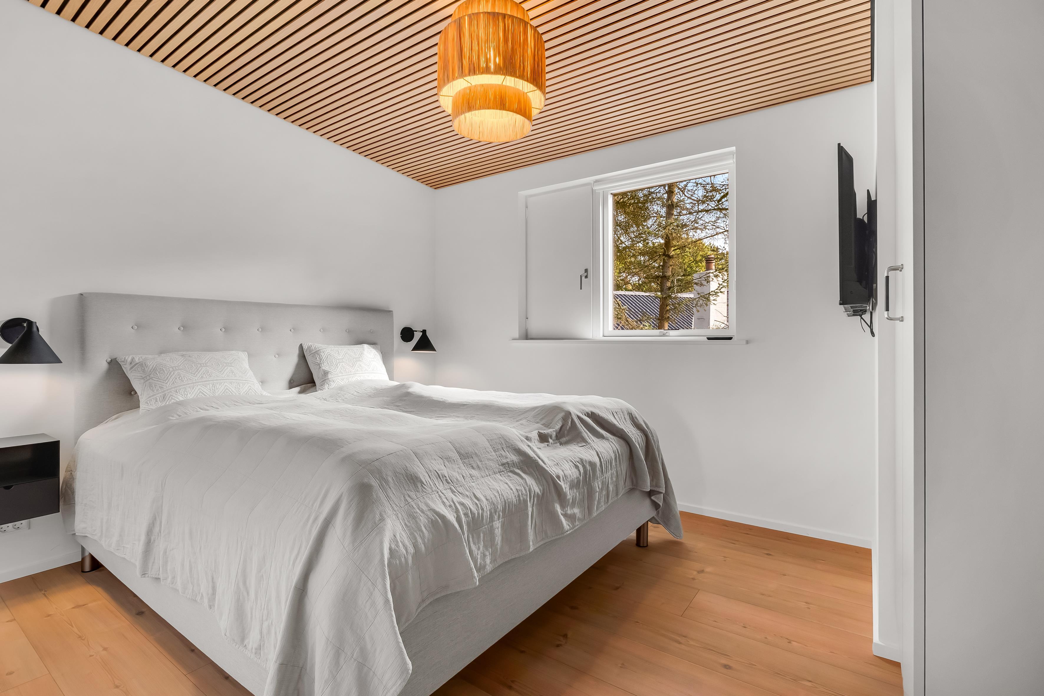 Huset rummer hele 180 m² og byder på fem rummelige soveværelser, hvoraf ét har en praktisk overkøje. Med tre moderne badeværelser – alle med gulvvarme – er det let at få en god start på dagen, selv når huset er fuldt belagt.