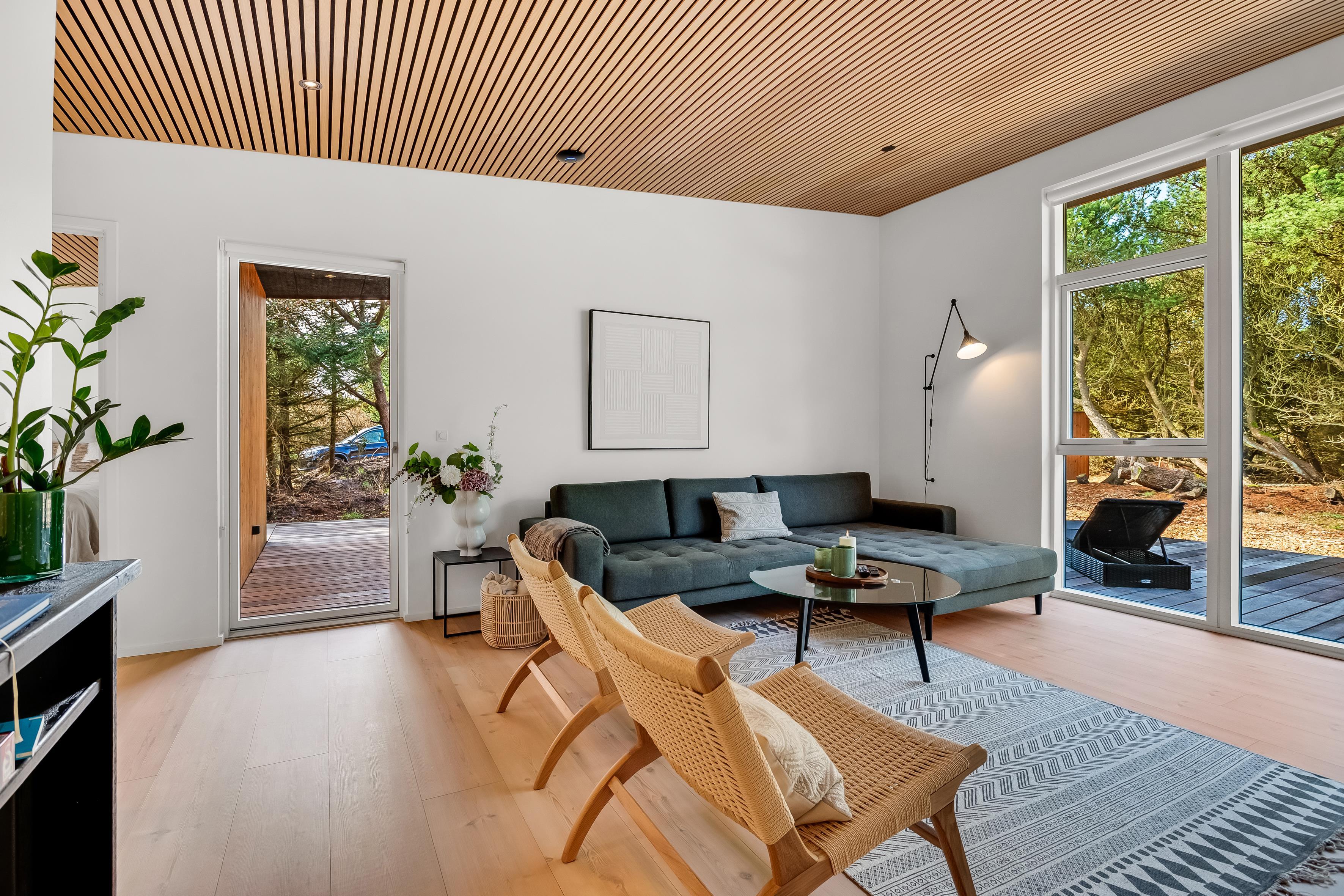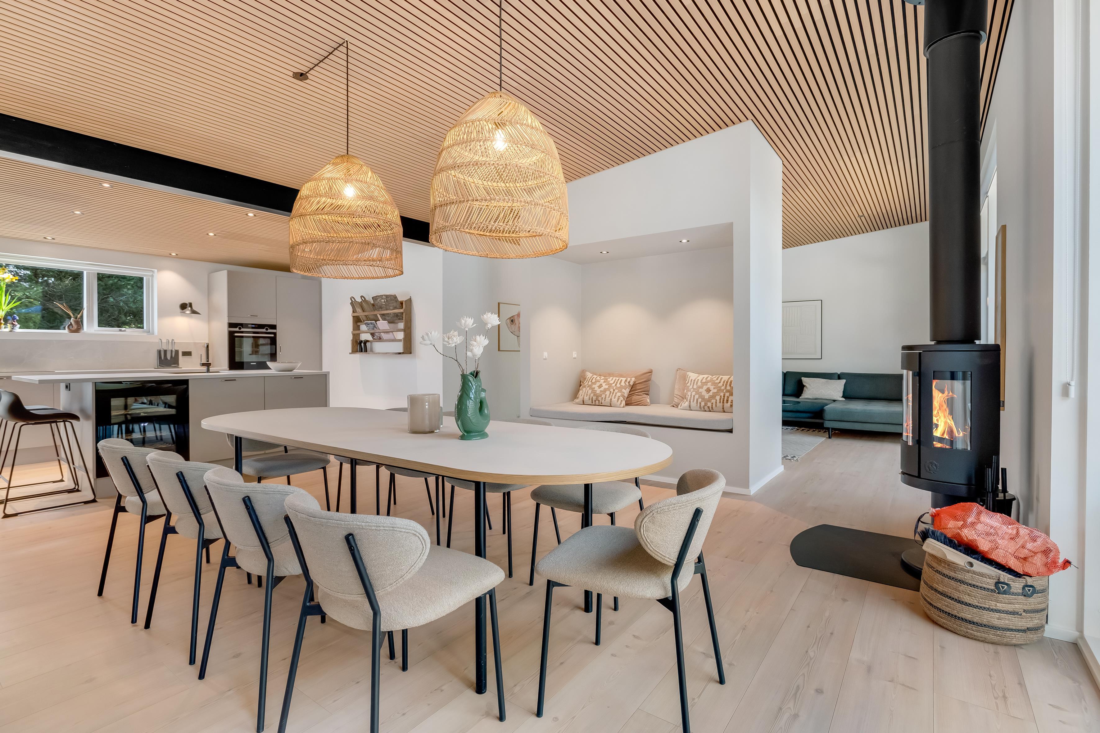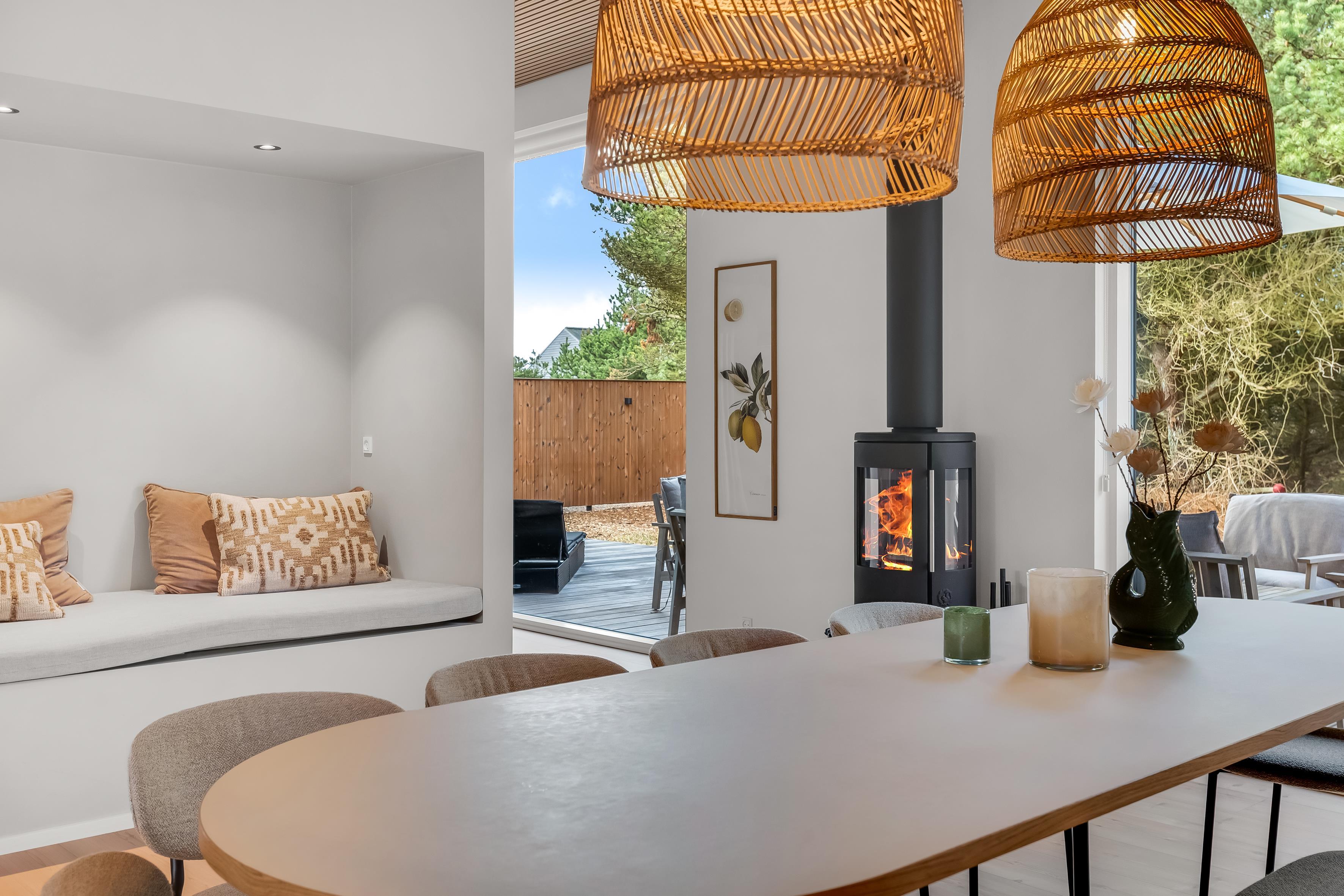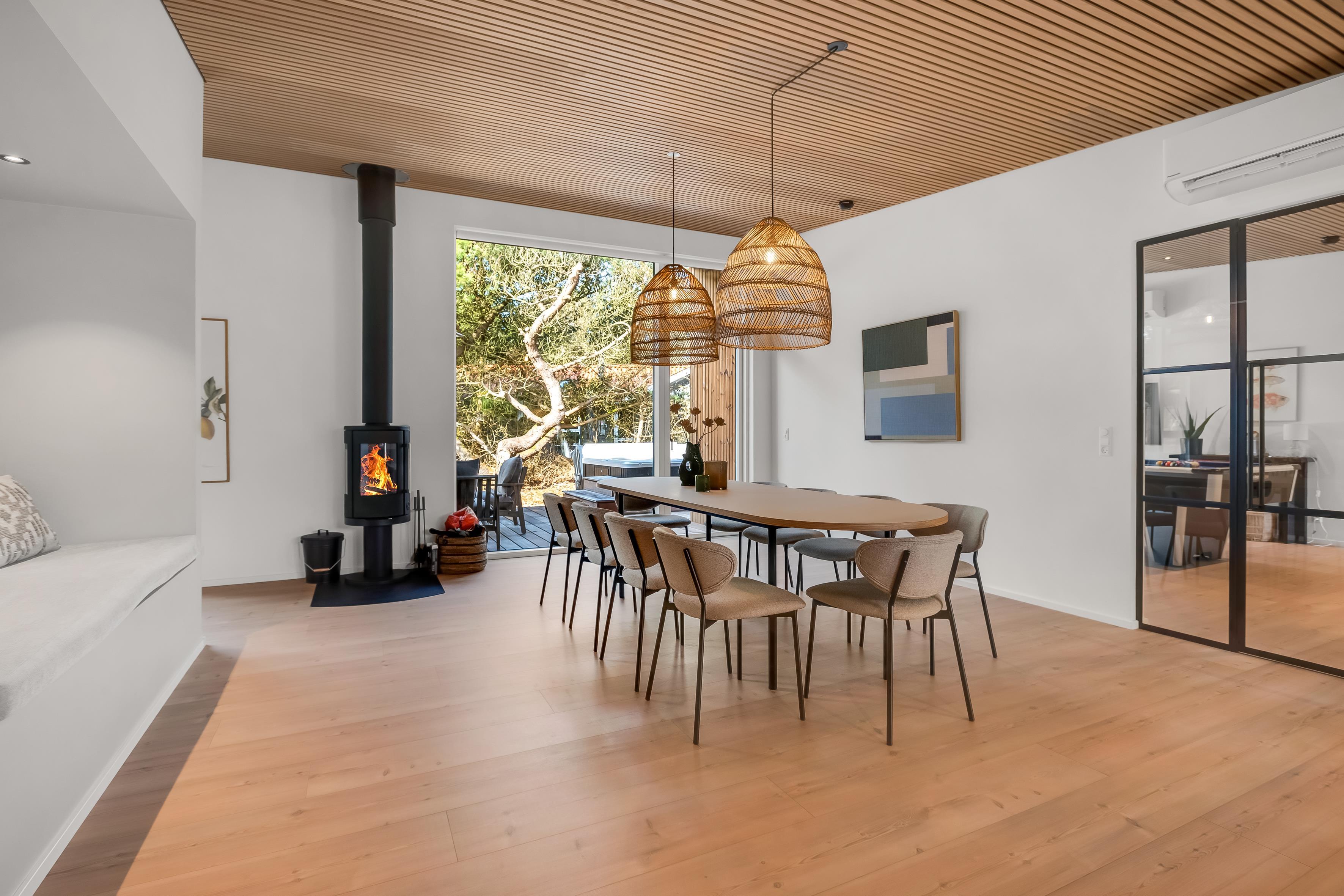 Den lyse opholdsstue har gulvvarme, brændeovn og store vinduespartier, der skaber en varm og indbydende atmosfære. Her kan I samles til hyggelige aftener, god mad og afslapning.