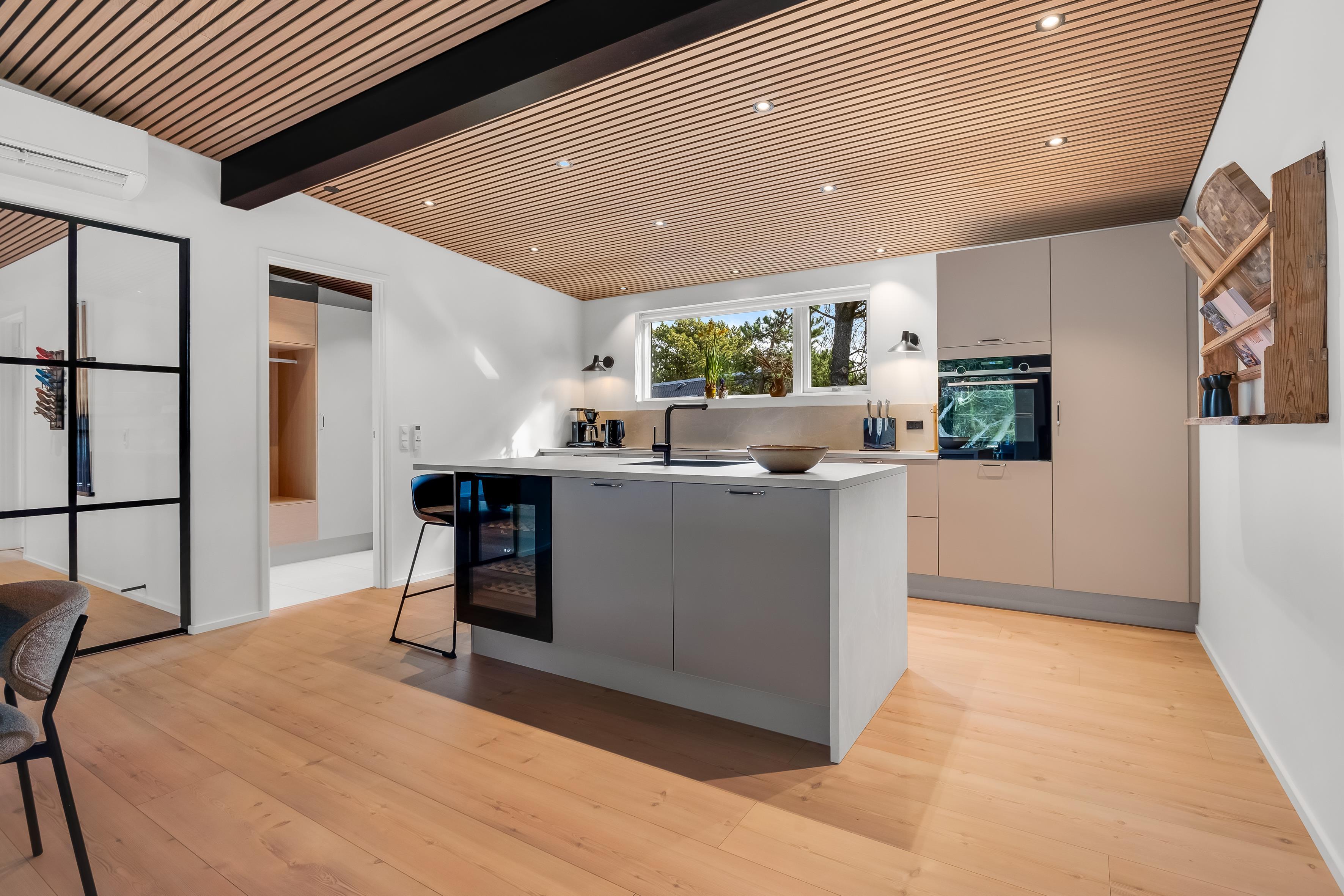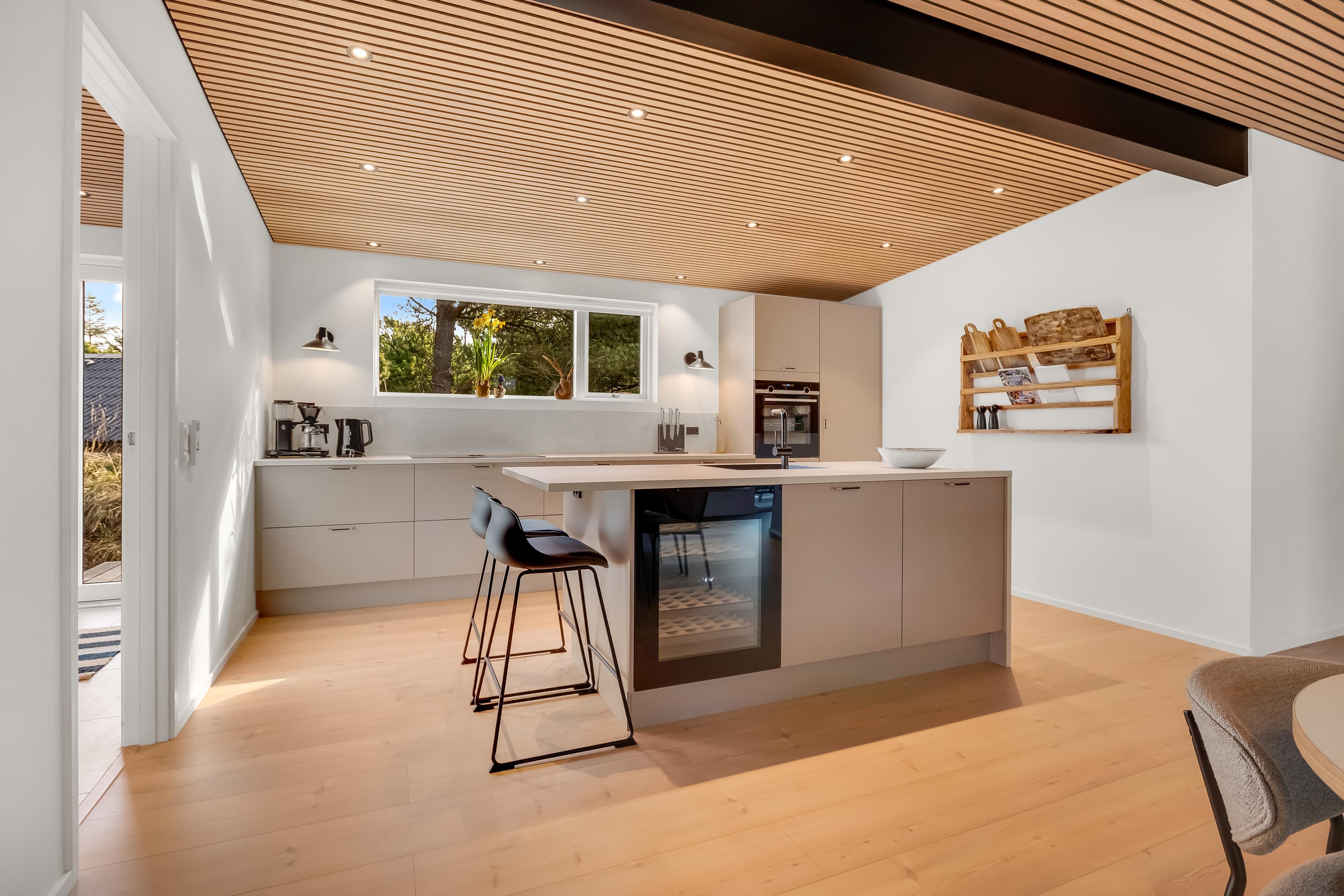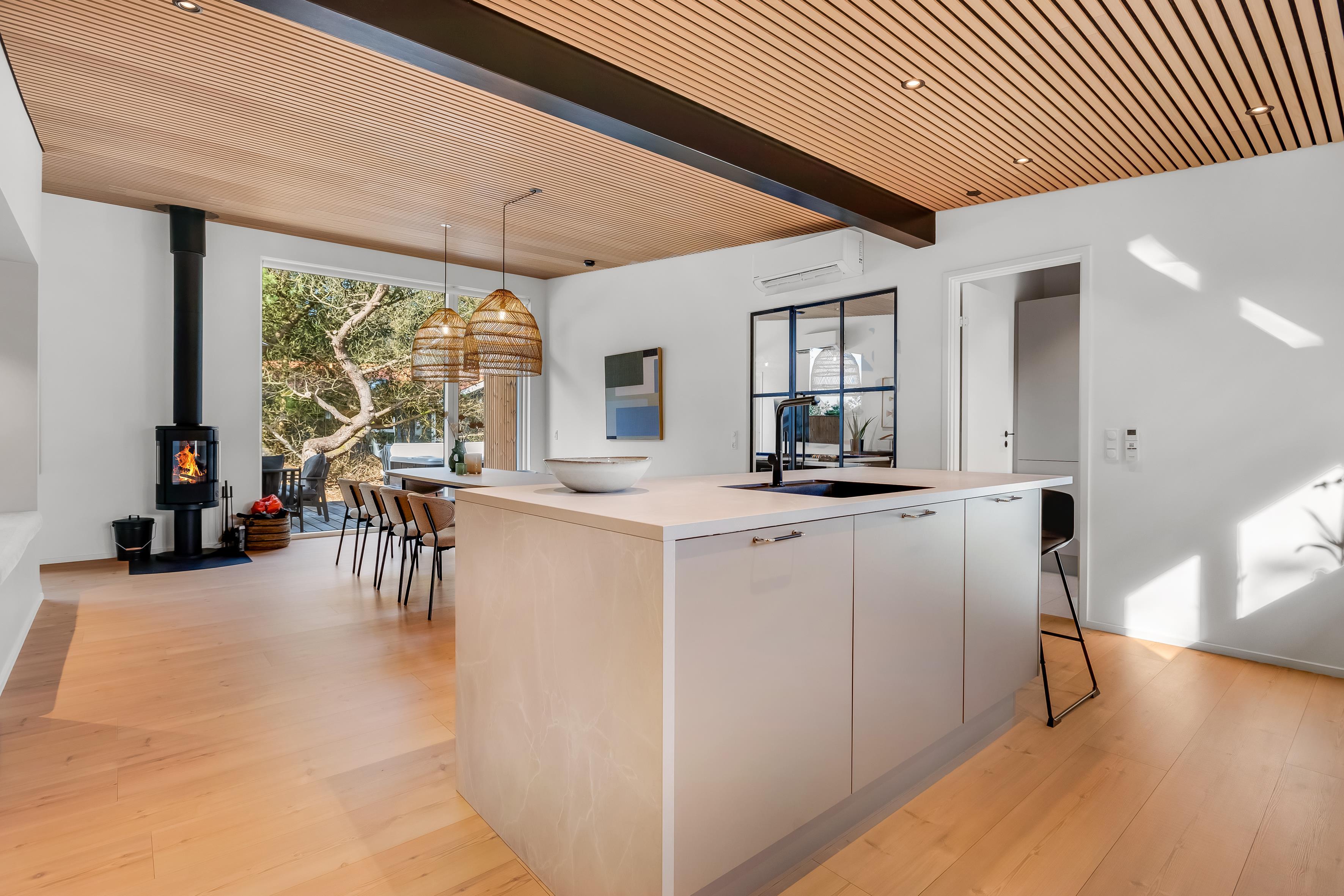 Den lyse opholdsstue har gulvvarme, brændeovn og store vinduespartier, der skaber en varm og indbydende atmosfære. Her kan I samles til hyggelige aftener, god mad og afslapning.