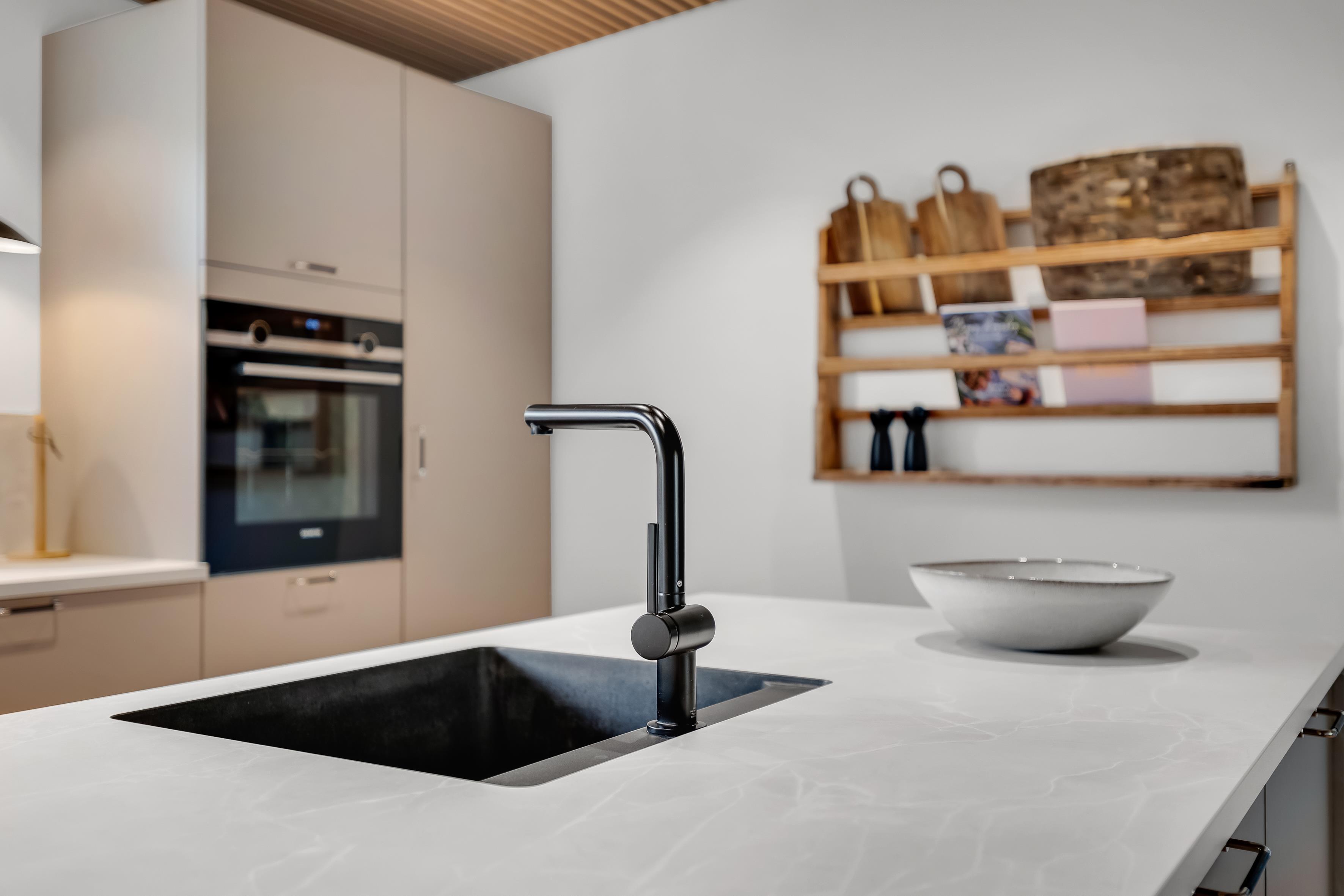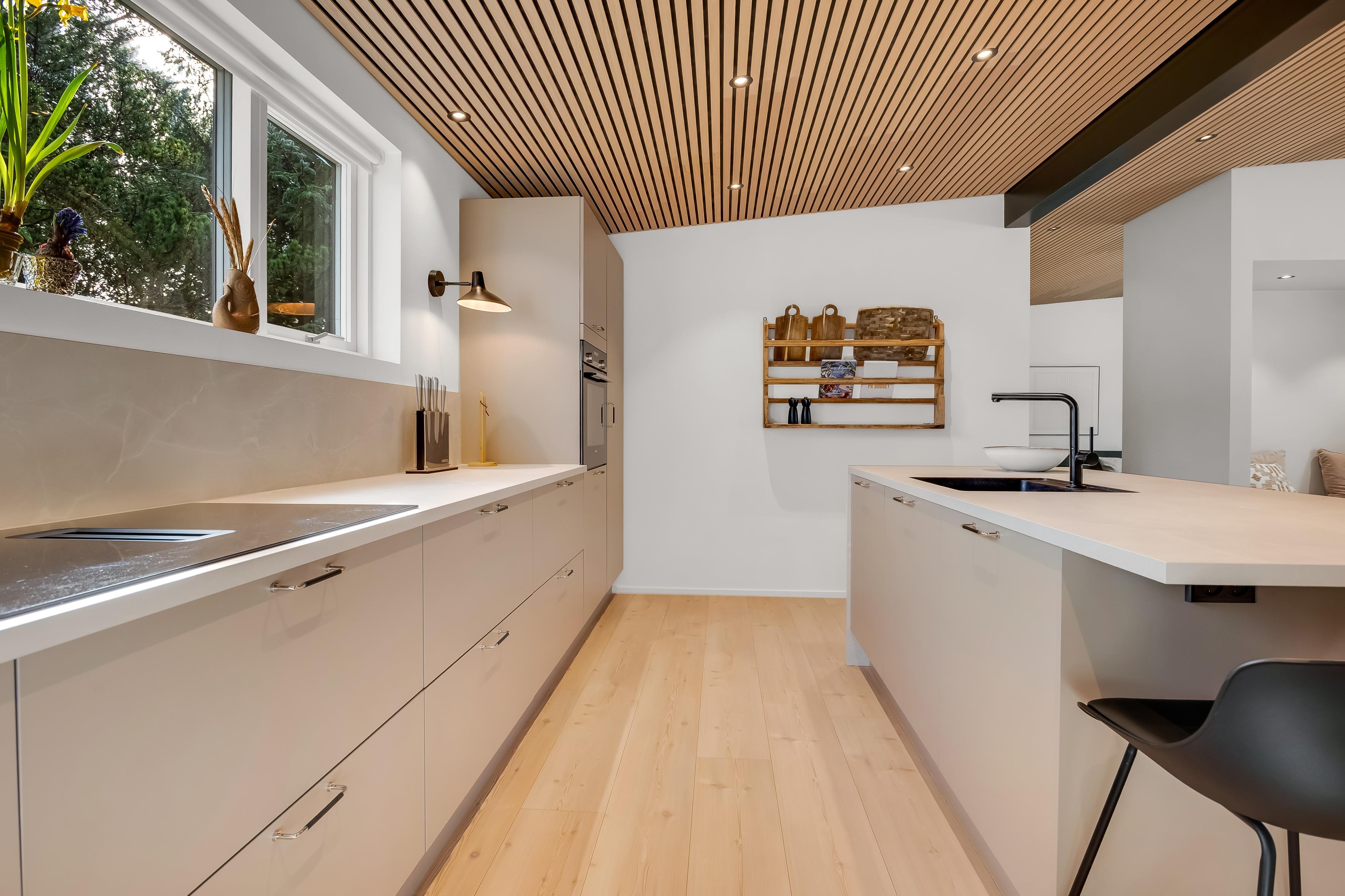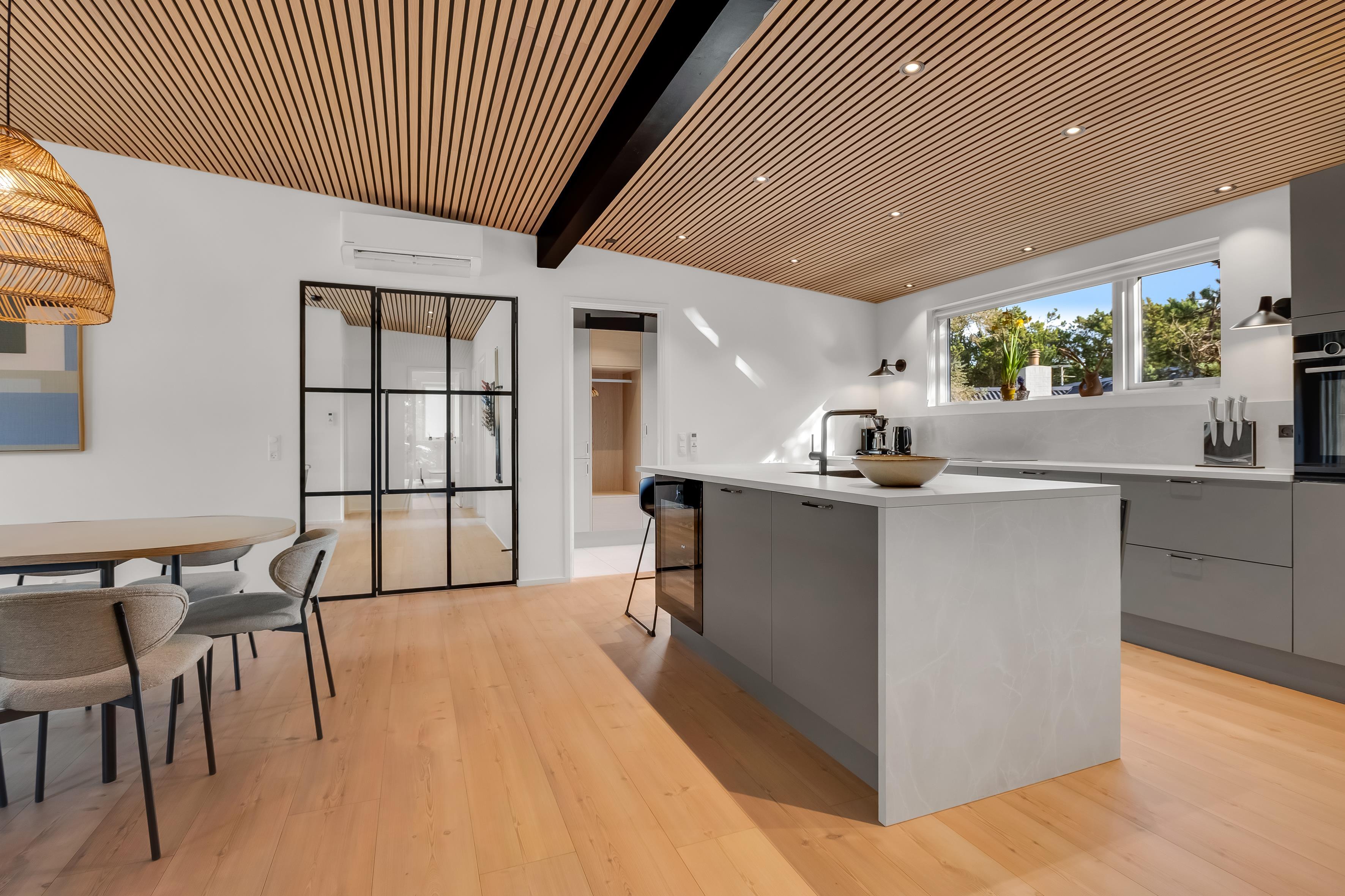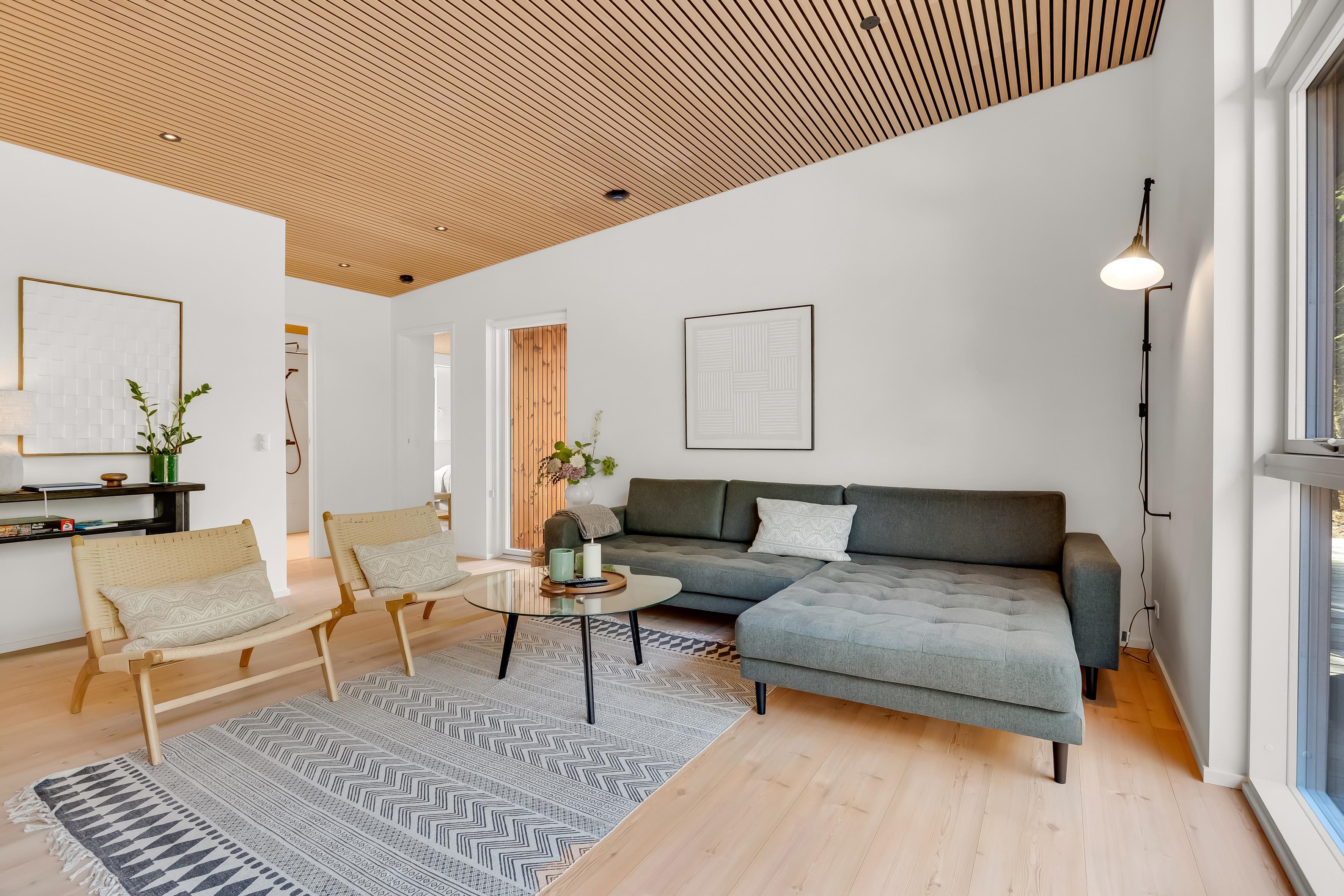 Den lyse opholdsstue har gulvvarme, brændeovn og store vinduespartier, der skaber en varm og indbydende atmosfære. Her kan I samles til hyggelige aftener, god mad og afslapning.