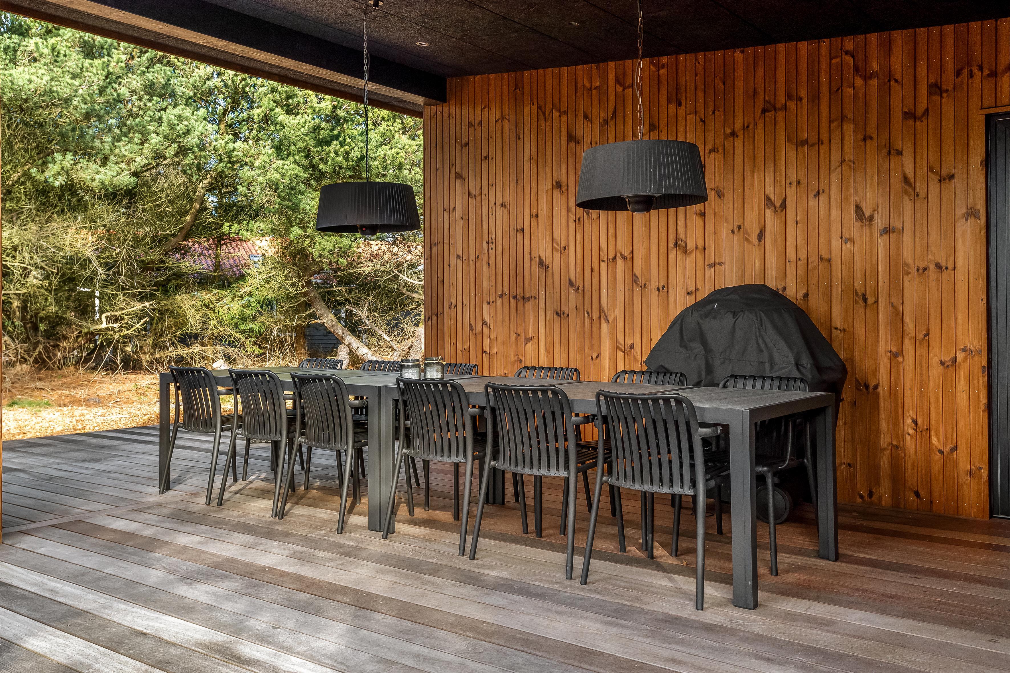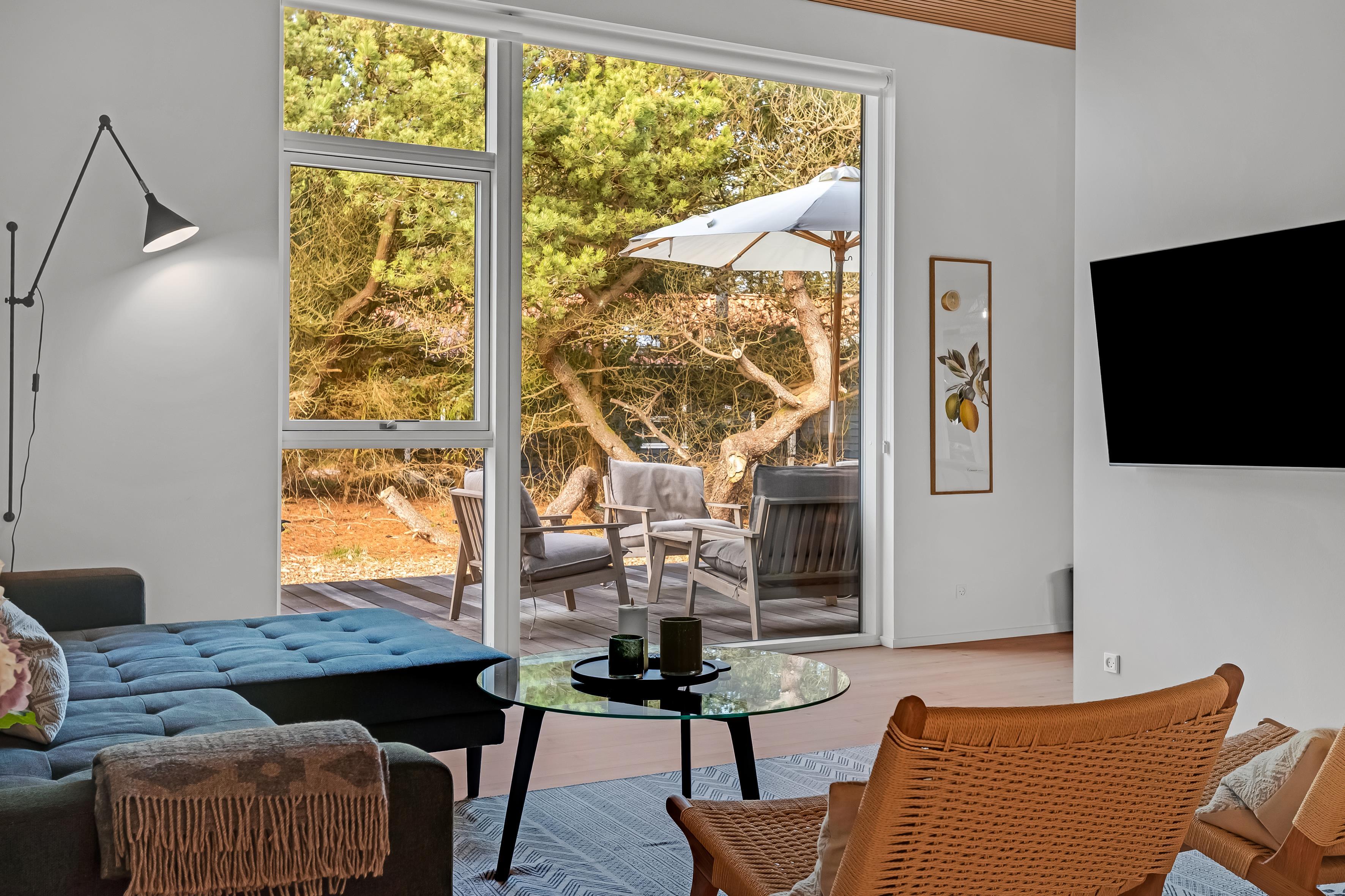 Den delvist overdækkede terrasse er udstyret med varmelamper, så I kan nyde udelivet fra morgen til aften. Grunden byder desuden på en privat beachvolleybane – oplagt til både familiehygge og venskabelige turneringer.