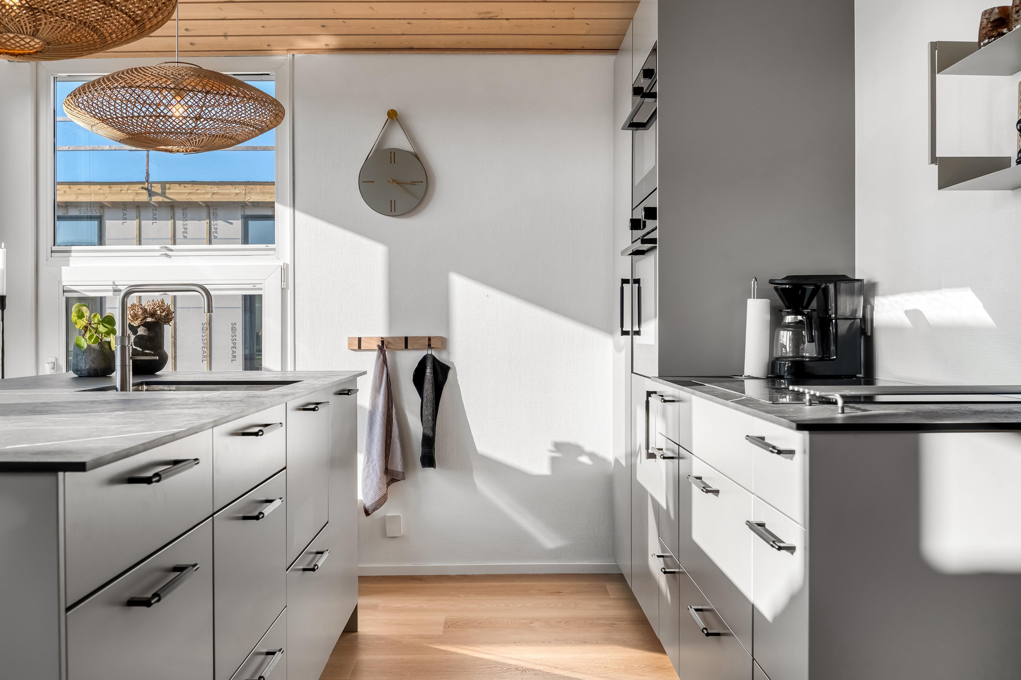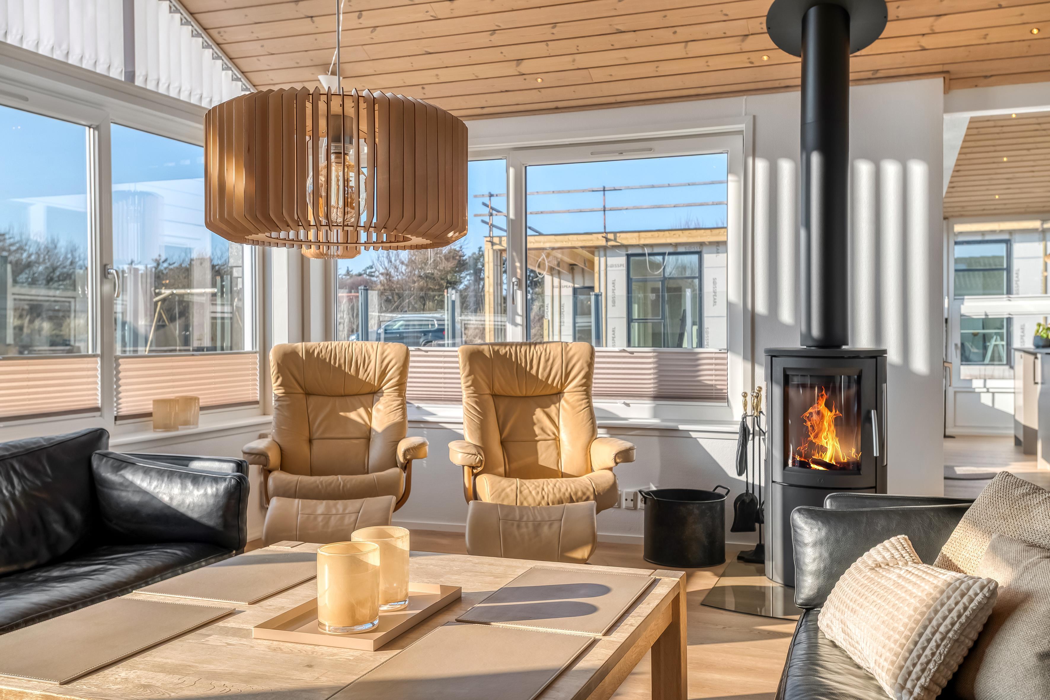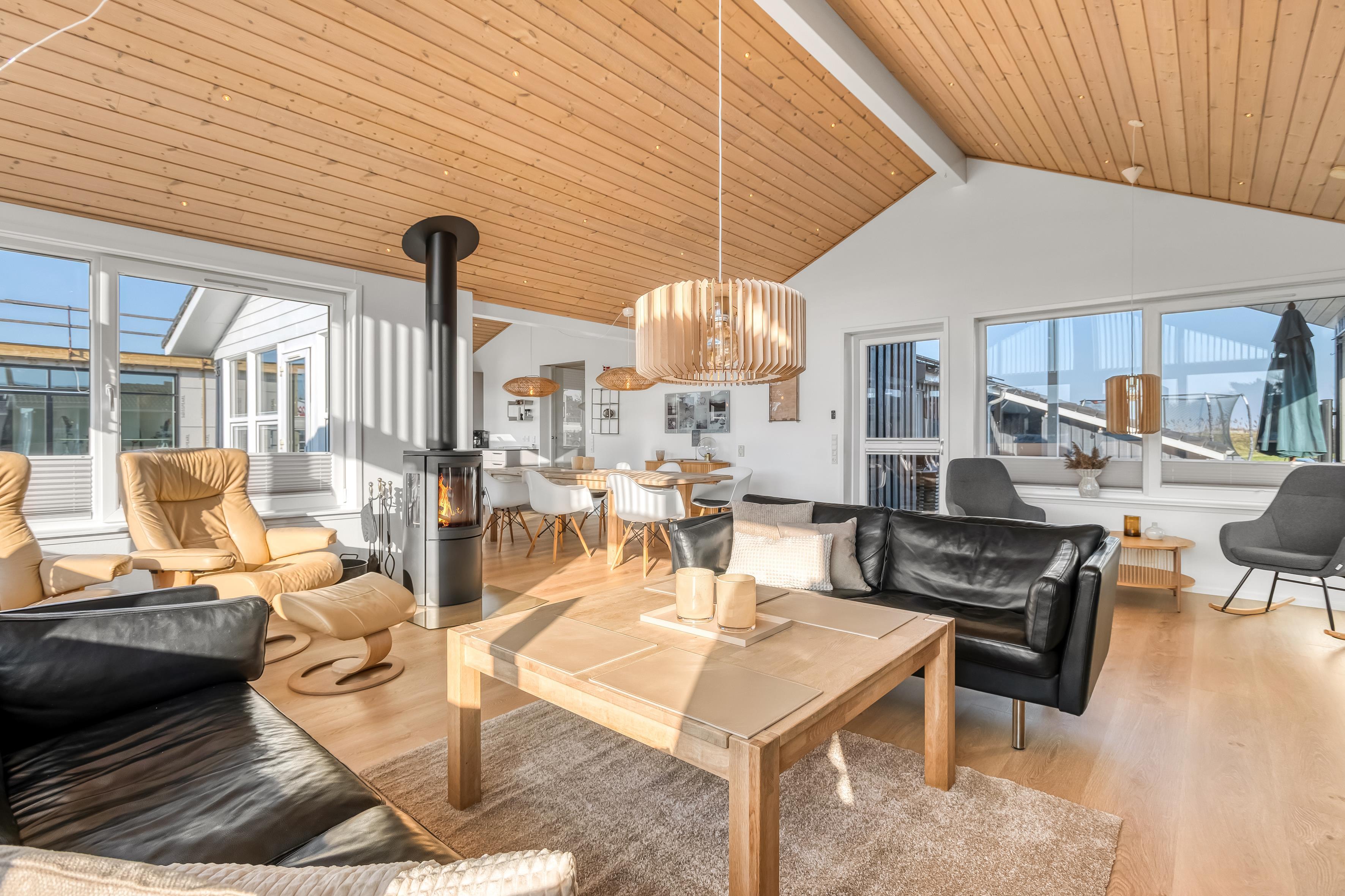 Veludstyret køkken, stue og spiseområde er samlet i ét stort alrum – perfekt til kvalitetstid med madlavning, brætspil eller filmaftener. Via Chromecast kan I streame jeres yndlingsfilm, mens brændeovnen knitrer i baggrunden og spreder hygge.