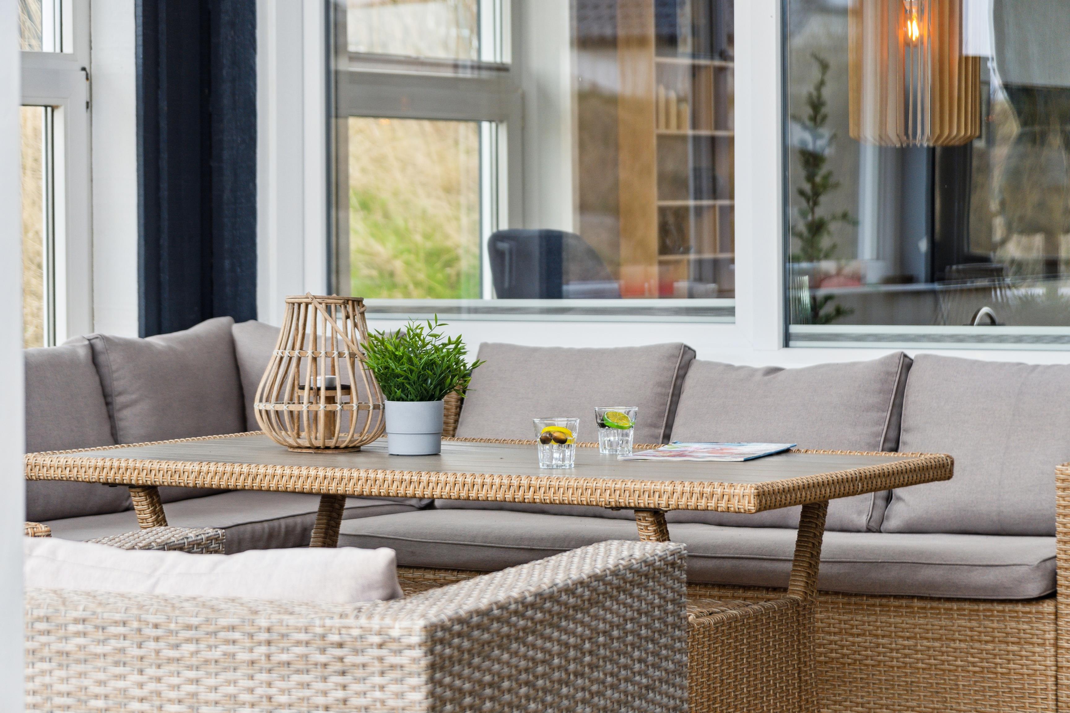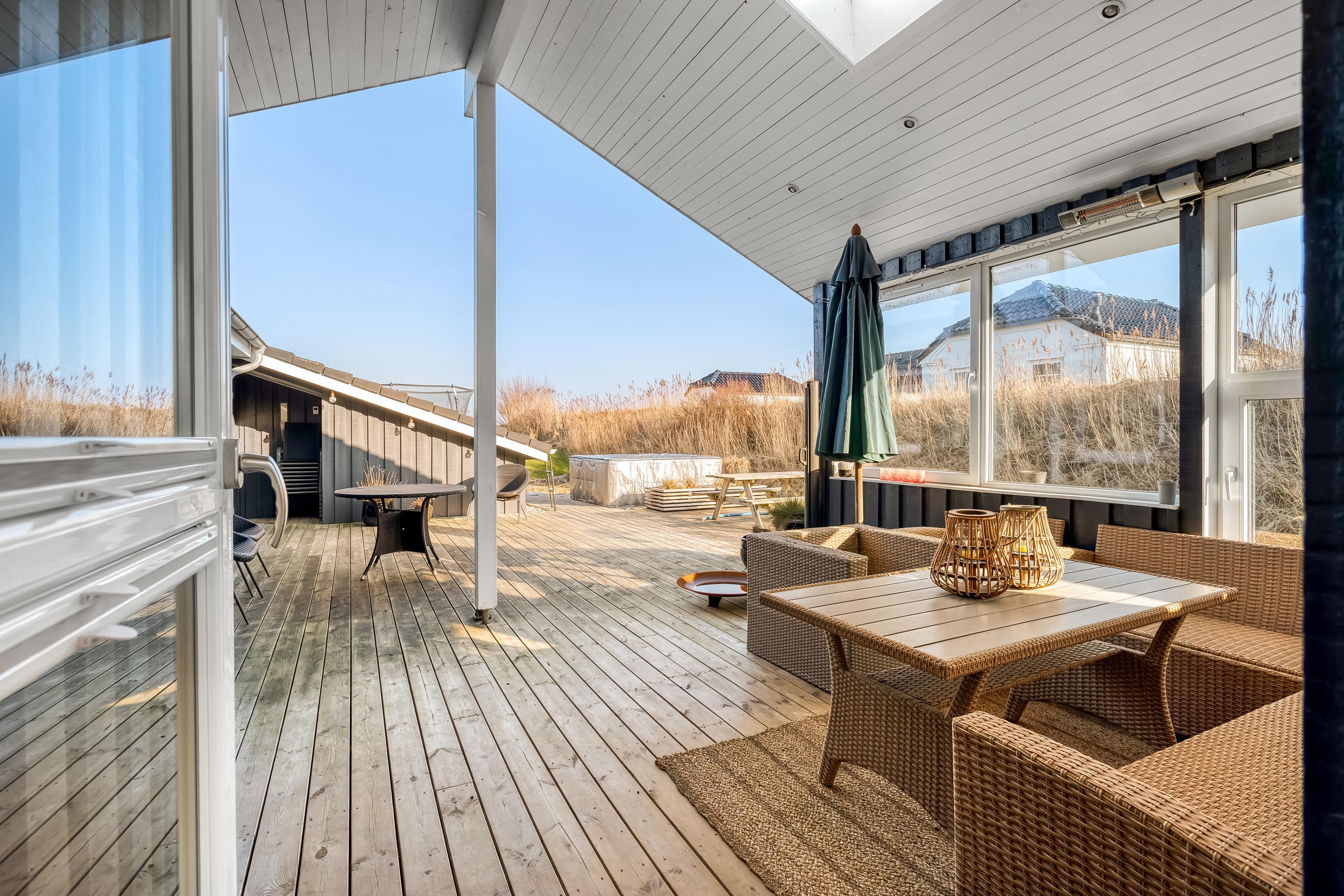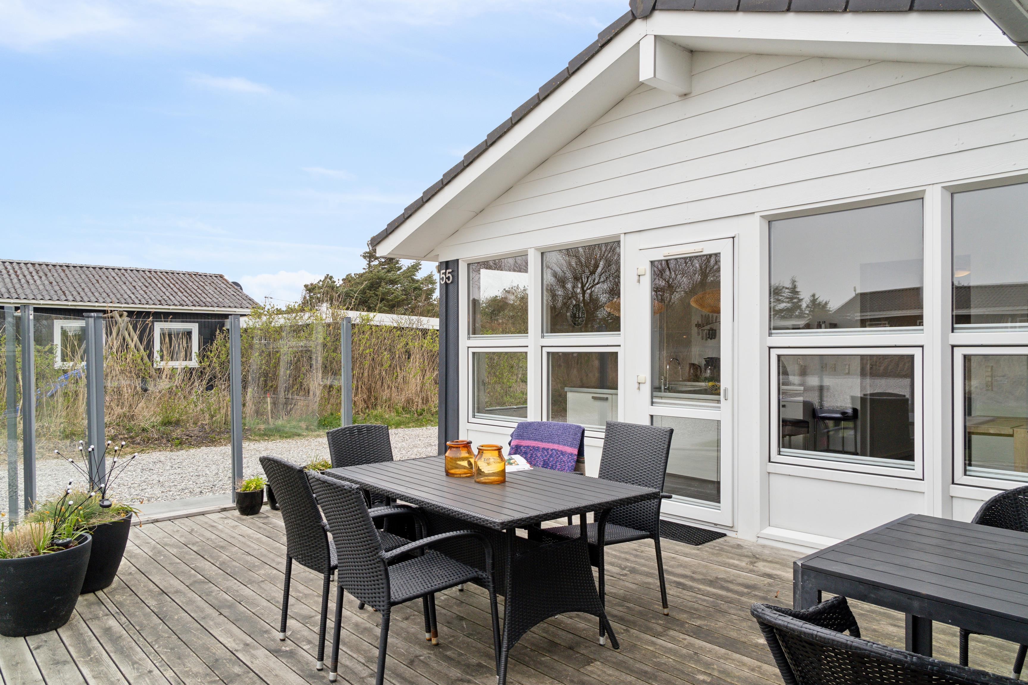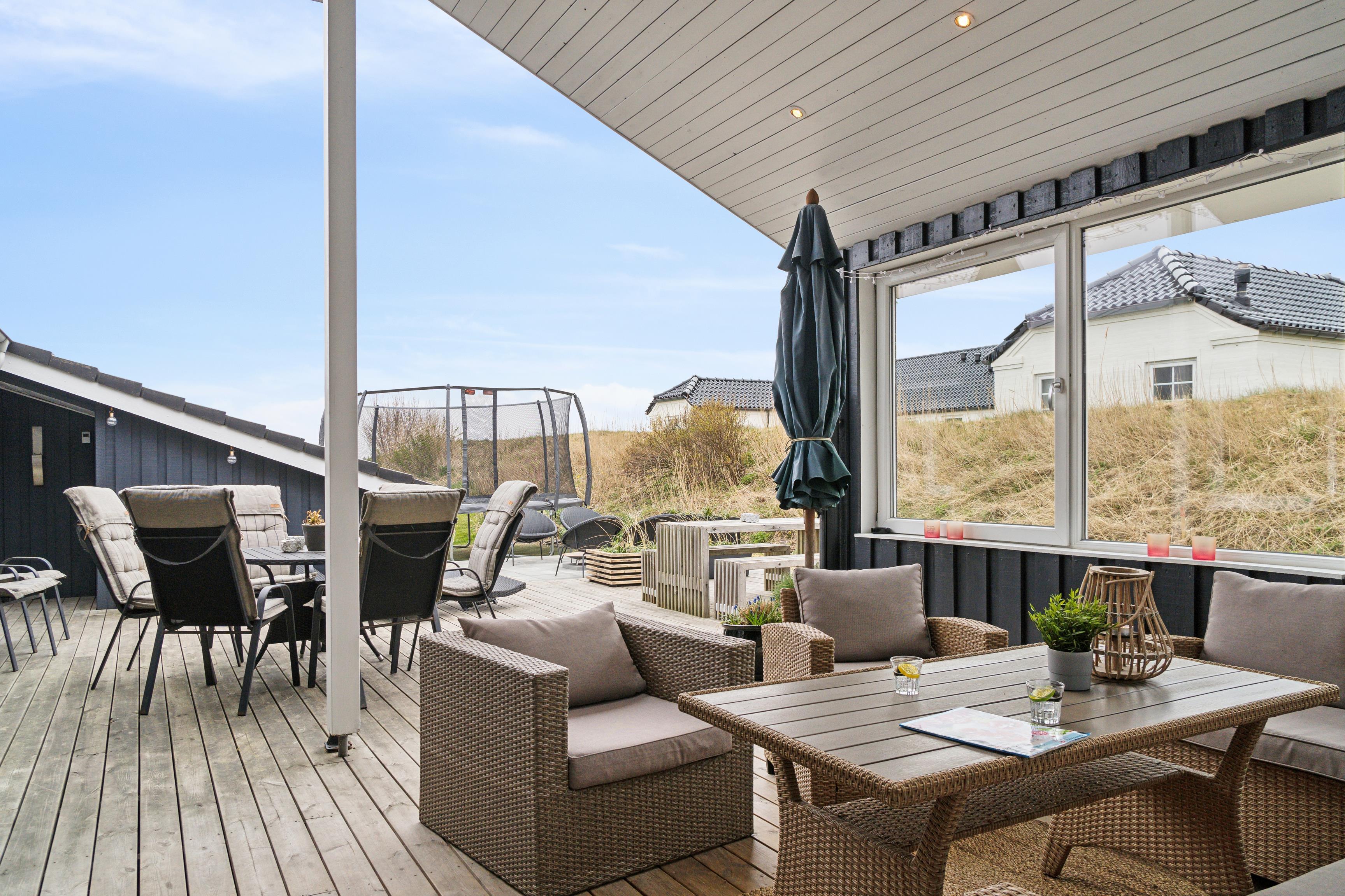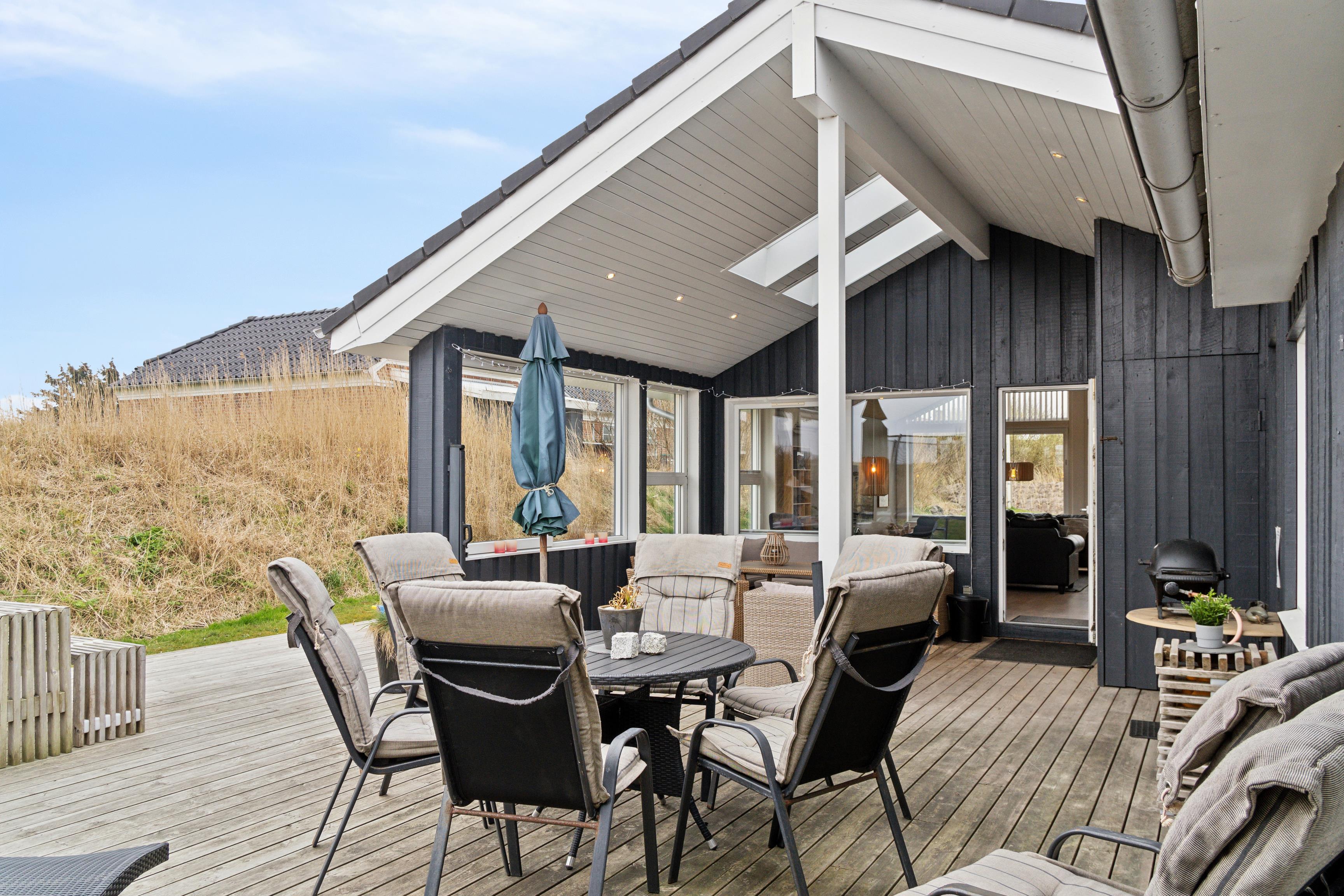 Rundt om huset ligger en rummelig træterrasse, hvor I kan nyde solen på liggestolene eller samles til grillmiddage under åben himmel.