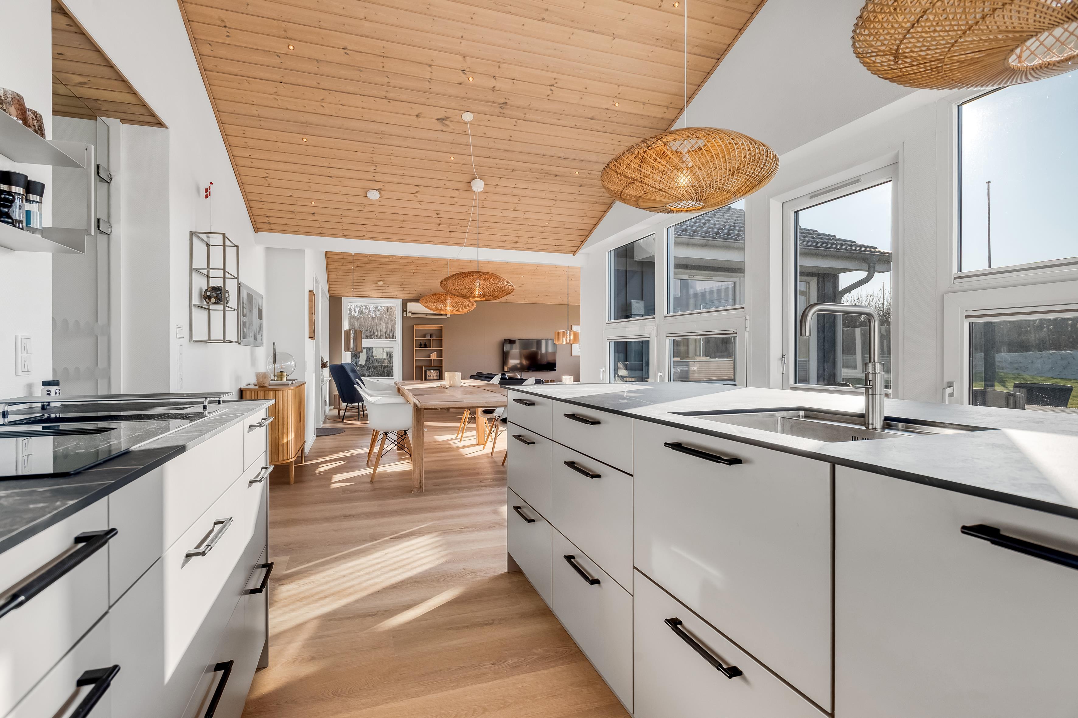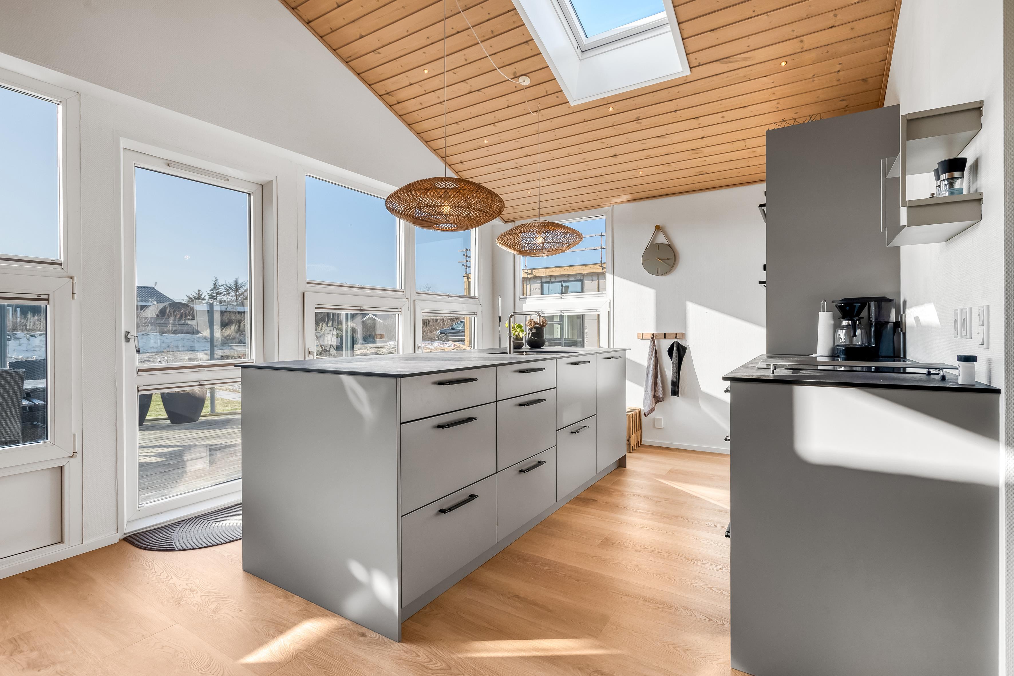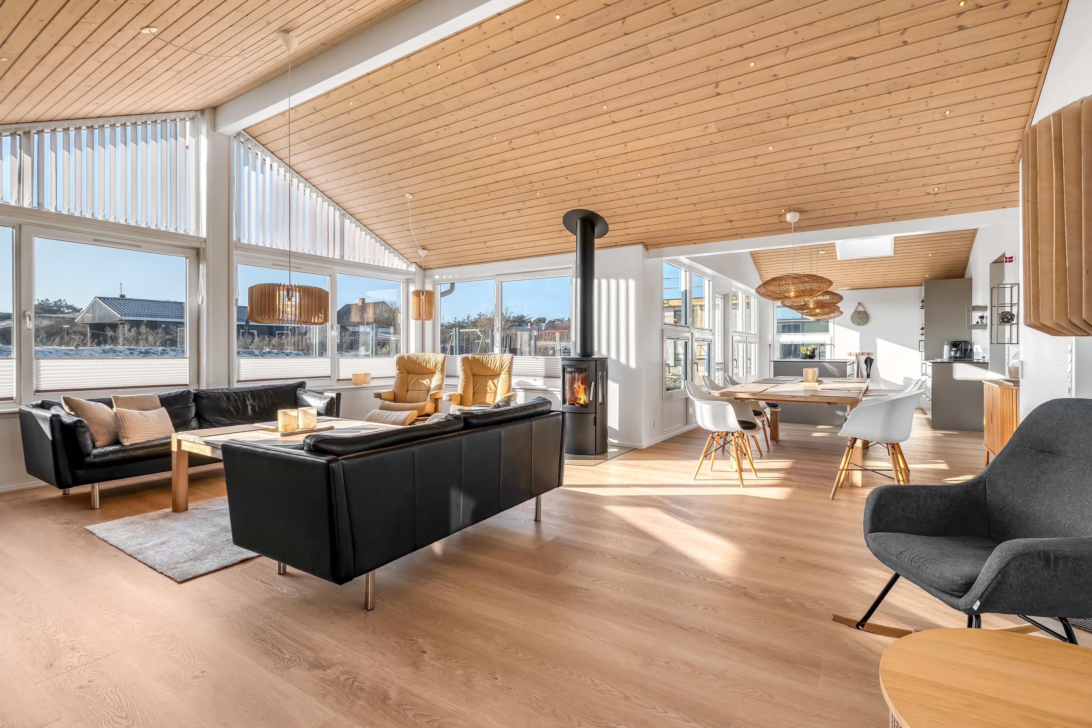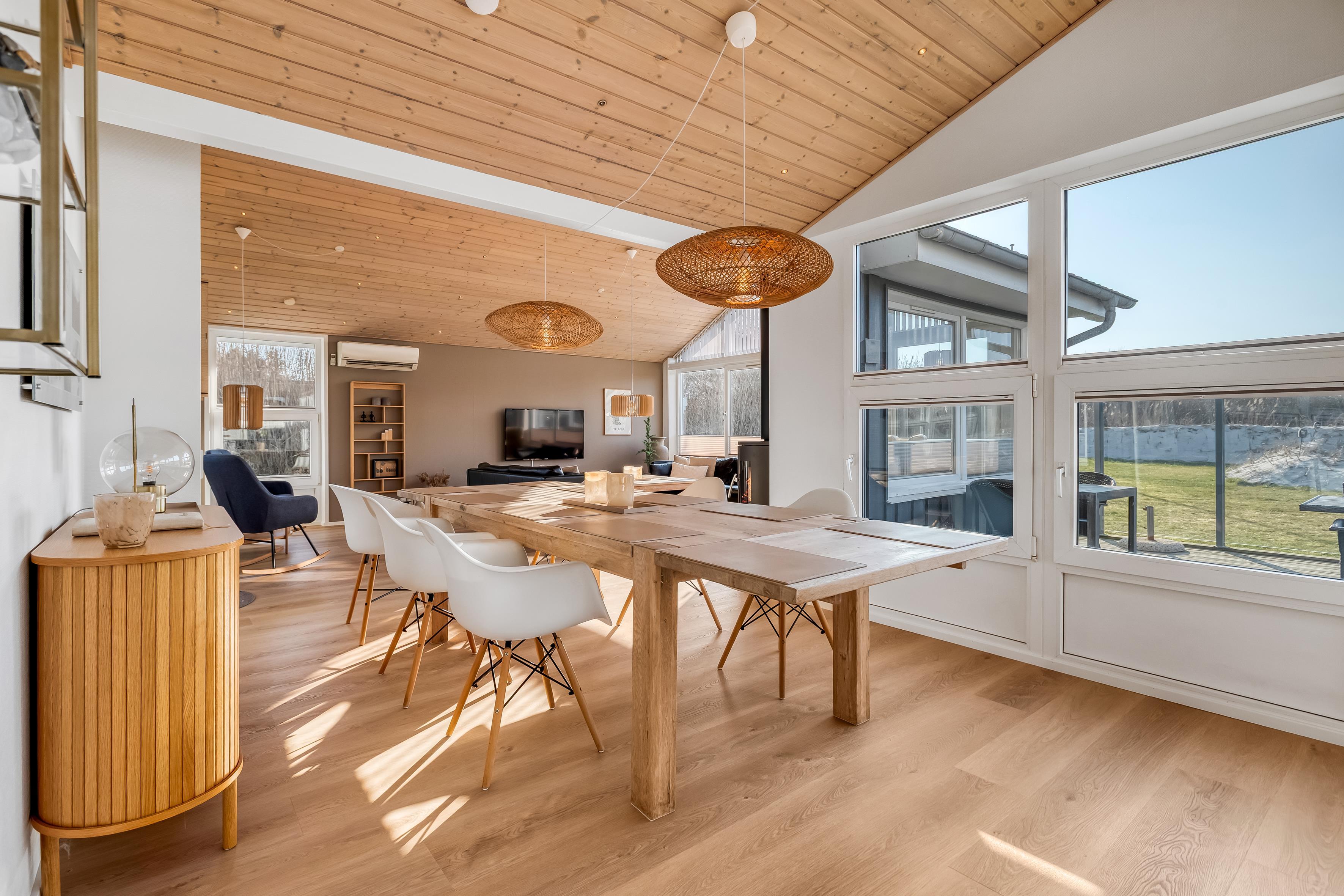 Det velindrettede sommerhus har en varm og indbydende stemning med højt til loftet og store vinduer, der lader lyset strømme ind og skaber en ægte feriefornemmelse.