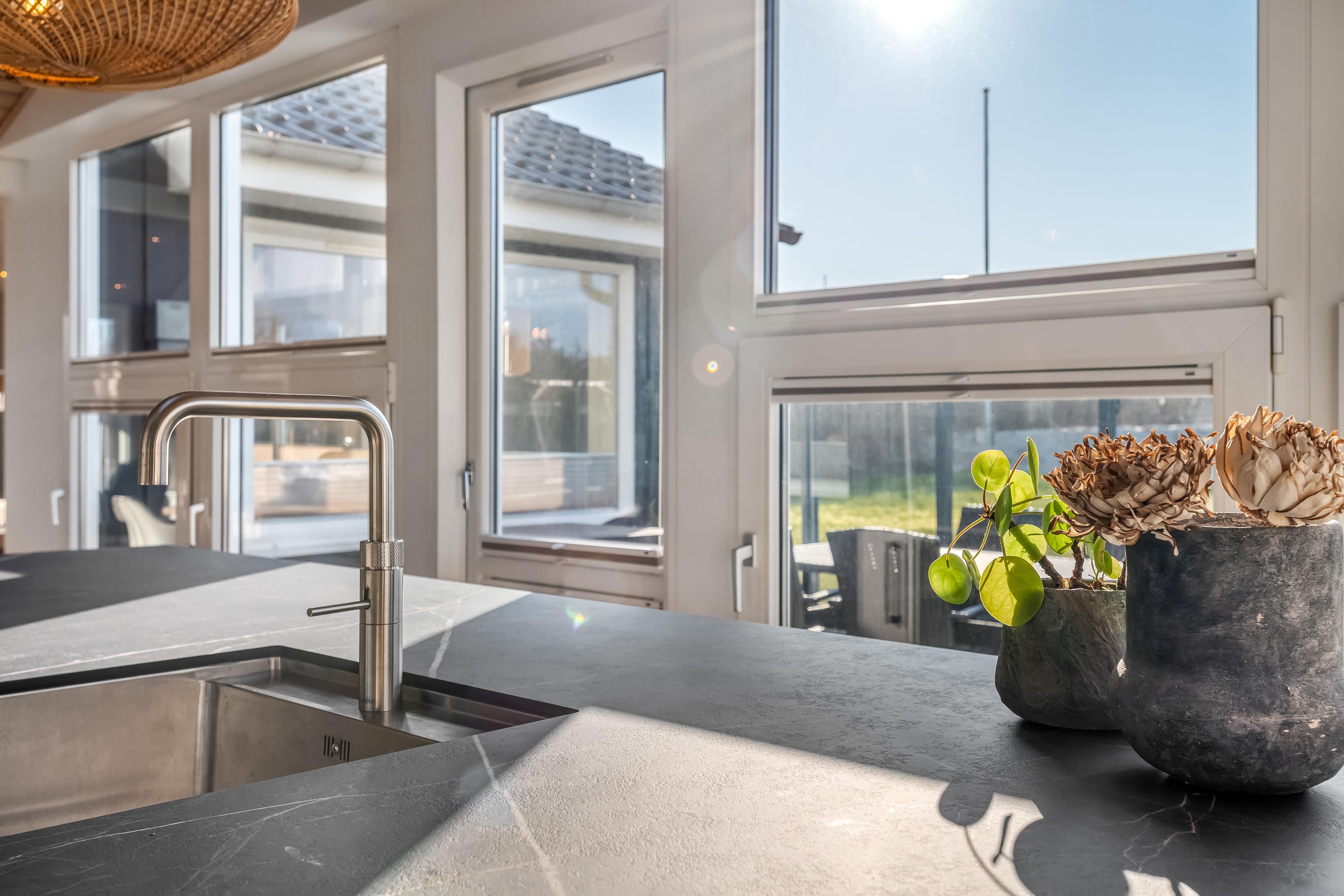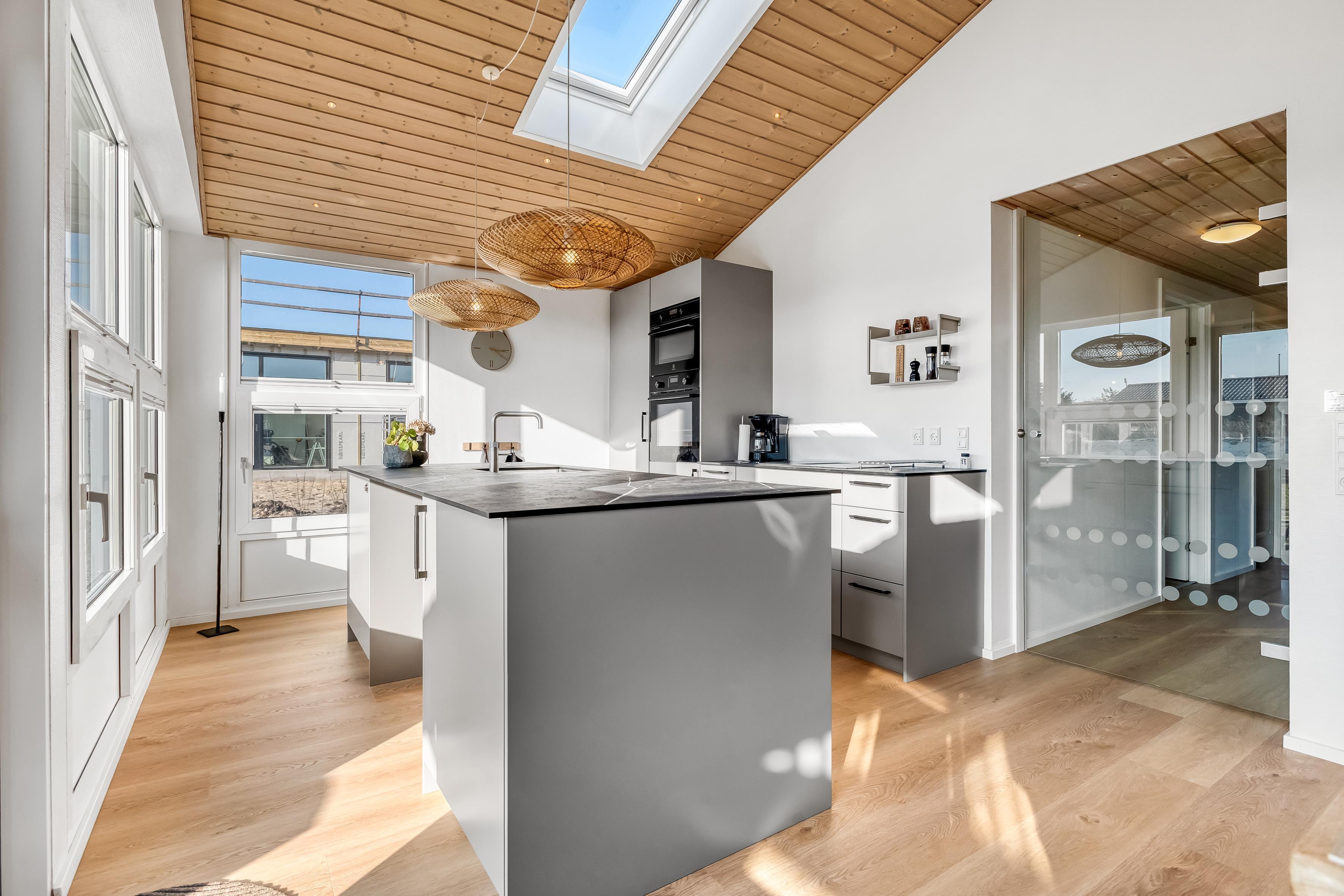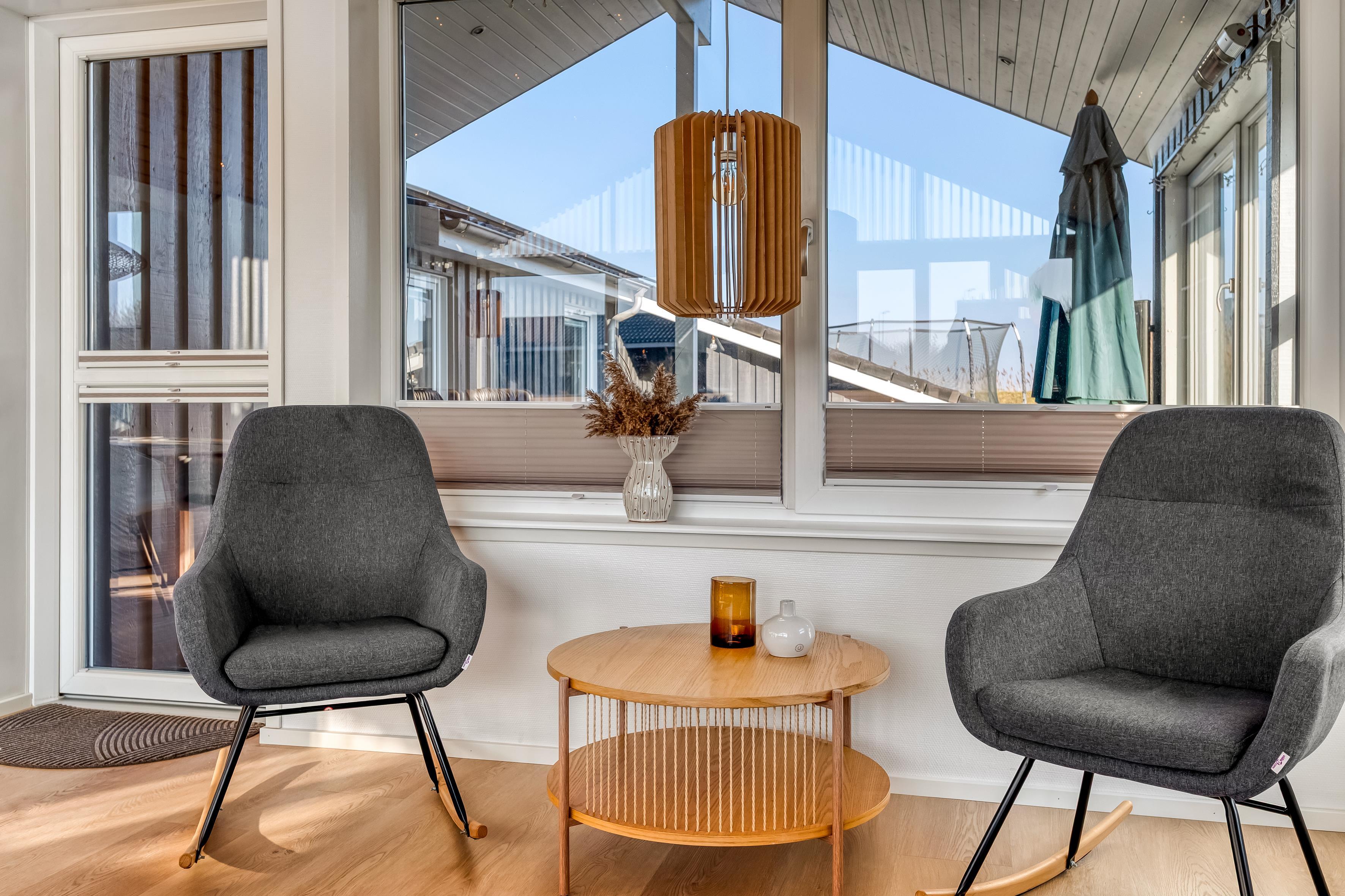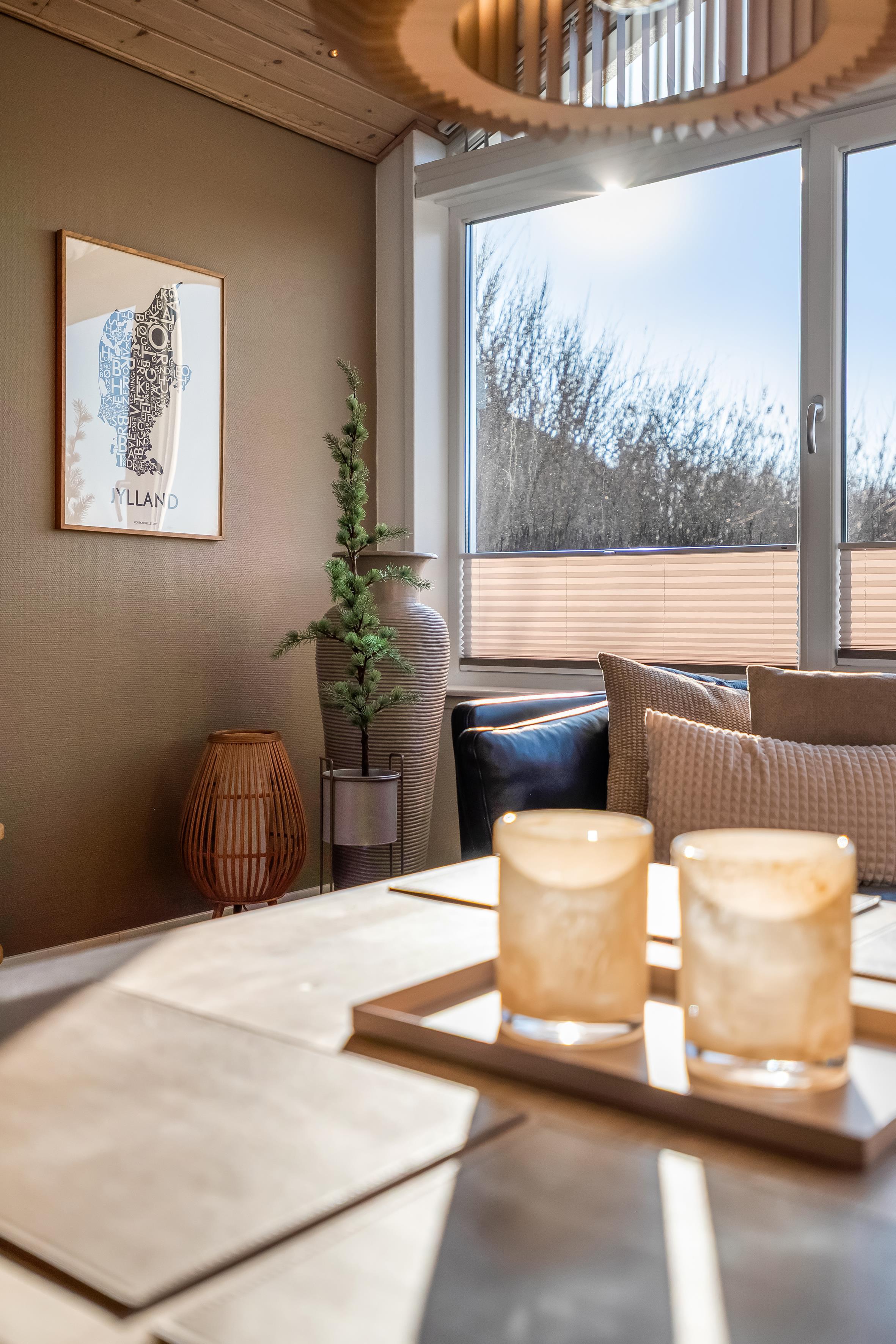 Det velindrettede sommerhus har en varm og indbydende stemning med højt til loftet og store vinduer, der lader lyset strømme ind og skaber en ægte feriefornemmelse.