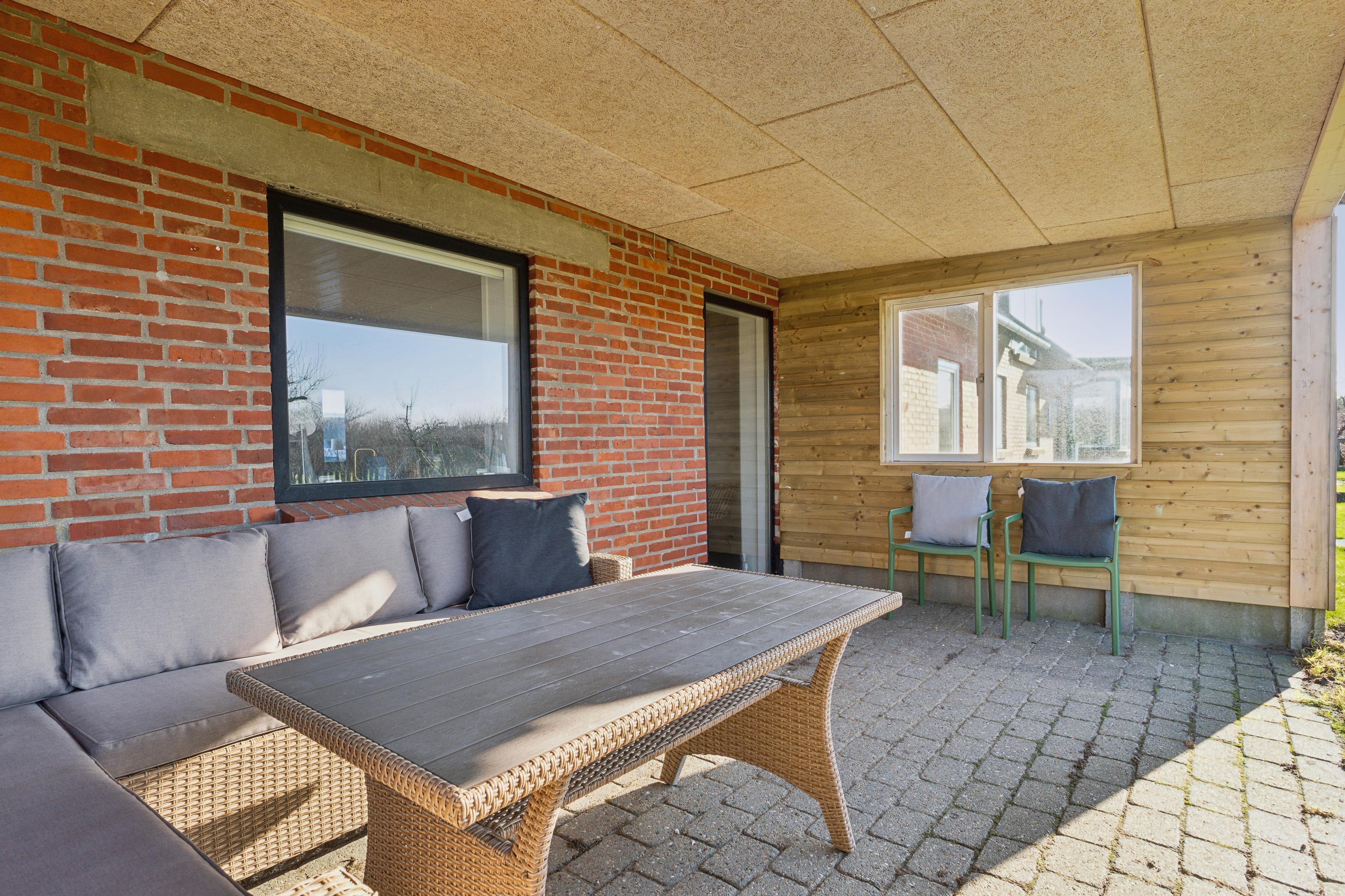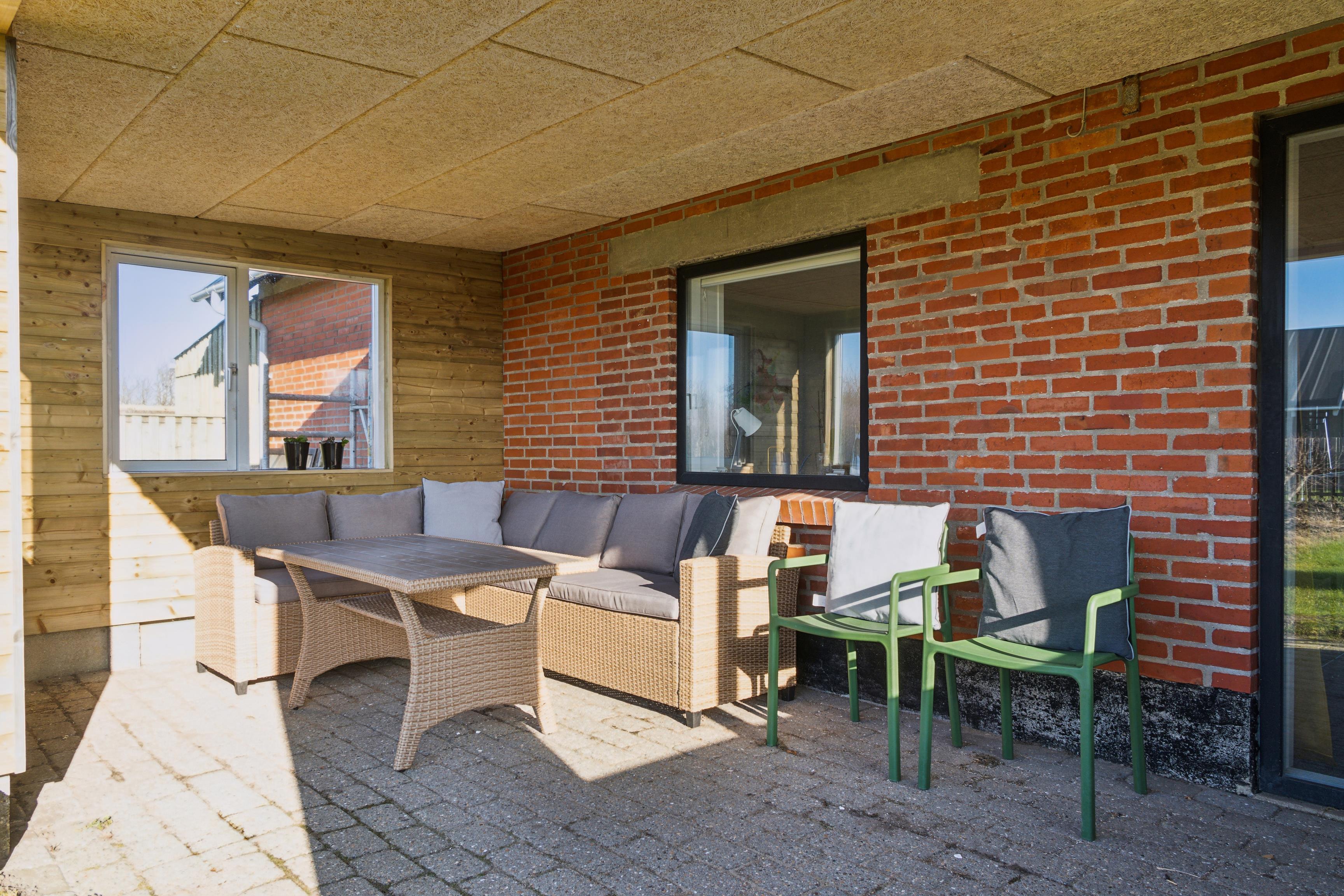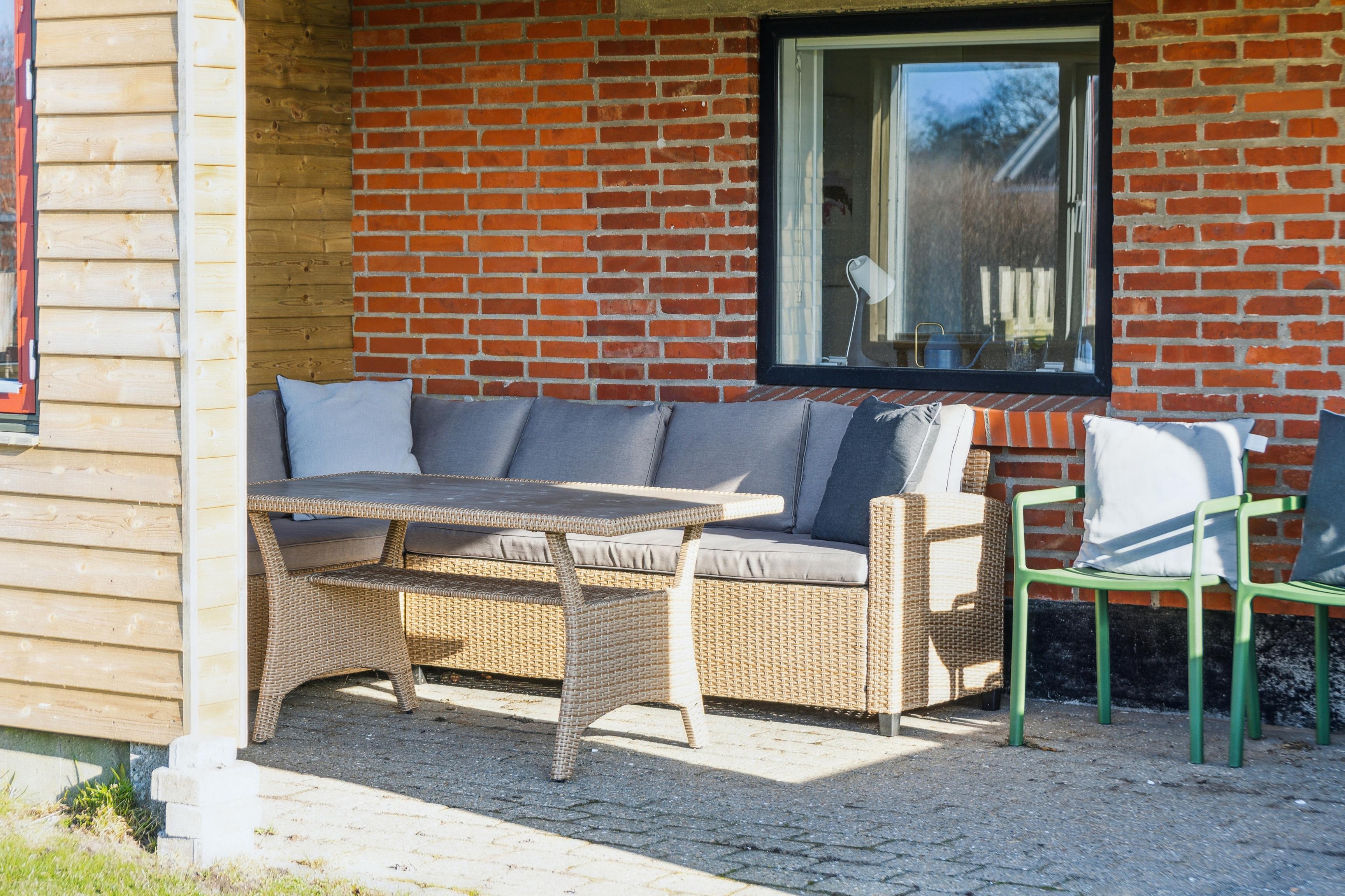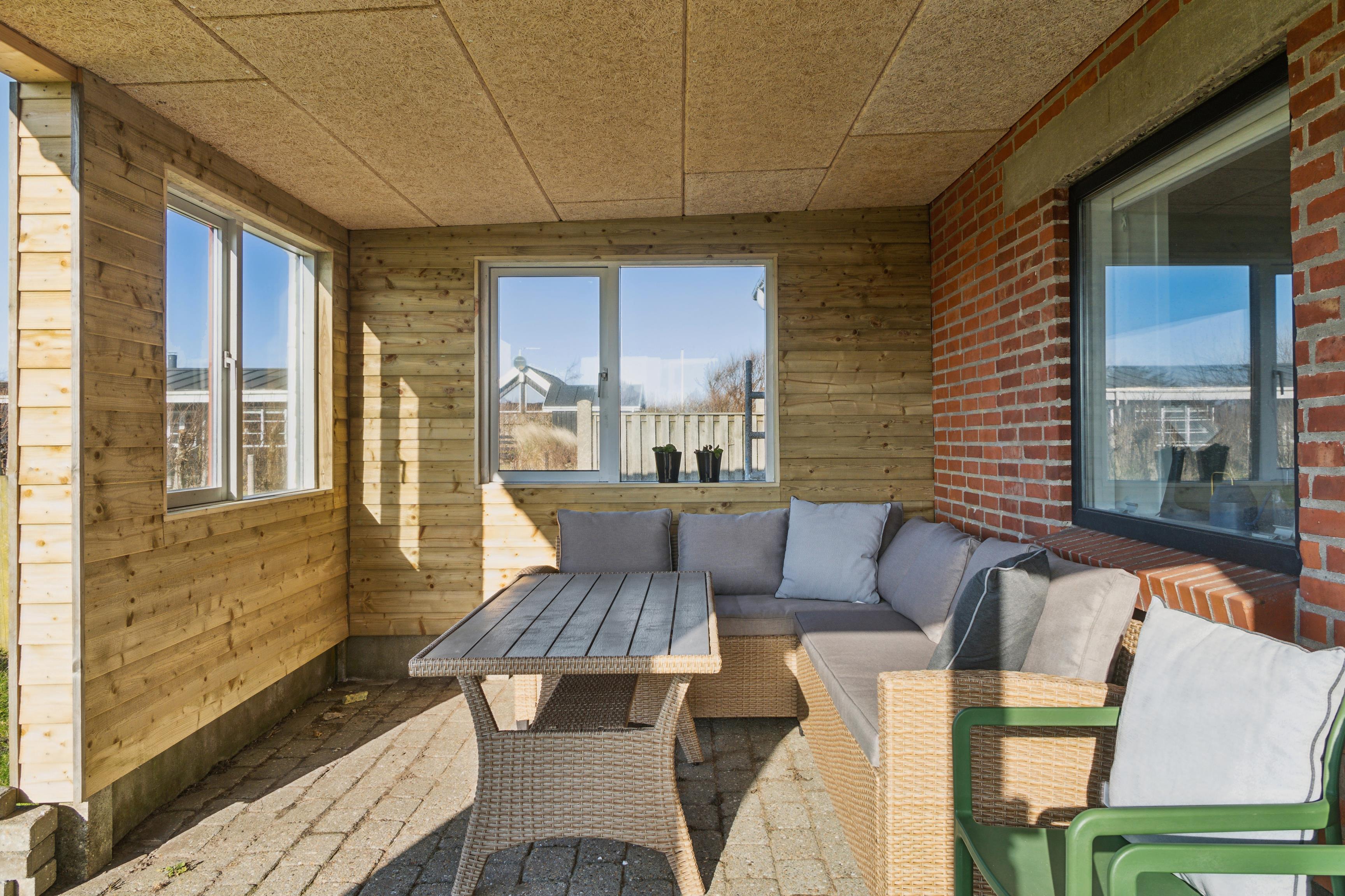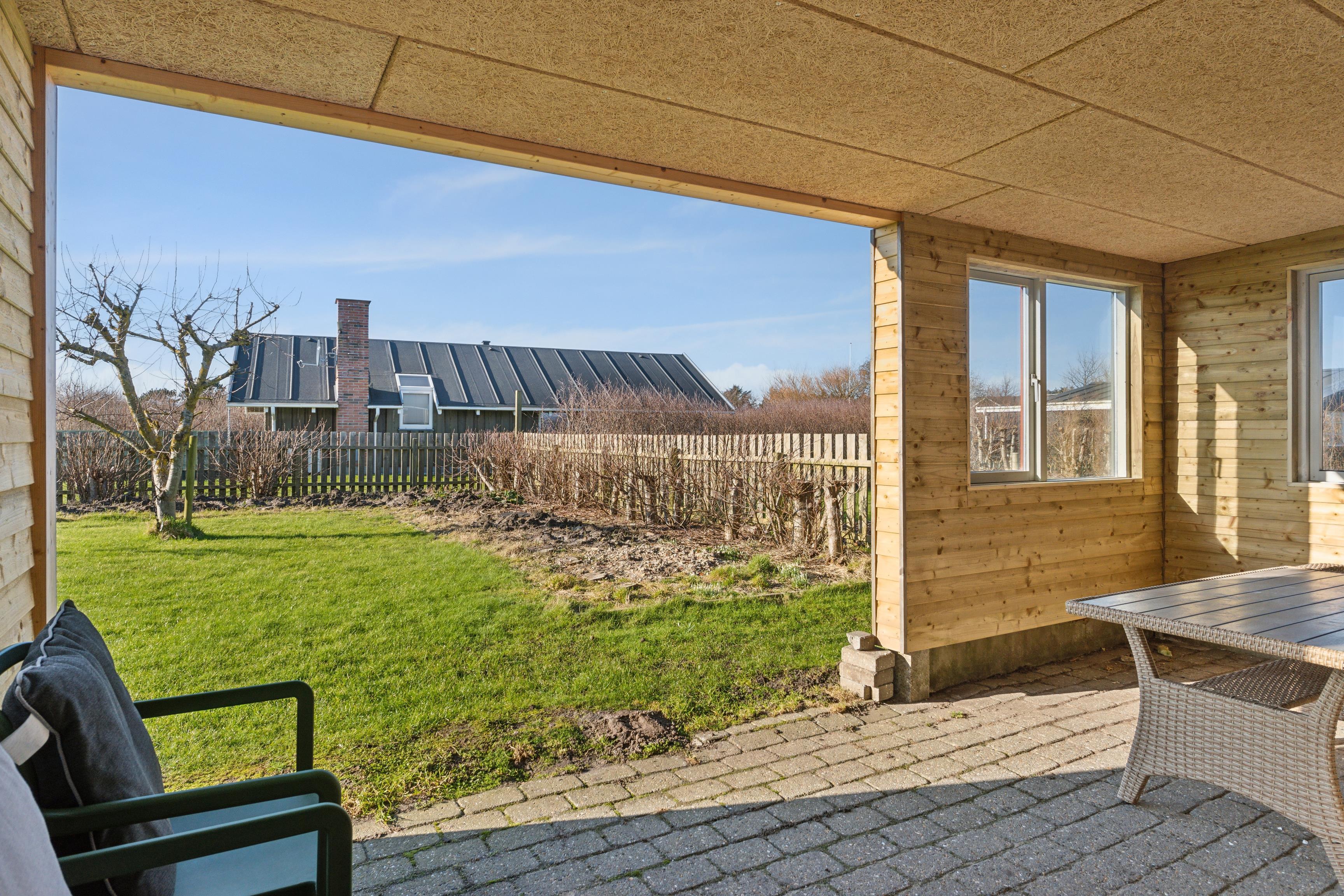 Foran ejendommen er der en rummelig fælles parkeringsplads, hvor bilen kan holde trygt med udsigt over det åbne landskab mod Ringkøbing Fjord. På bagsiden af ferieboligen finder I mere private udendørsarealer med to vestvendte terrasser, afskærmet af hegn, samt en stor græsplæne, der indbyder til leg og boldspil.