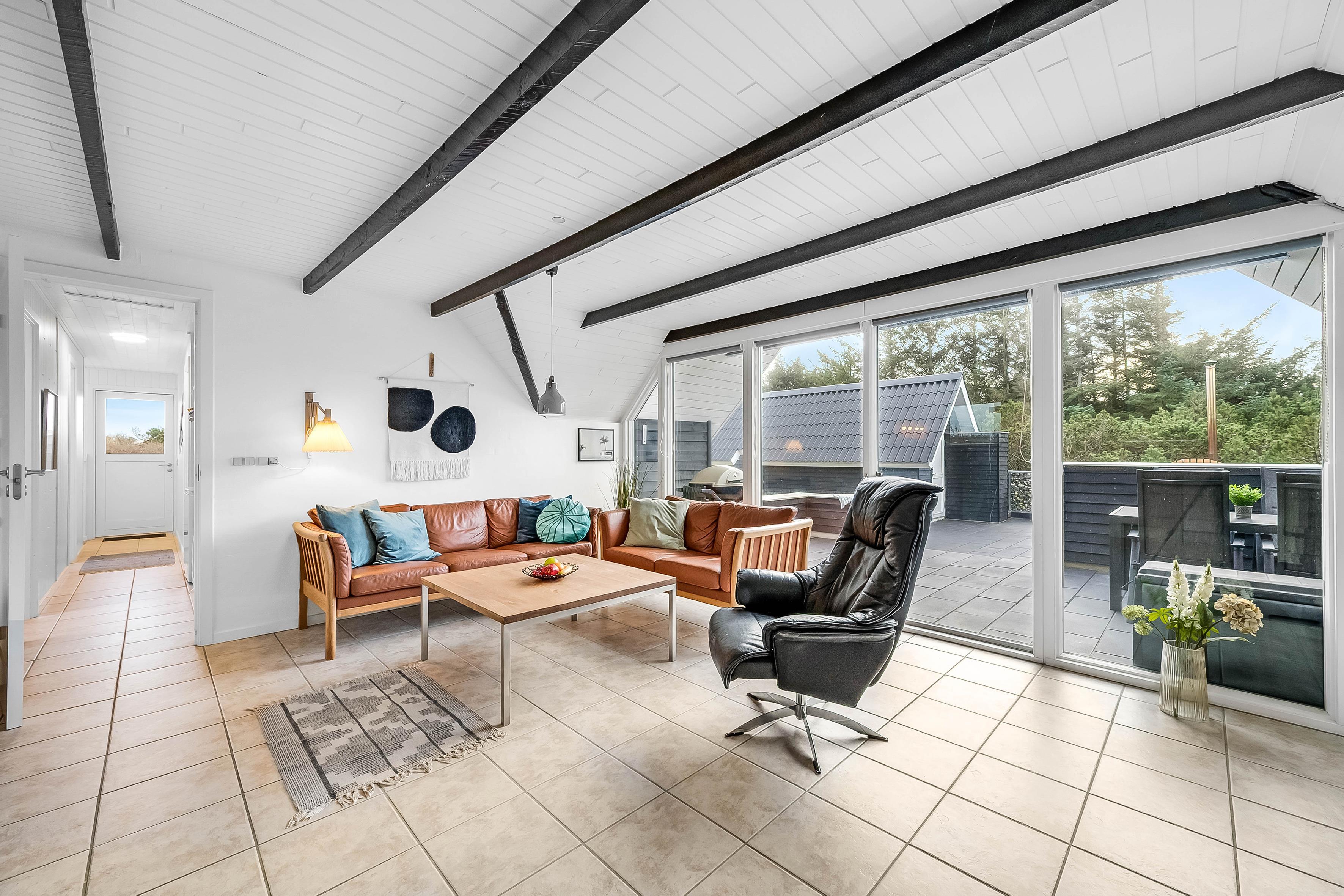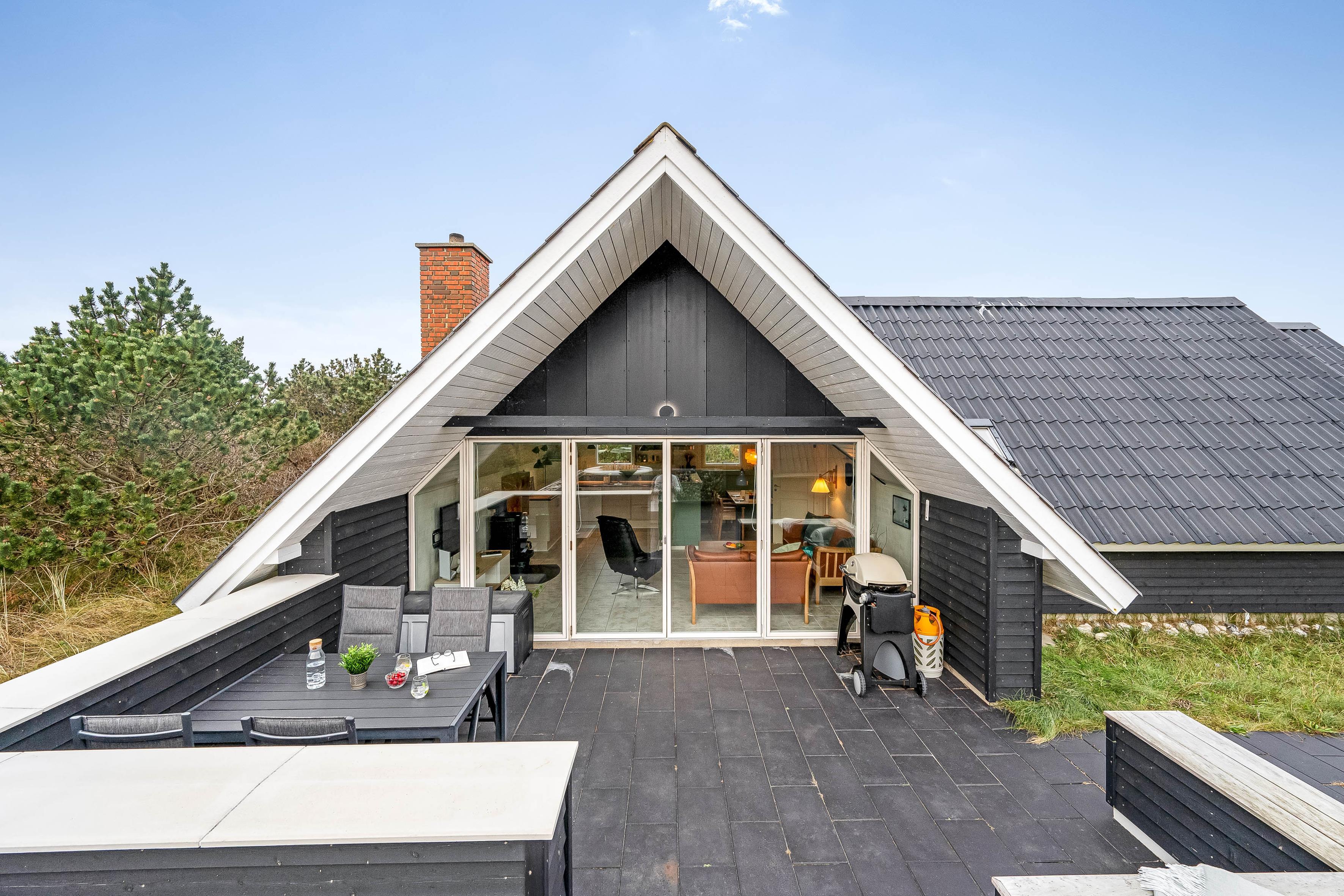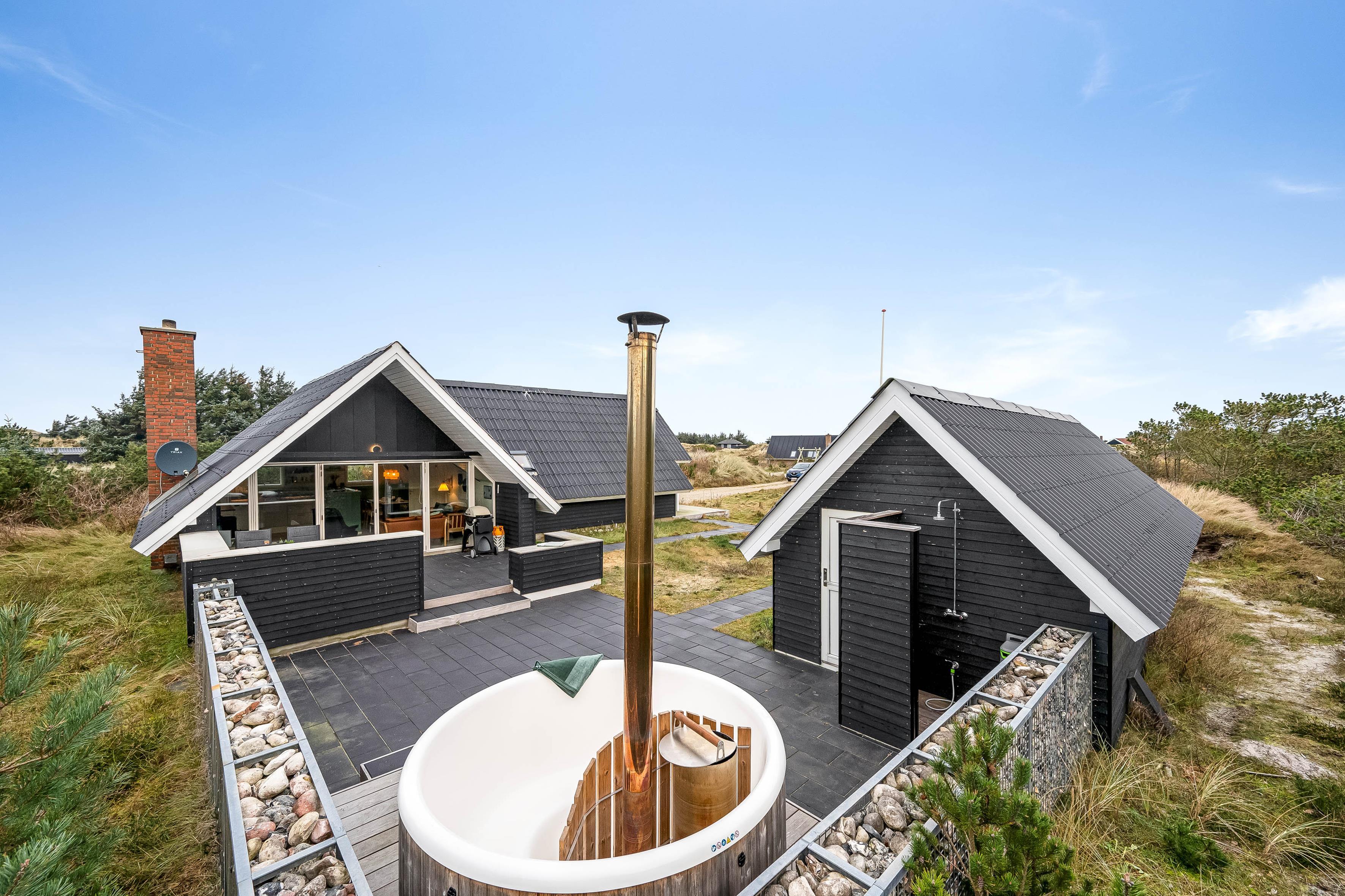 Tag en dyb indånding på den rummelige terrasse, nyd den friske havluft og lyt til naturens lyde. Skab varige minder med en grillfest, og forlæng sommeraftenerne under den overdækkede terrasse i det indbydende, rummelige siddeområde. Men det er ikke alt! Tag en pause fra hverdagen i vores 6-personers spabad, hvor I kan slappe af under stjernerne og lytte til nattens lyde. Fuldend denne unikke oplevelse med et forfriskende udendørs brusebad, inden I vender tilbage til huset og falder i en god søvn.