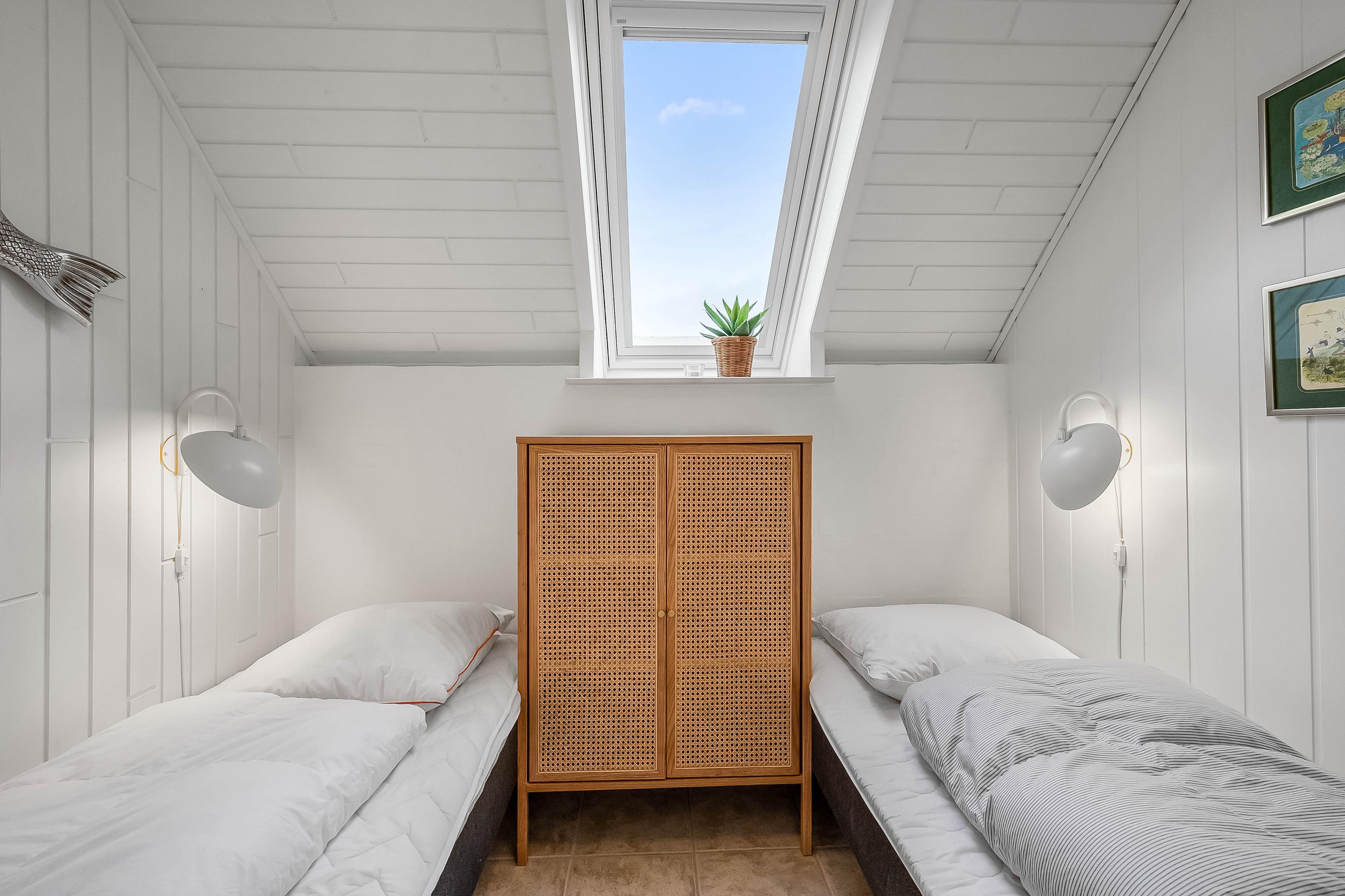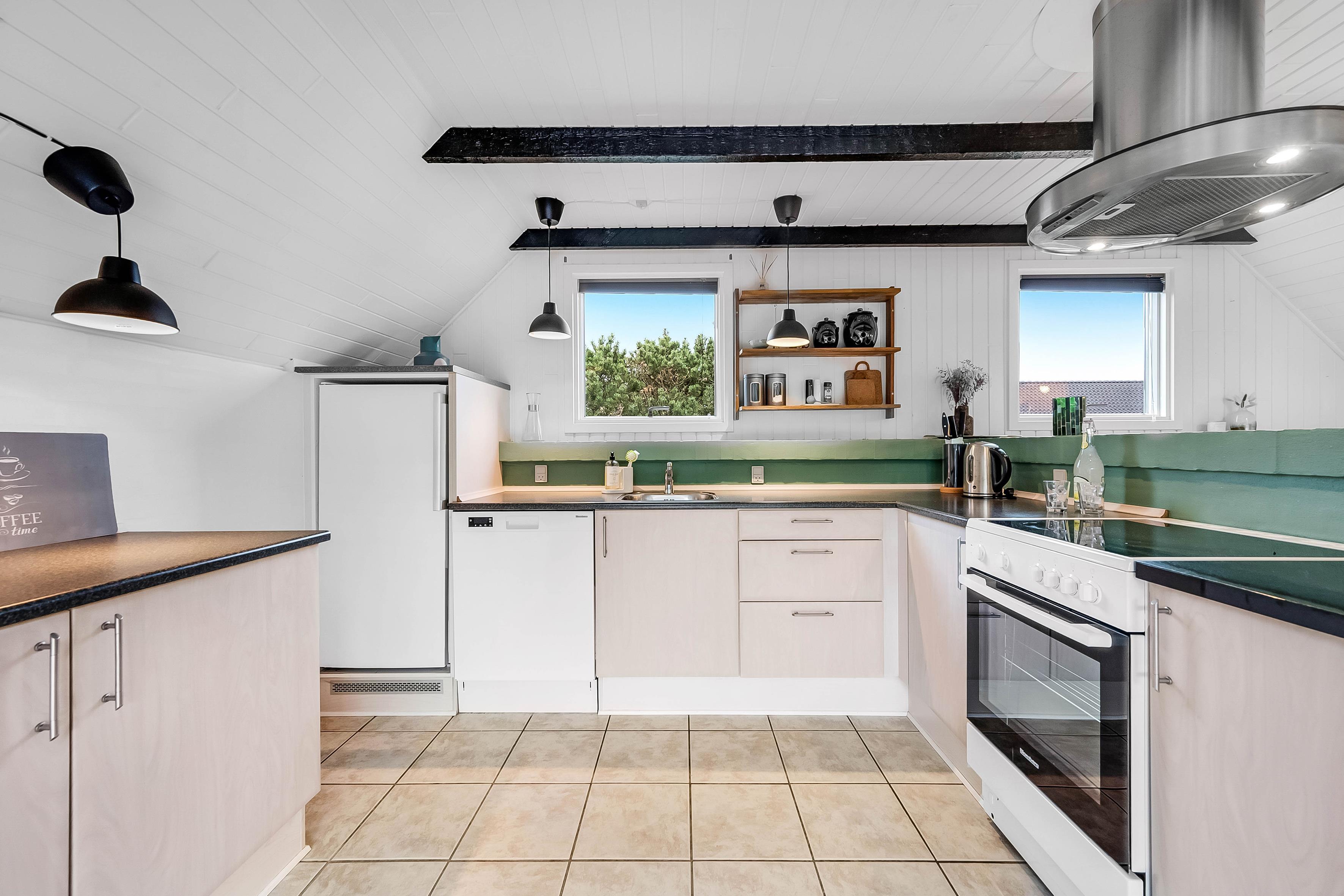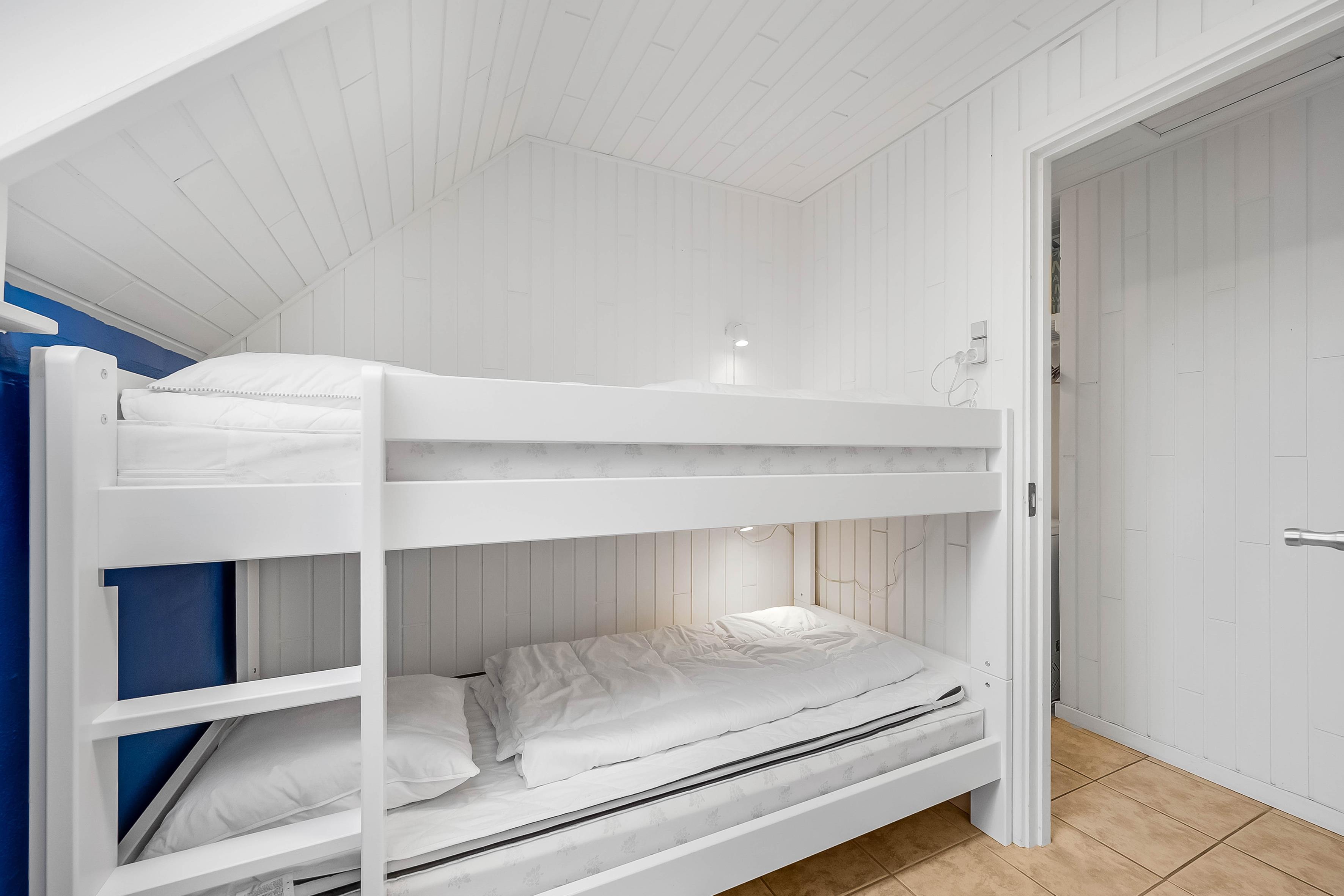 Husets hjerte er den kombinerede stue/spisestue med køkken og et stort vinduesparti, der skaber en lys og luftig atmosfære. Køkkenet er udstyret med komfur, opvaskemaskine og et 100-liters køleskab med en lille fryser. Der er et soveværelse med en dobbeltseng, et med to enkeltsenge og et med en køjeseng.